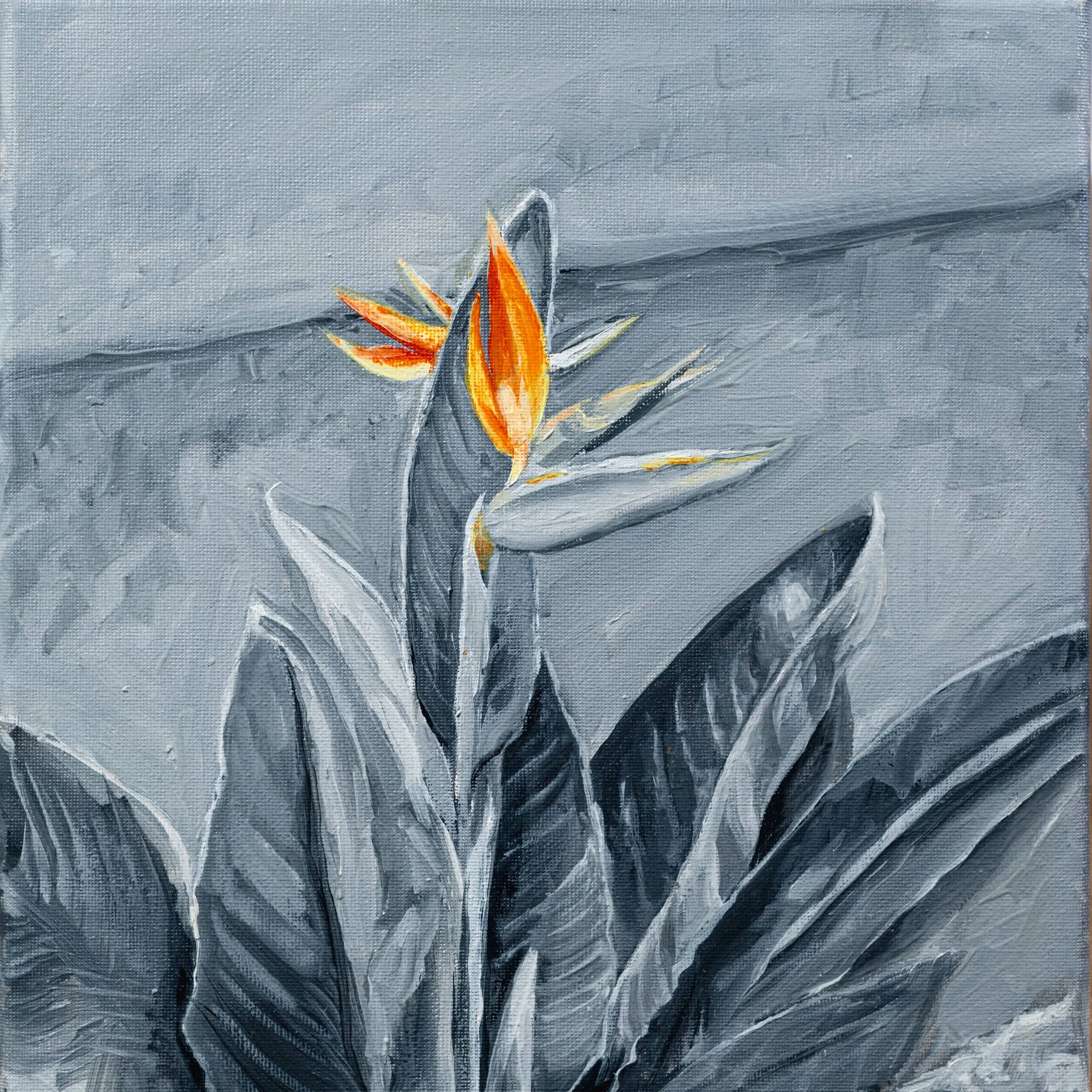 A pintura "Estrelicia" foi criada em homenagem à beleza da flor "Strelítzia", também conhecida como "Ave do Paraíso" ou "Barco da Rainha". No outono em Portugal, estas flores magníficas desabrocham em toda a sua glória. Esta flor cresce na rua onde vive e cria suas obras o artista, tornando-a uma inspiração direta. A pintura, realizada a óleo, é uma celebração de Portugal e de sua beleza natural.