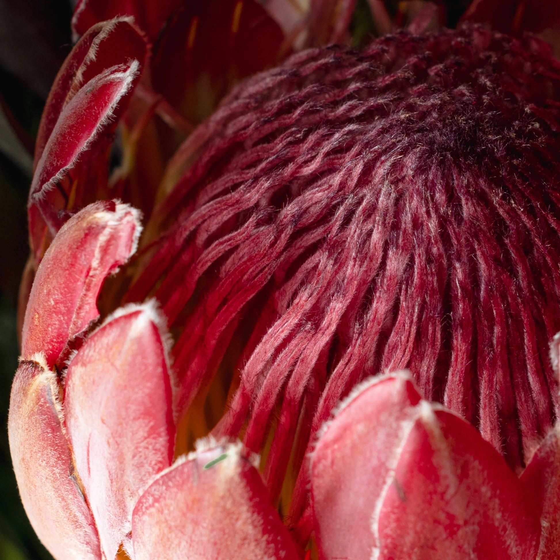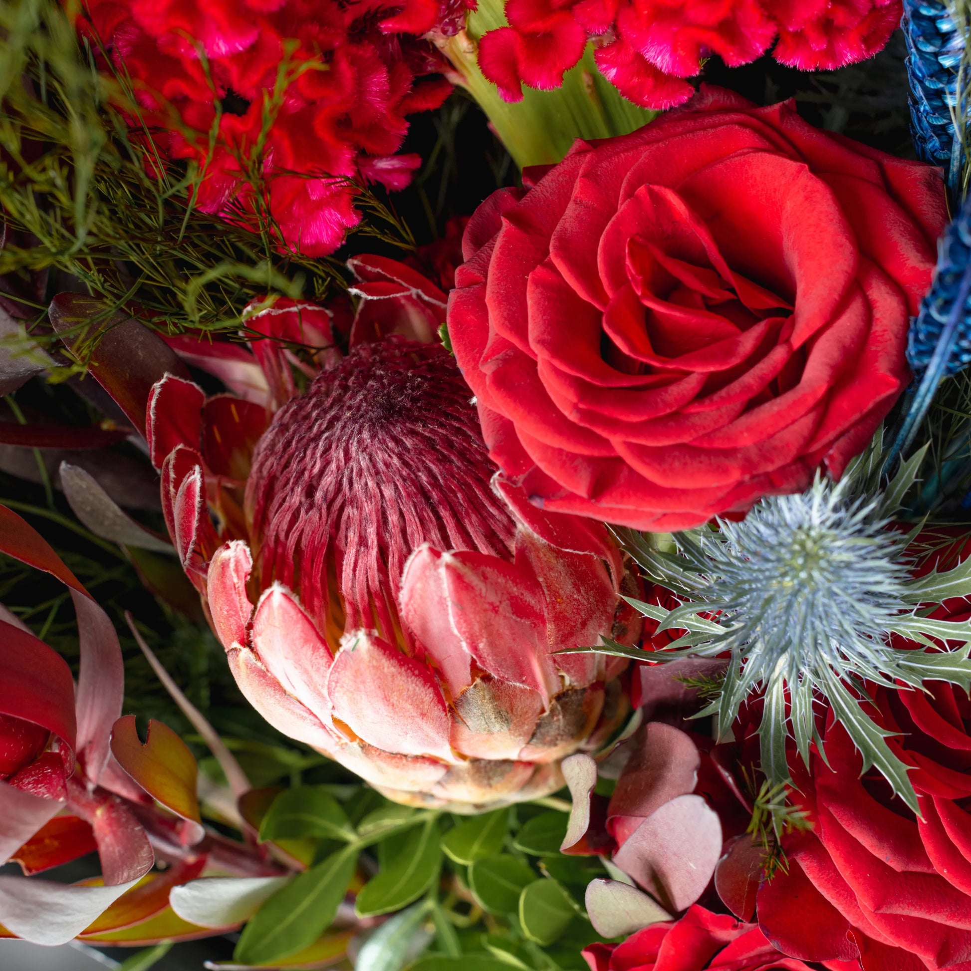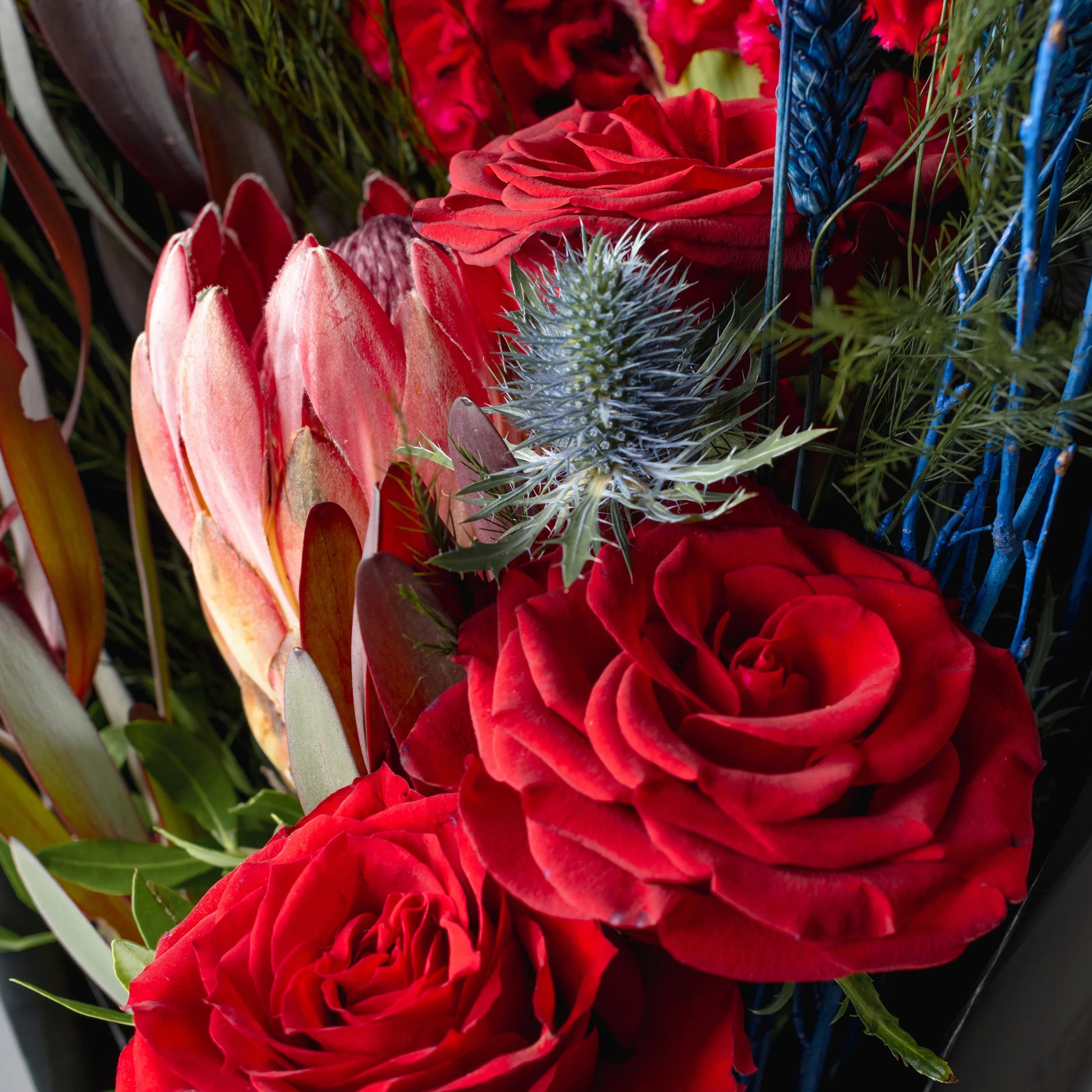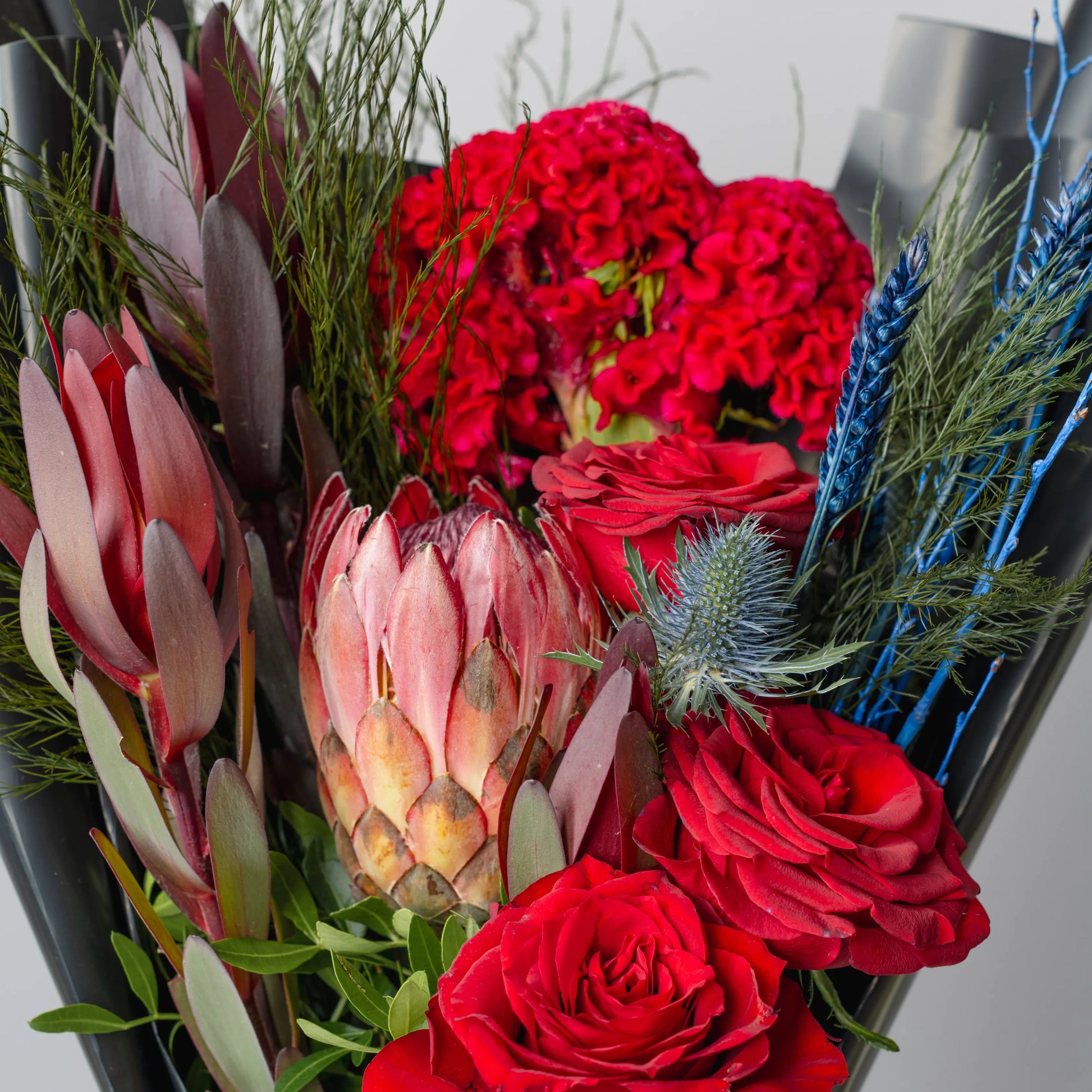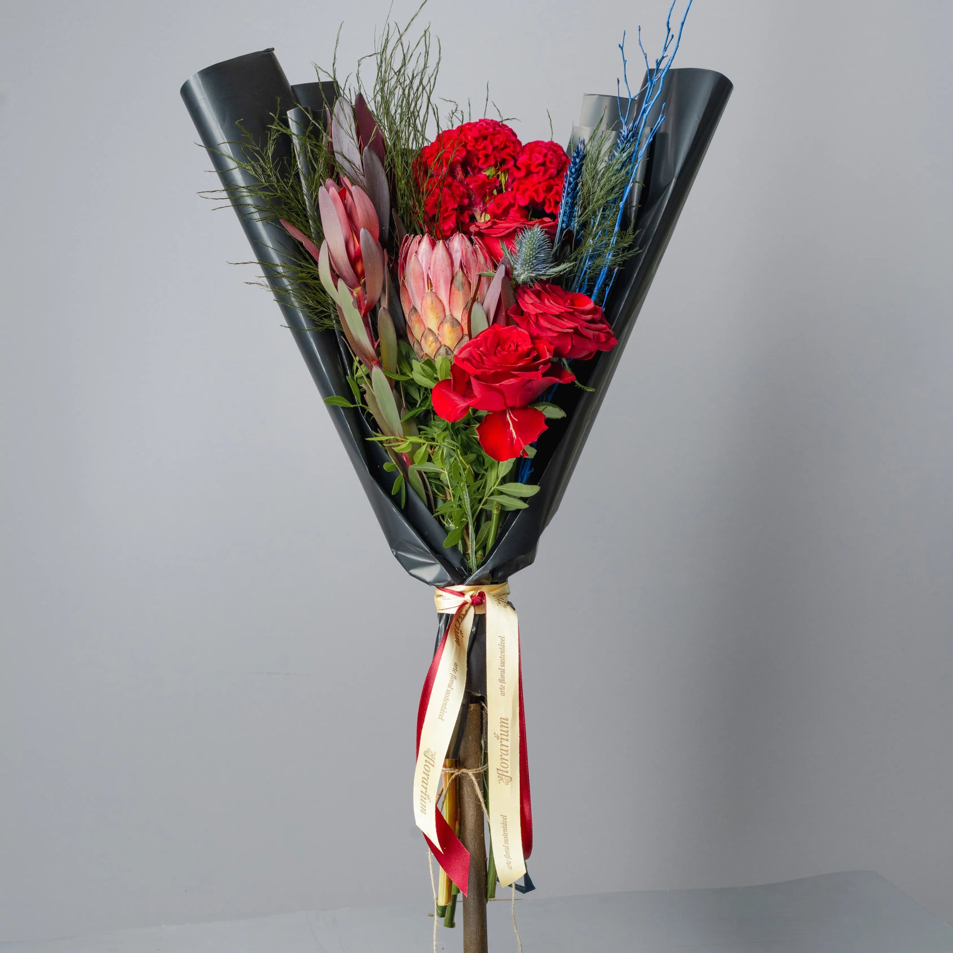 The “Style and Courage” bouquet is an expressive combination of red protea, celosia and burgundy roses, complemented by blue branches. These deep, rich colors symbolize strength, confidence and elegance. The gray packaging highlights the sophisticated and refined character of the bouquet, creating a contrast and adding a touch of sophistication. This bouquet is ideal for a man who values style and expressiveness, and will make a perfect gift to convey respect and admiration.