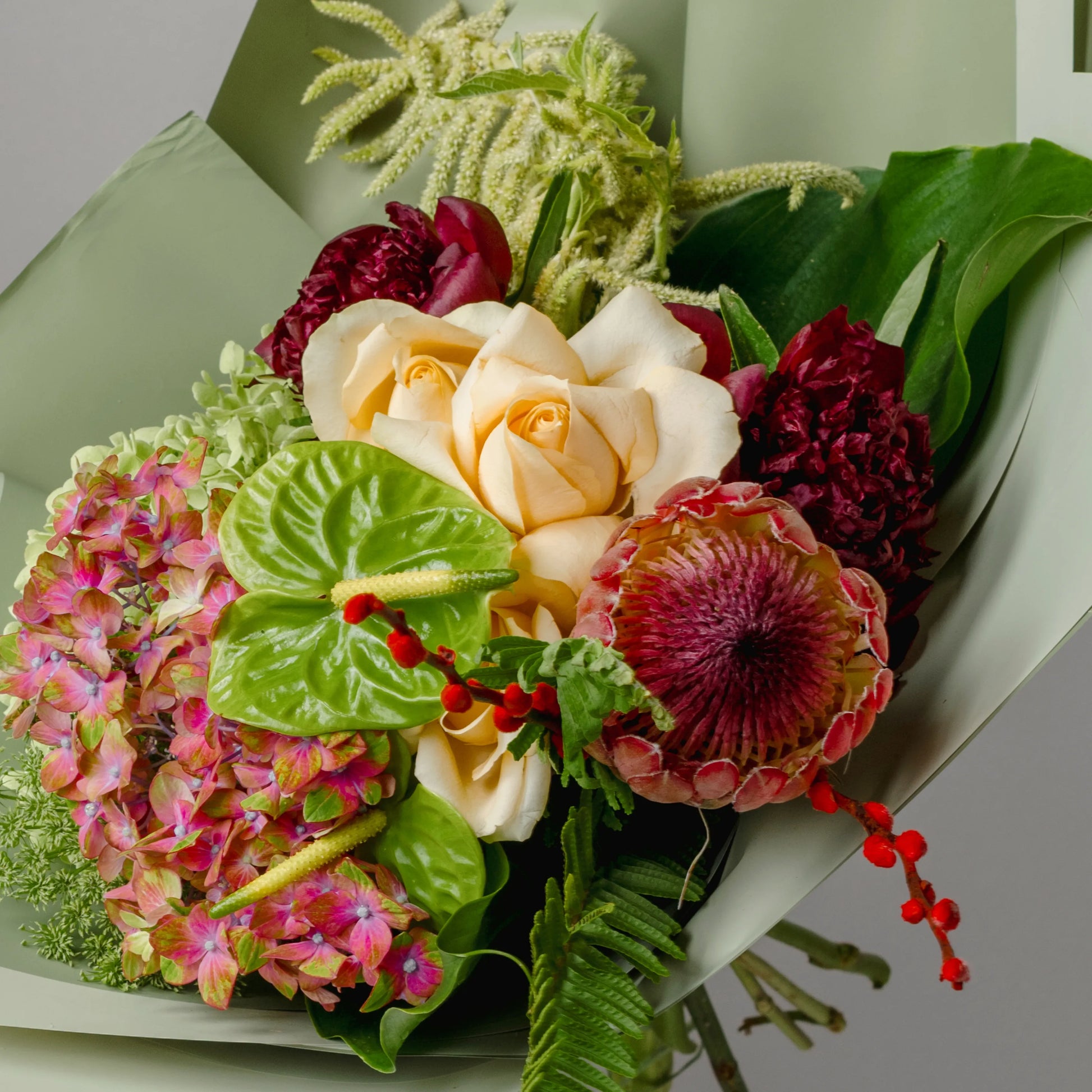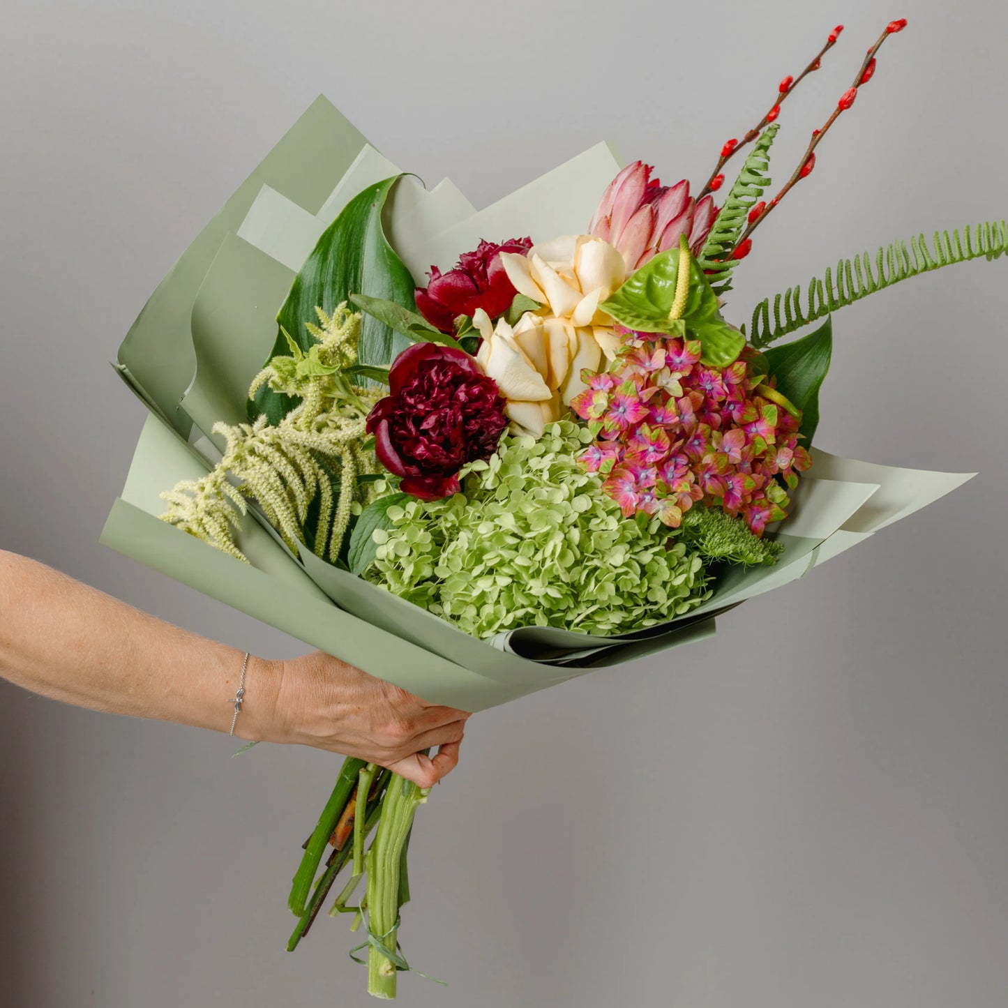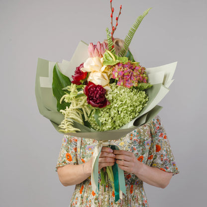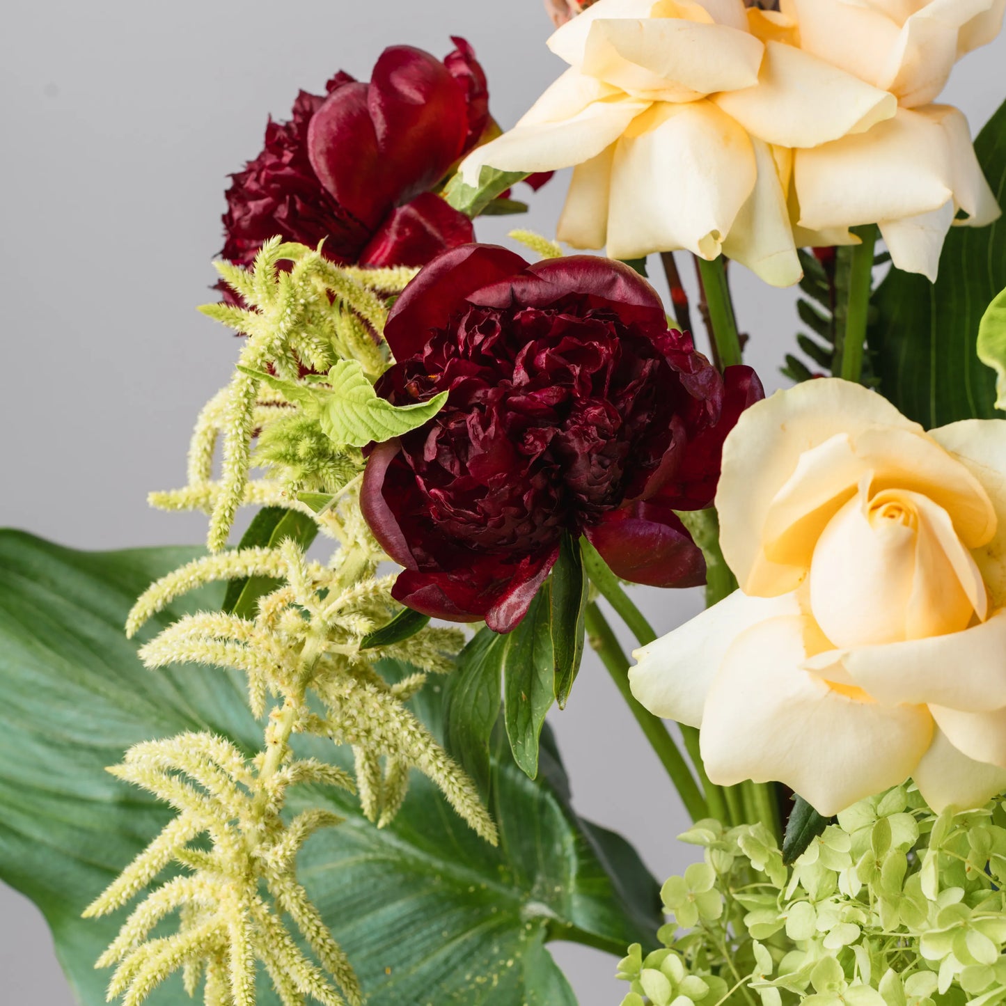 O ramo “Beleza Simples” é uma combinação refinada de tons e texturas naturais, apresentando hortênsias verdes e vermelho-verde, peônias bordô, rosas creme, amaranto verde e ramos de salgueiro. Este ramo encarna a harmonia natural e a elegância. O contraste entre as peônias bordô e as delicadas rosas creme cria um acento sofisticado, enquanto os elementos verdes adicionam frescor e profundidade à composição. Os ramos de salgueiro trazem uma textura natural, destacando a beleza sutil e a simplicidade deste buquê. “Beleza Simples” é a escolha perfeita para quem aprecia a graça natural e a elegância serena