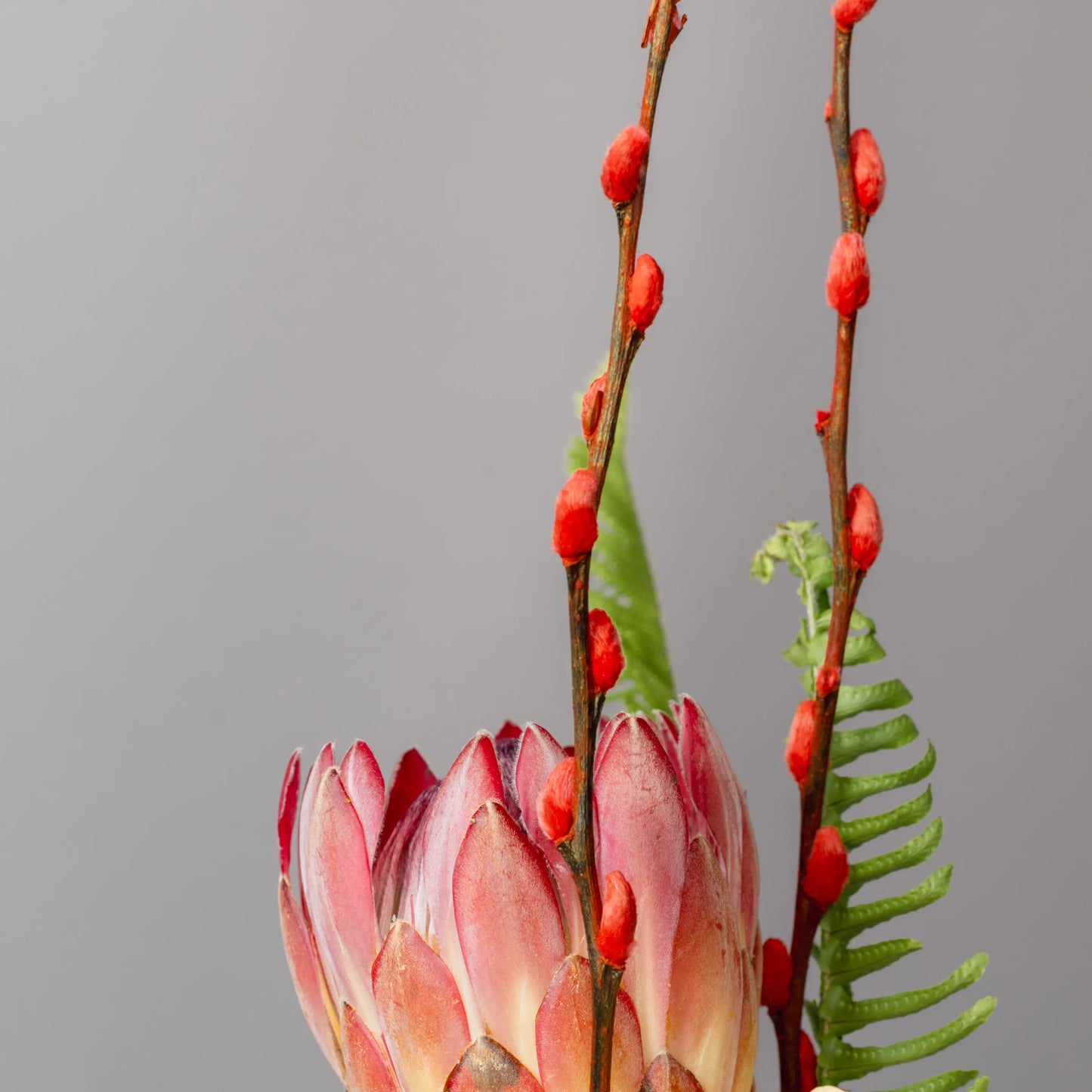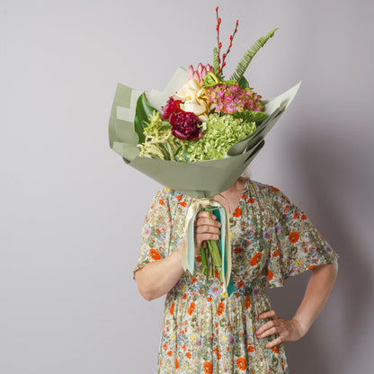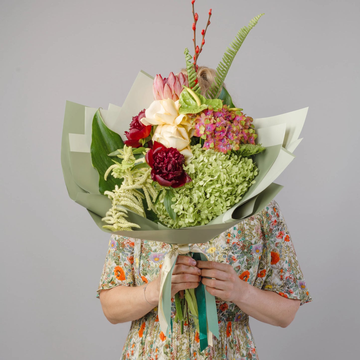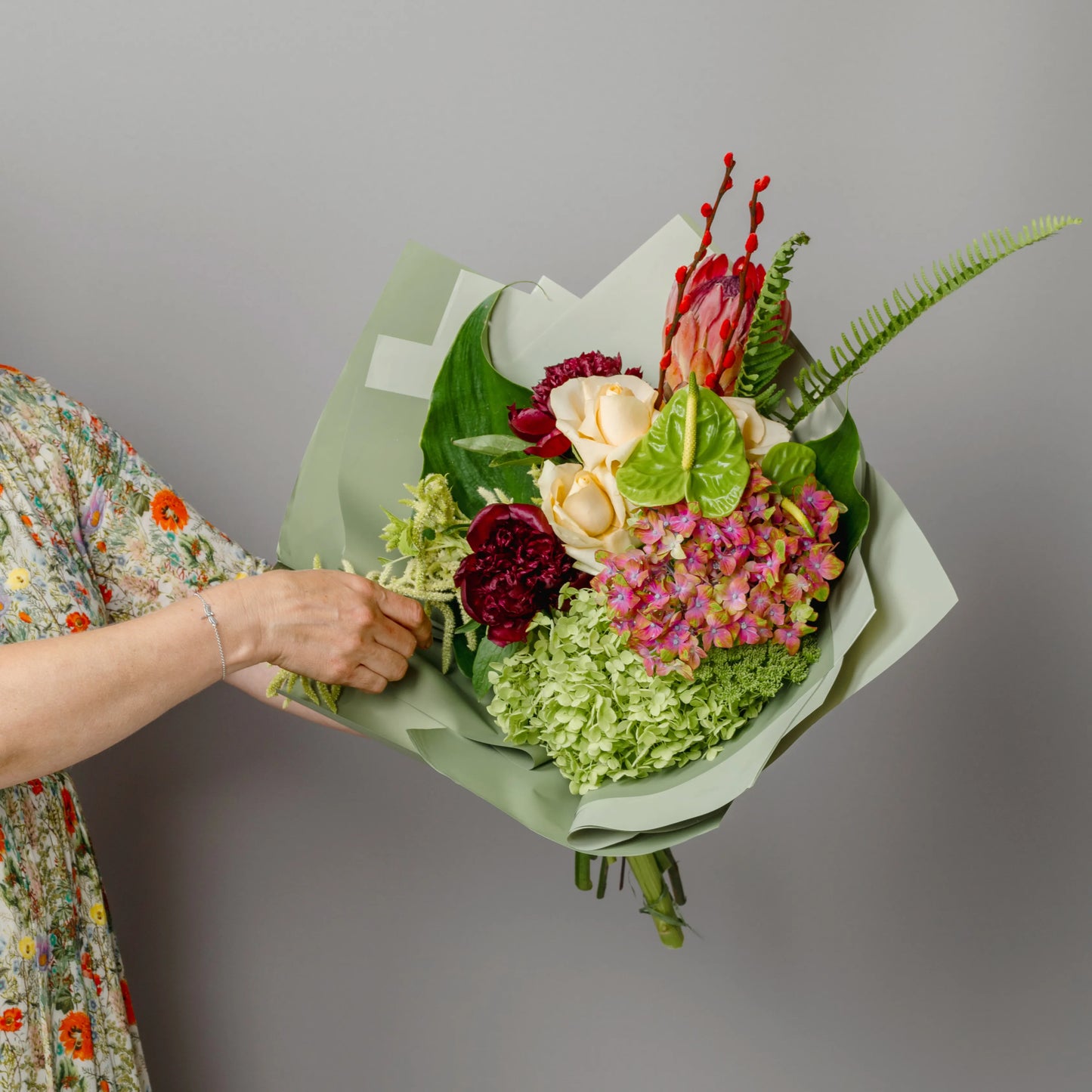 O ramo “Beleza Simples” é uma combinação refinada de tons e texturas naturais, apresentando hortênsias verdes e vermelho-verde, peônias bordô, rosas creme, amaranto verde e ramos de salgueiro. Este ramo encarna a harmonia natural e a elegância. O contraste entre as peônias bordô e as delicadas rosas creme cria um acento sofisticado, enquanto os elementos verdes adicionam frescor e profundidade à composição. Os ramos de salgueiro trazem uma textura natural, destacando a beleza sutil e a simplicidade deste buquê. “Beleza Simples” é a escolha perfeita para quem aprecia a graça natural e a elegância serena