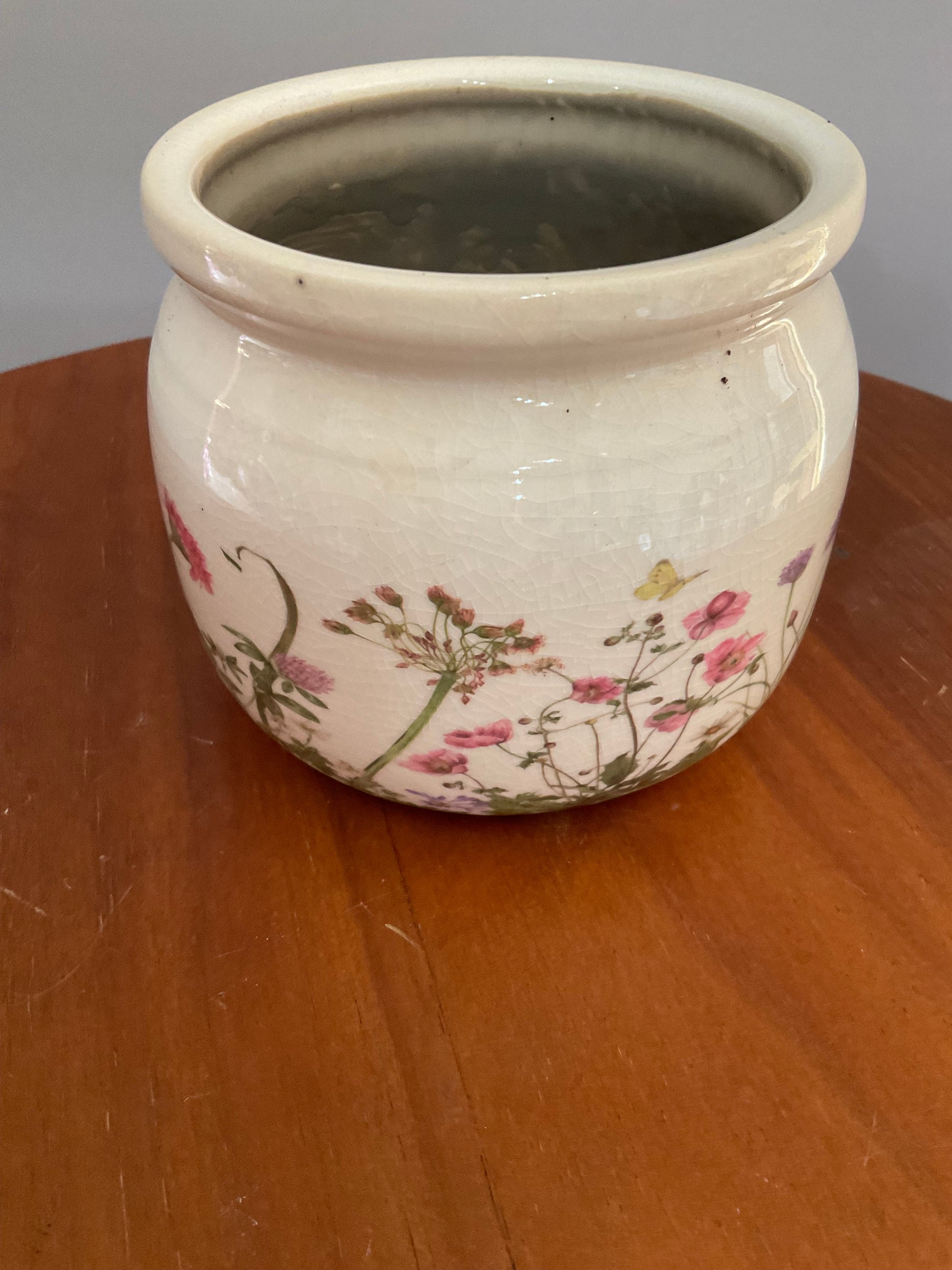 Este vaso de cerâmica, com formato clássico de pot e acabamento em branco sujo com efeito envelhecido, transmite a beleza simples e natural dos campos em flor. Decorado com delicadas flores silvestres, é uma peça que evoca liberdade, leveza e um toque nostálgico de finais de tarde ao ar livre.