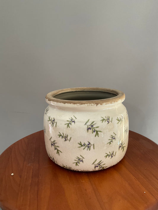 Vaso de Cerâmica Tipo Pot – Estilo Vintage Branco Envelhecido com Azeitonas