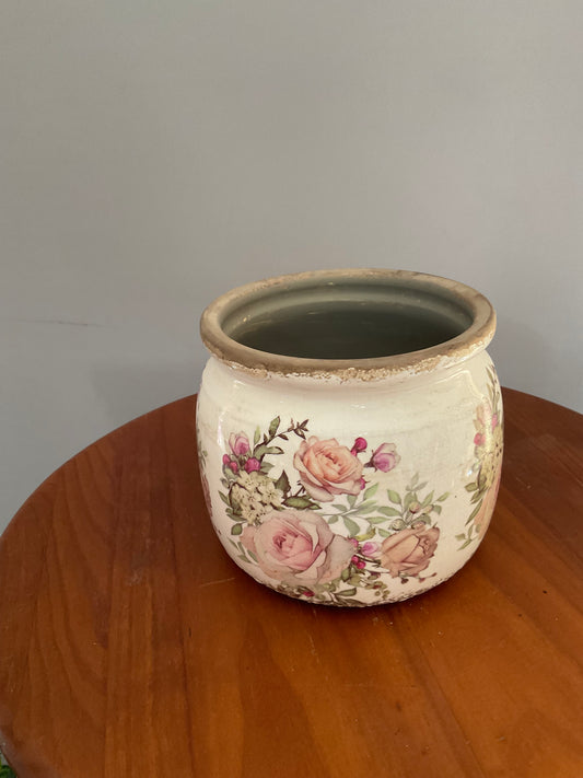 Vaso de Cerâmica Tipo Pot – Estilo Vintage Branco Envelhecido com Rosas de Jardim Cor-de-Rosa