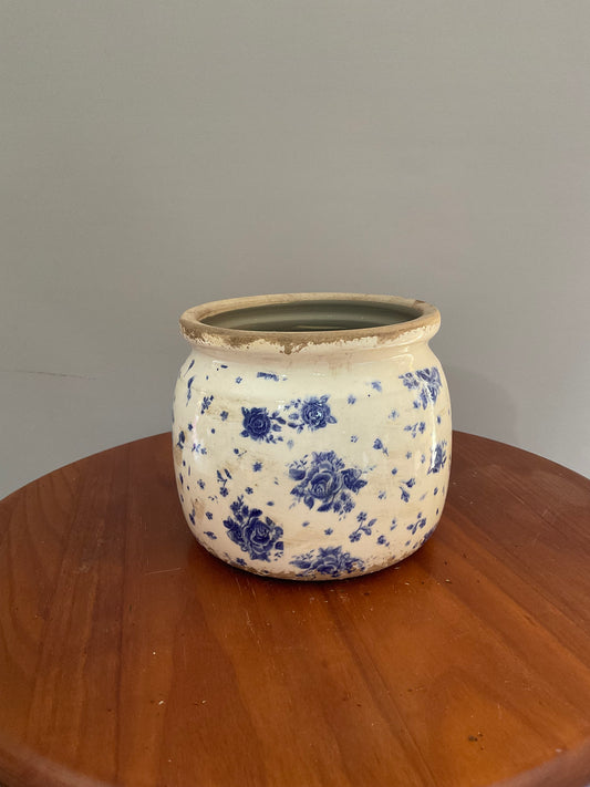 Vaso de Cerâmica Estilo Vintage – Branco Envelhecido com Flores Azul-Escuro