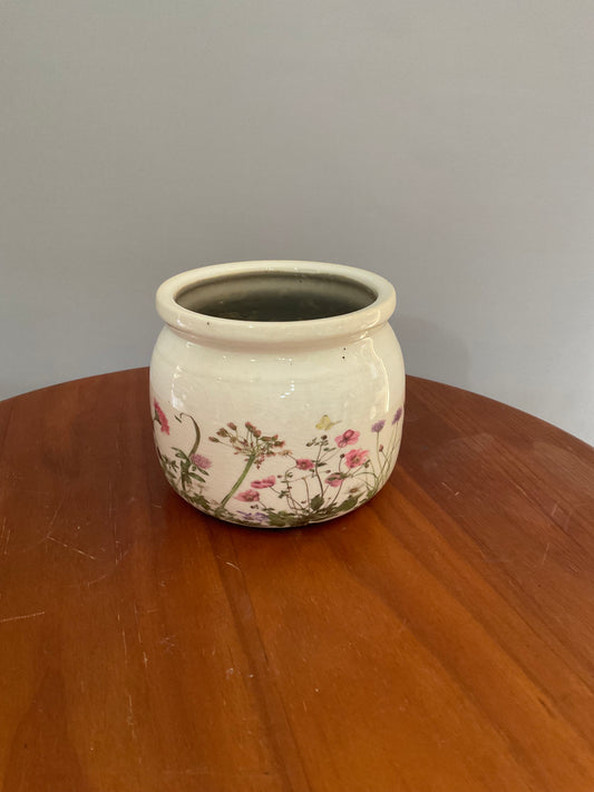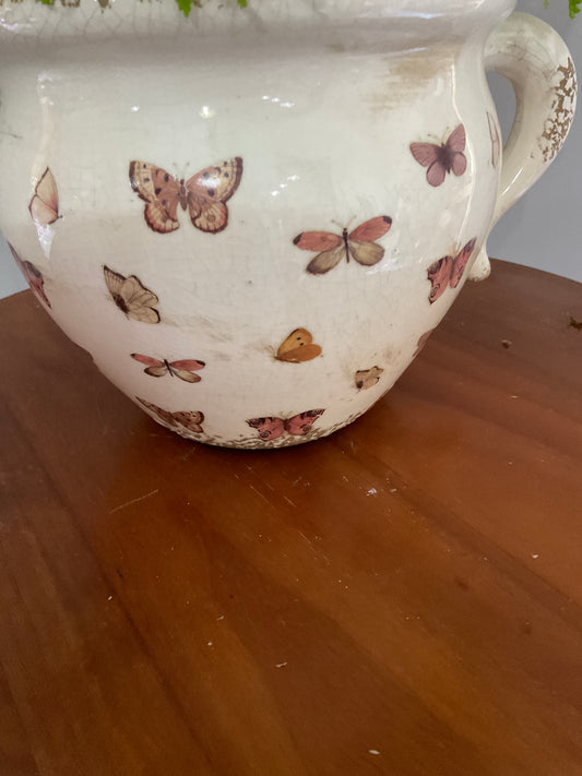 Vaso de Cerâmica Tipo Pot – Estilo Vintage Branco Envelhecido com Borboletas Roxas