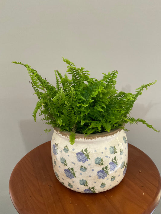 Vaso de Cerâmica Tipo Pot – Estilo Vintage Branco Sujo com Hortênsias Azuis