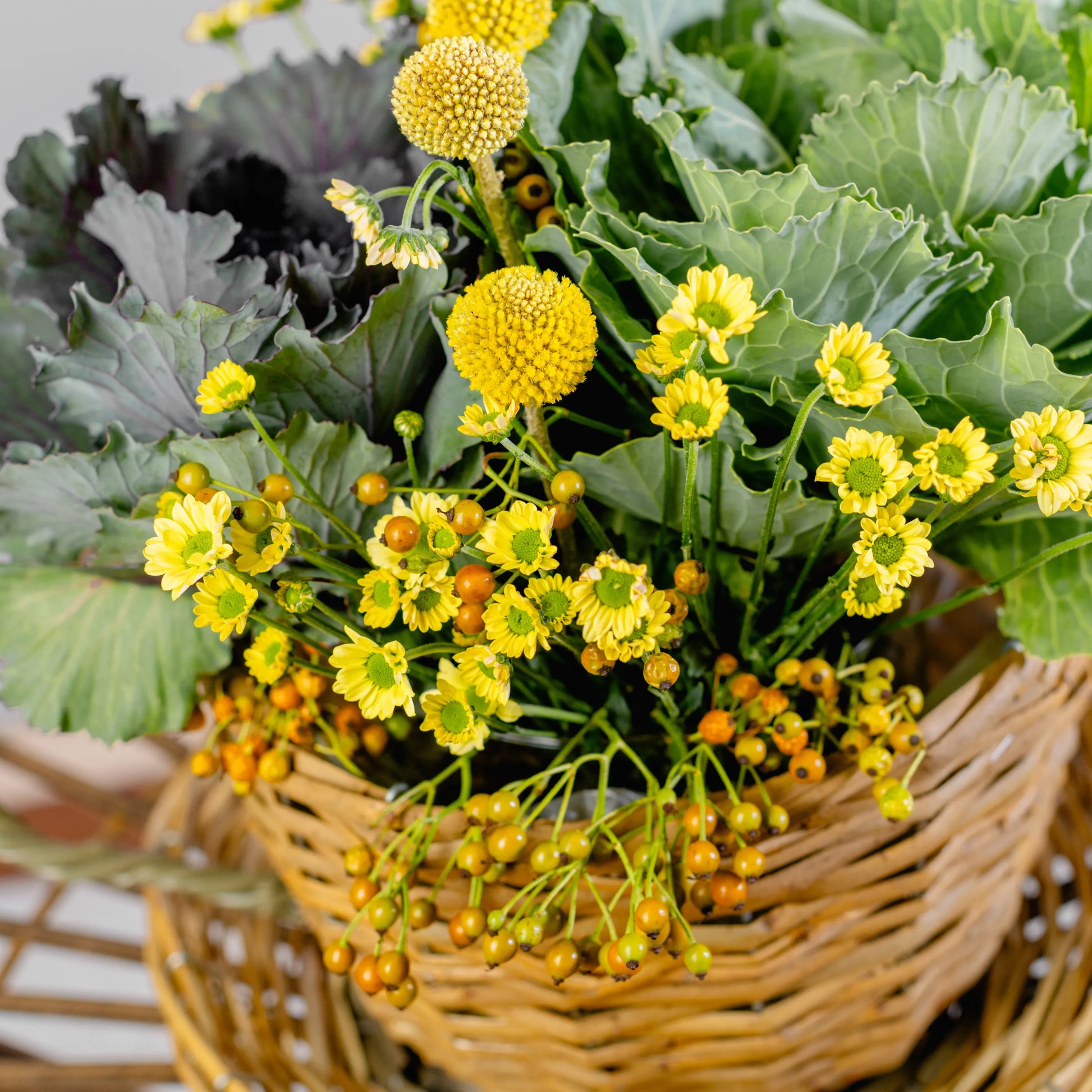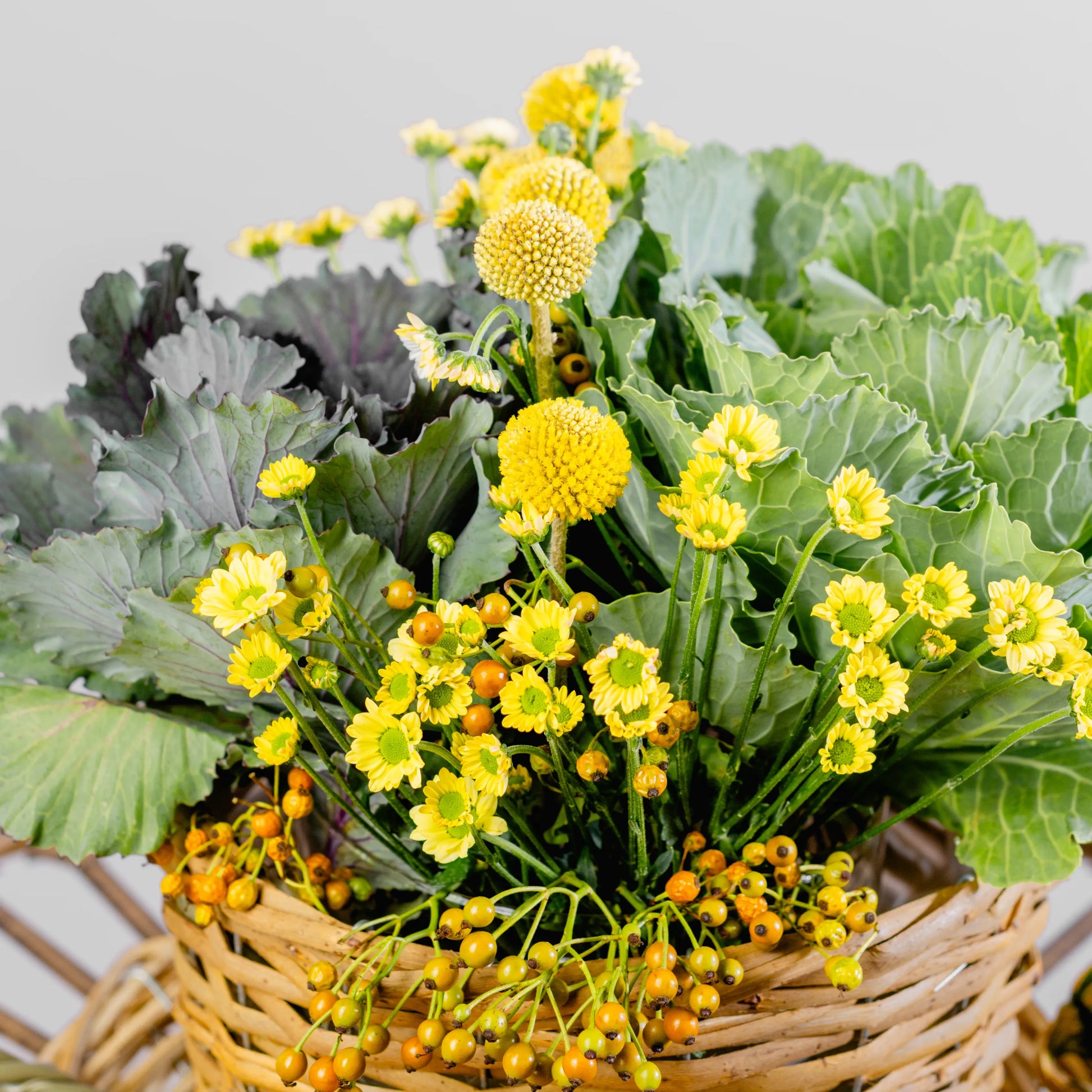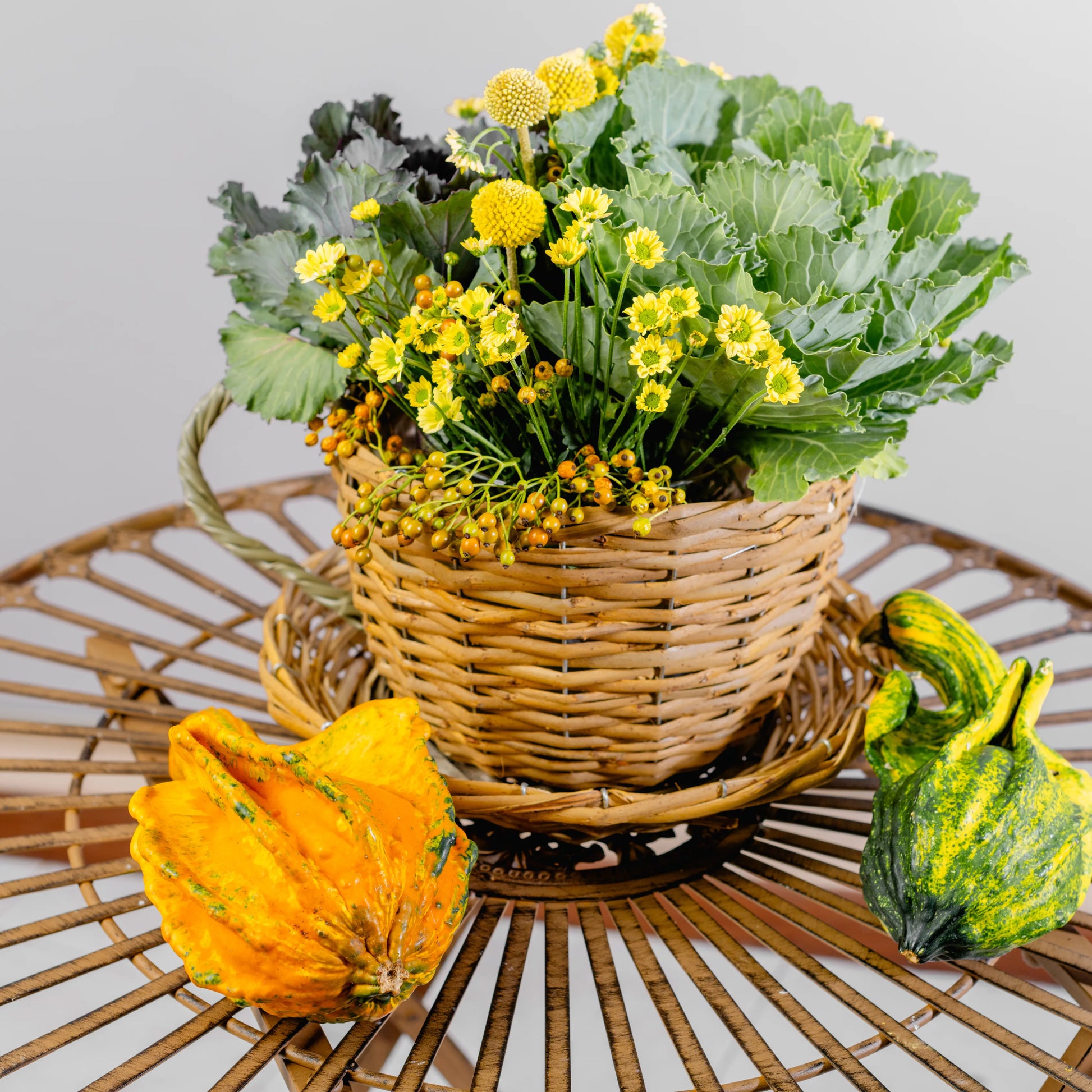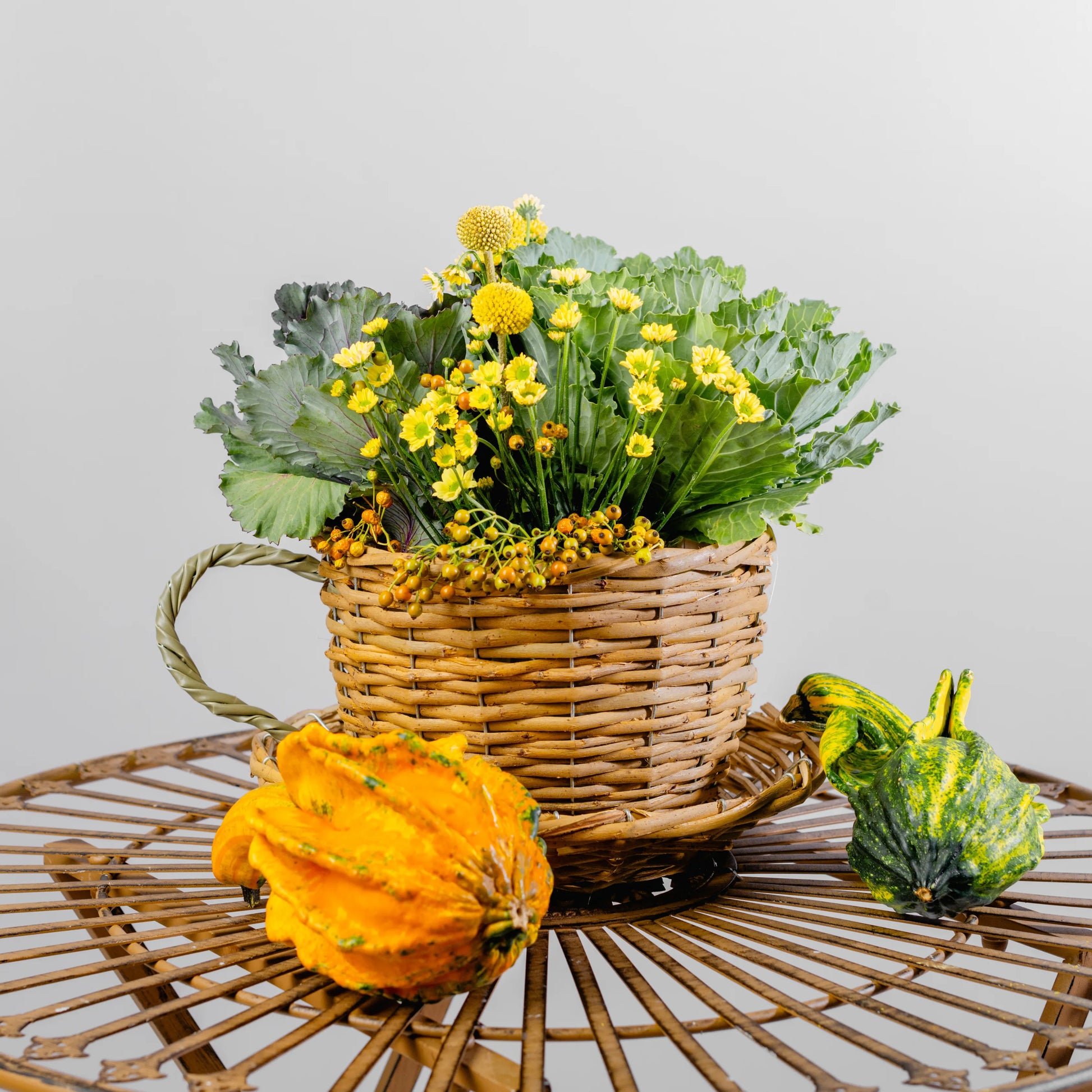 Este arranjo é como um delicioso momento de pausa ao amanhecer, onde a simplicidade do campo se encontra com o conforto de um café. Couves ornamentais verdes, com suas formas únicas, trazem um toque de frescura, enquanto as craspédias e as pequenas margaridas amarelas iluminam a composição com a alegria dos primeiros raios de sol. As bagas em tons de amarelo e laranja adicionam um toque sutil de doçura. Tudo isto se encontra numa chávena de palha com pires, evocando o charme rústico e acolhedor de um pequeno-almoço ao ar livre, no coração de uma horta.