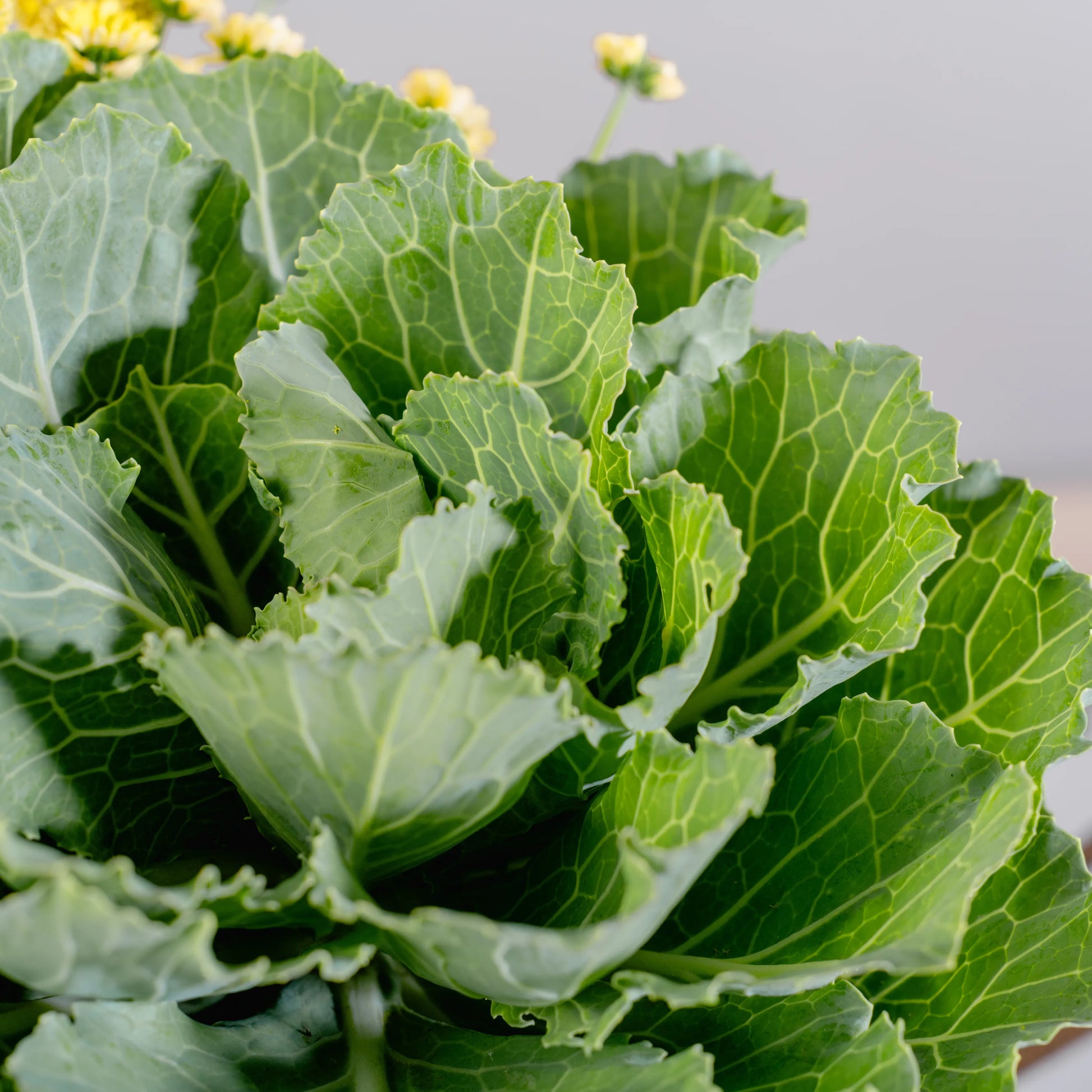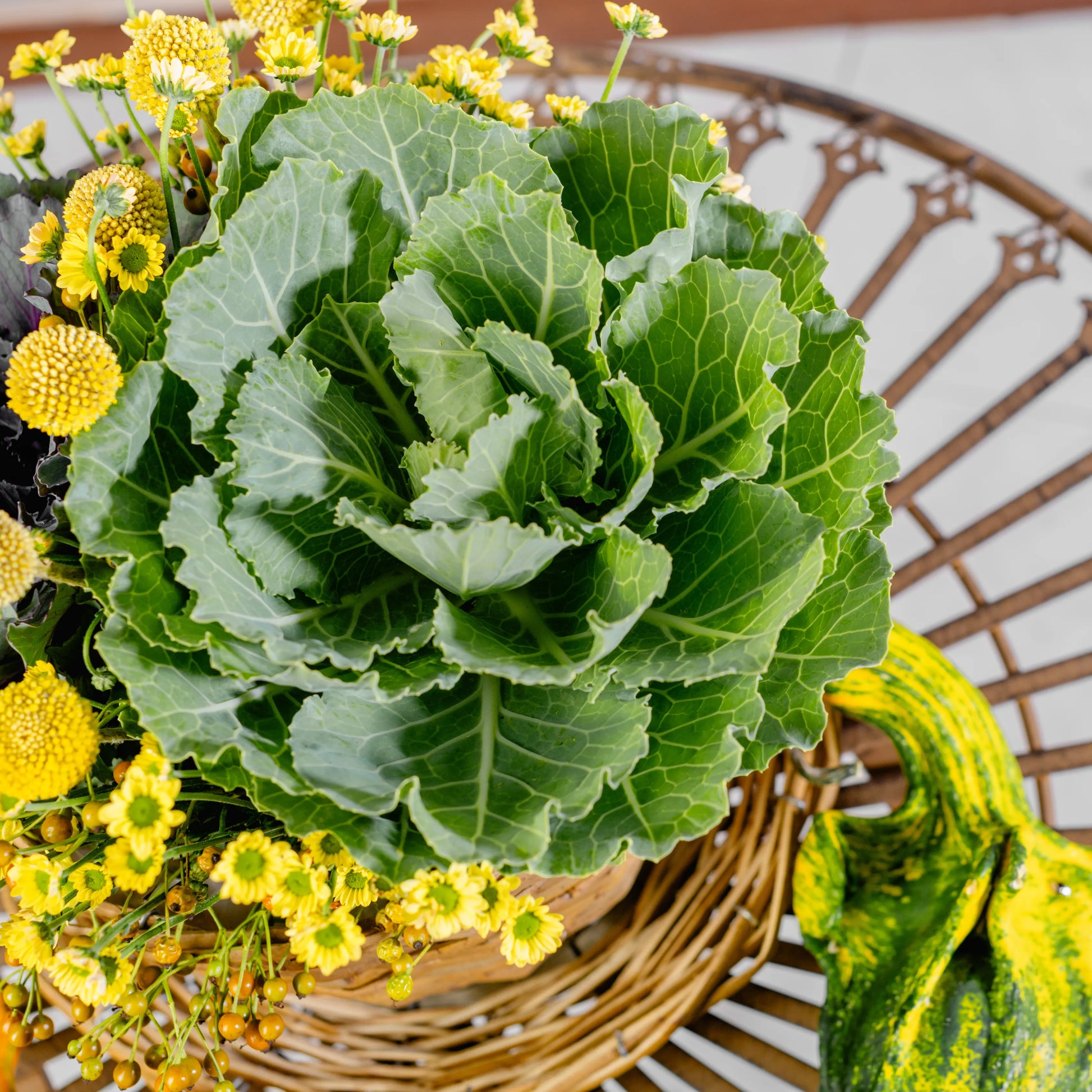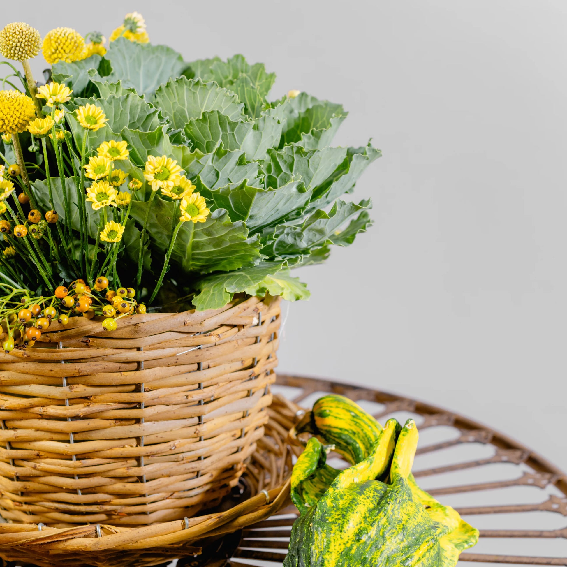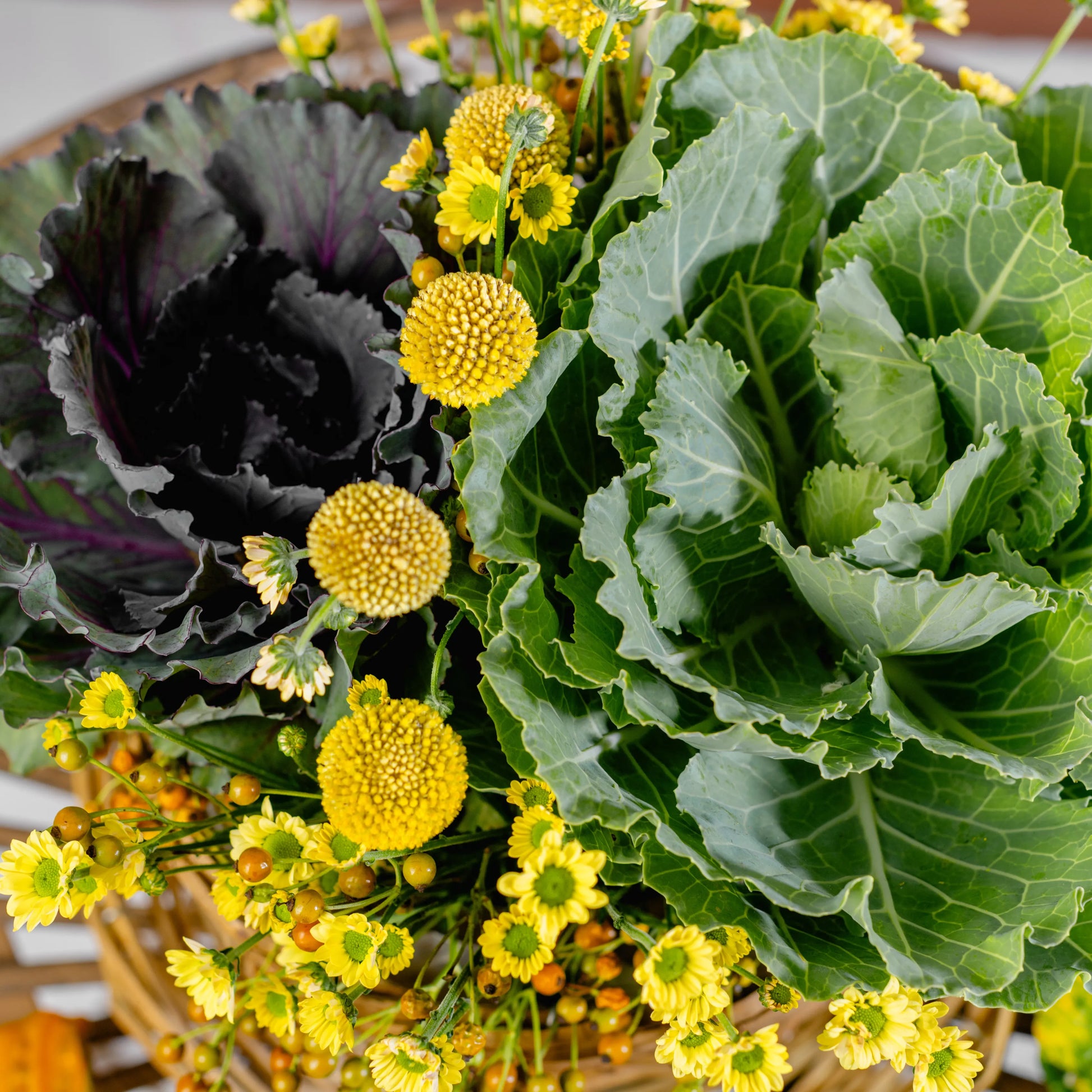 Este arranjo é como um delicioso momento de pausa ao amanhecer, onde a simplicidade do campo se encontra com o conforto de um café. Couves ornamentais verdes, com suas formas únicas, trazem um toque de frescura, enquanto as craspédias e as pequenas margaridas amarelas iluminam a composição com a alegria dos primeiros raios de sol. As bagas em tons de amarelo e laranja adicionam um toque sutil de doçura. Tudo isto se encontra numa chávena de palha com pires, evocando o charme rústico e acolhedor de um pequeno-almoço ao ar livre, no coração de uma horta.