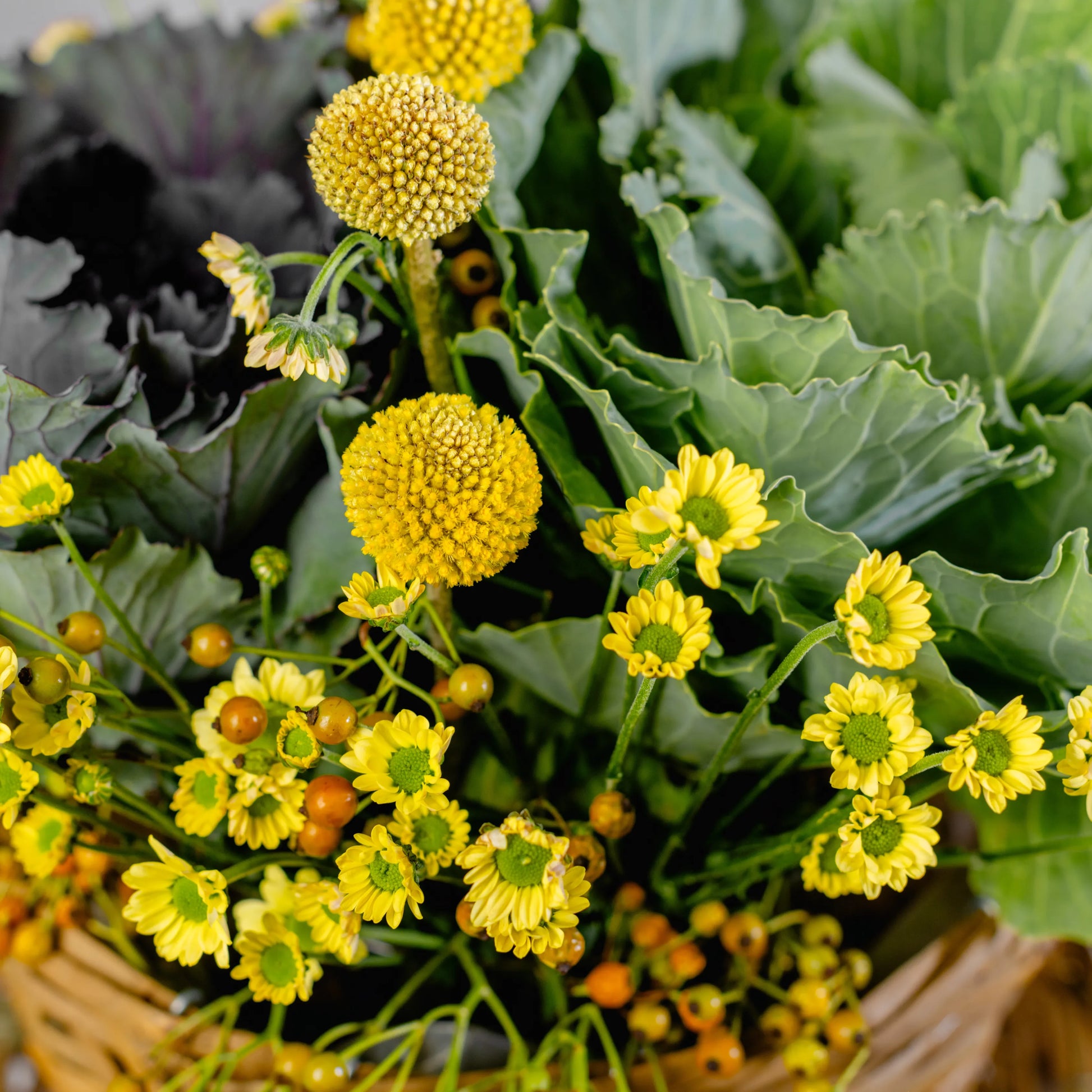 Coves ornamentais, margaridas amarelas, craspedia, bagas de cor laranja e cor amarelo