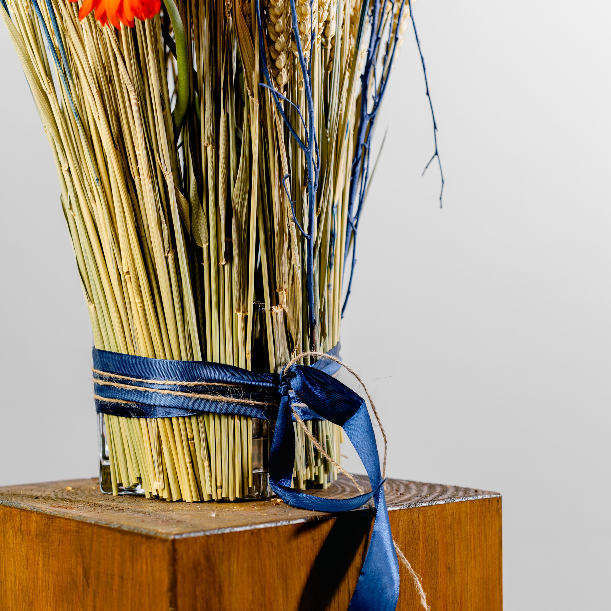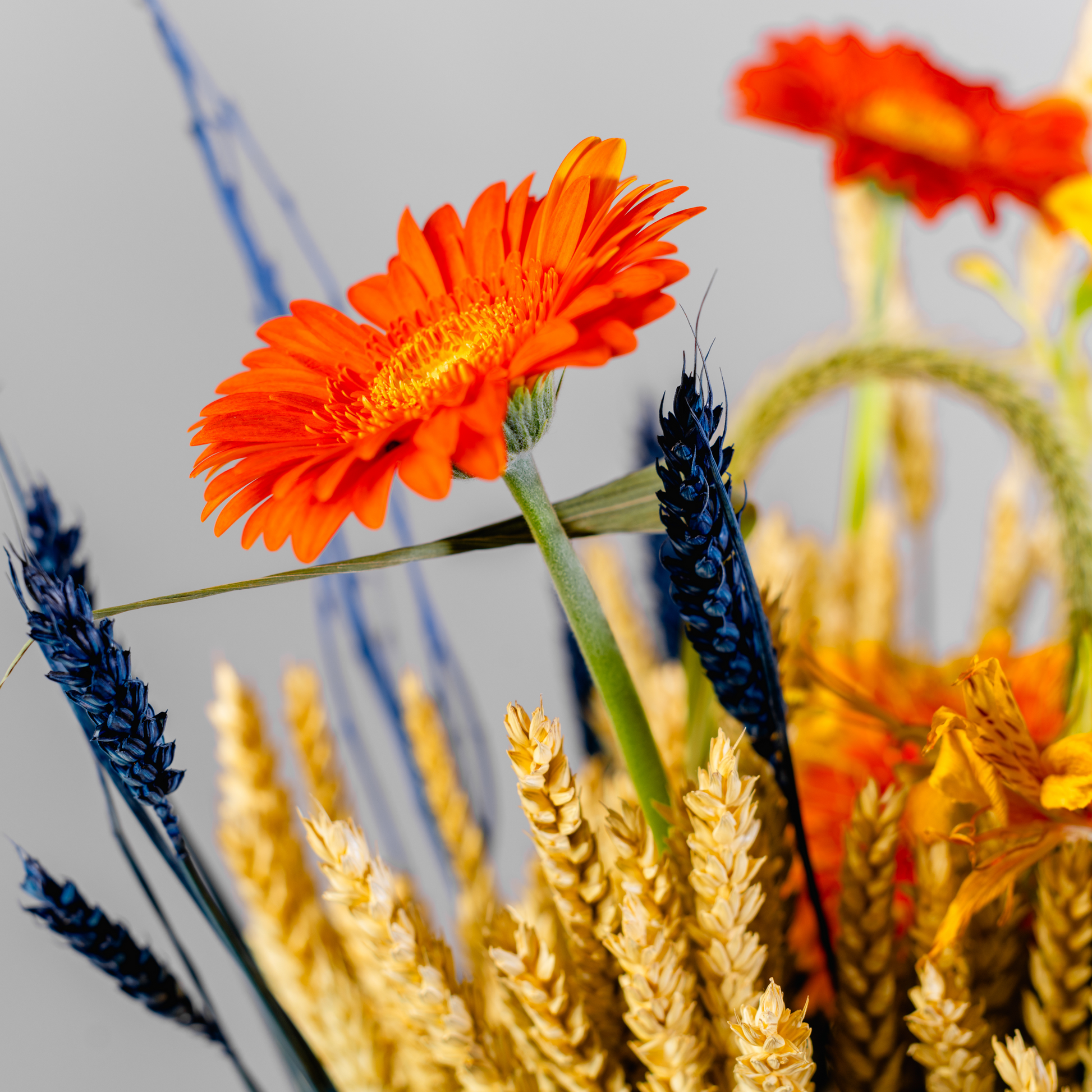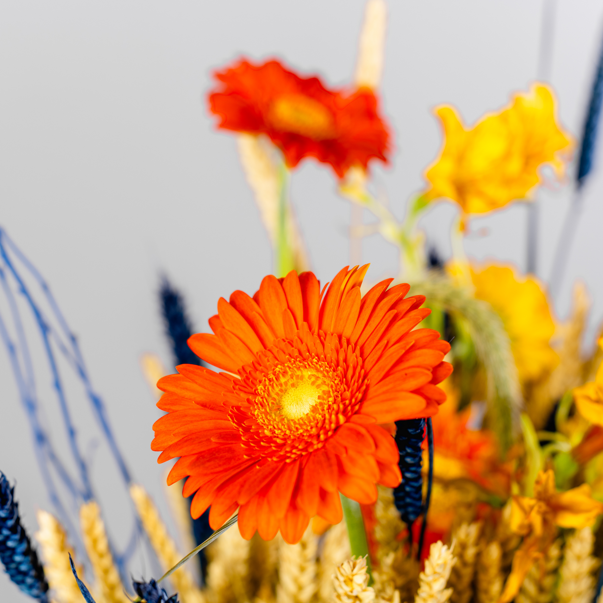 Espigas de trigo douradas entrelaçadas com espigas azul-escuro evocam a harmonia entre o tradicional e o inesperado. No centro, gerberas laranja desabrocham como pequenos sóis, algumas delas parecendo surgir diretamente das orelhas do trigo, criando um visual surpreendente e encantador. As fitas em azul-escuro e laranja, que atam a composição, conferem-lhe uma sensação rústica e vibrante, como se estivéssemos a celebrar a abundância da colheita e a chegada do outono num campo de sonhos.
