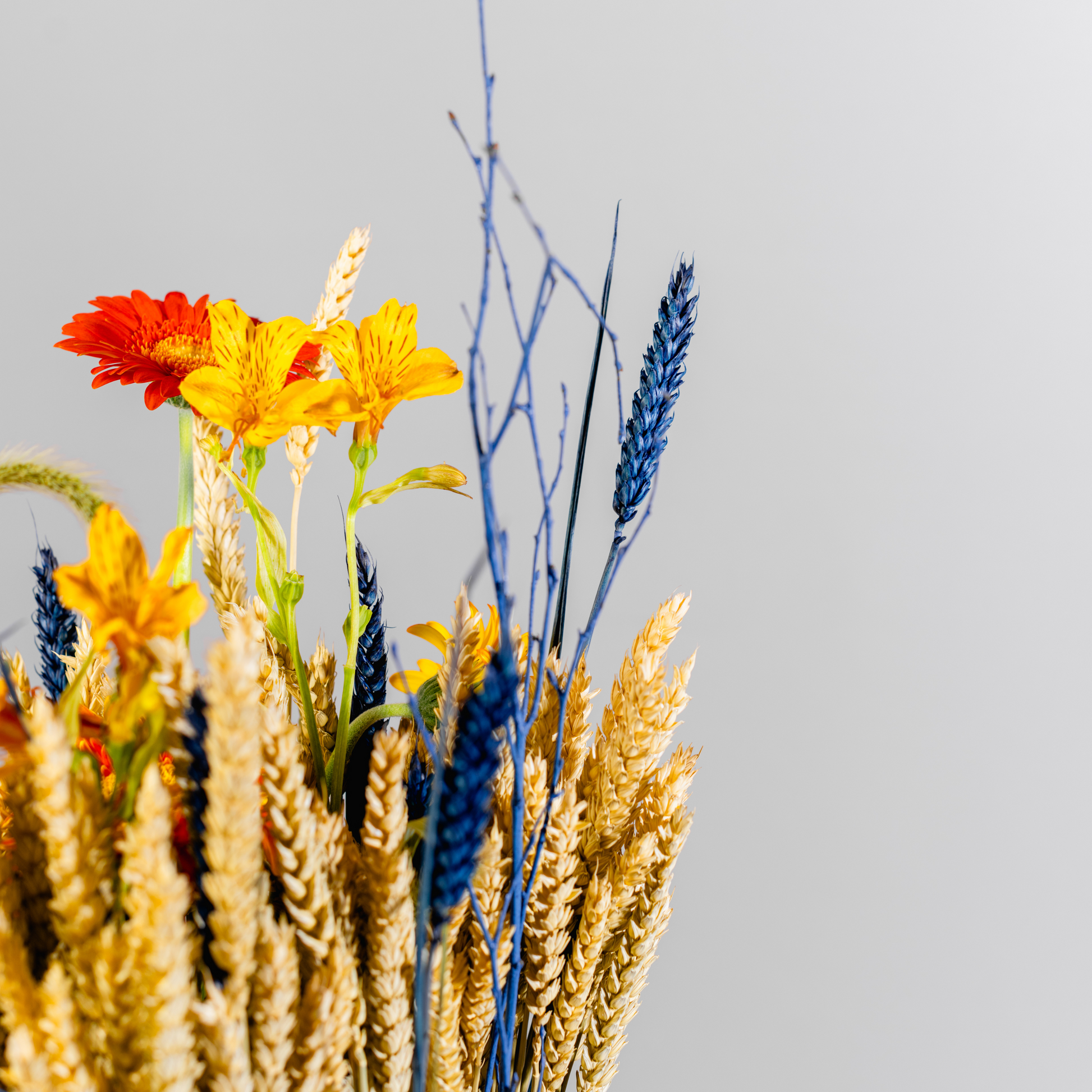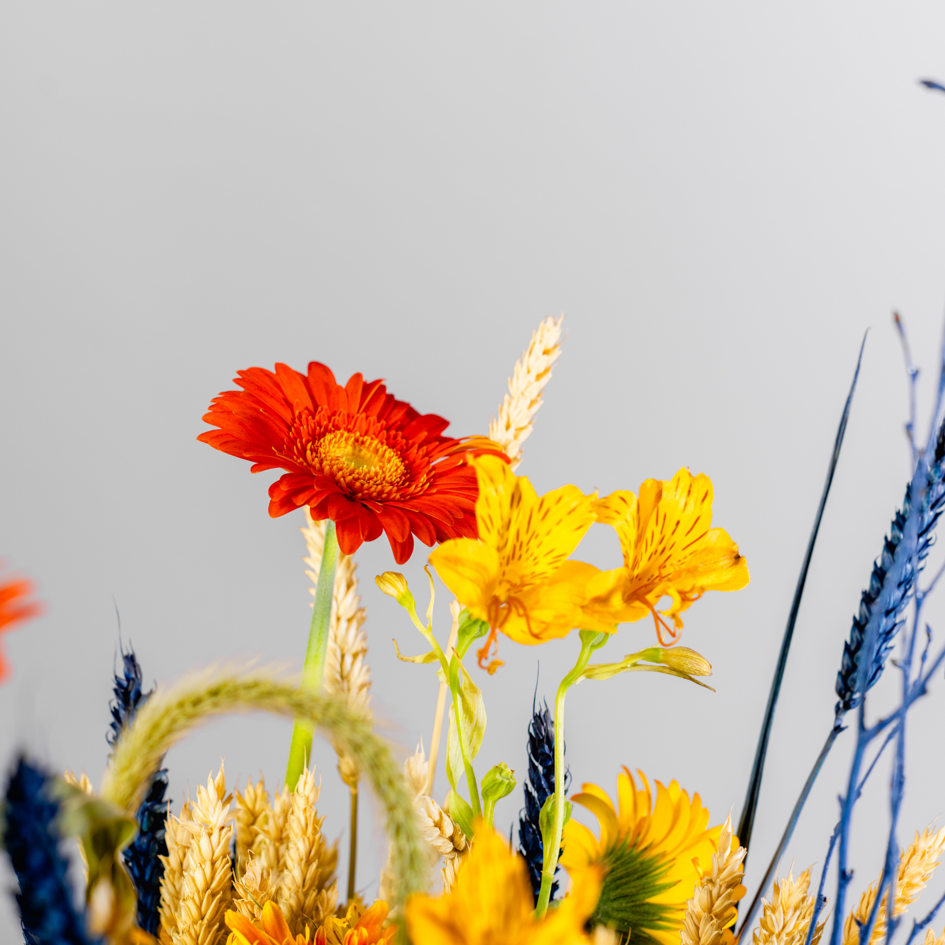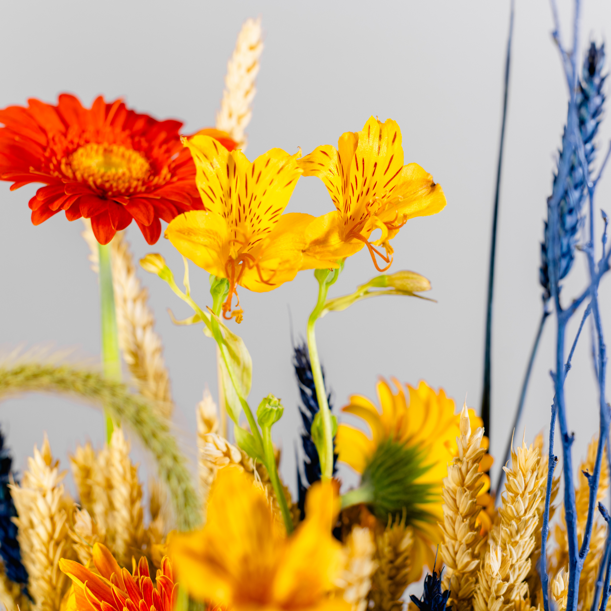 Espigas de trigo douradas entrelaçadas com espigas azul-escuro evocam a harmonia entre o tradicional e o inesperado. No centro, gerberas laranja desabrocham como pequenos sóis, algumas delas parecendo surgir diretamente das orelhas do trigo, criando um visual surpreendente e encantador. As fitas em azul-escuro e laranja, que atam a composição, conferem-lhe uma sensação rústica e vibrante, como se estivéssemos a celebrar a abundância da colheita e a chegada do outono num campo de sonhos.