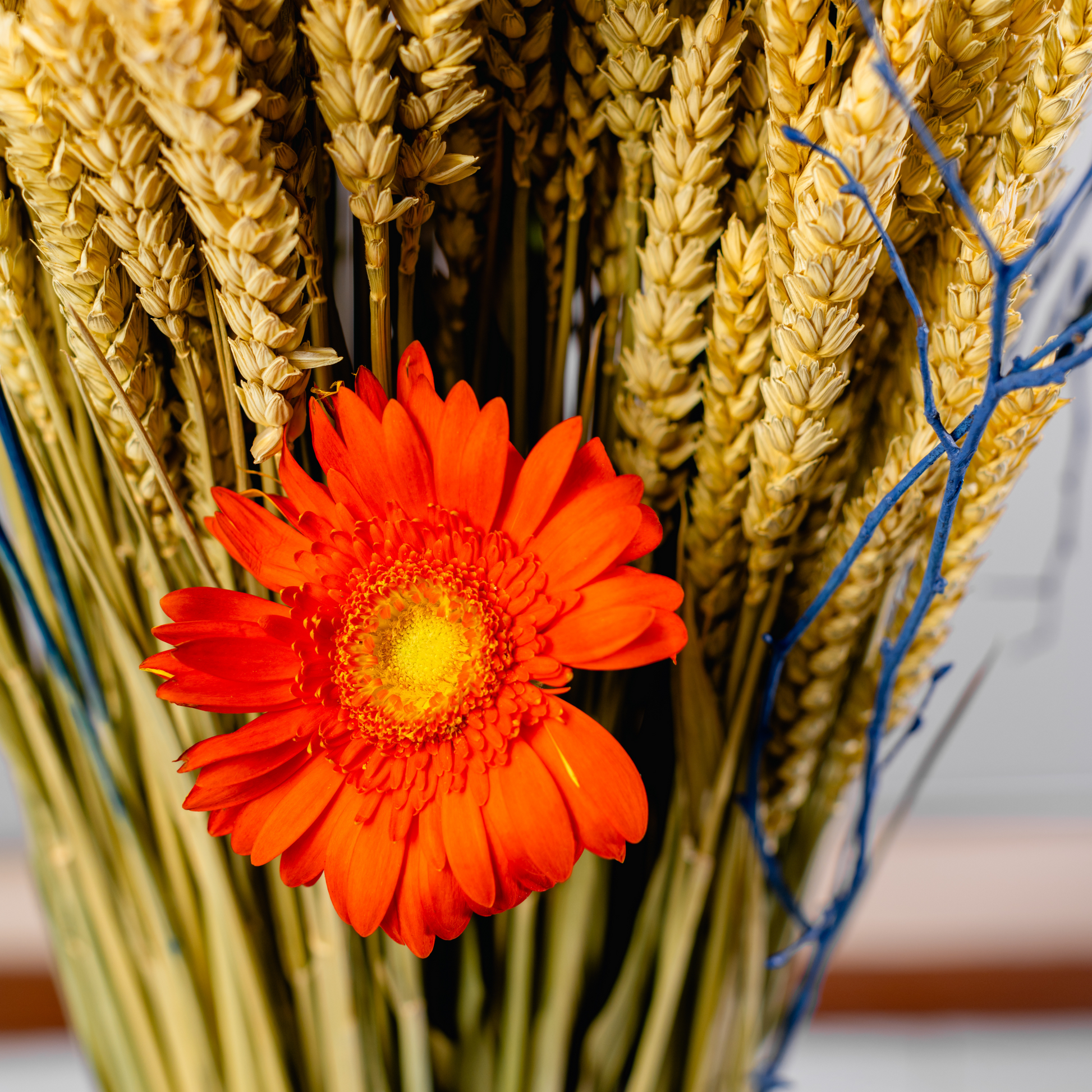 Espigas do trigo cor natural, gerberas de cor laranja, celisias de cor laranja, espigas de trigo cor azul escuro