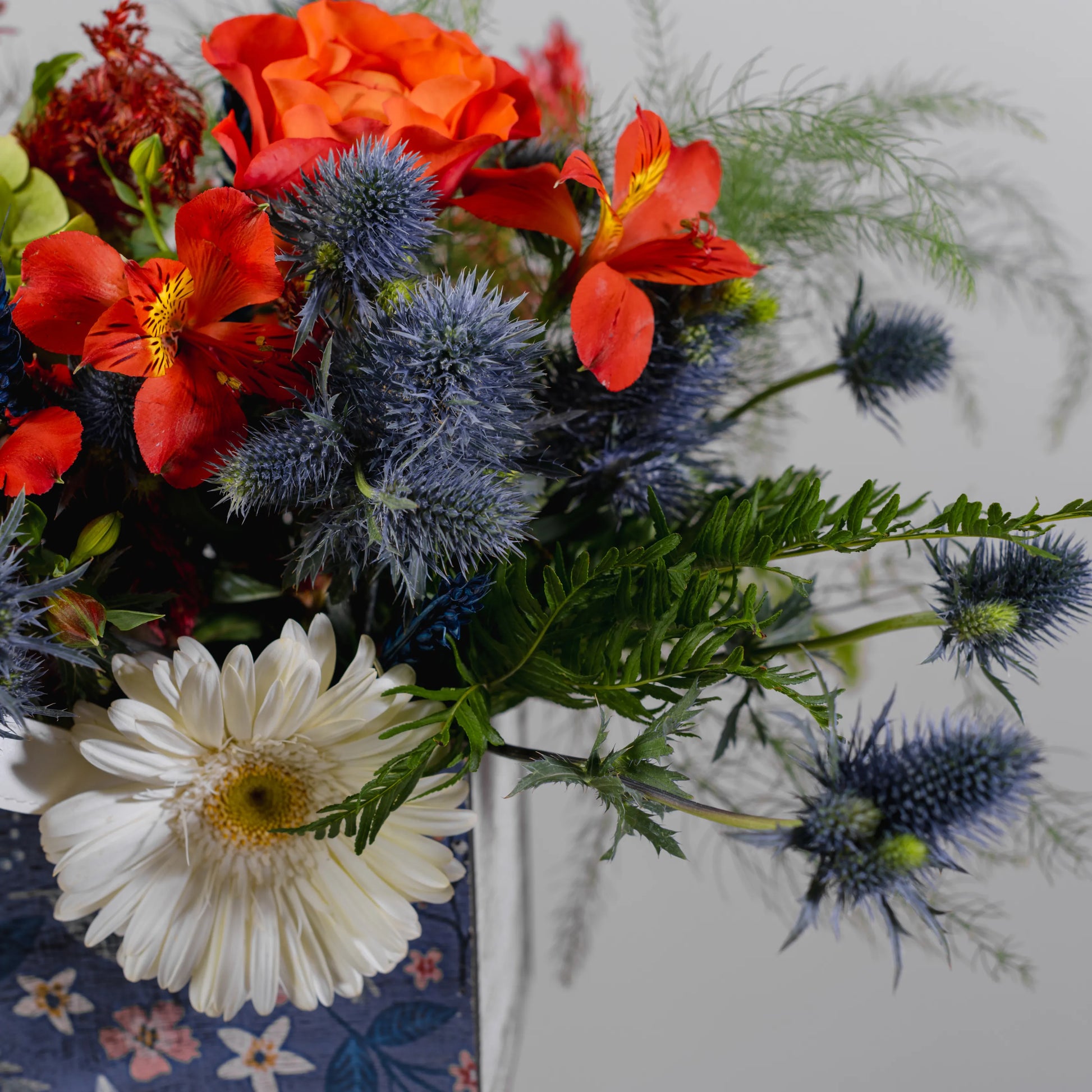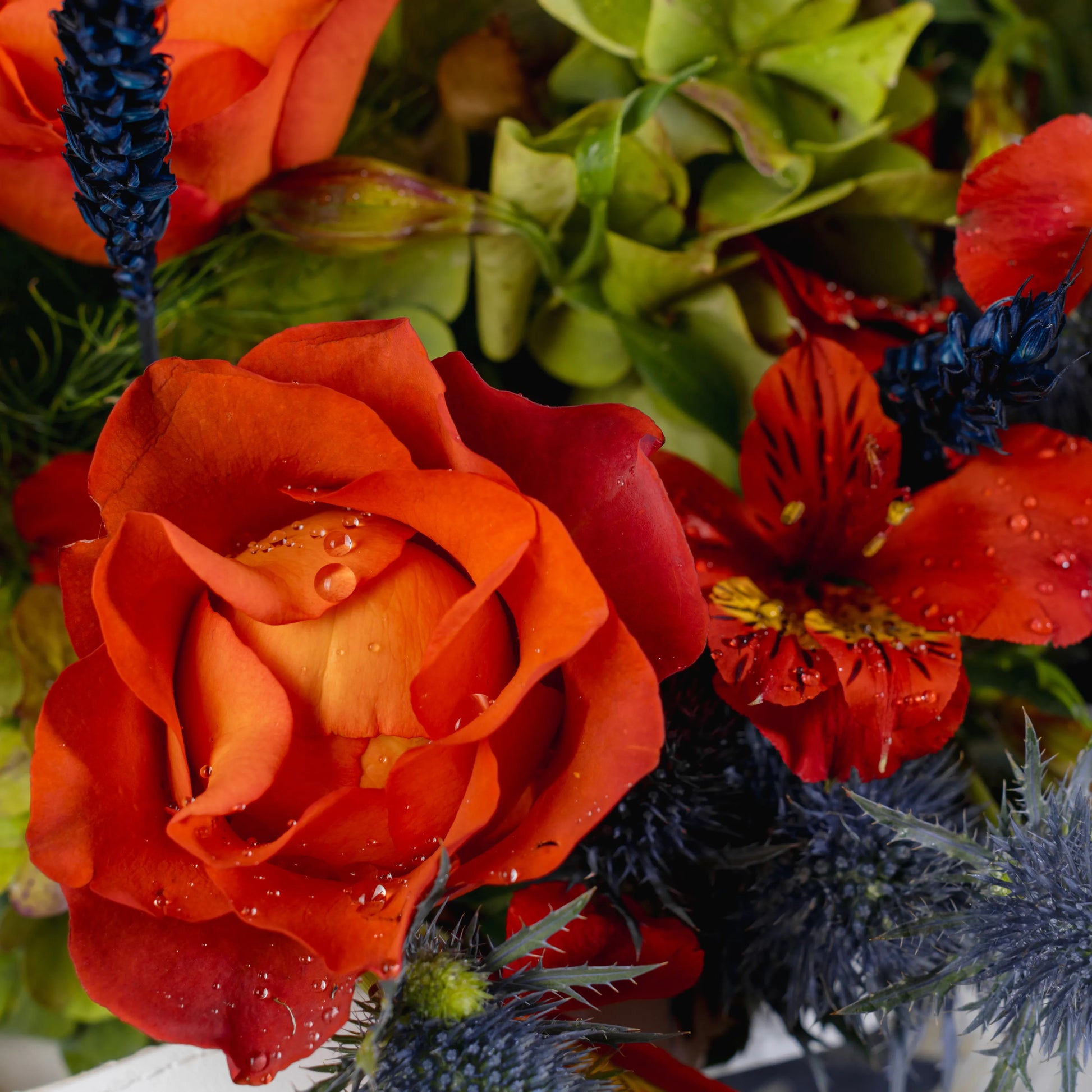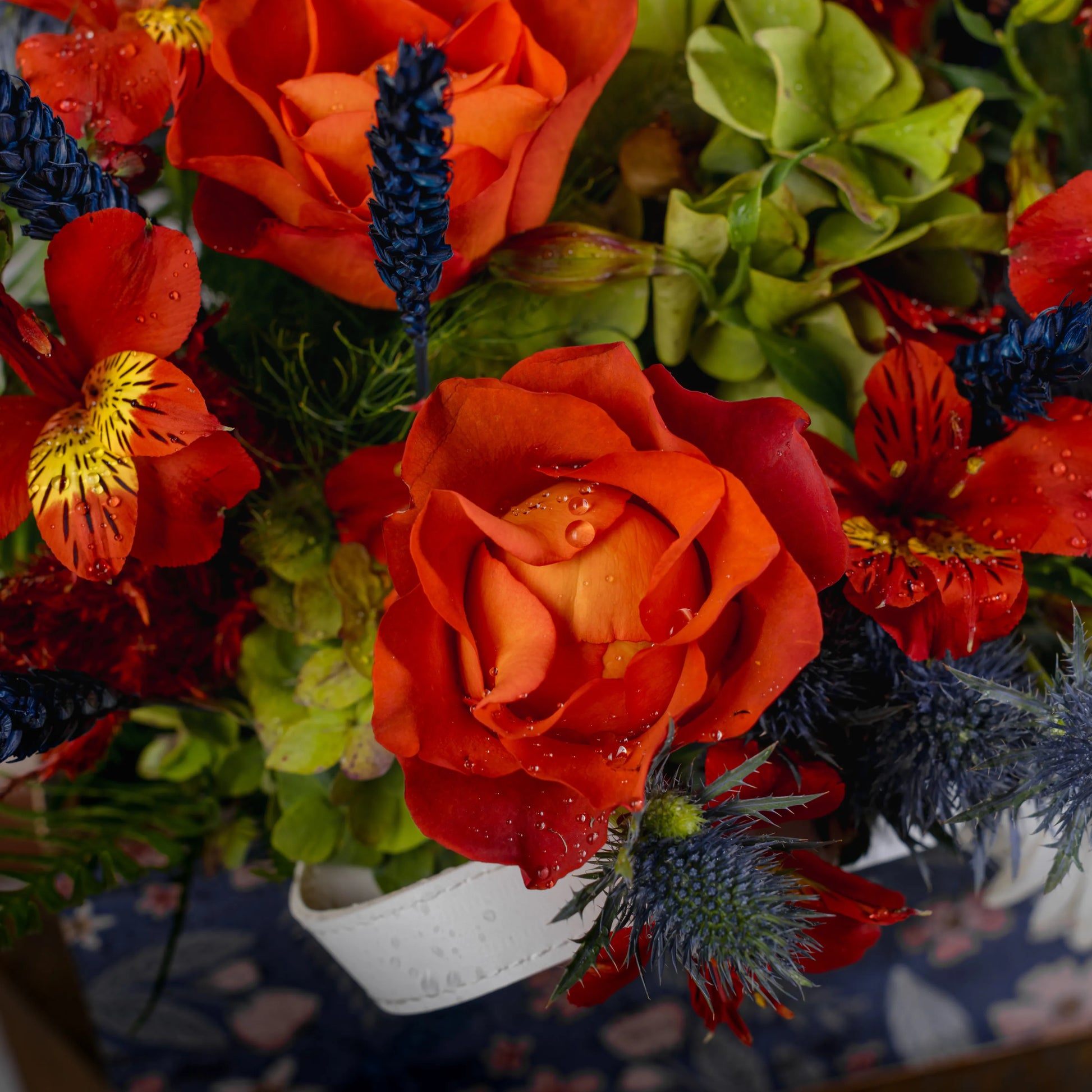 Rosa spray de cor laranja, celósia cor bordô, celosia de cor verde, hortênsia verde com apontamentos de vinho, hirygium, espigas de trigo azuis, feto verde, espargo verde, caixa azul com flores vermelhas