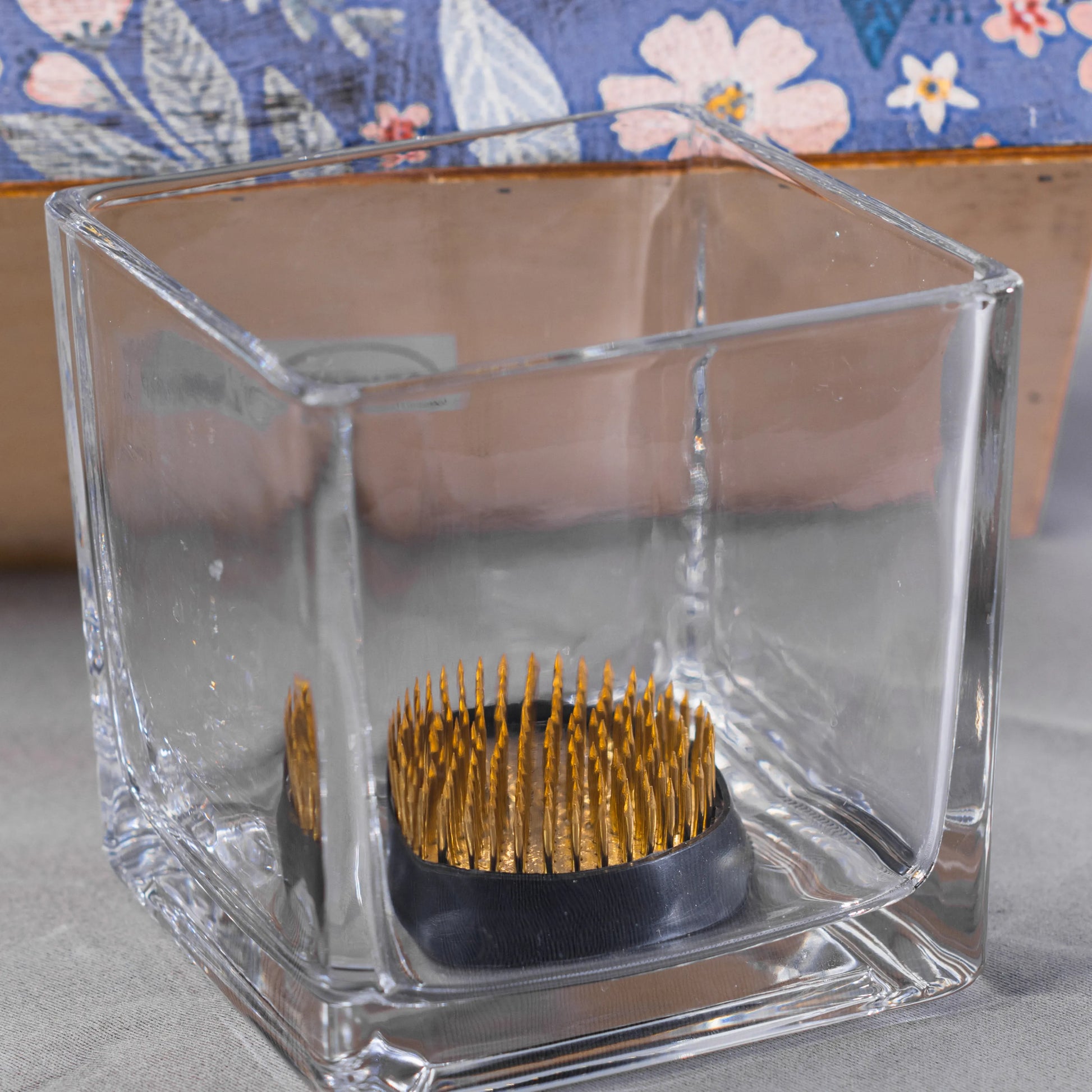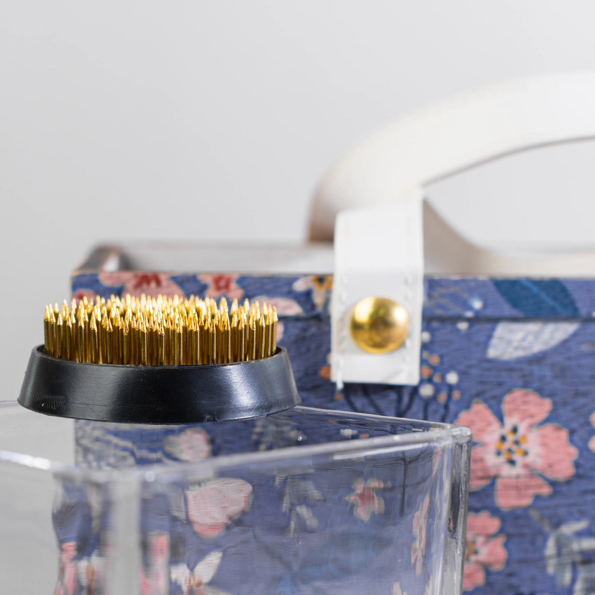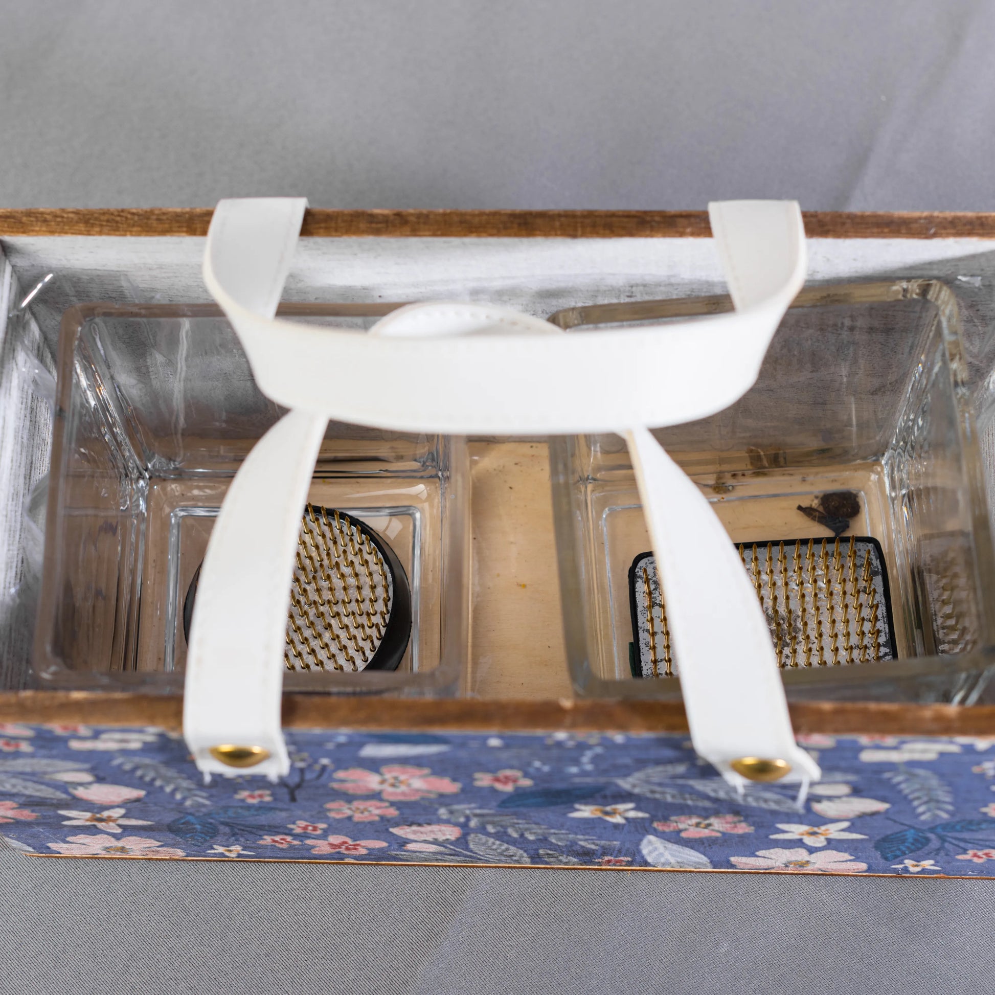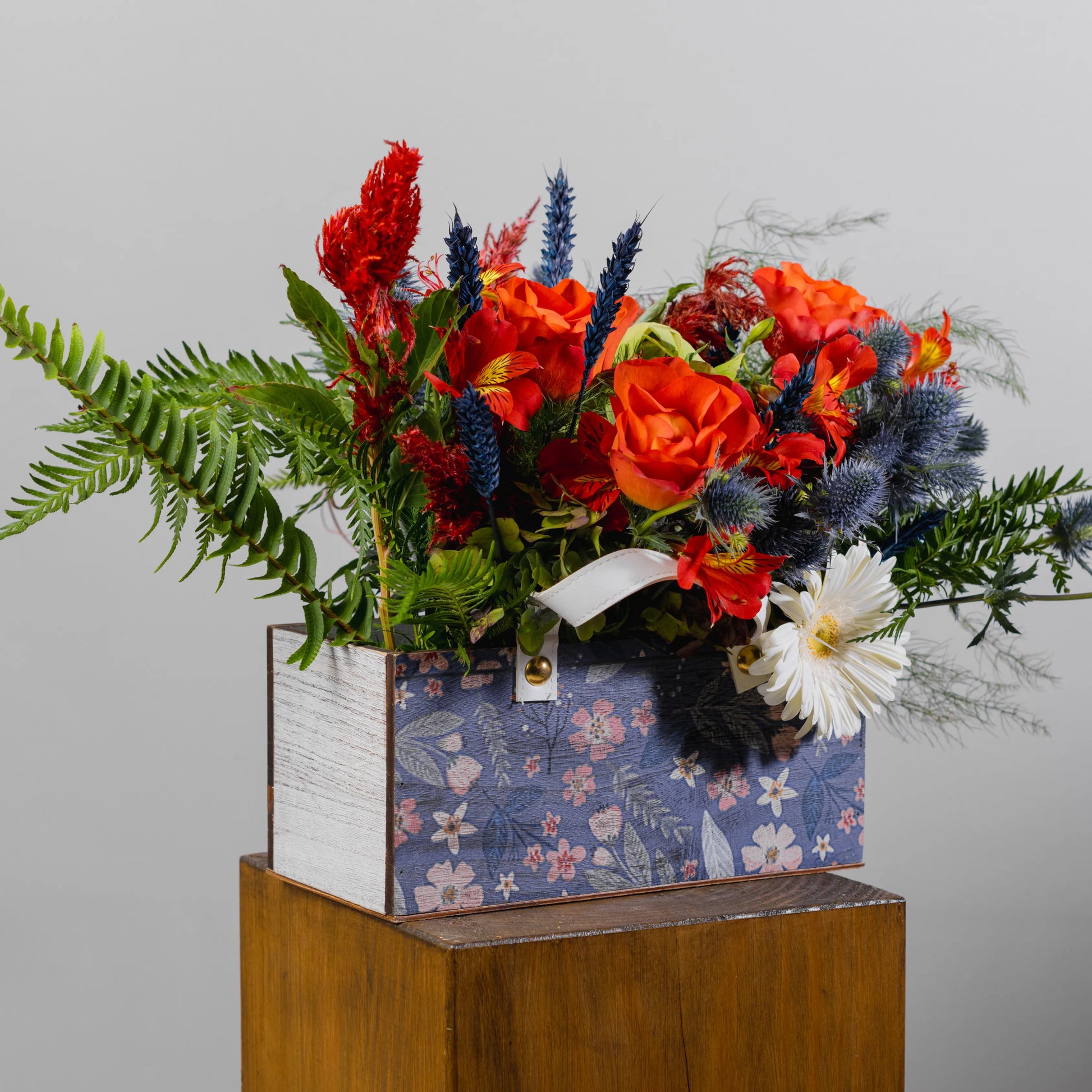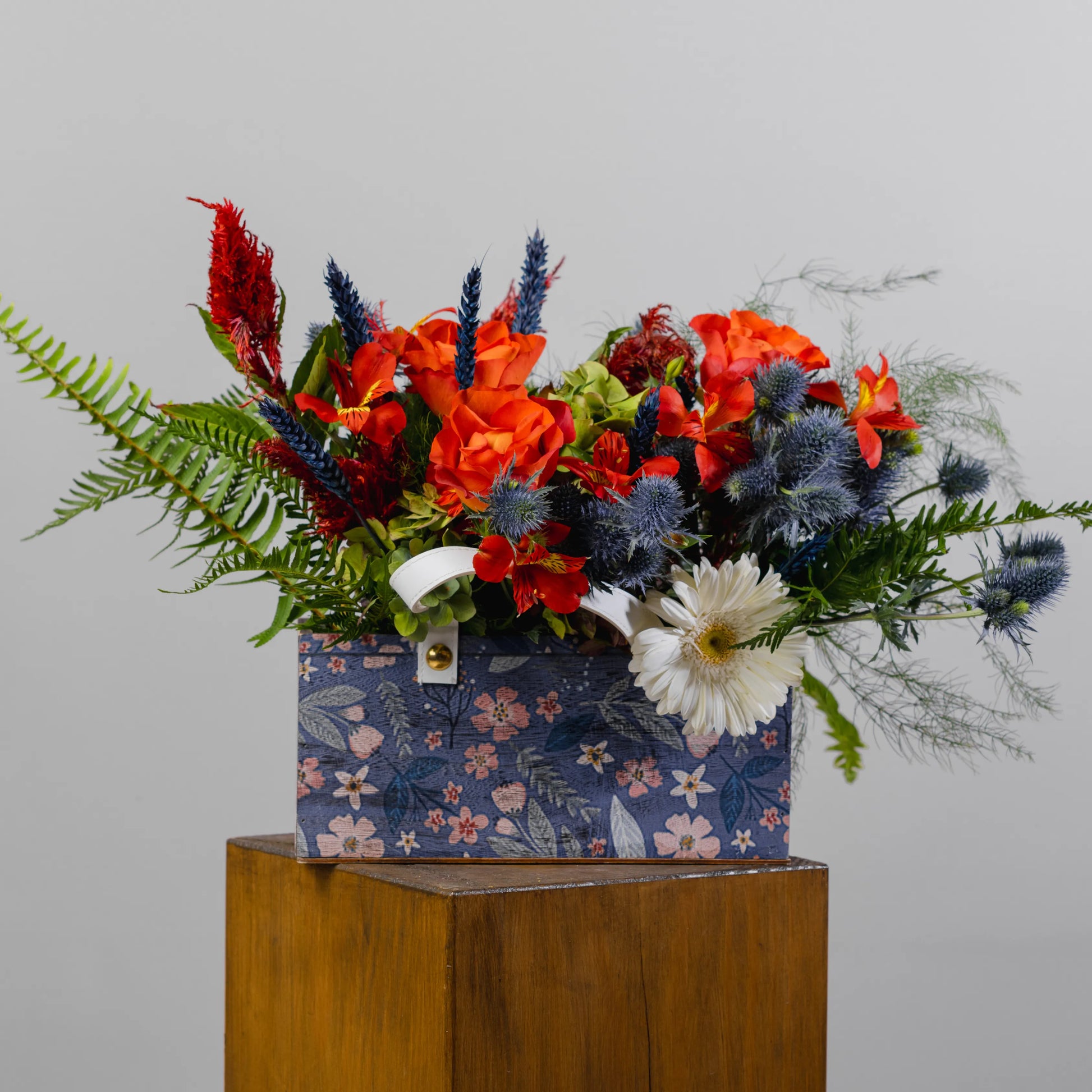 Folhagens de fetos verdes envolvem delicadamente o arranjo, trazendo movimento e lembrando as folhas que ainda se seguram aos galhos antes de se renderem ao chão. Tudo isso é apresentado em uma caixa de madeira azul estilo vintage, adornada com desenhos de flores vermelhas e brancas, como uma pintura envelhecida pelo tempo. As asas brancas da caixa evocam a ideia de leveza, como se todo o arranjo estivesse pronto para voar ao sabor do vento outonal.