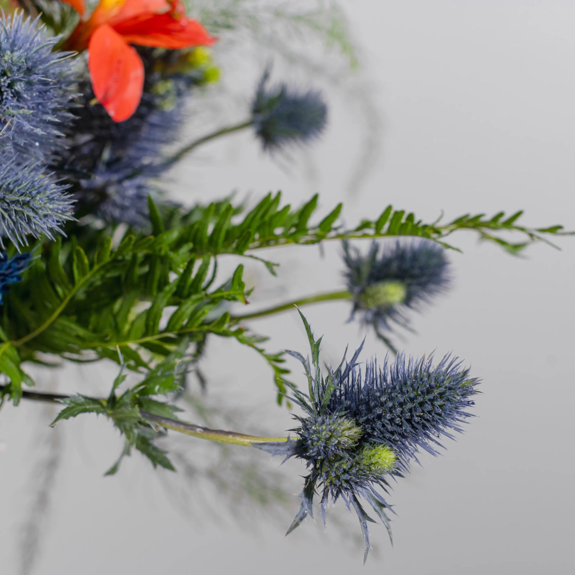 Uma ode ao outono, Chama de Outono é um arranjo que captura o calor e a intensidade da estação em uma composição única. Rosas de um laranja vibrante se destacam ao lado das celosias bordô, que parecem chamas dançantes, enquanto a hortênsia verde traz o frescor das folhas persistentes, pontuada por detalhes bordô que remetem ao toque de melancolia do final da estação. A celosia verde acrescenta textura e naturalidade, acompanhando a gerbera branca, que simboliza a luz suave dos últimos raios de sol da temporada.