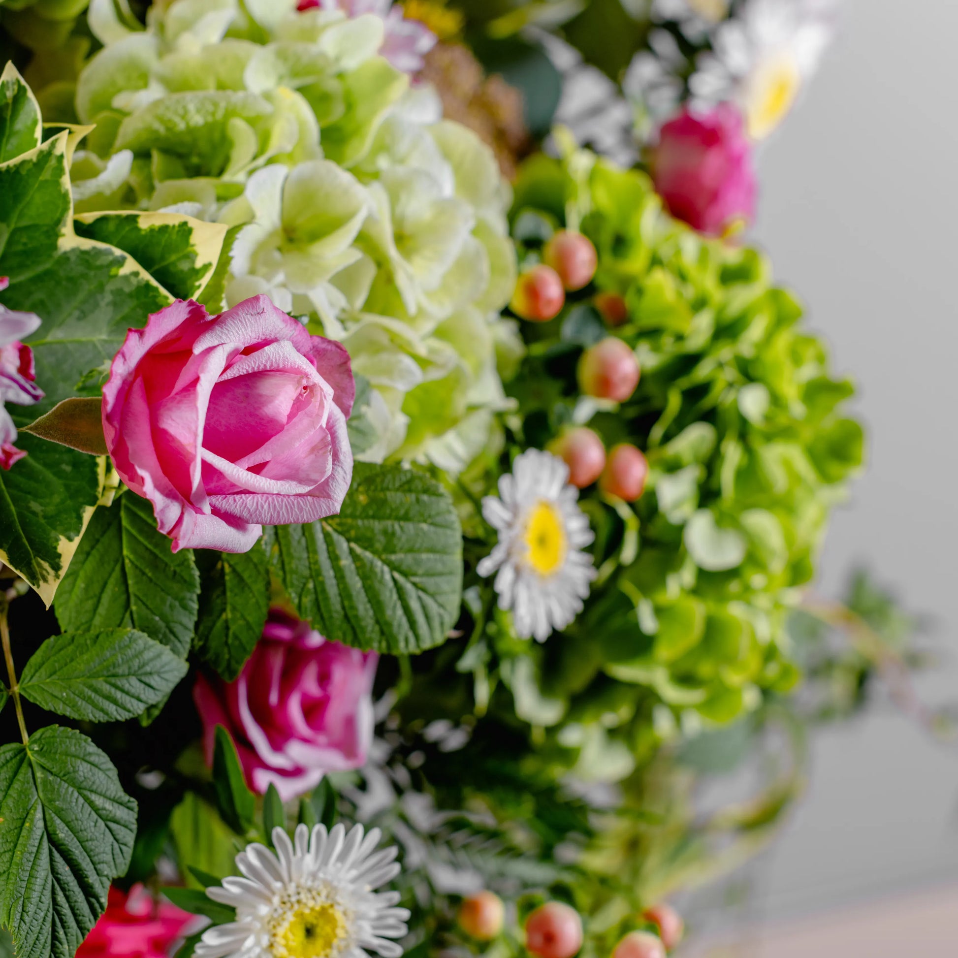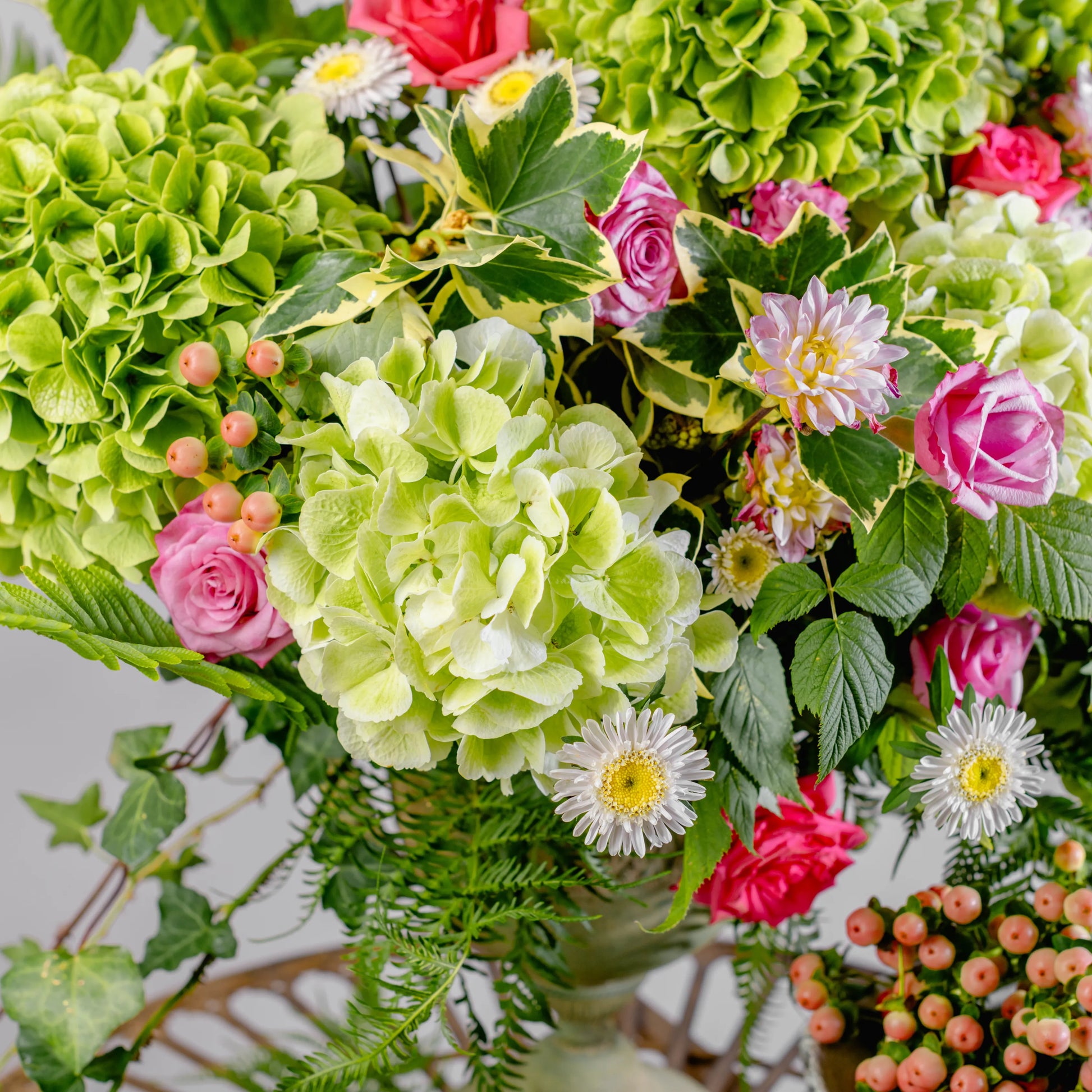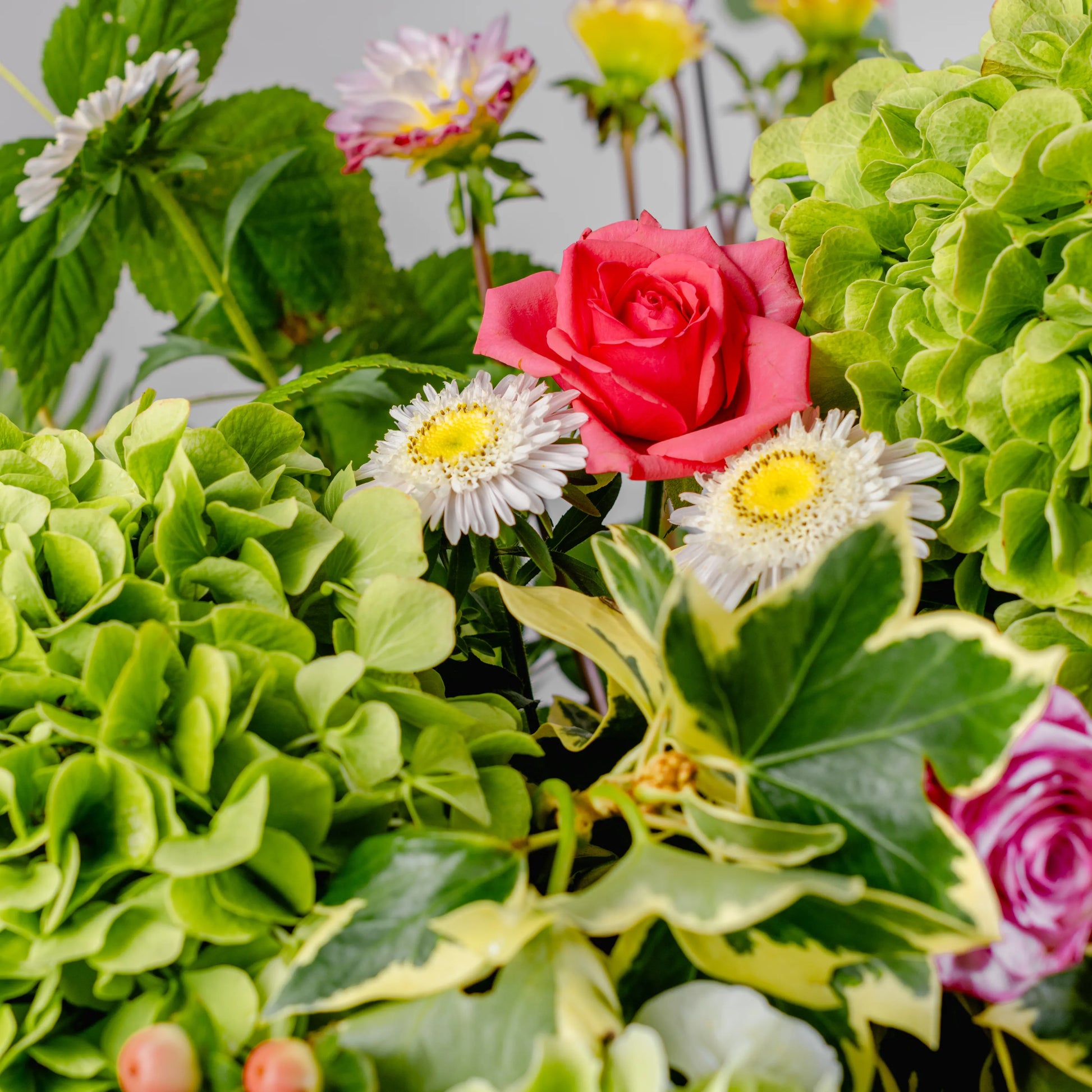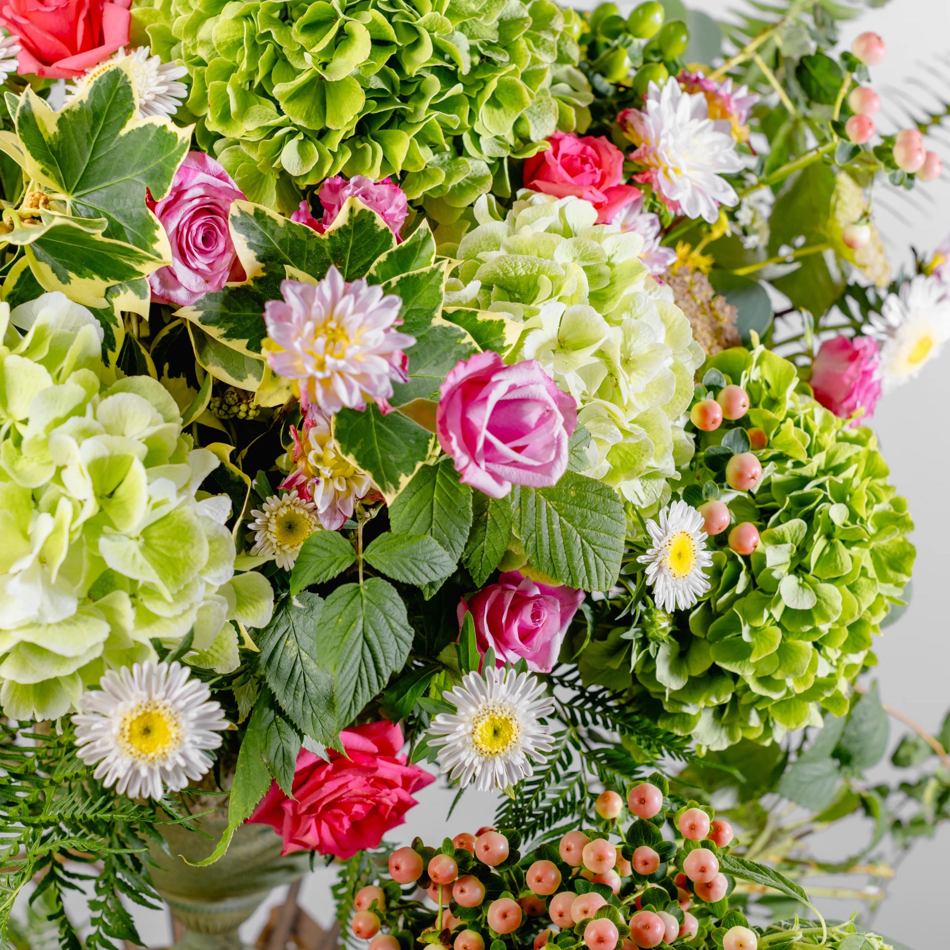 Um arranjo exuberante que evoca a beleza de um jardim repleto de cor e vida. Rosas em tons suaves e vibrantes combinam-se harmoniosamente com as hortênsias, criando uma composição rica e encantadora. As margaridas acrescentam uma leveza alegre, enquanto folhas e ramos diversos trazem uma base verde que equilibra e complementa as flores. "O Jardim Maravilhoso" é uma celebração da natureza em sua plenitude, um convite a perder-se entre pétalas, texturas e fragrâncias, tal como em um jardim dos sonhos onde tudo floresce em harmonia.