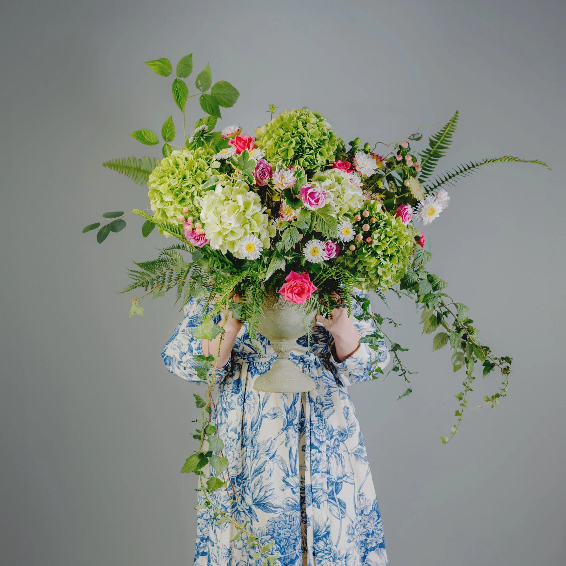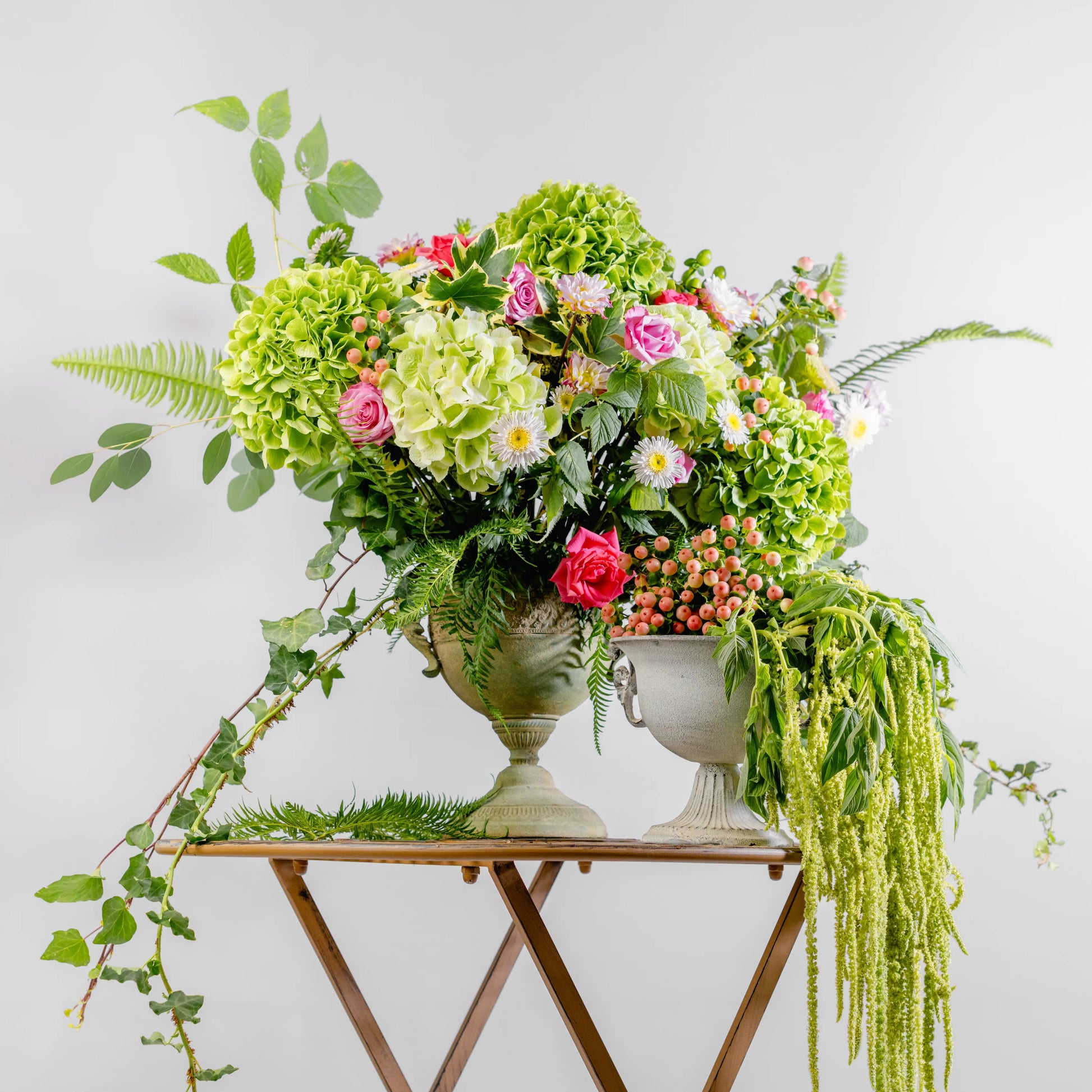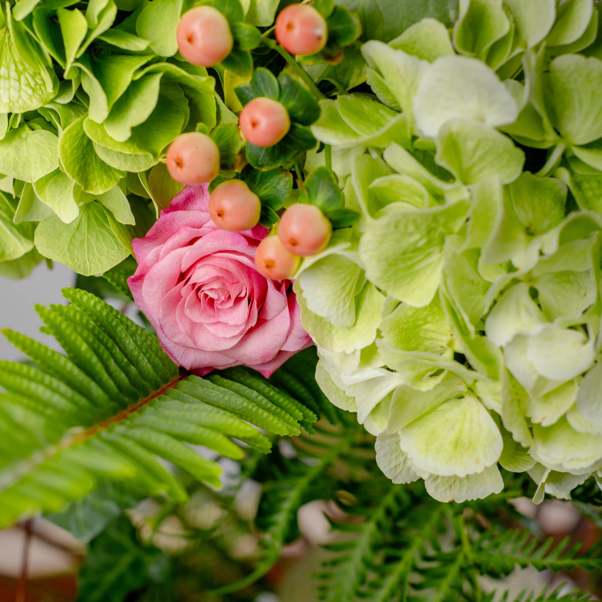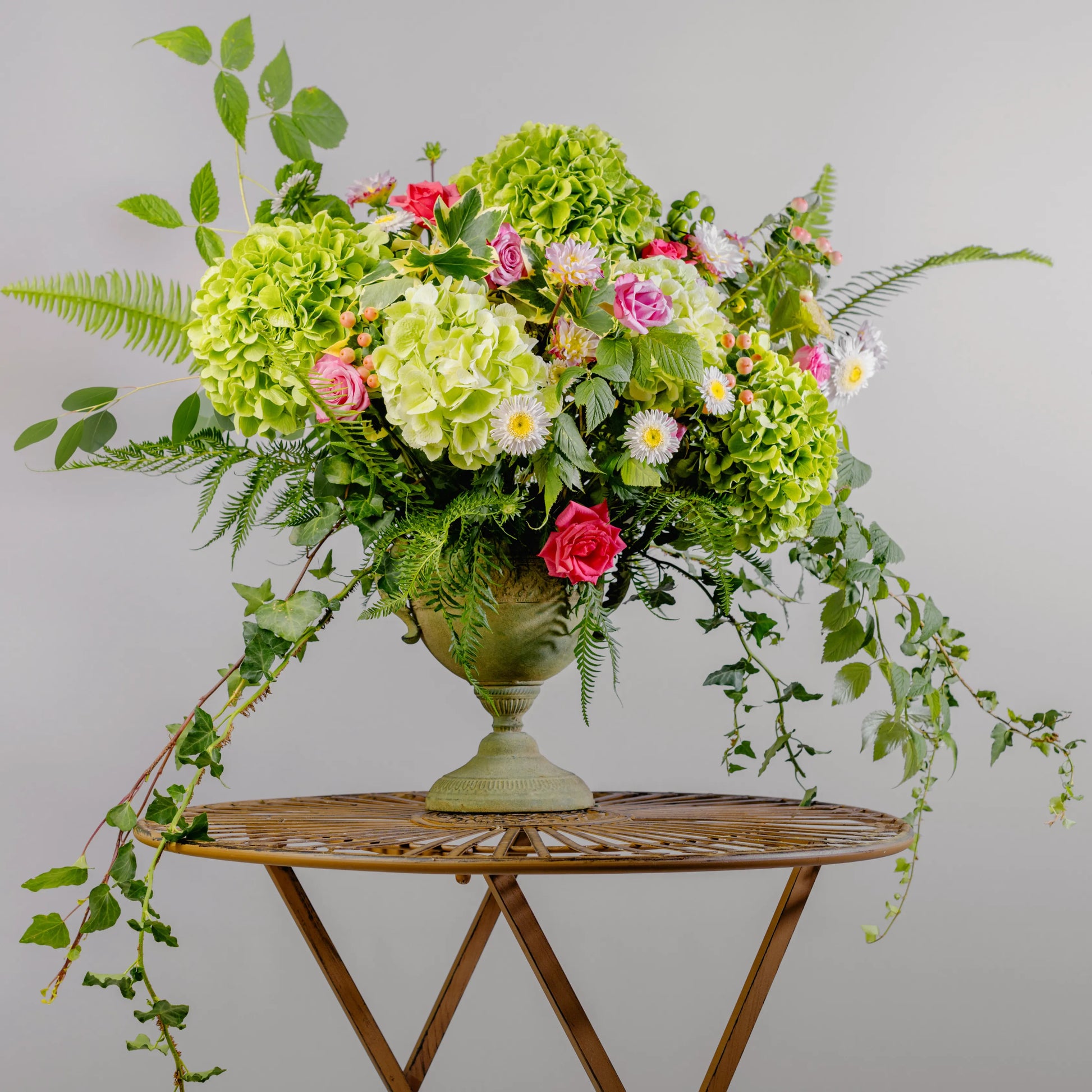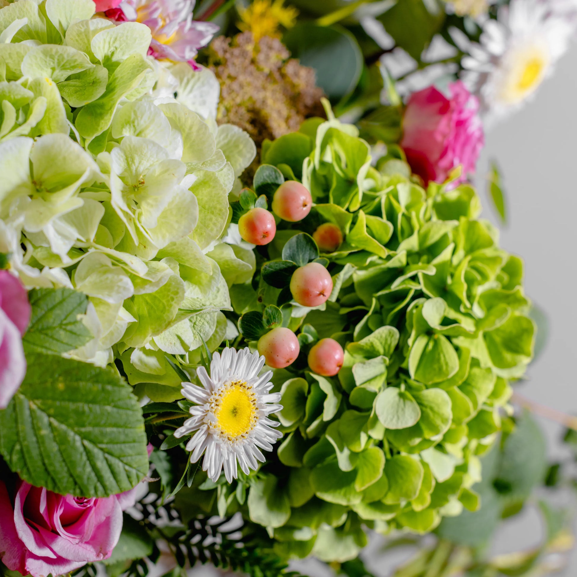 Um arranjo exuberante que evoca a beleza de um jardim repleto de cor e vida. Rosas em tons suaves e vibrantes combinam-se harmoniosamente com as hortênsias, criando uma composição rica e encantadora. As margaridas acrescentam uma leveza alegre, enquanto folhas e ramos diversos trazem uma base verde que equilibra e complementa as flores. "O Jardim Maravilhoso" é uma celebração da natureza em sua plenitude, um convite a perder-se entre pétalas, texturas e fragrâncias, tal como em um jardim dos sonhos onde tudo floresce em harmonia.
