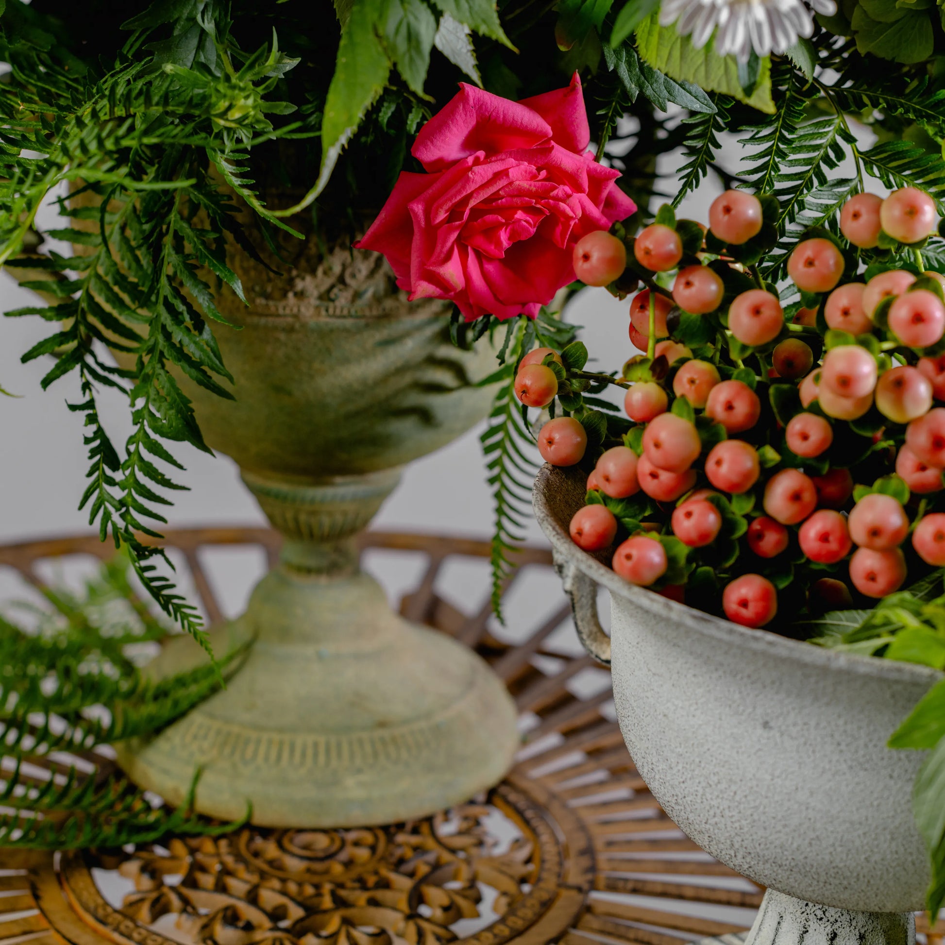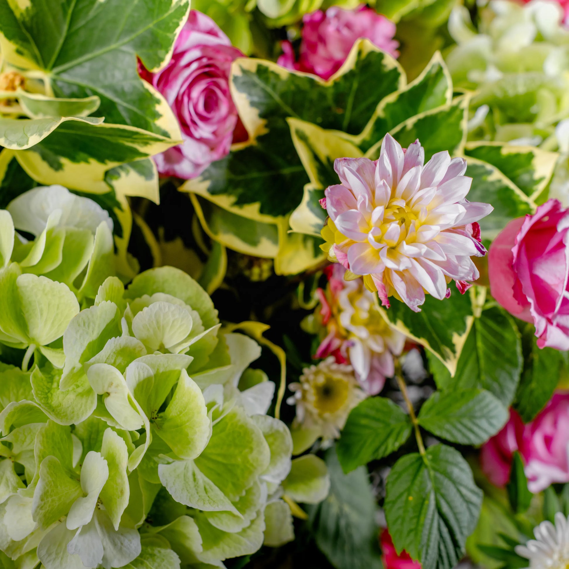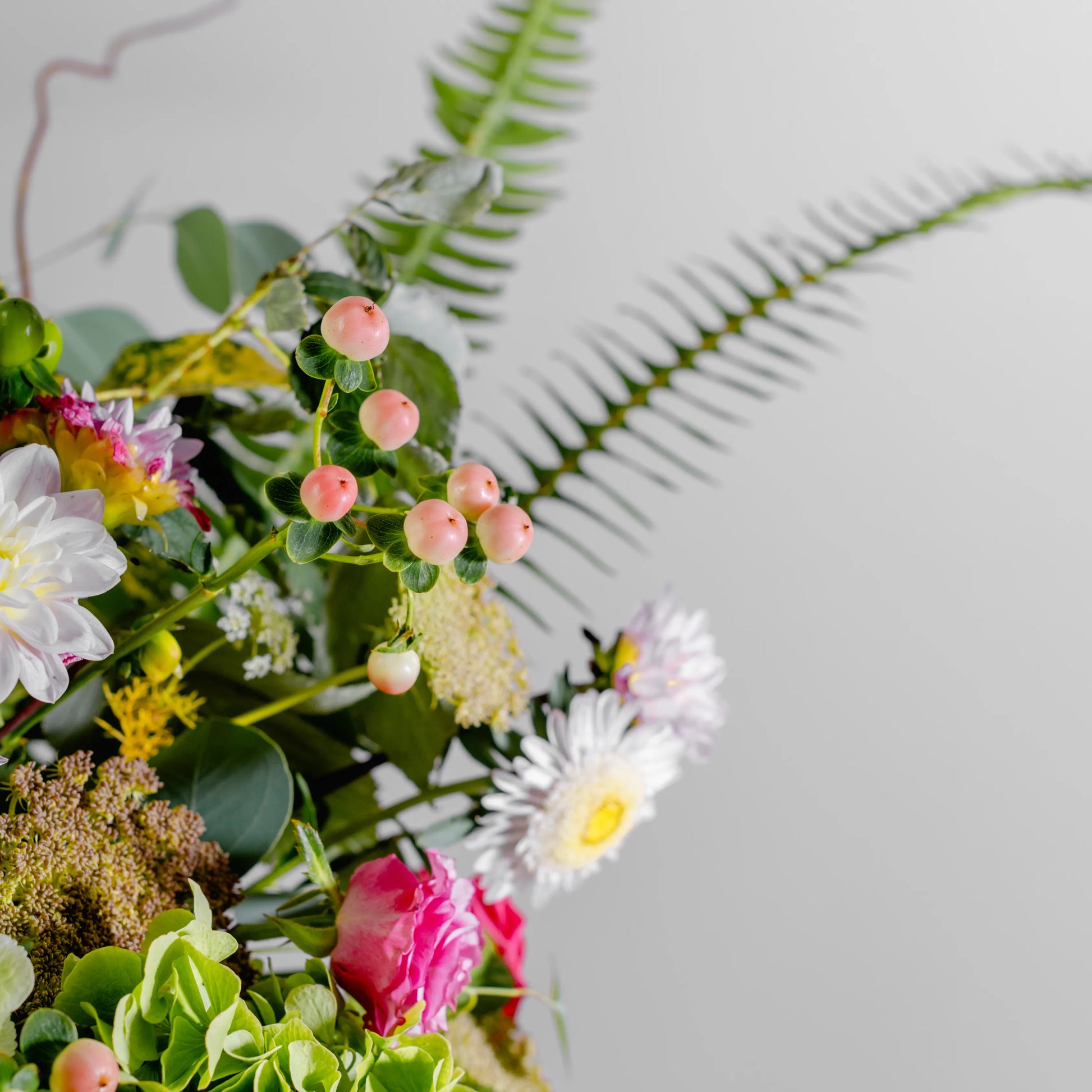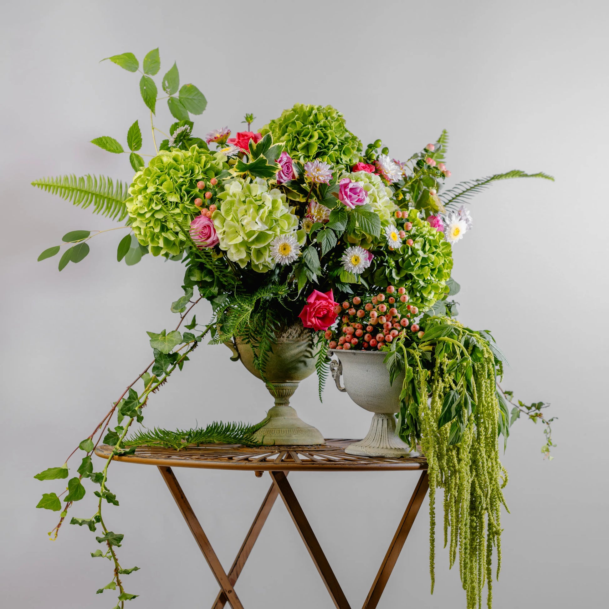 Um arranjo exuberante que evoca a beleza de um jardim repleto de cor e vida. Rosas em tons suaves e vibrantes combinam-se harmoniosamente com as hortênsias, criando uma composição rica e encantadora. As margaridas acrescentam uma leveza alegre, enquanto folhas e ramos diversos trazem uma base verde que equilibra e complementa as flores. "O Jardim Maravilhoso" é uma celebração da natureza em sua plenitude, um convite a perder-se entre pétalas, texturas e fragrâncias, tal como em um jardim dos sonhos onde tudo floresce em harmonia.