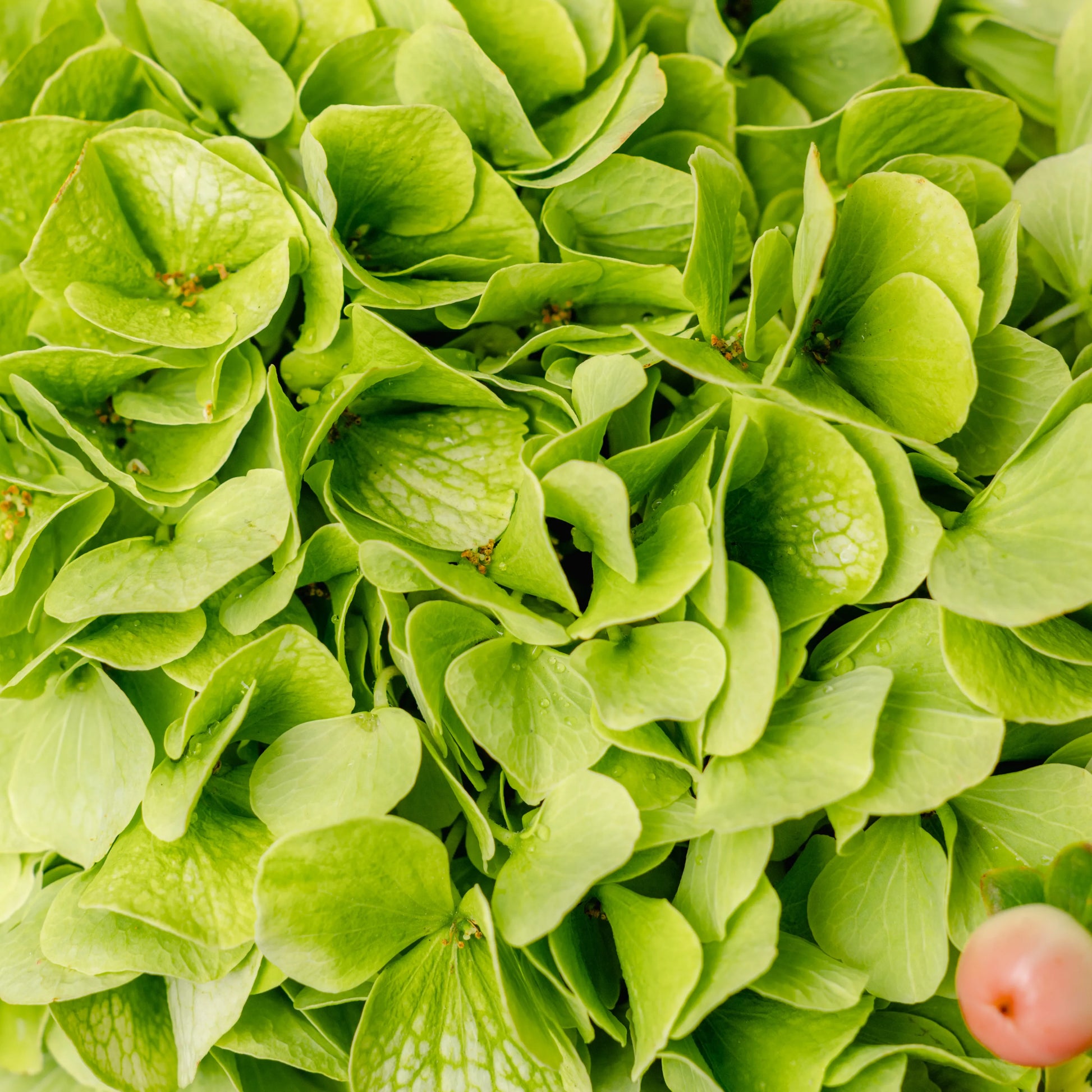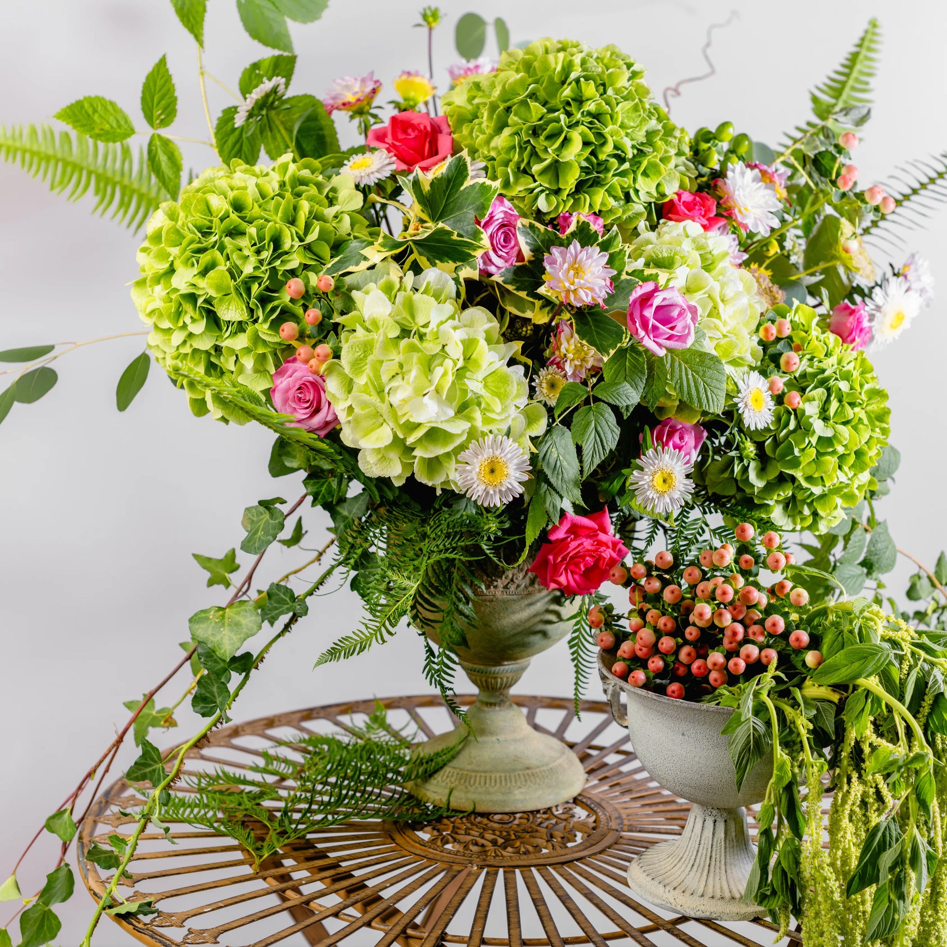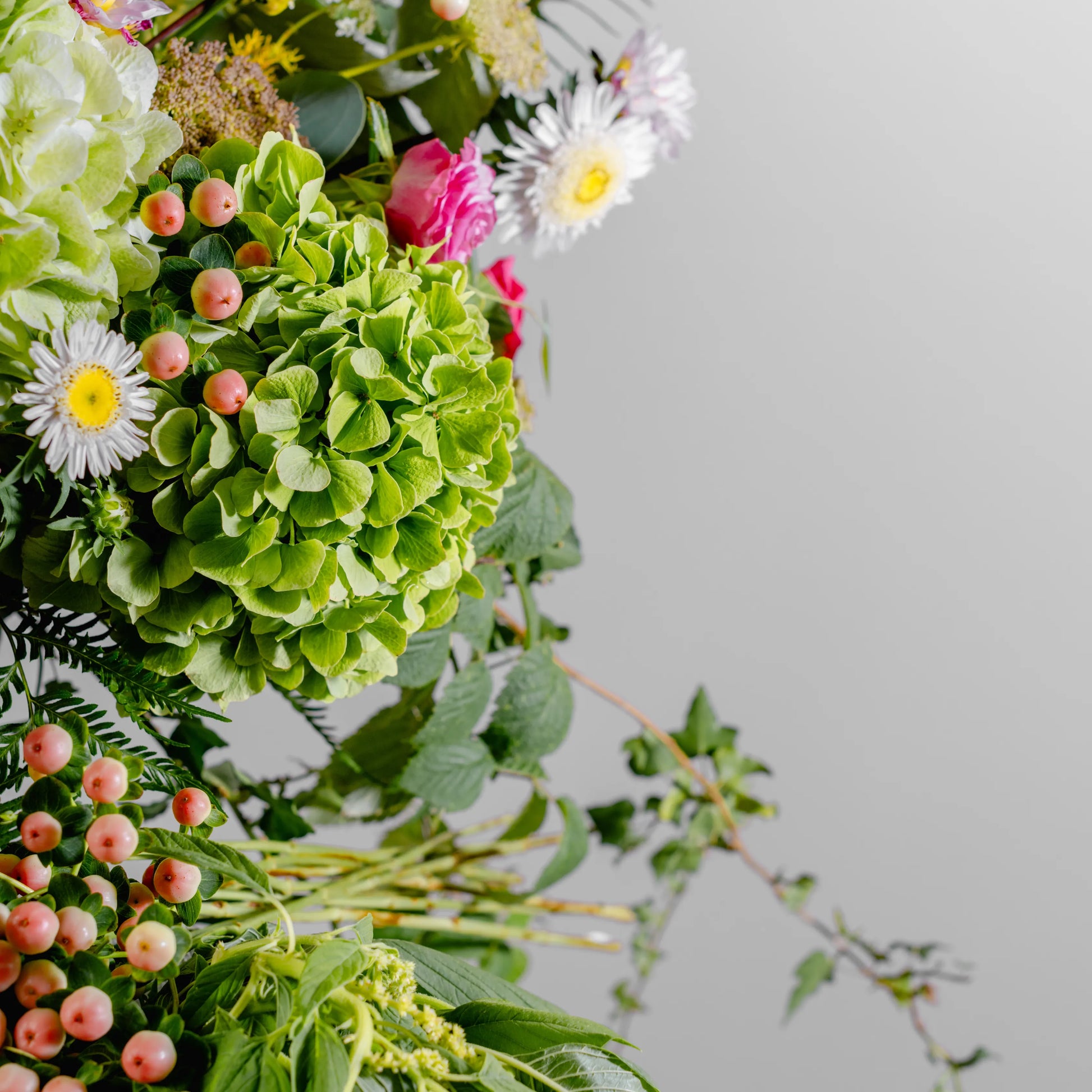 Heras caidas, rosas de cores e tamanhos diferentes, hortensias verdes, margaridas verdes, hipericum, ramos com folhas verdes
