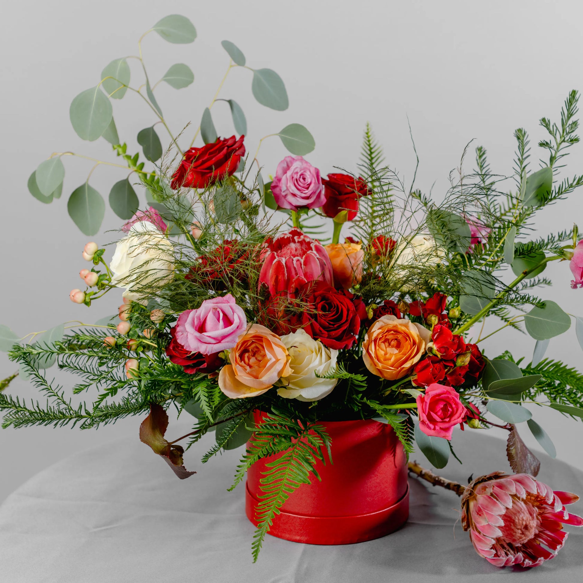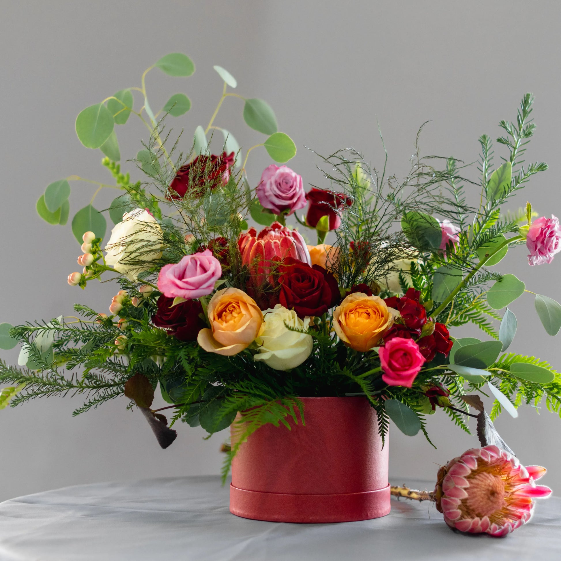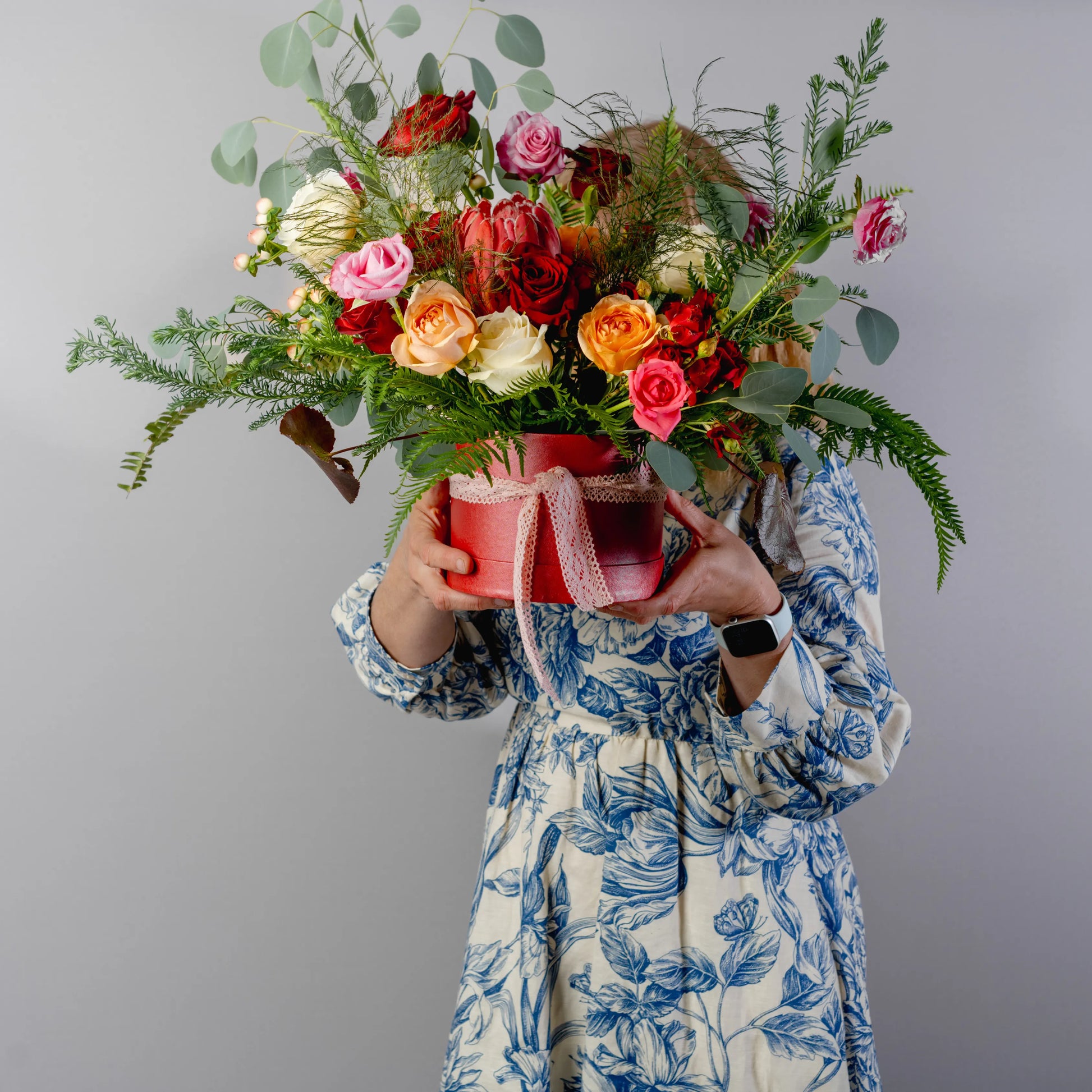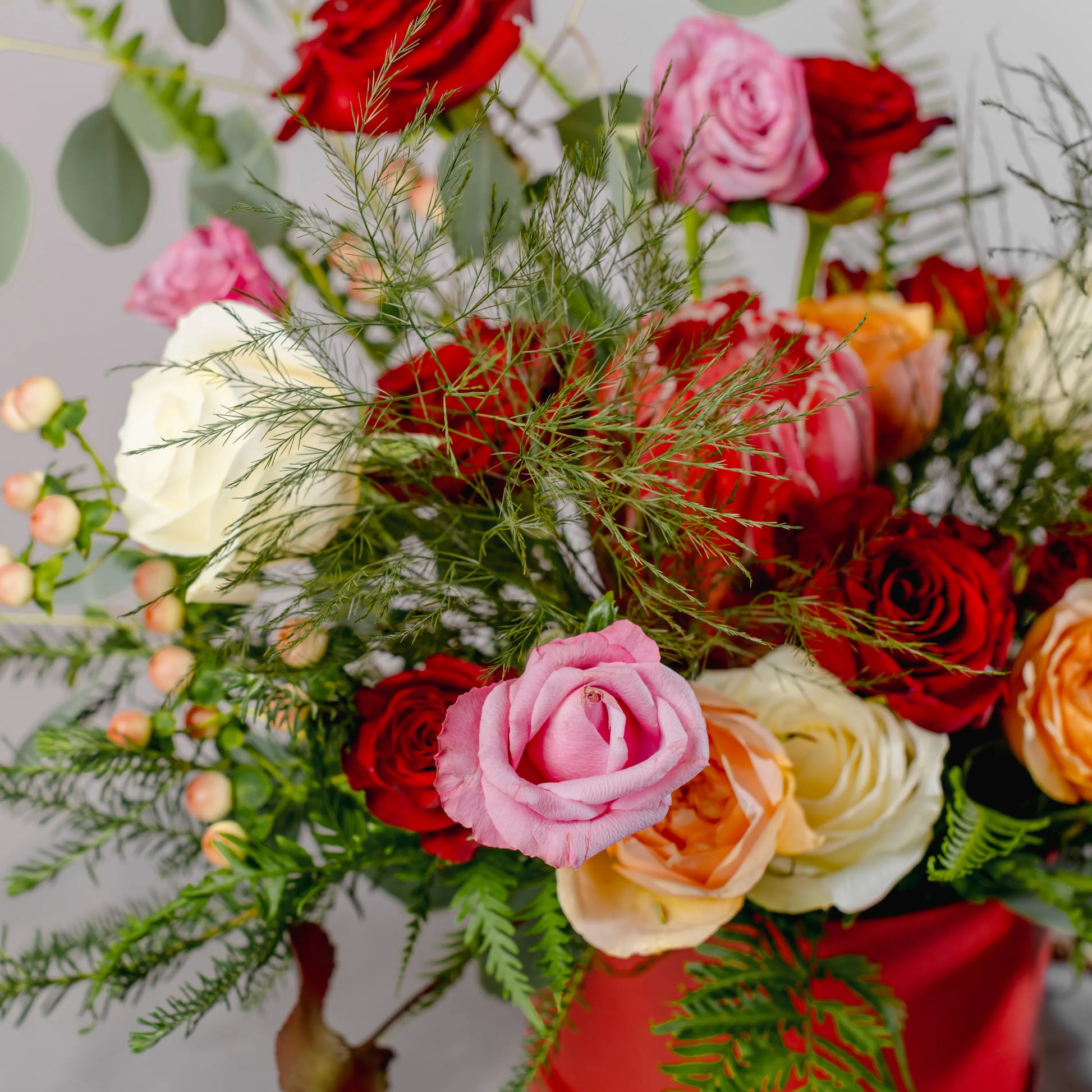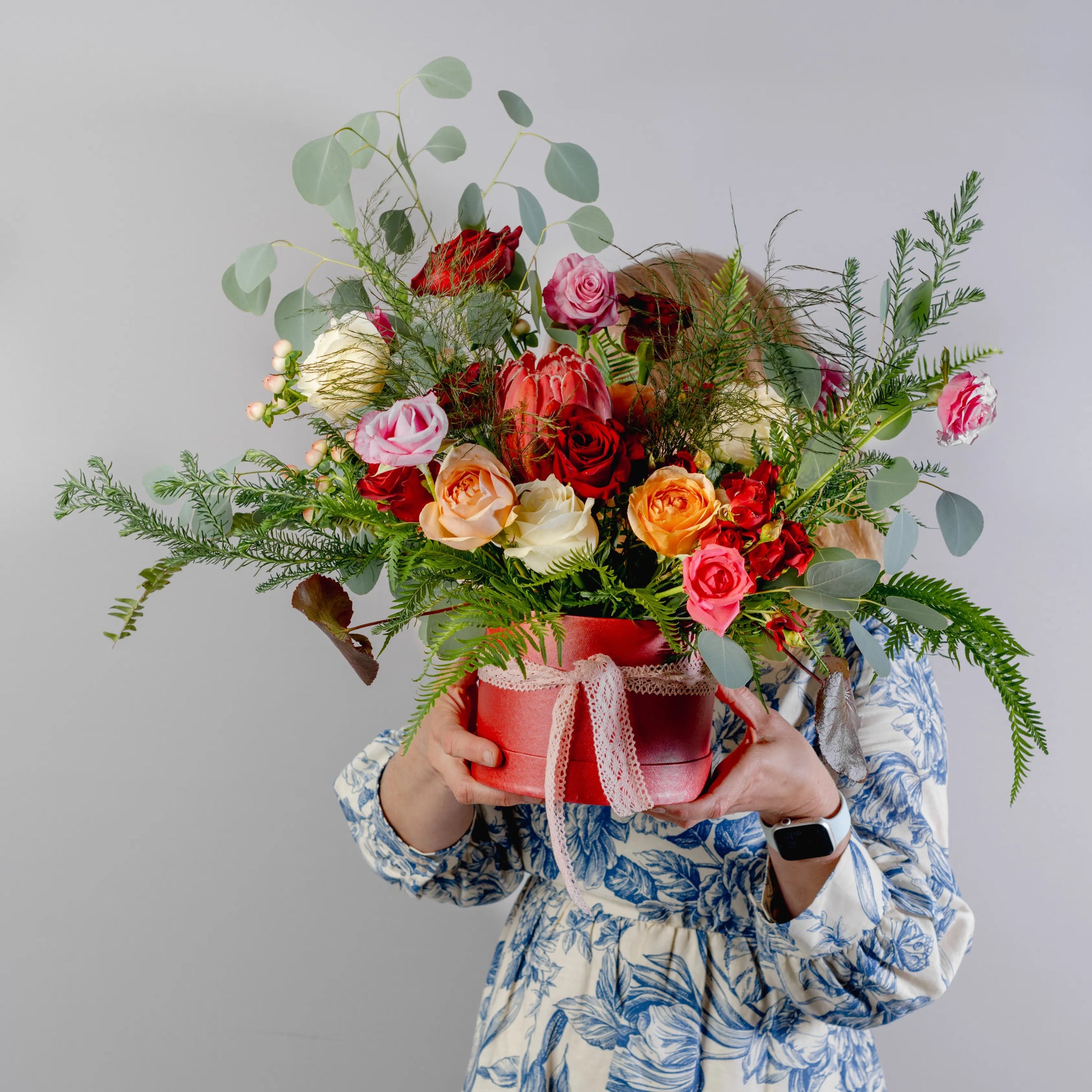 Uma coleção vibrante de rosas coloridas de várias tonalidades e tamanhos, delicadamente dispostas entre ramos de eucalipto, folhas de feto e espargos verdes, cria uma paisagem que lembra um jardim encantado. Esta arranjo é apresentado numa caixa que imita uma caixa para chapéu, disponível na elegante cor bordô ou em outras cores à escolha. A caixa não só guarda flores, mas também o encanto de um jardim secreto, onde cada rosa parece sussurrar histórias de beleza e serenidade, um verdadeiro convite a um momento de paz e contemplação.