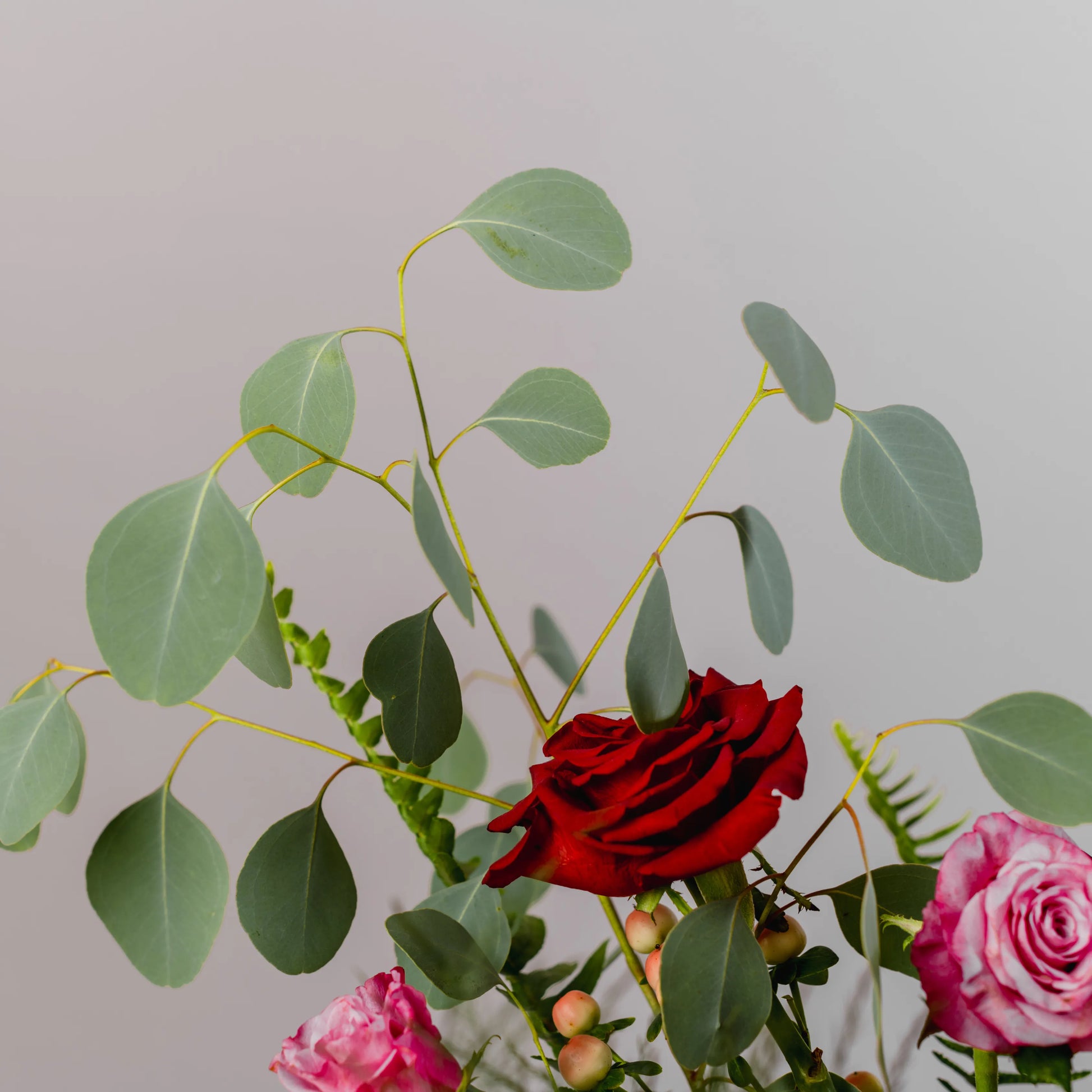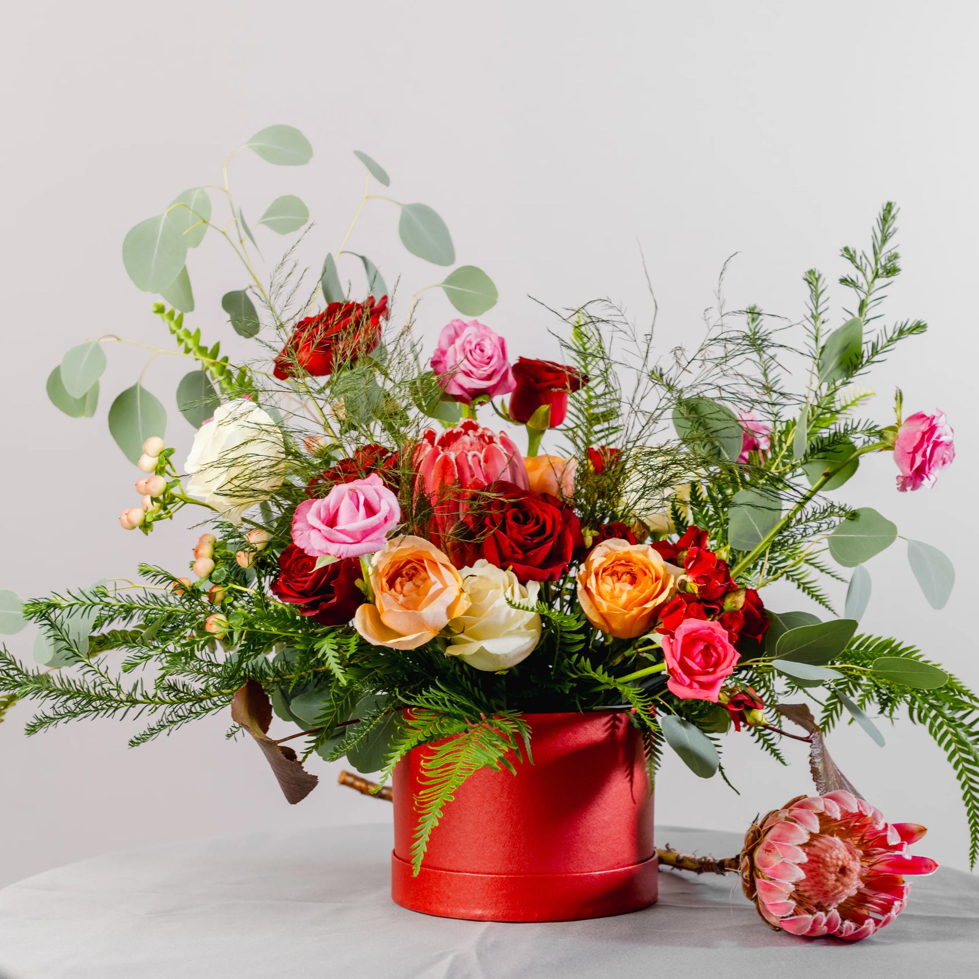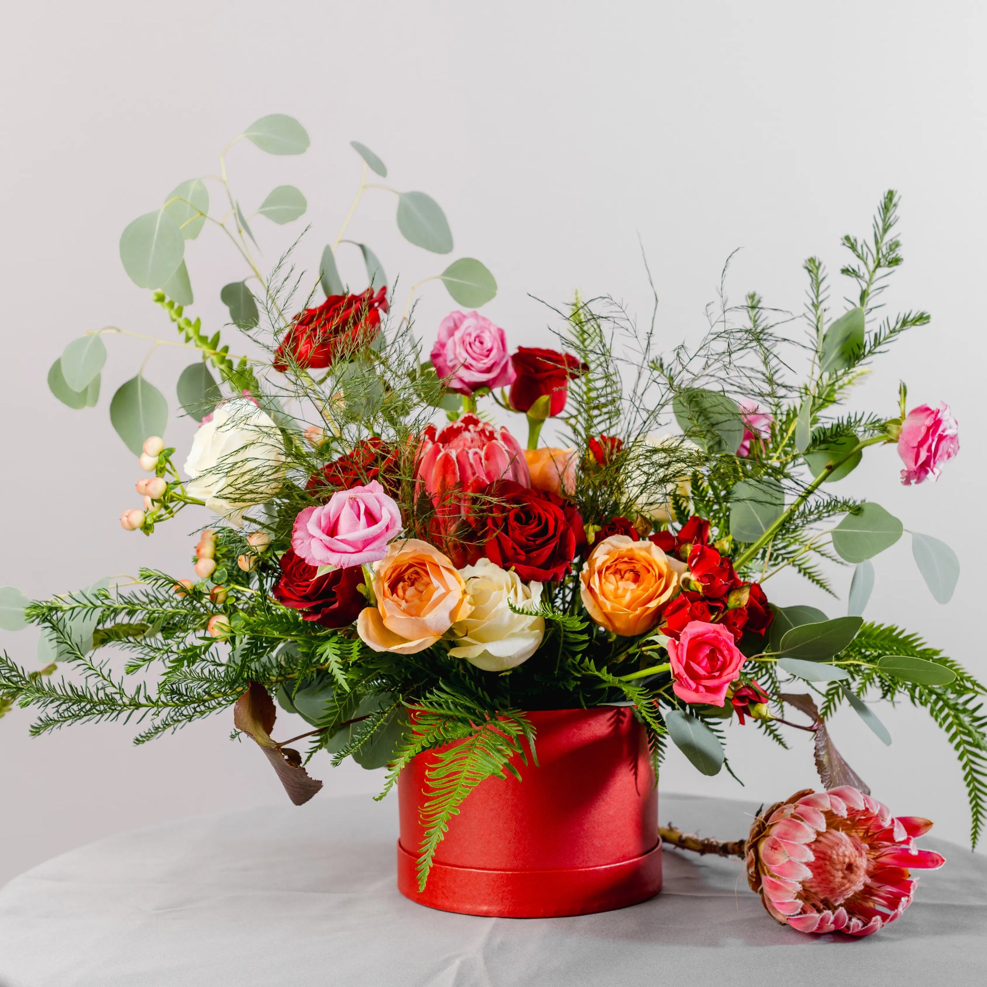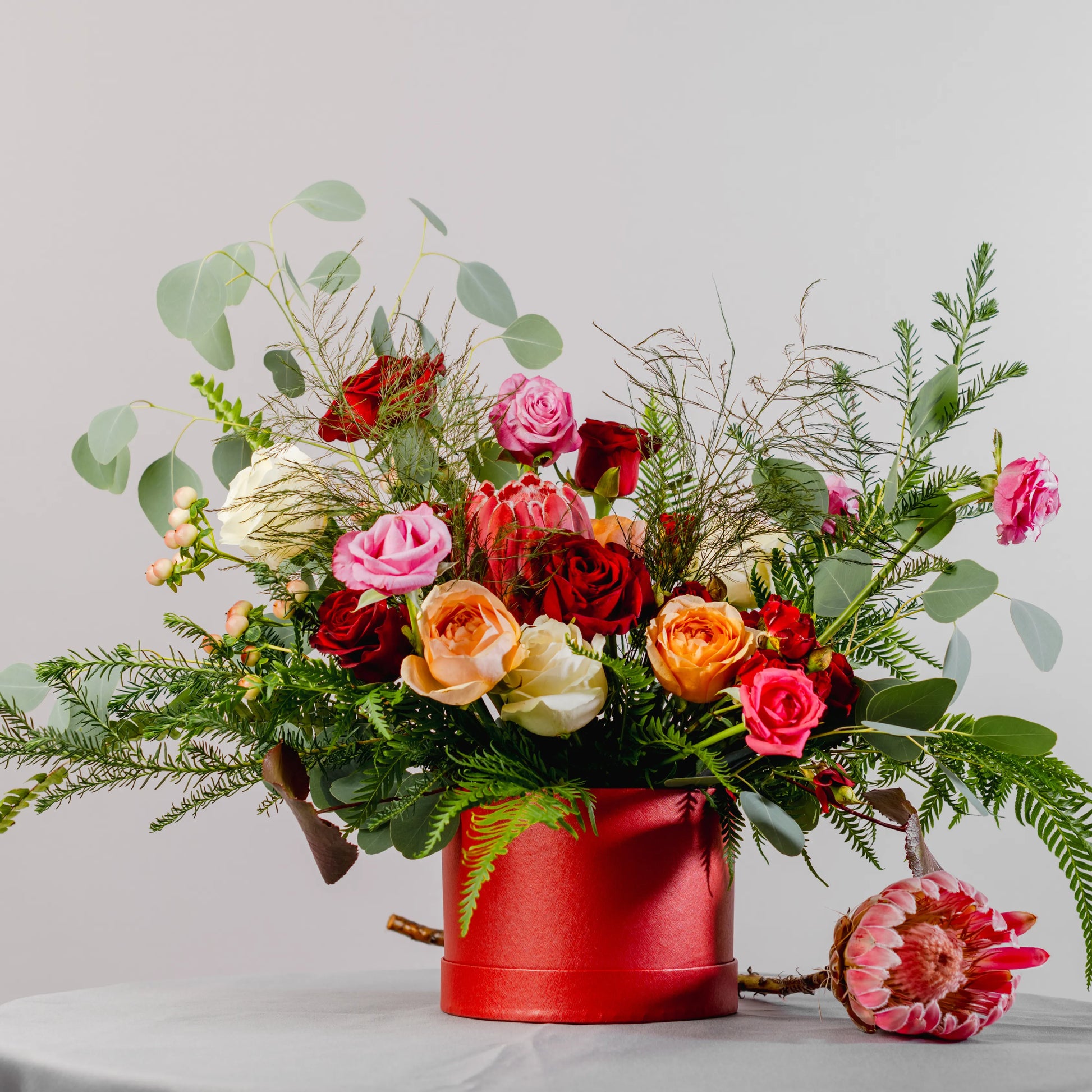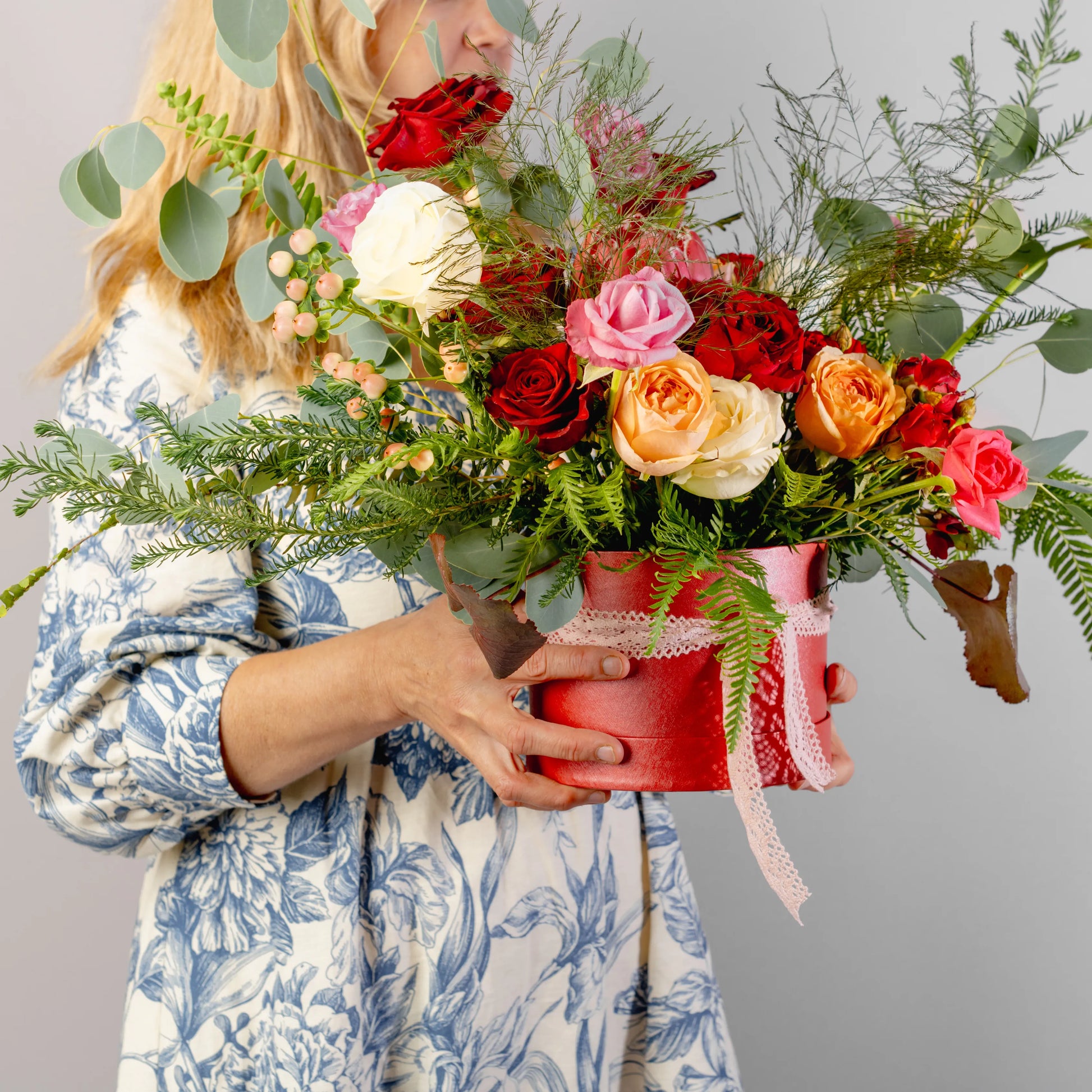 Uma coleção vibrante de rosas coloridas de várias tonalidades e tamanhos, delicadamente dispostas entre ramos de eucalipto, folhas de feto e espargos verdes, cria uma paisagem que lembra um jardim encantado. Esta arranjo é apresentado numa caixa que imita uma caixa para chapéu, disponível na elegante cor bordô ou em outras cores à escolha. A caixa não só guarda flores, mas também o encanto de um jardim secreto, onde cada rosa parece sussurrar histórias de beleza e serenidade, um verdadeiro convite a um momento de paz e contemplação.