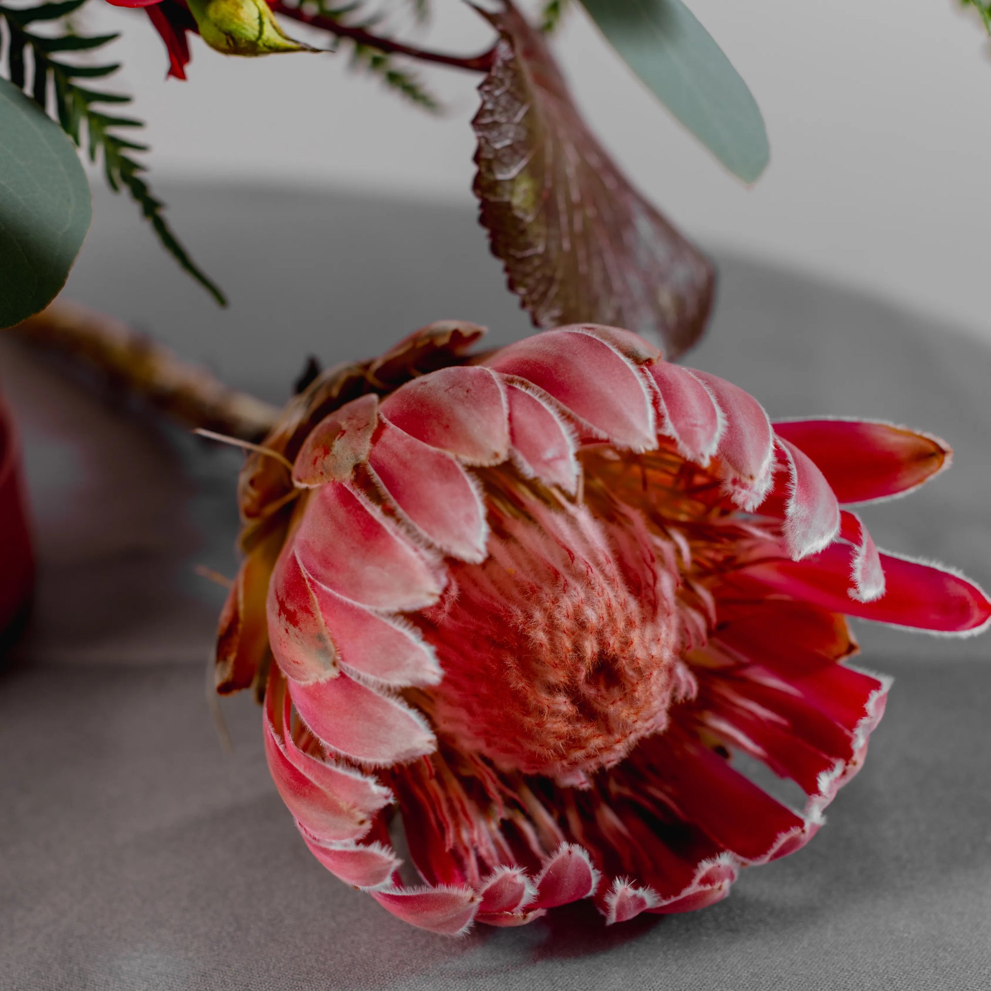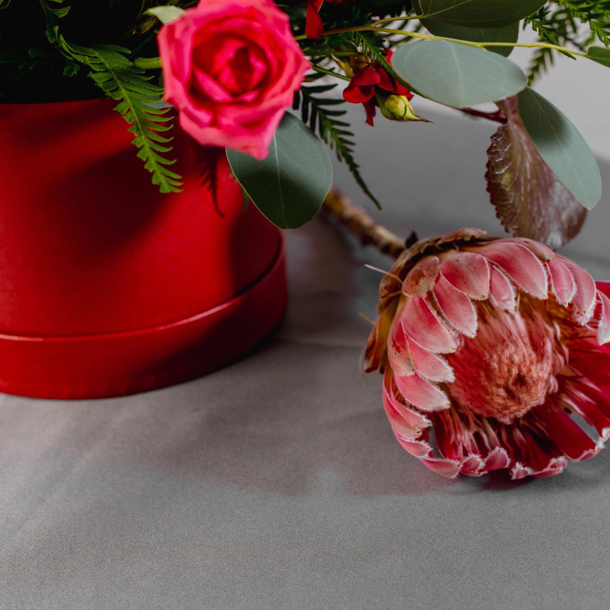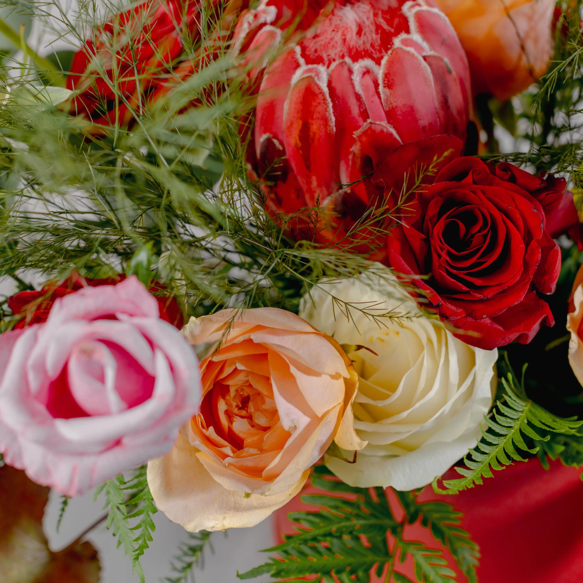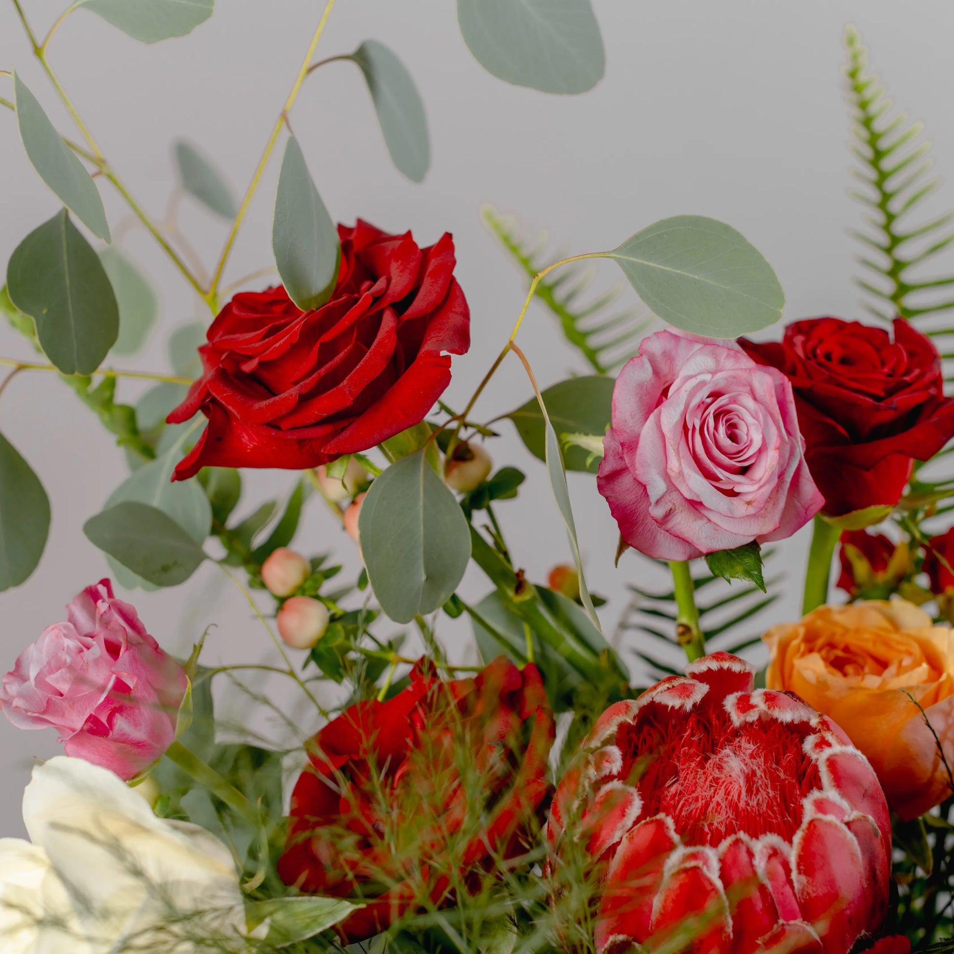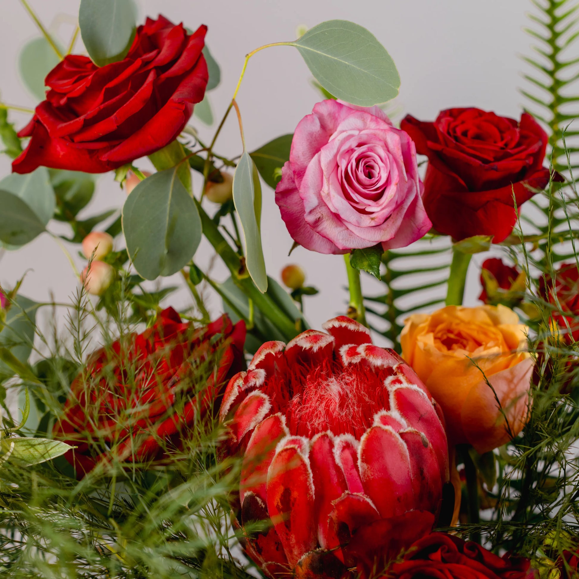 Protea, rosa vermelha, rosa spray vermelha, rosa branca, rosa cor de rosa, rosa de jardim de cor salmão, eucalipto, fetos, espargos