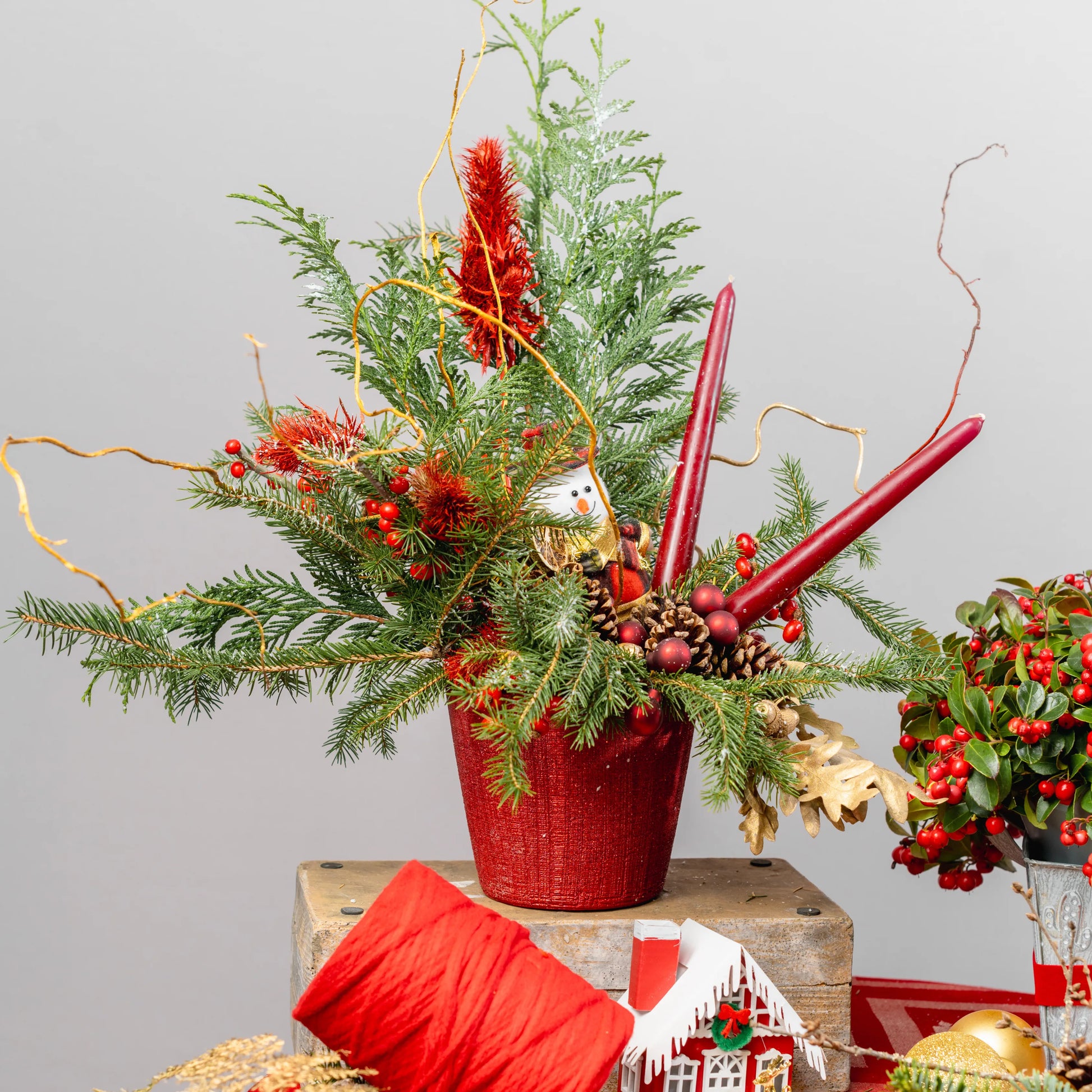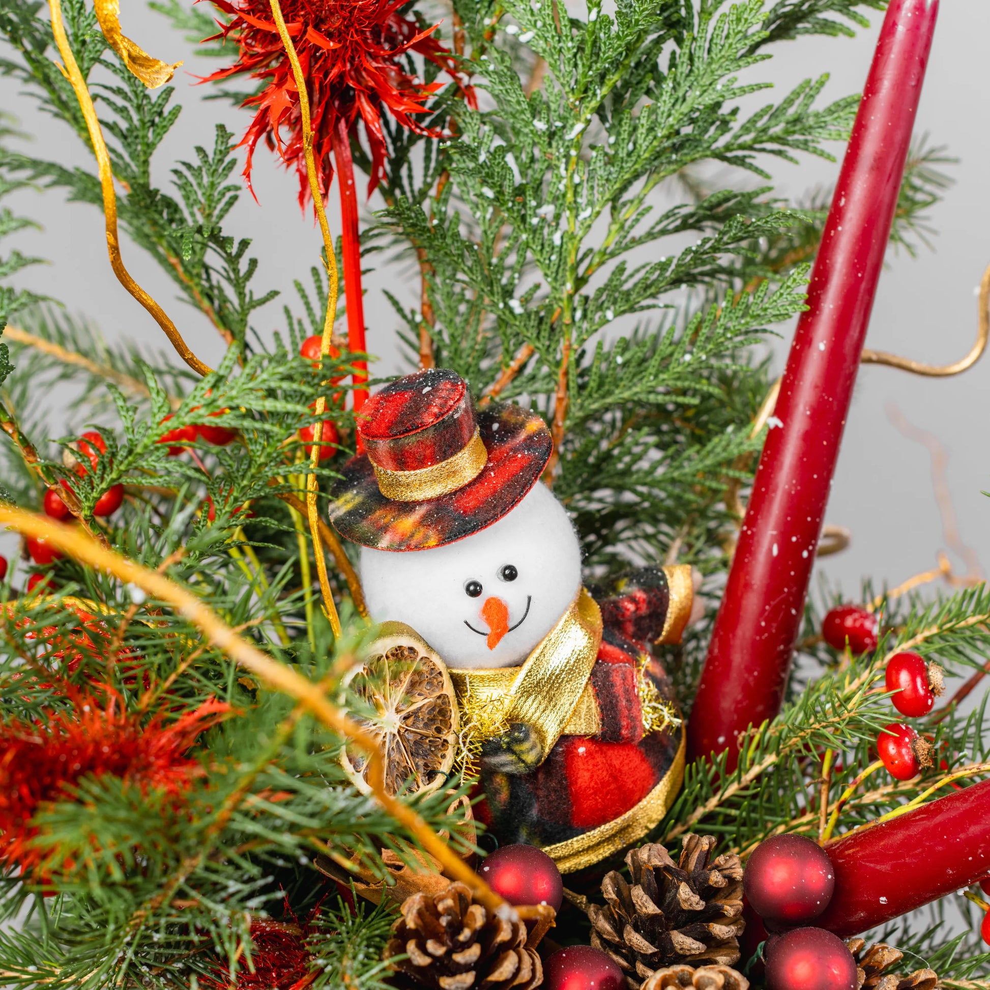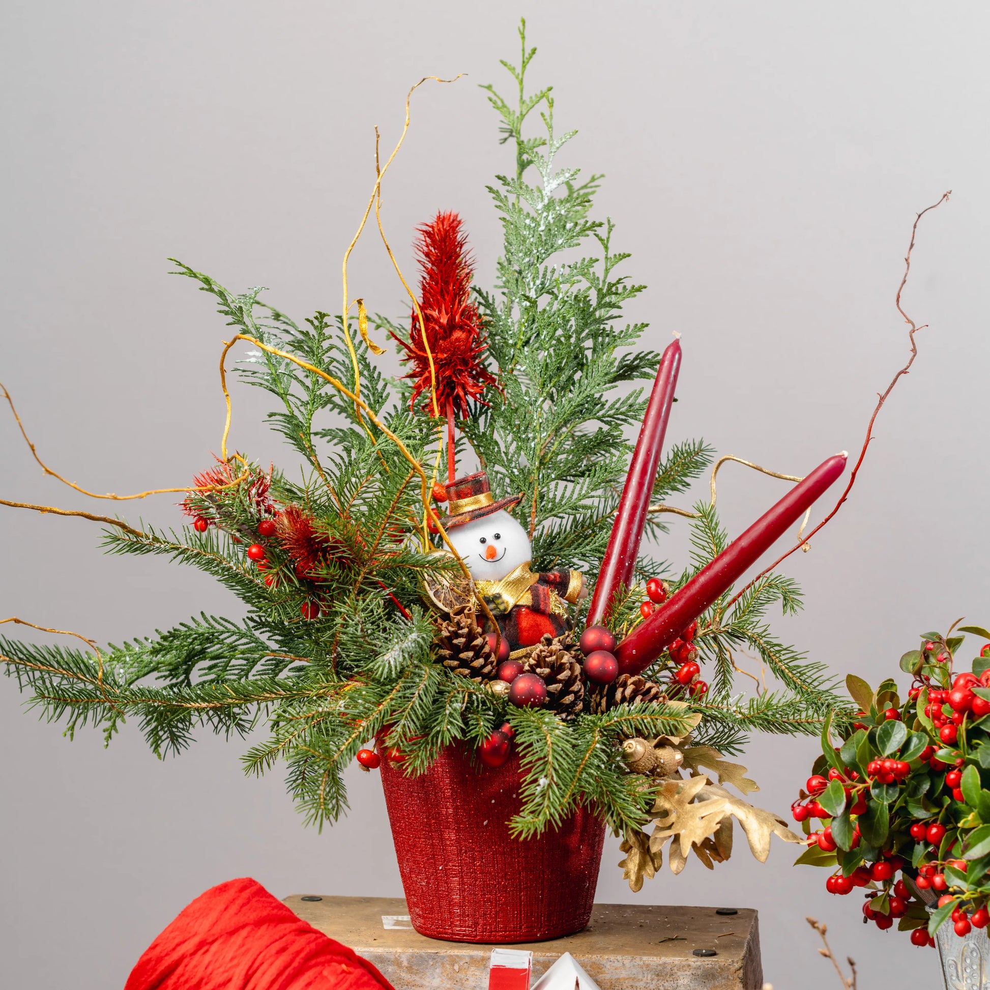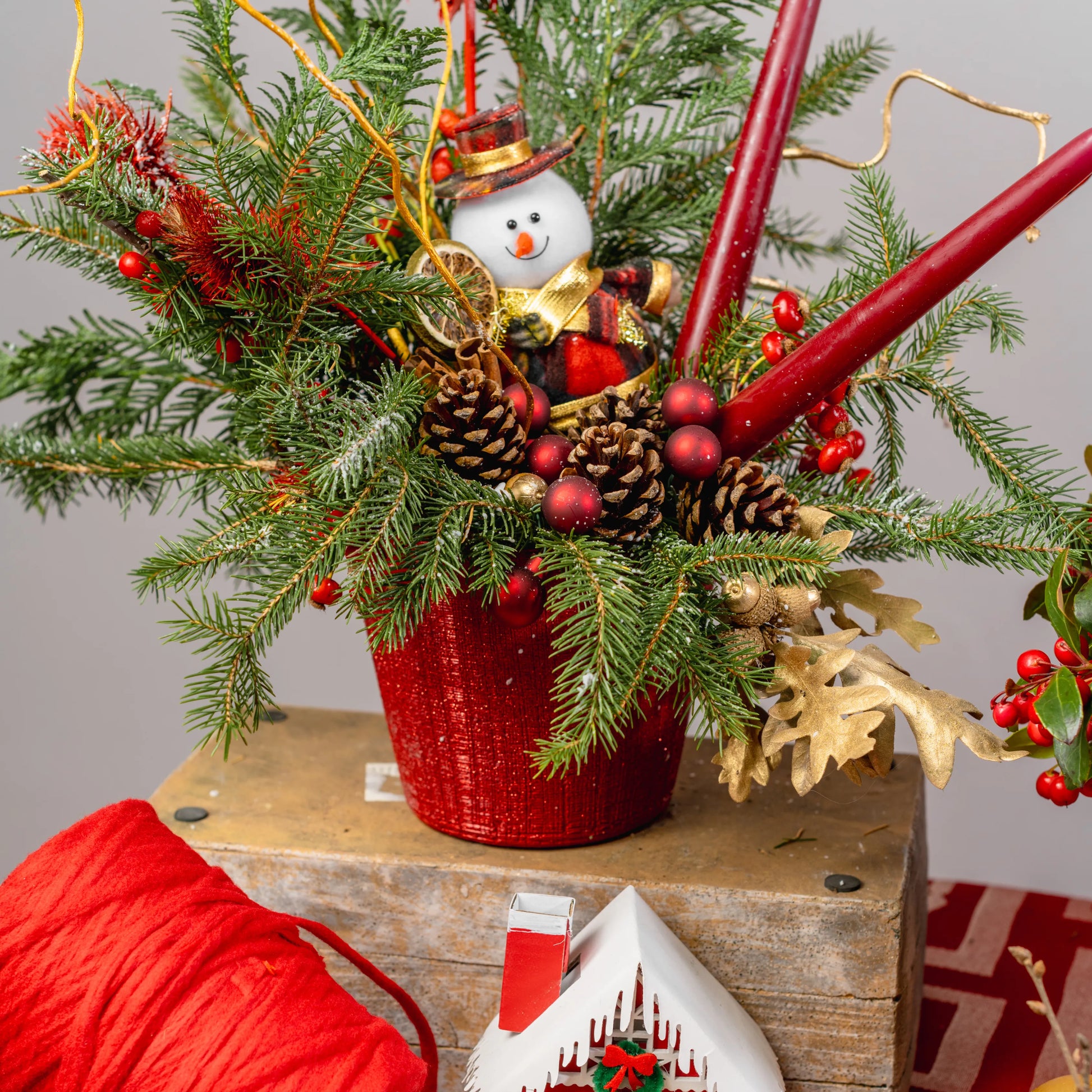 Este arranjo é uma celebração da magia do inverno e do espírito natalino. Em um elegante vaso de cerâmica vermelho, raminhos de Nobilis e folhas douradas de carvalho criam uma base rica e festiva. Espiguetas vermelhas e douradas adicionam um toque de brilho, enquanto pinhas naturais evocam o charme da natureza. No coração do arranjo, um adorável boneco de neve traz um sorriso caloroso, acompanhado por duas velas vermelhas que simbolizam luz e esperança para esta época especial. Perfeito para criar um ambiente acolhedor e encantador no Natal.