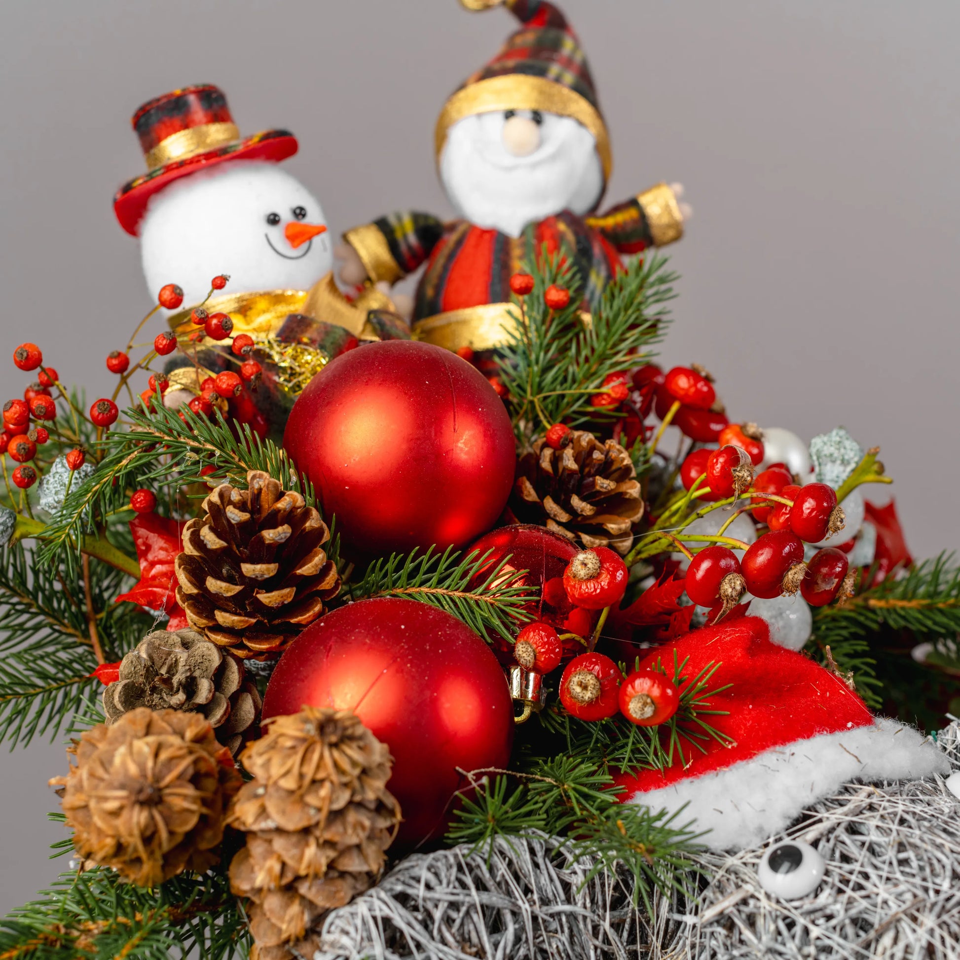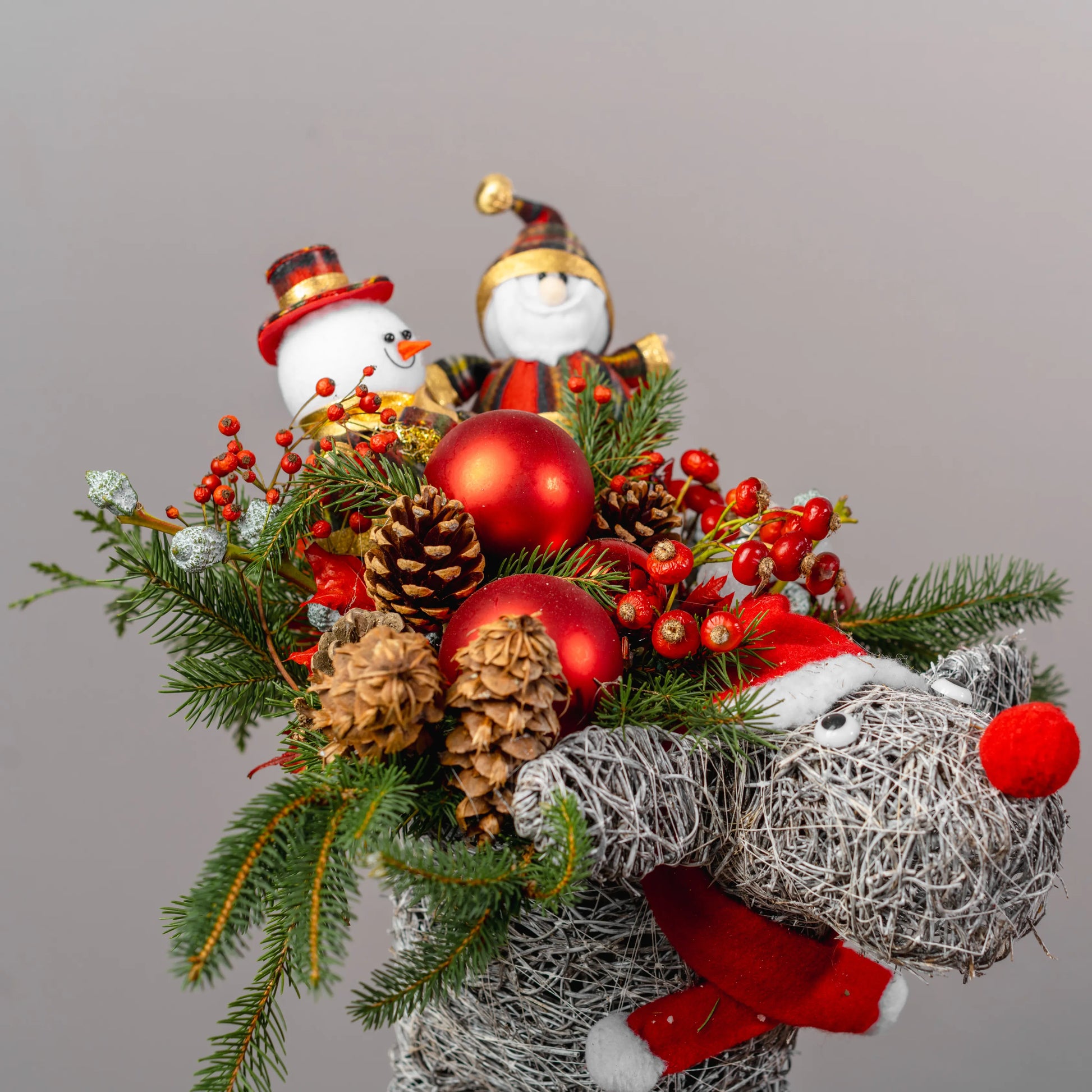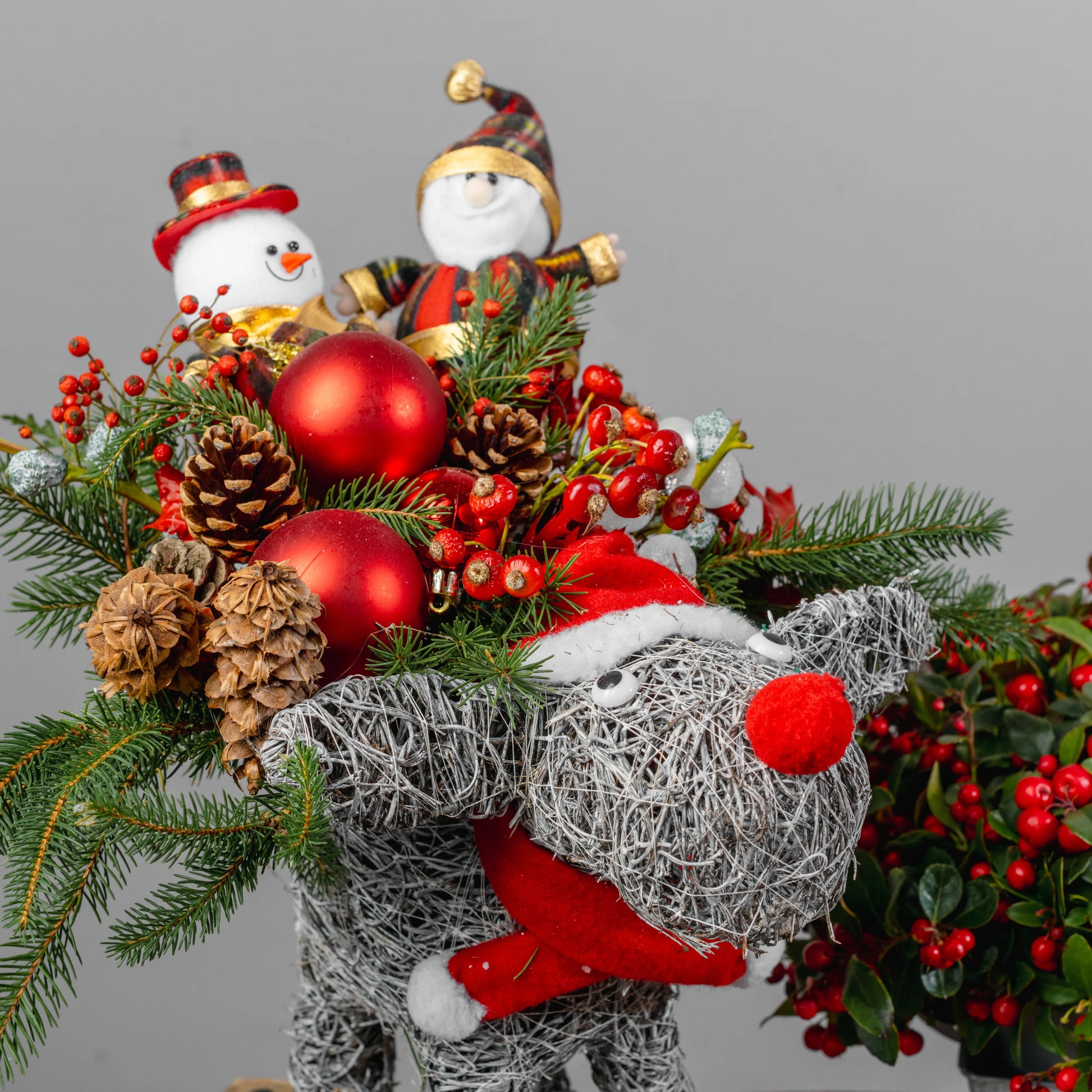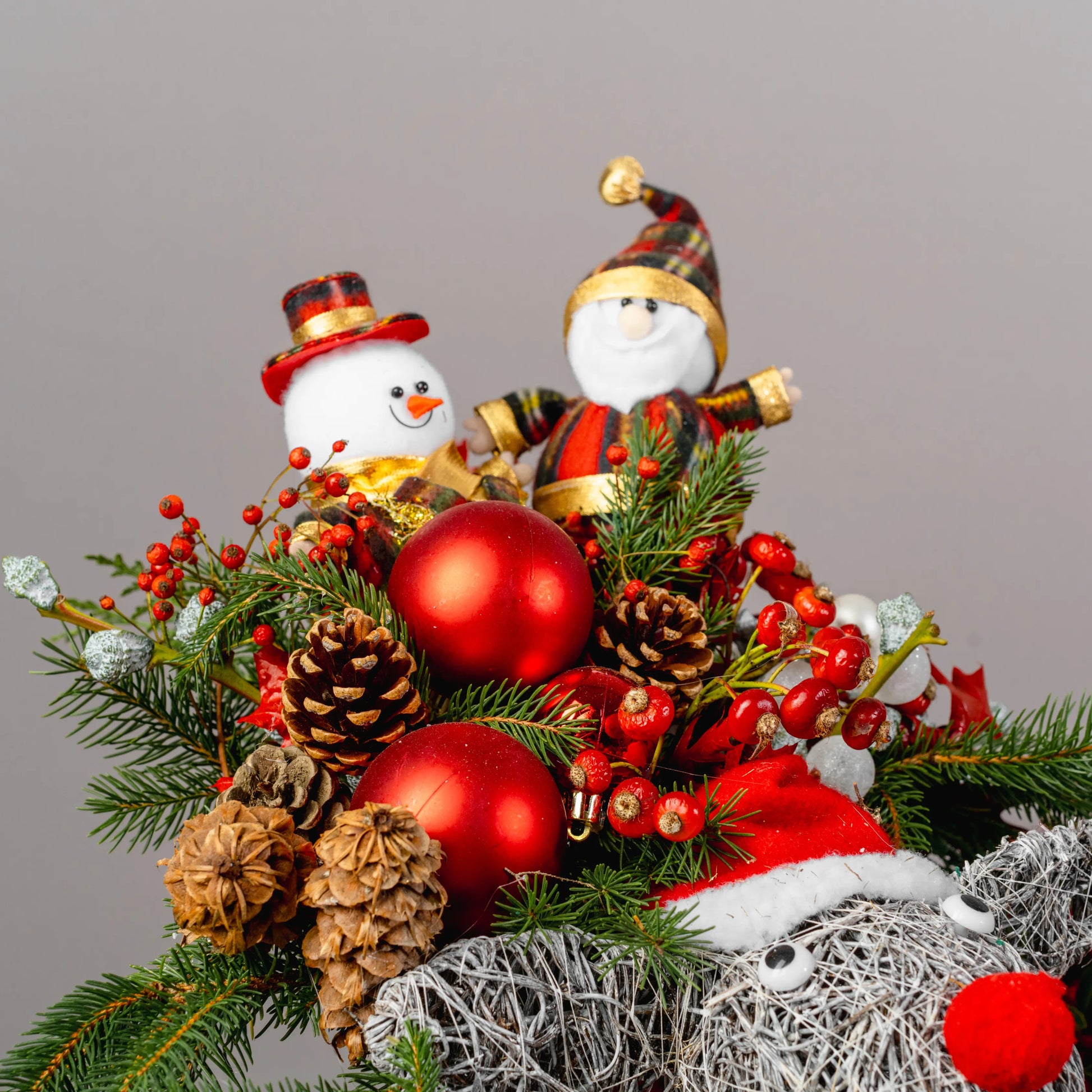 "Amigos Natalinos" é um arranjo de Natal encantador e cheio de alegria. Feito em um vaso divertido em forma de cãozinho festivo, que usa um gorro de Natal, este arranjo traz um toque lúdico à sua decoração. Nas costas do cãozinho, dois bonecos de neve sorridentes estão sentados entre raminhos frescos de Nobilis, pinhas naturais e bolas natalinas vermelhas. As bagas vermelhas adicionam um brilho especial, completando esta peça que celebra a amizade e o espírito festivo. Perfeito para iluminar qualquer espaço com calor e magia natalina.
