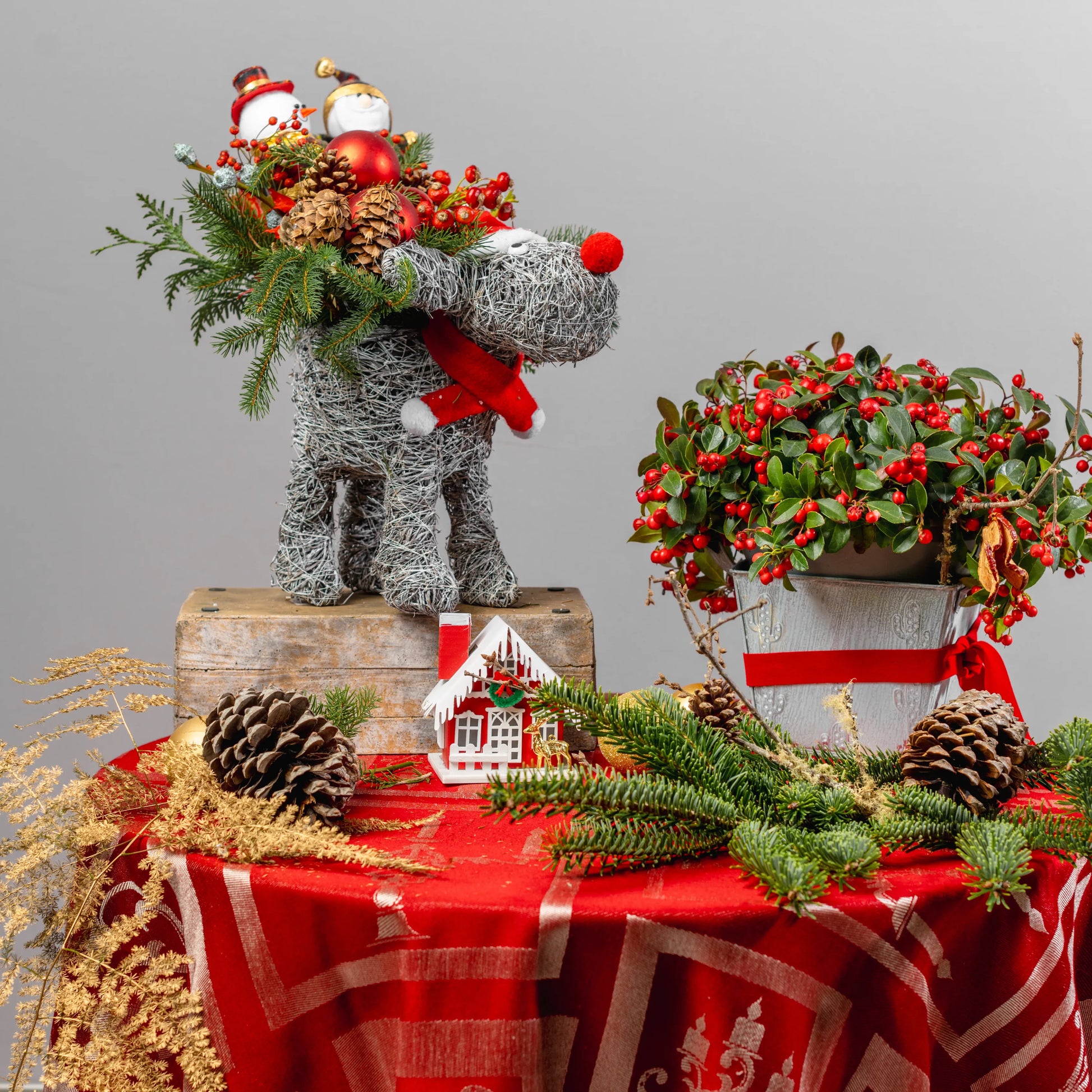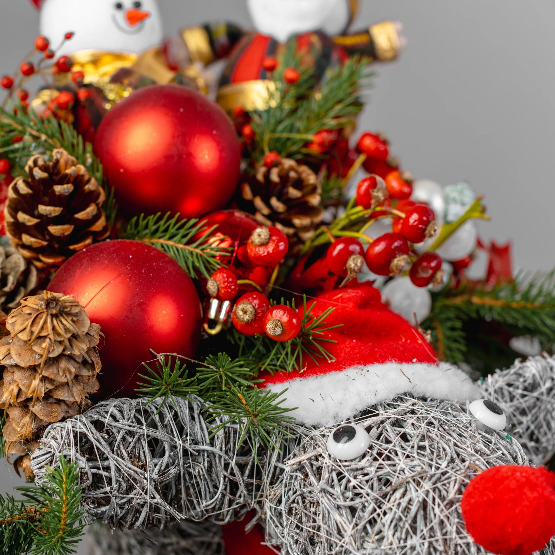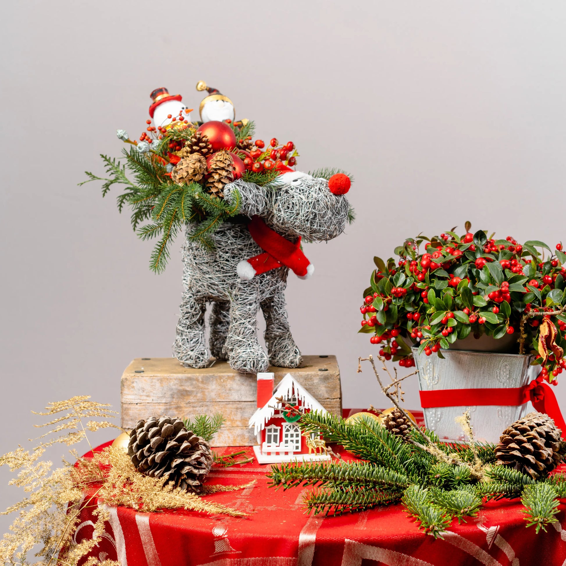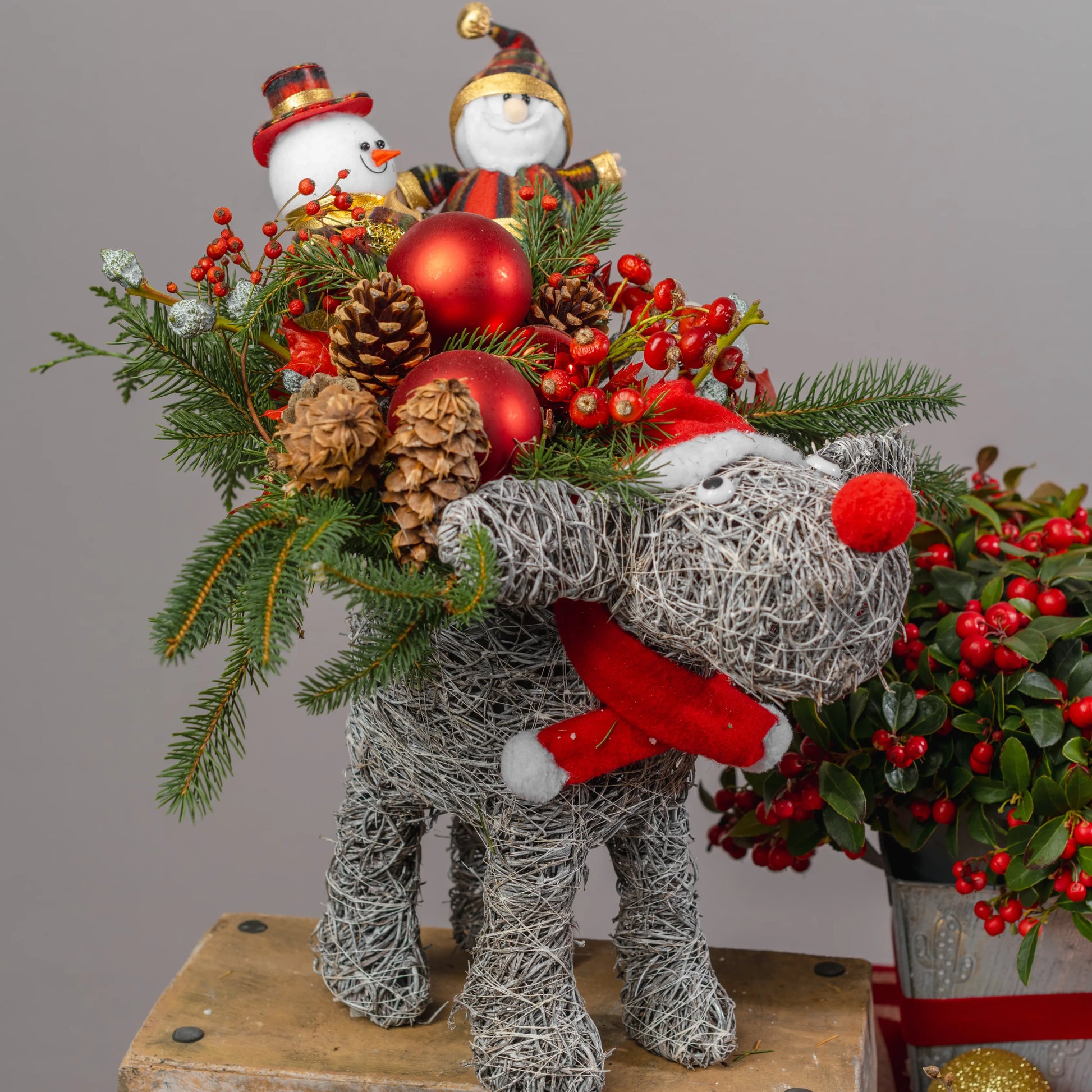 "Amigos Natalinos" é um arranjo de Natal encantador e cheio de alegria. Feito em um vaso divertido em forma de cãozinho festivo, que usa um gorro de Natal, este arranjo traz um toque lúdico à sua decoração. Nas costas do cãozinho, dois bonecos de neve sorridentes estão sentados entre raminhos frescos de Nobilis, pinhas naturais e bolas natalinas vermelhas. As bagas vermelhas adicionam um brilho especial, completando esta peça que celebra a amizade e o espírito festivo. Perfeito para iluminar qualquer espaço com calor e magia natalina.