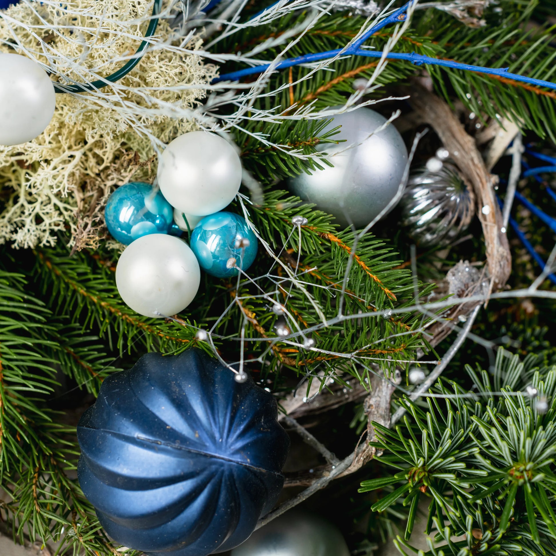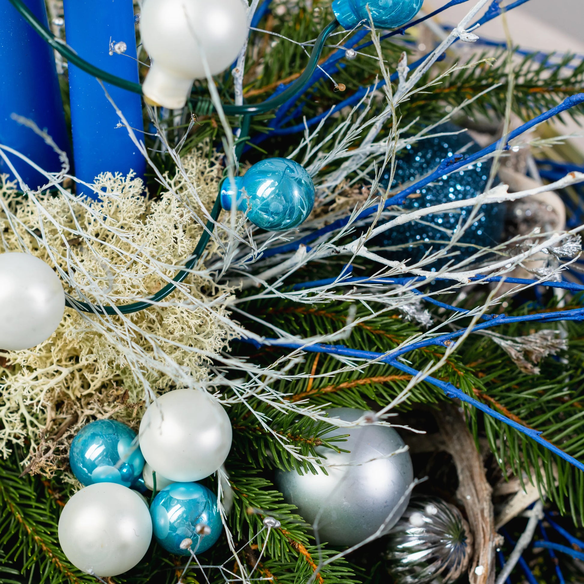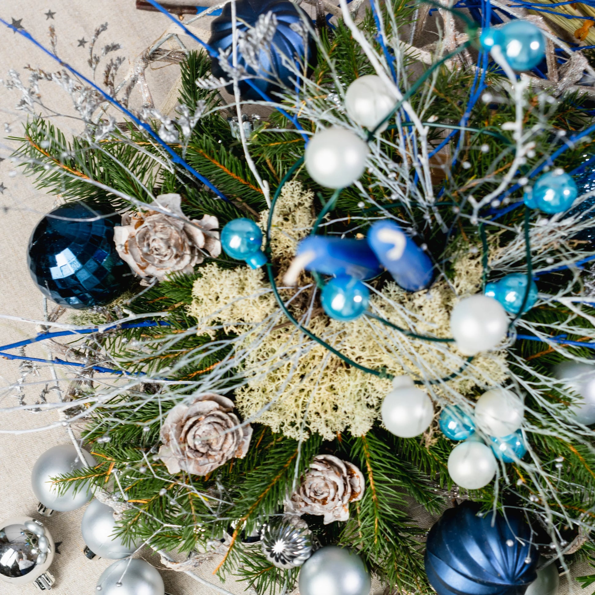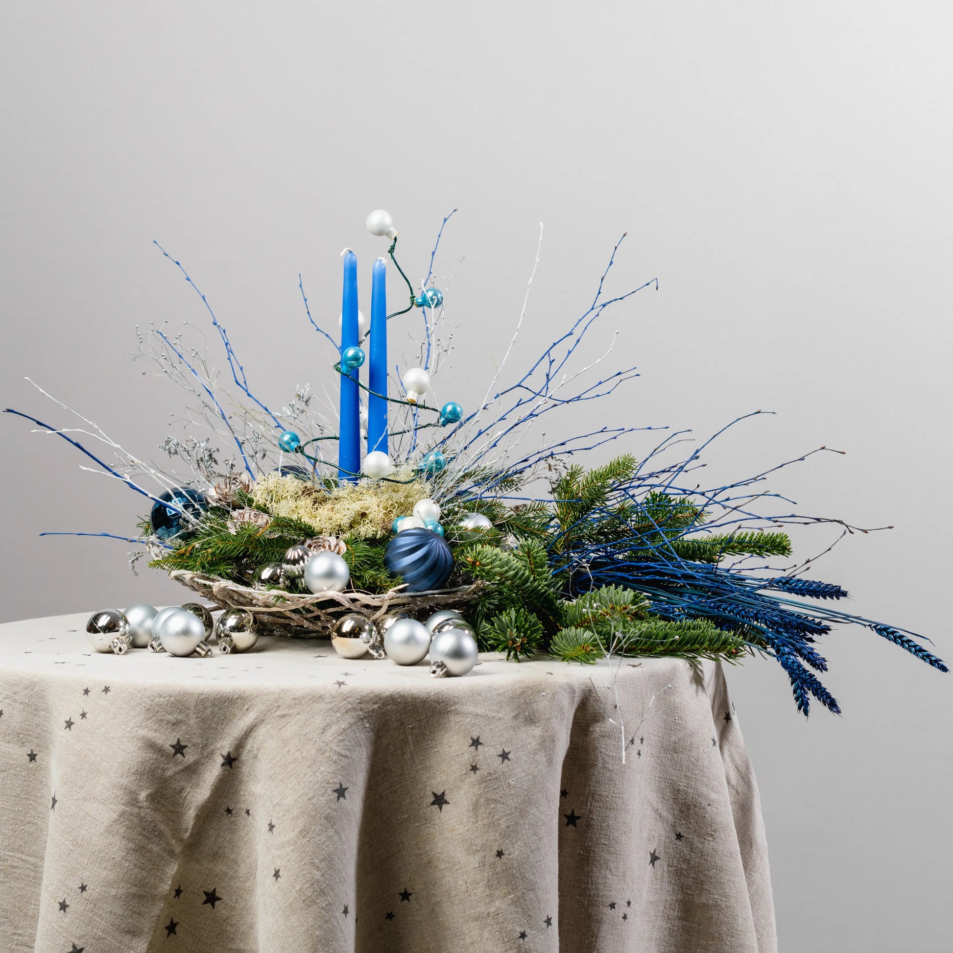 "Aurora de Inverno" é uma peça moderna e sofisticada, ideal para trazer o esplendor do inverno à sua mesa. Montado sobre um prato de videira prateada, o arranjo apresenta duas velas azuis ao centro, cercadas por uma variedade de elementos que evocam o gelo e a tranquilidade invernal. Os raminhos de Nobilis, bolas prateadas, azuis e brancas, e as flores de pinhas brancas criam um visual harmonioso. Raminhos de bétula pintados em azul e prata, combinados com musgo branco, intensificam o tema gélido, enquanto uma estrutura elíptica de arame com bolas azuis ao redor traz um toque artístico e contemporâneo. "Aurora de Inverno" é perfeito para quem deseja uma peça elegante e impactante para o centro de mesa.