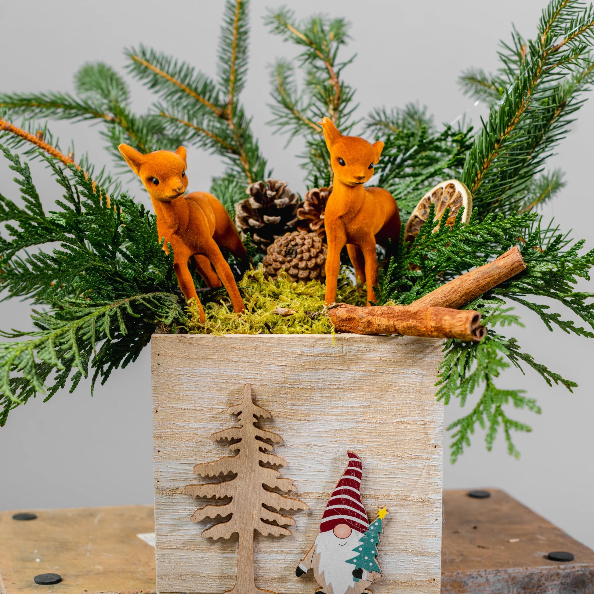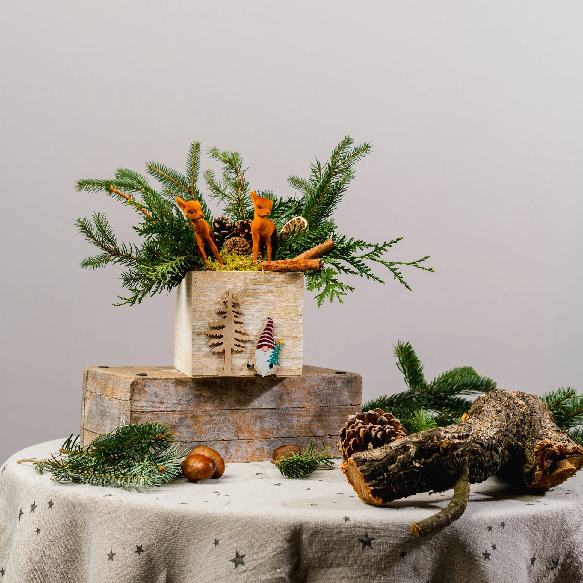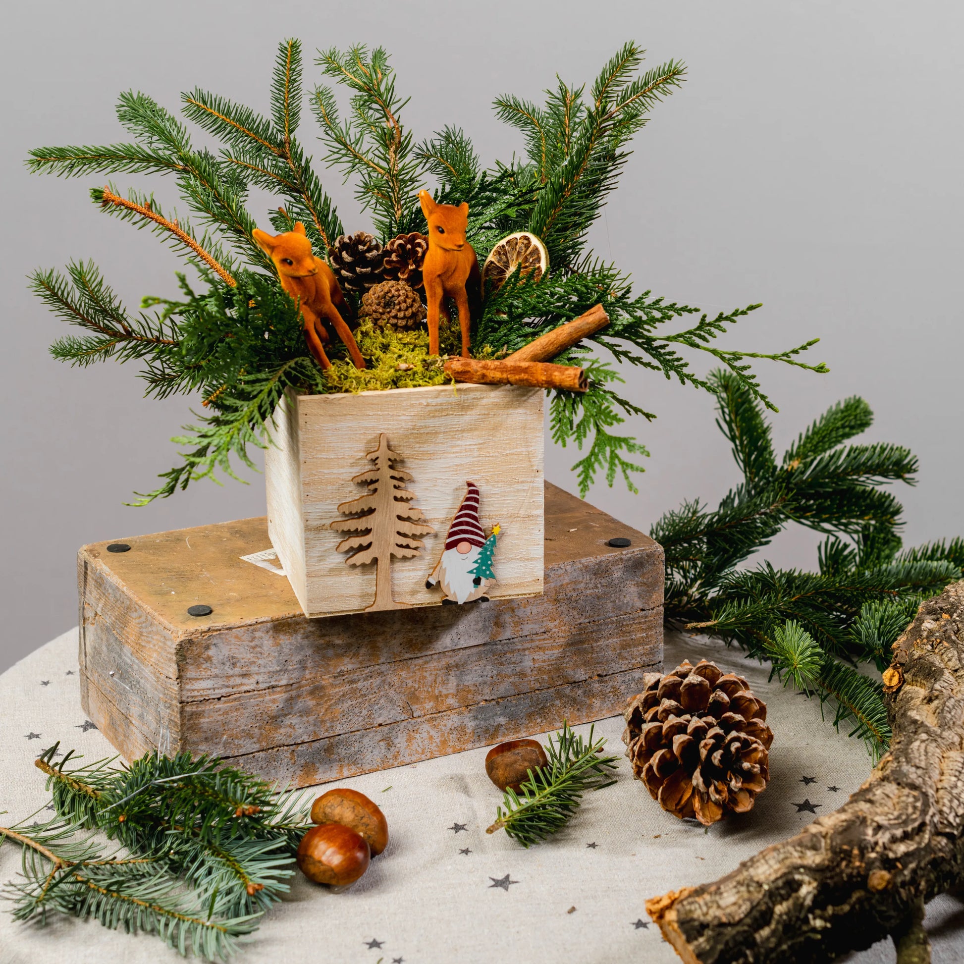 O arranjo de Natal "Bosque Mágico" é uma peça encantadora que traz a beleza rústica e natural do inverno em estilo ecológico. Disposto numa caixa de madeira de cor natural, decorada com imagens natalinas vermelhas, ele exala o charme da floresta em sua forma mais pura. Com raminhos de Nobilis, musgo natural e pinhas, o arranjo ganha uma textura orgânica, enquanto paus de canela e rodelas de laranja adicionam um aroma acolhedor e uma pitada de cor. Ao centro, duas renas castanhas completam a cena, trazendo um toque mágico e convidativo. "Bosque Mágico" é perfeito para quem deseja uma decoração de Natal que combina o espírito festivo com a simplicidade e a beleza da natureza.