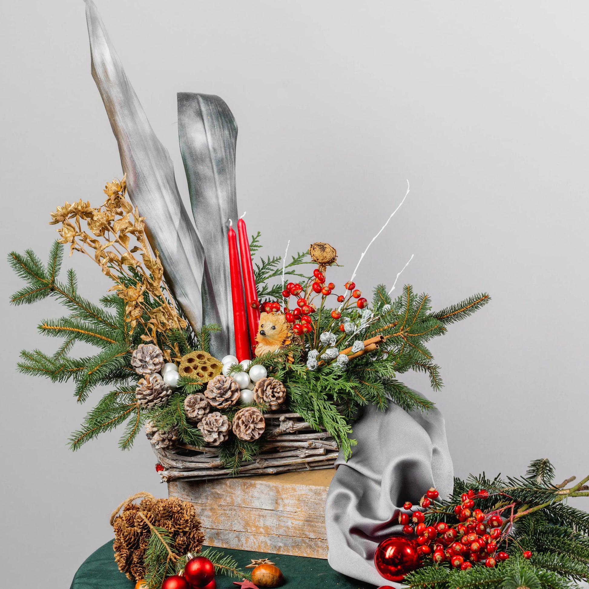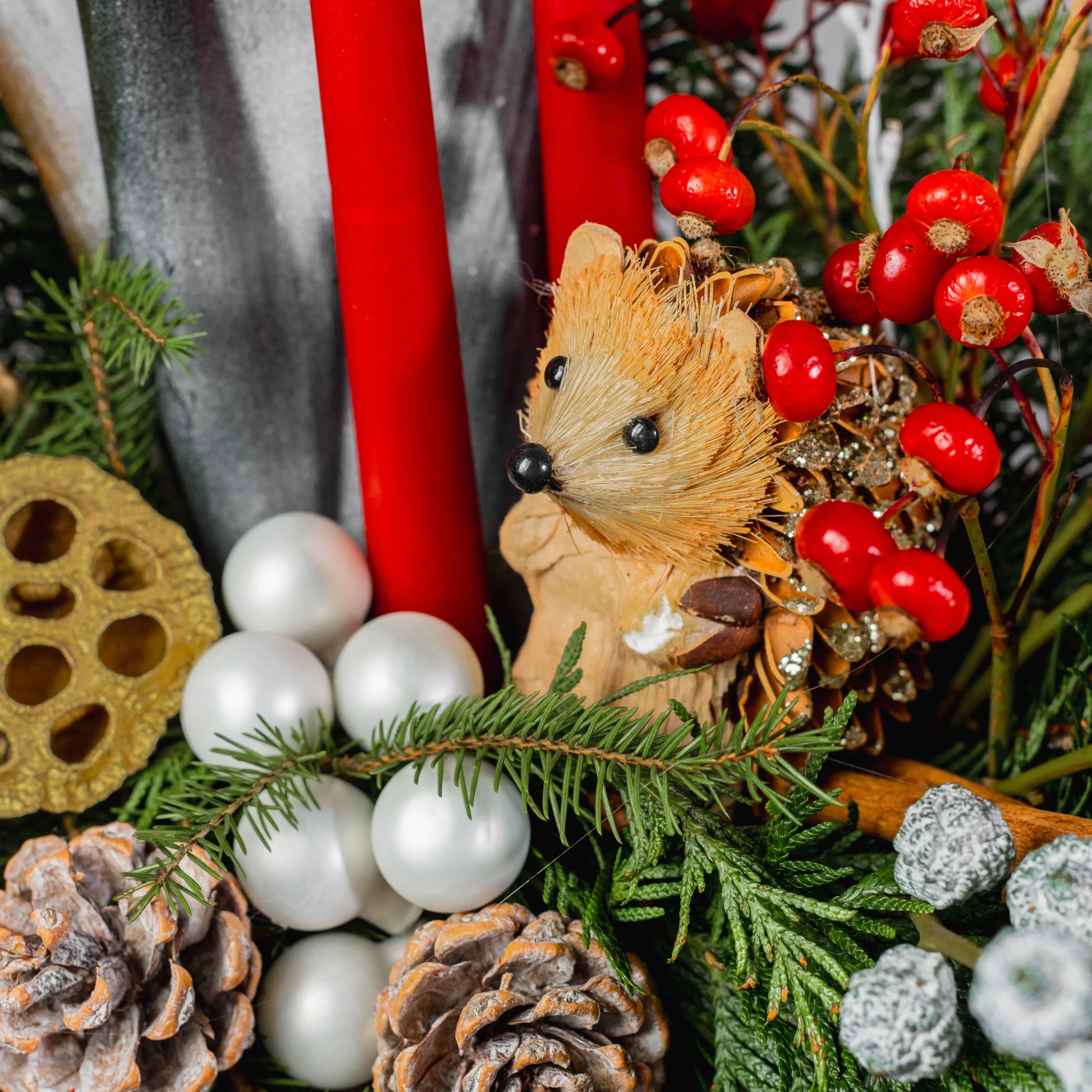 Inspiração Invernal traz o encanto das festividades de uma forma natural e elegante. Em um vaso de videira levemente coberto de branco, o arranjo destaca-se com ramos de cipreste e Nobilis, frutos de eucalipto e pinhas brancas, criando uma base inspirada em paisagens invernais. As folhas douradas e os ornamentos em ouro e branco conferem um toque refinado, enquanto os frutos vermelhos proporcionam vivacidade e calor. No centro, duas velas vermelhas trazem um toque de aconchego ao lado de um ouriço, que parece guardião dessa pequena cena de inverno.