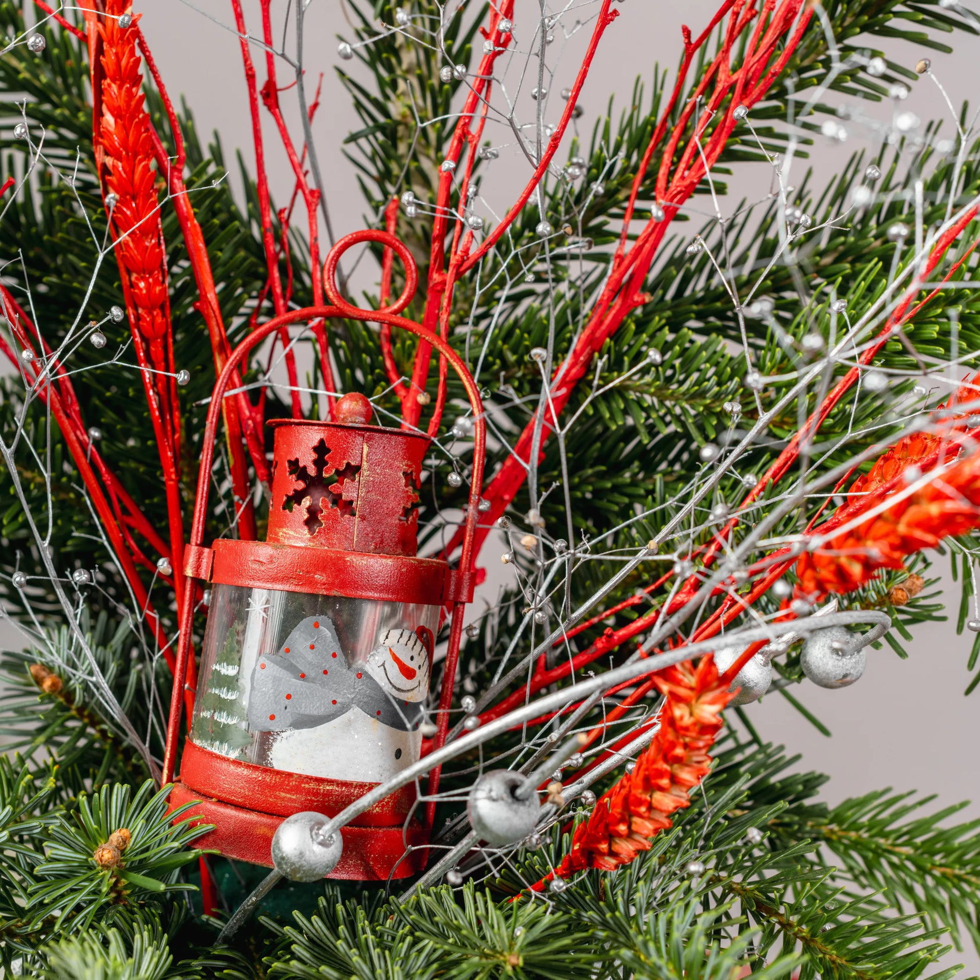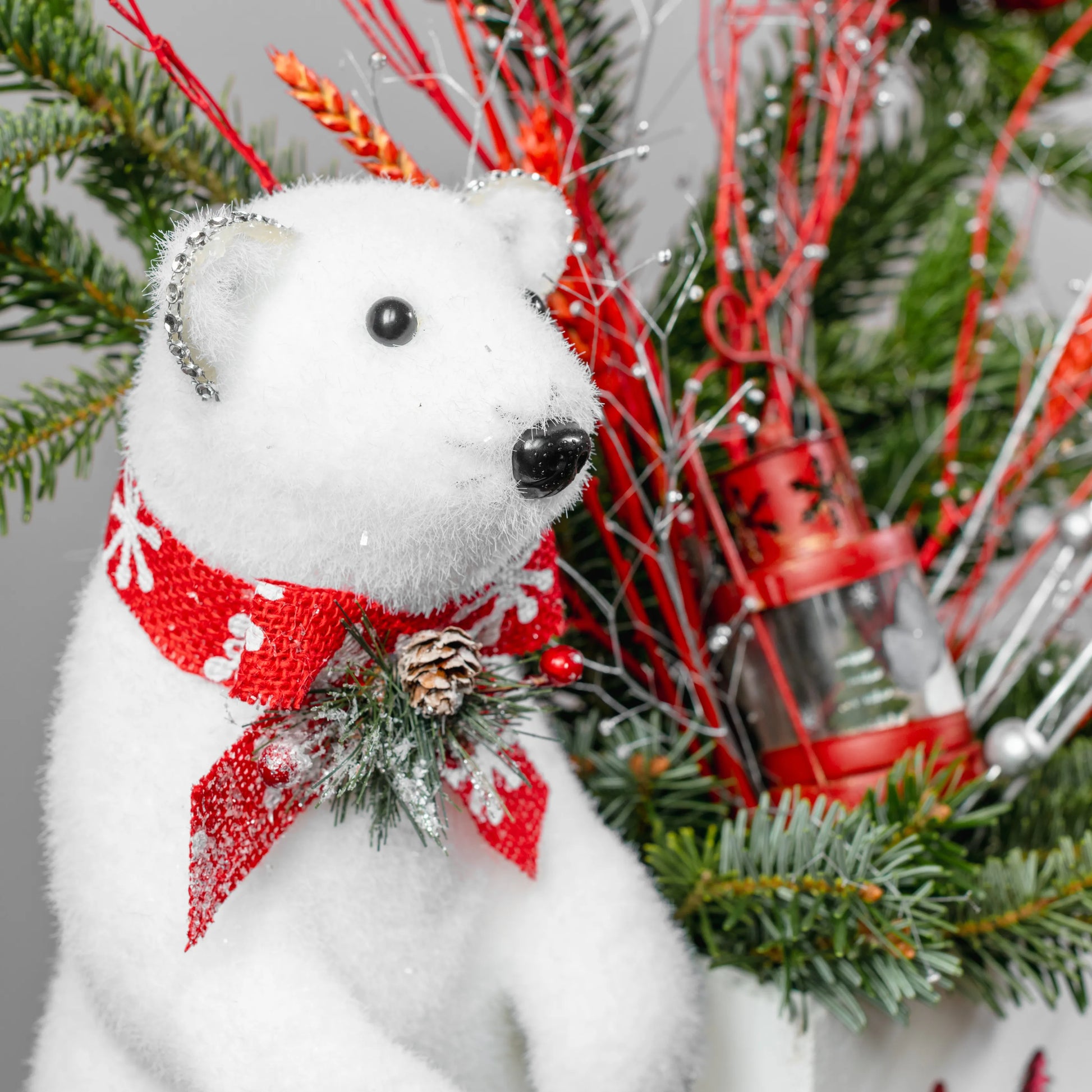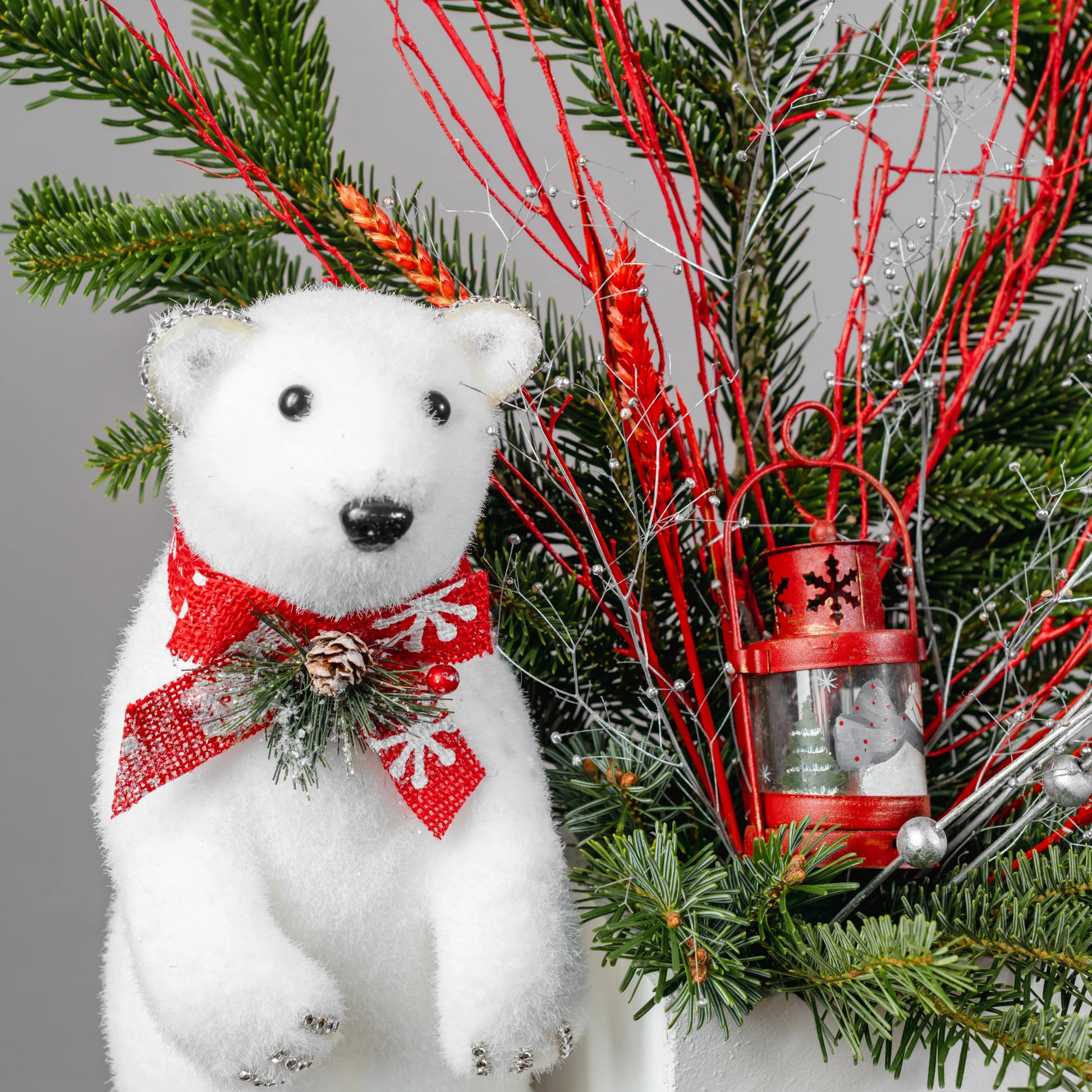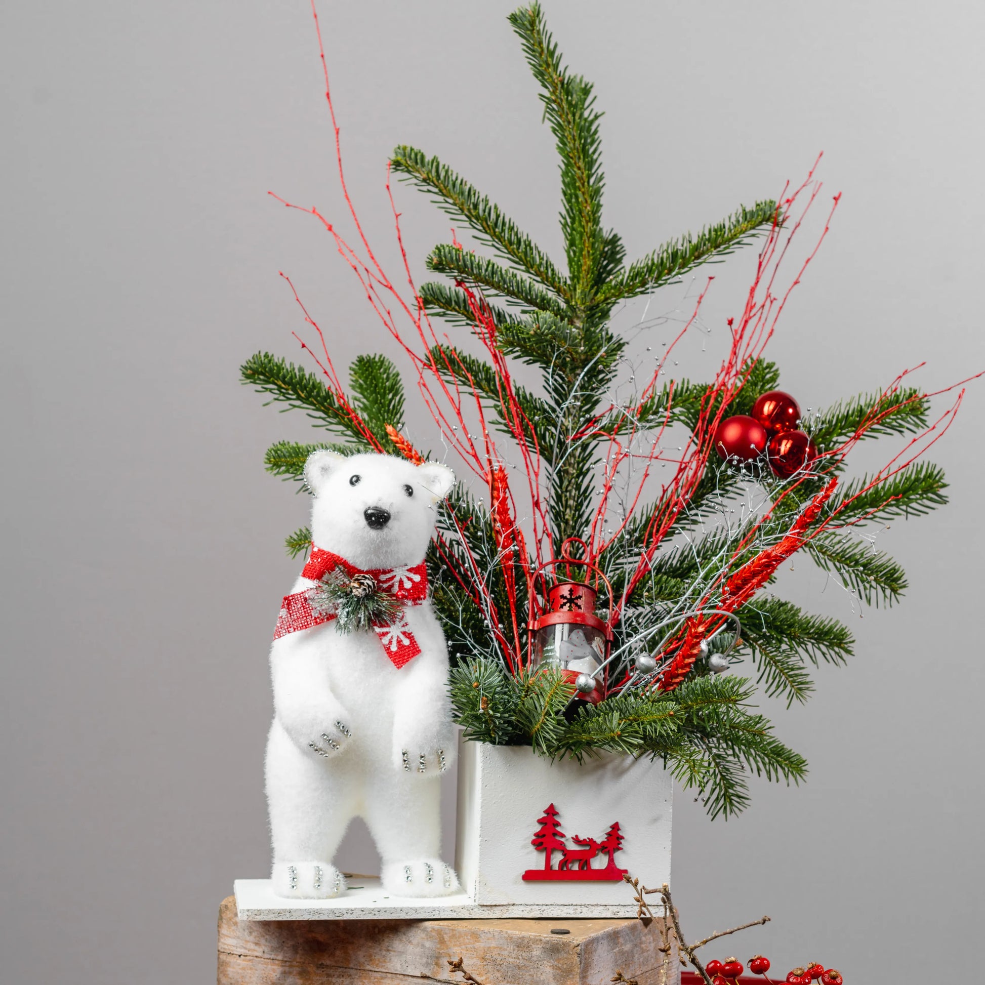 "Inverno Polar" é um arranjo natalino que captura a essência mágica de um Natal no Ártico. Feito em uma caixa de madeira branca com delicadas imagens natalinas pintadas de vermelho, ele combina o charme do rústico com o espírito festivo. Os raminhos de Nobilis e bétula pintada de vermelho criam uma base verdejante e vibrante, enquanto as bolas vermelhas, pinhas e espiguetas vermelhas adicionam um toque de cor e textura. Ao lado, um adorável urso polar, com um lenço vermelho festivo, traz uma presença acolhedora e mágica, tornando este arranjo ideal para iluminar qualquer espaço com a atmosfera natalina.
