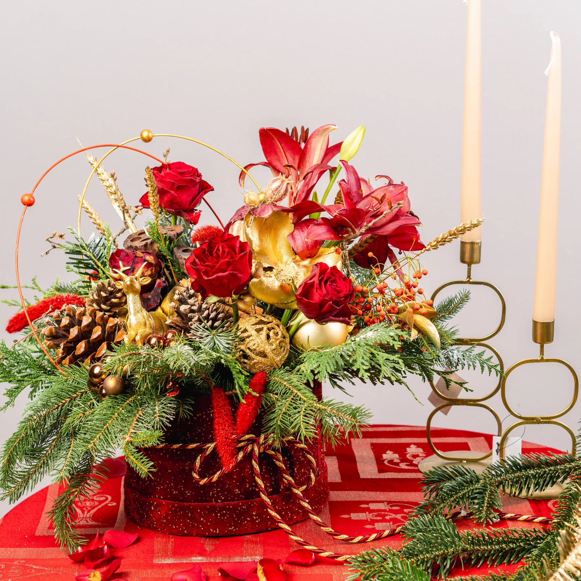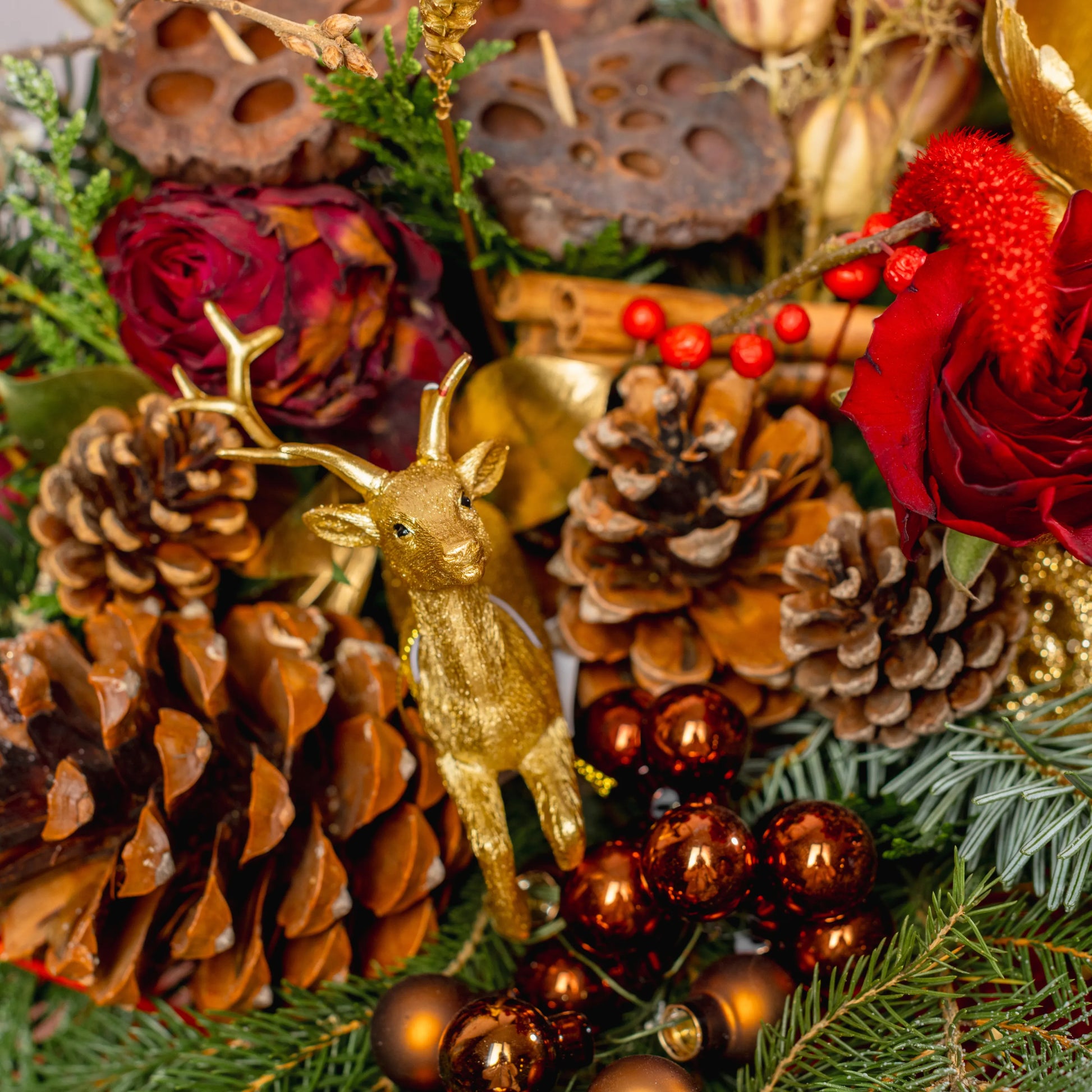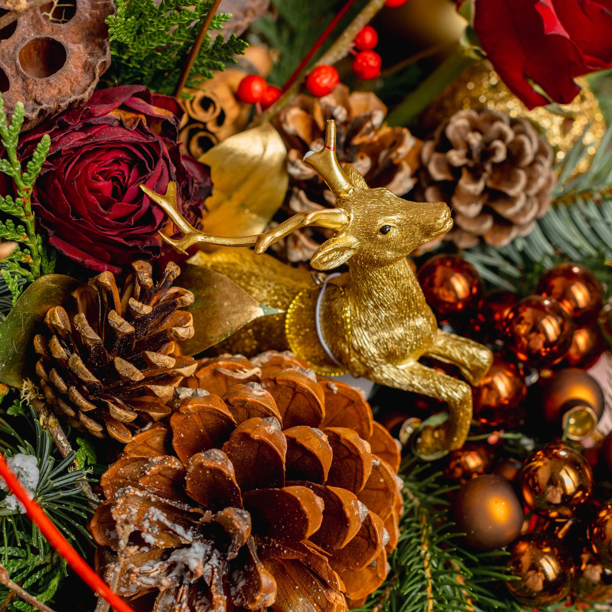 Luxo de Natal é uma expressão exuberante da sofisticação e do brilho das festas. Em uma elegante caixa de veludo vermelho escuro com glitter, este arranjo impressiona com a intensidade das rosas vermelhas, lírios bordô e amarílis, harmonizadas com flores douradas. Bolas natalinas em tons de dourado, bordô e vermelho, castanhas e espiguetas douradas conferem uma textura rica e luxuosa. Pinhas douradas e naturais acrescentam um toque rústico refinado, enquanto um majestoso veado dourado ao centro completa a cena. Luxo de Natal é uma celebração do espírito natalino em sua forma mais requintada, perfeito para quem aprecia detalhes de elegância e opulência na decoração.