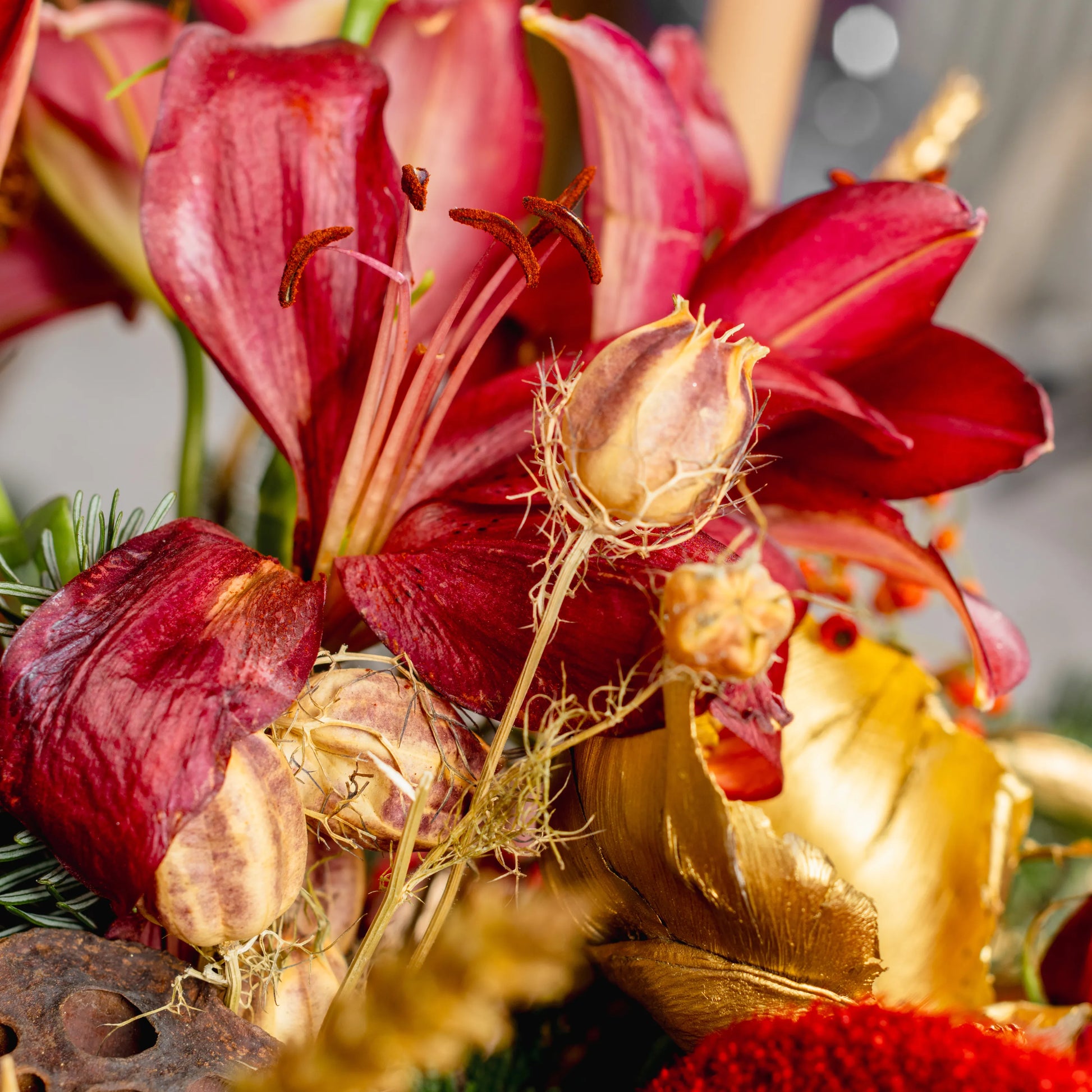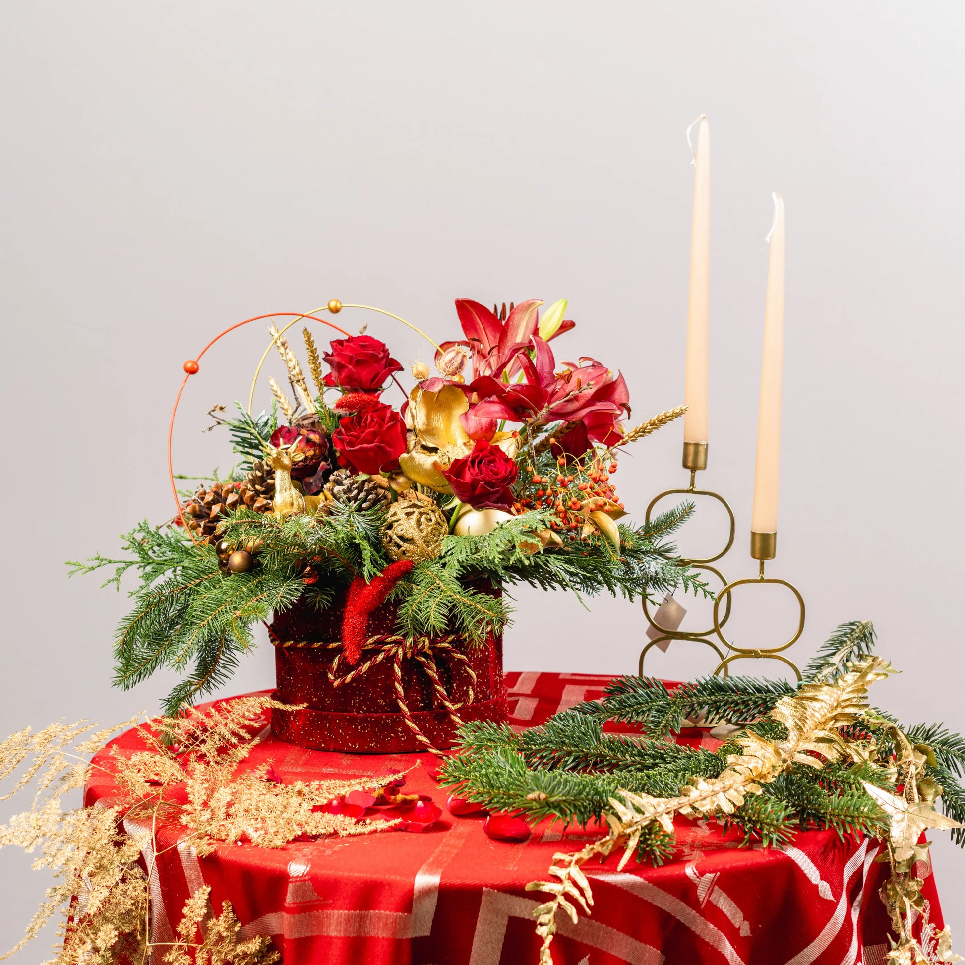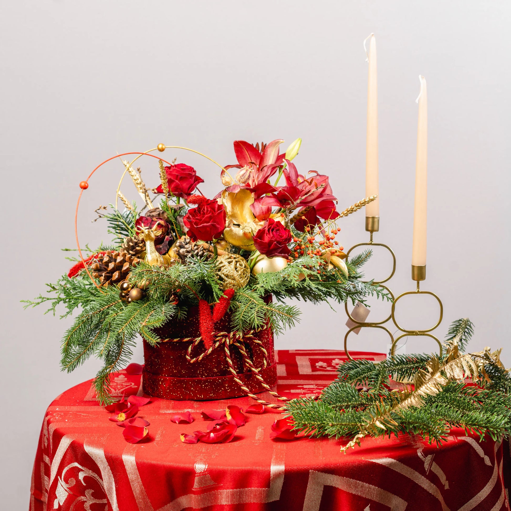 Luxo de Natal é uma expressão exuberante da sofisticação e do brilho das festas. Em uma elegante caixa de veludo vermelho escuro com glitter, este arranjo impressiona com a intensidade das rosas vermelhas, lírios bordô e amarílis, harmonizadas com flores douradas. Bolas natalinas em tons de dourado, bordô e vermelho, castanhas e espiguetas douradas conferem uma textura rica e luxuosa. Pinhas douradas e naturais acrescentam um toque rústico refinado, enquanto um majestoso veado dourado ao centro completa a cena. Luxo de Natal é uma celebração do espírito natalino em sua forma mais requintada, perfeito para quem aprecia detalhes de elegância e opulência na decoração.