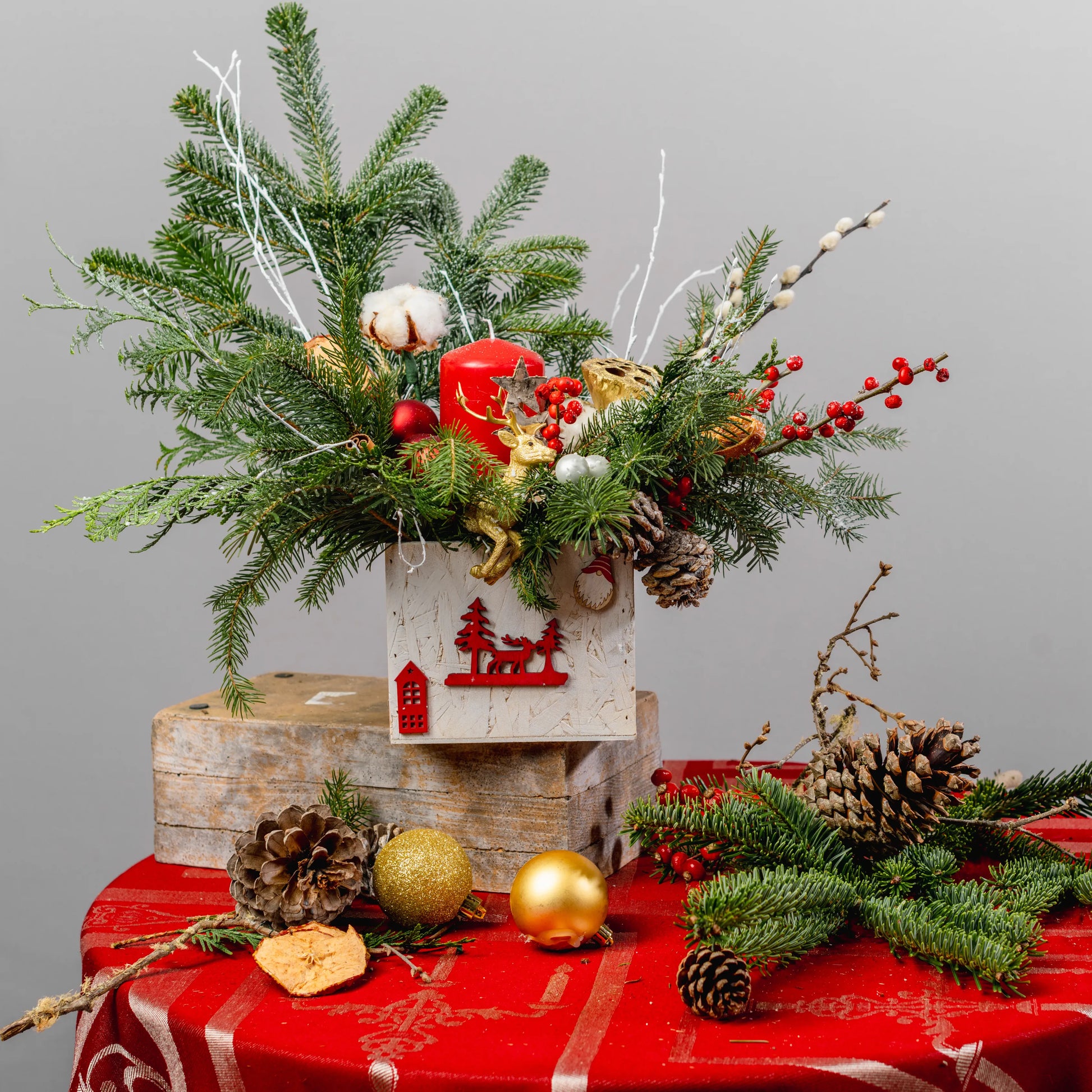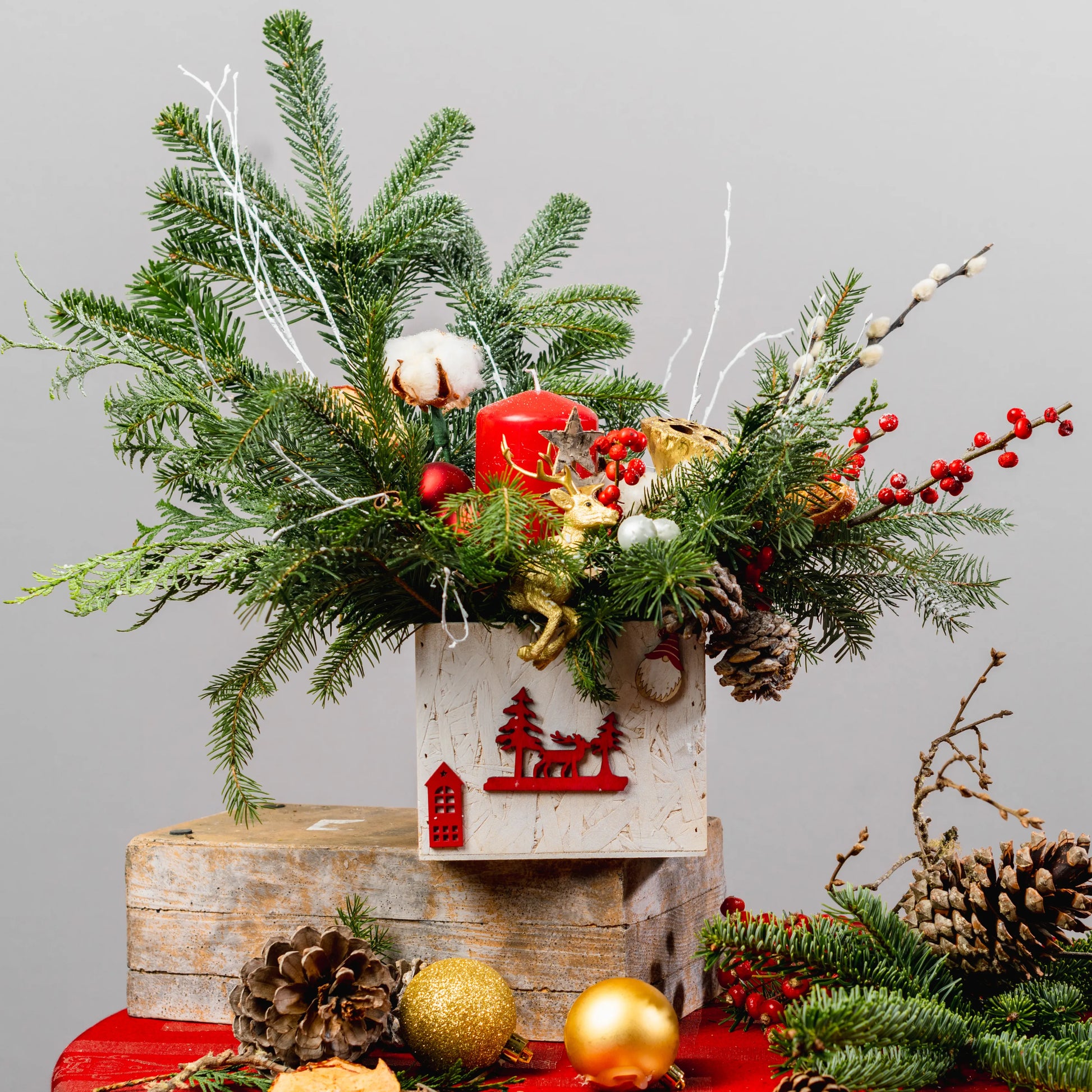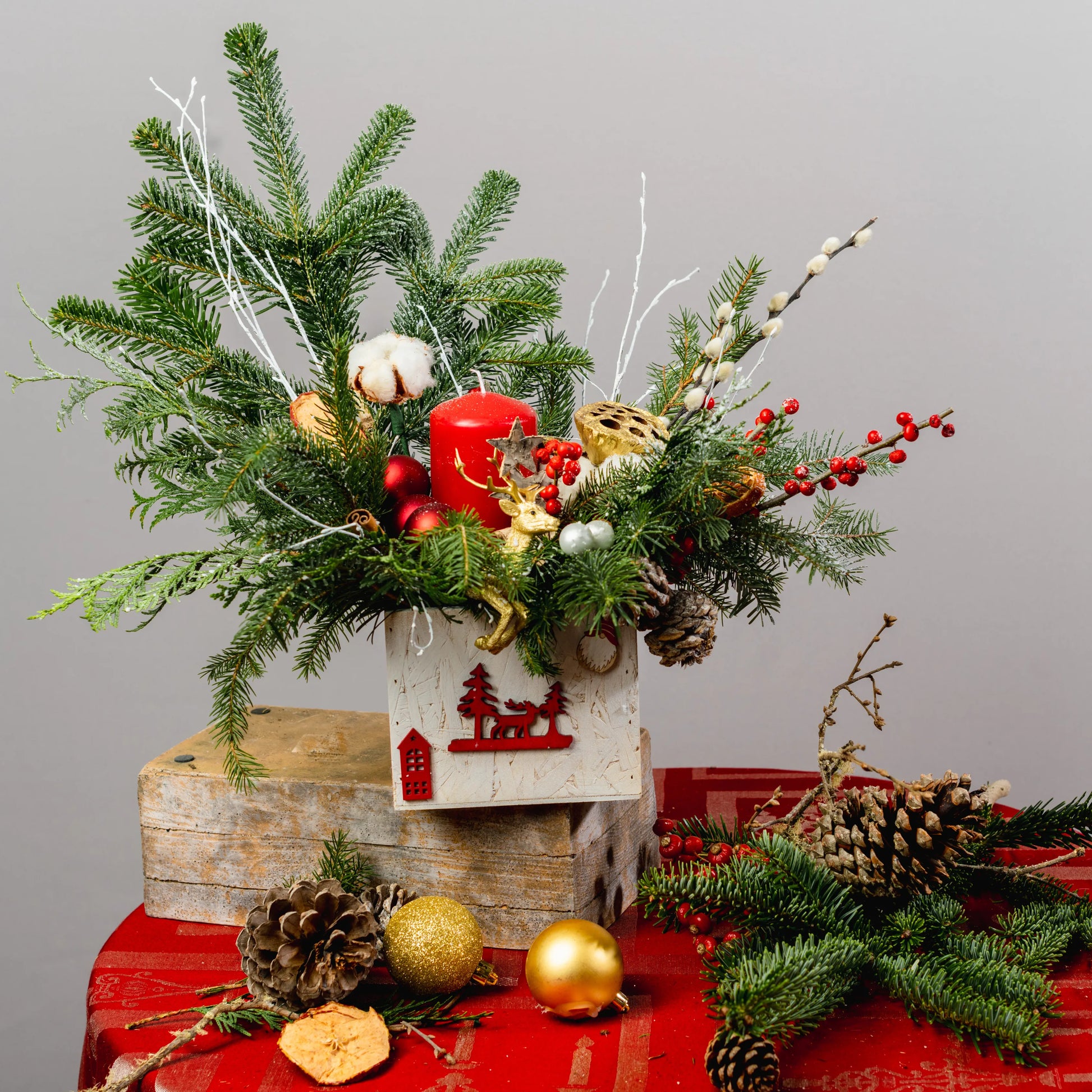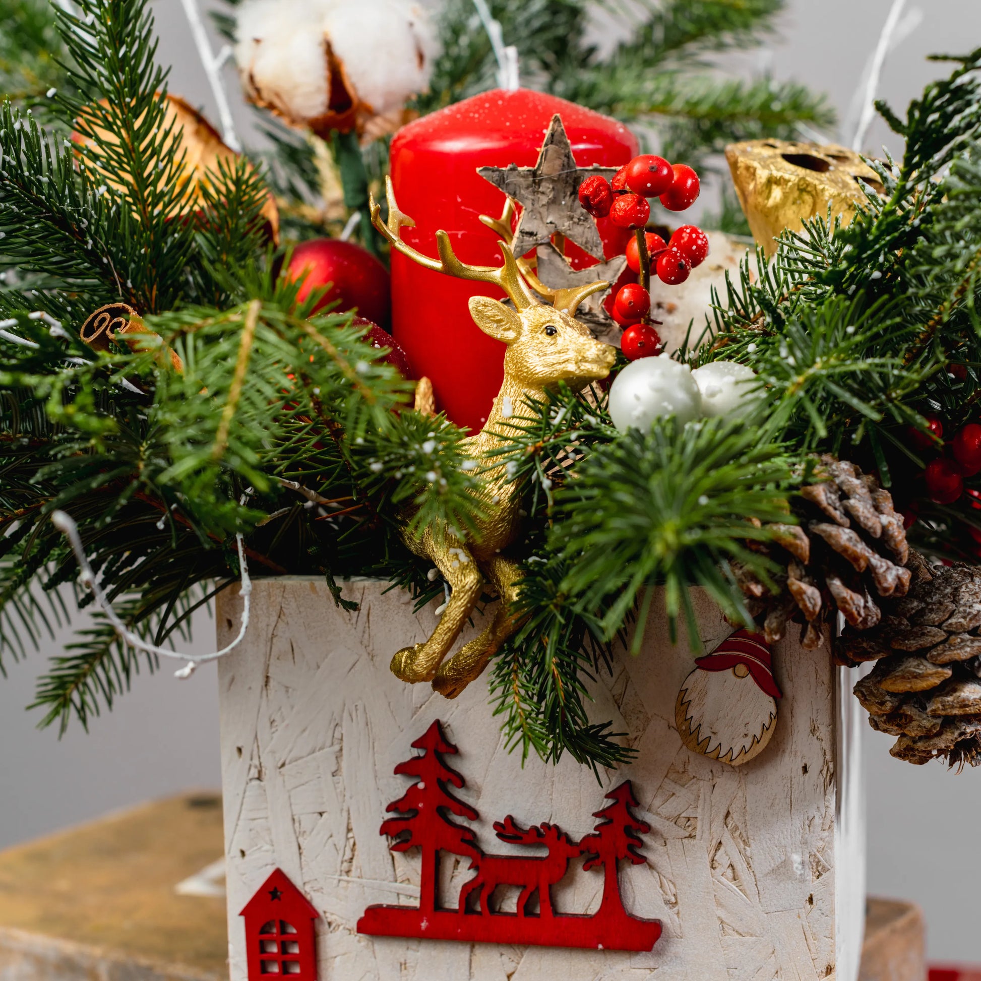 Luz do Norte é um arranjo natalino que evoca a serenidade e o encanto do inverno nórdico. Feito em uma caixa de madeira branca com uma imagem natalina vermelha, ele traz a magia da estação com raminhos de Nobilis e galhos pintados de branco, que lembram flocos de neve. As bolas em tons de vermelho e dourado, as bagas vibrantes, pinhas e delicadas flores de algodão criam uma harmonia natural e festiva. No centro, uma rena dourada em meio a uma vela vermelha acesa dá um toque de sofisticação e aconchego, perfeito para iluminar o seu Natal com um brilho especial.