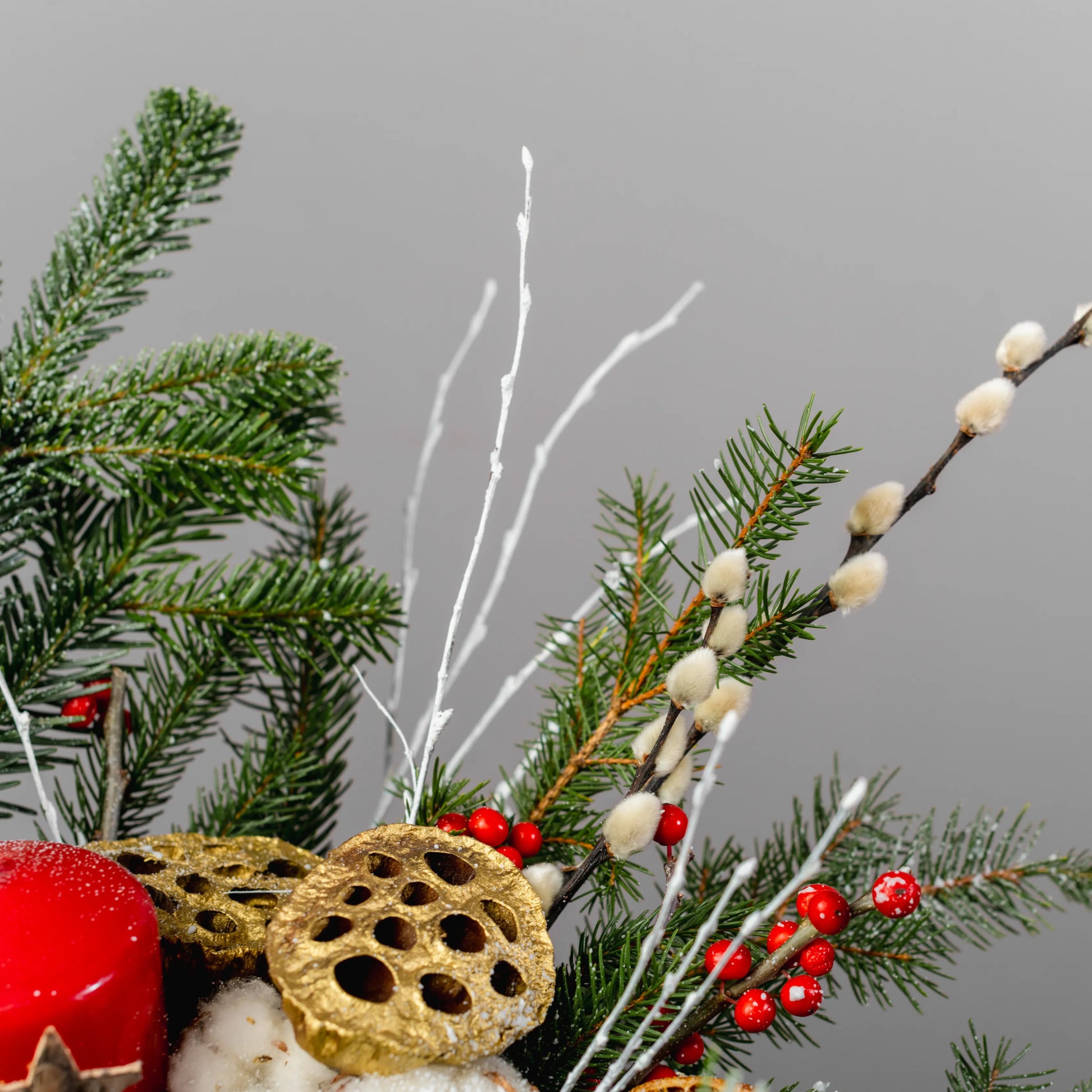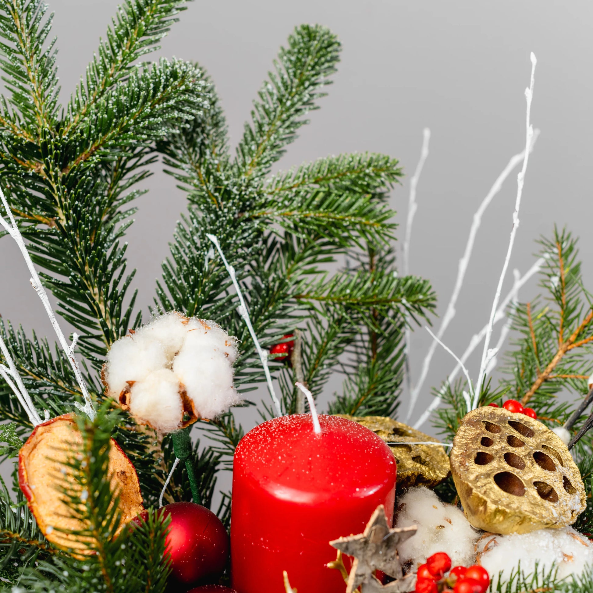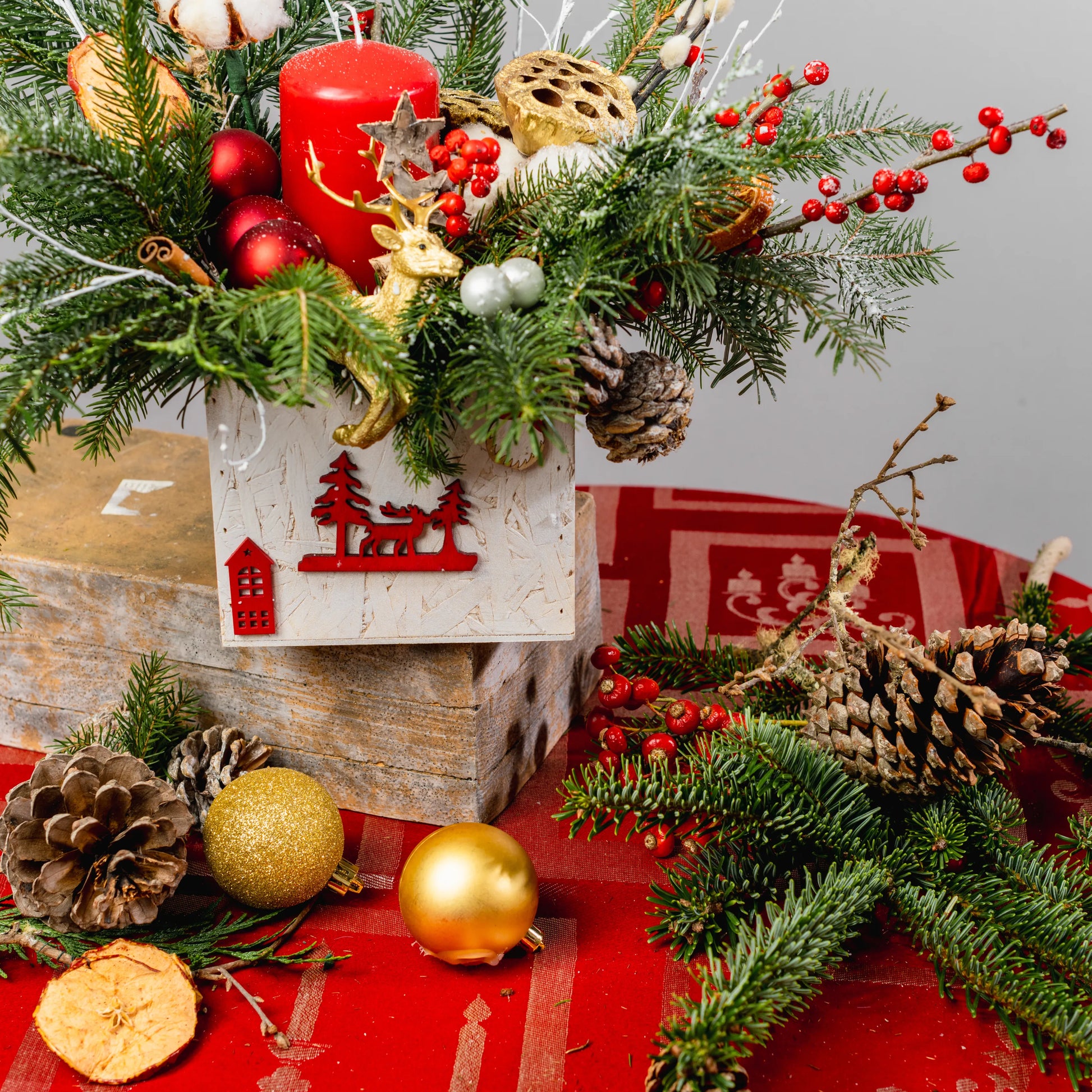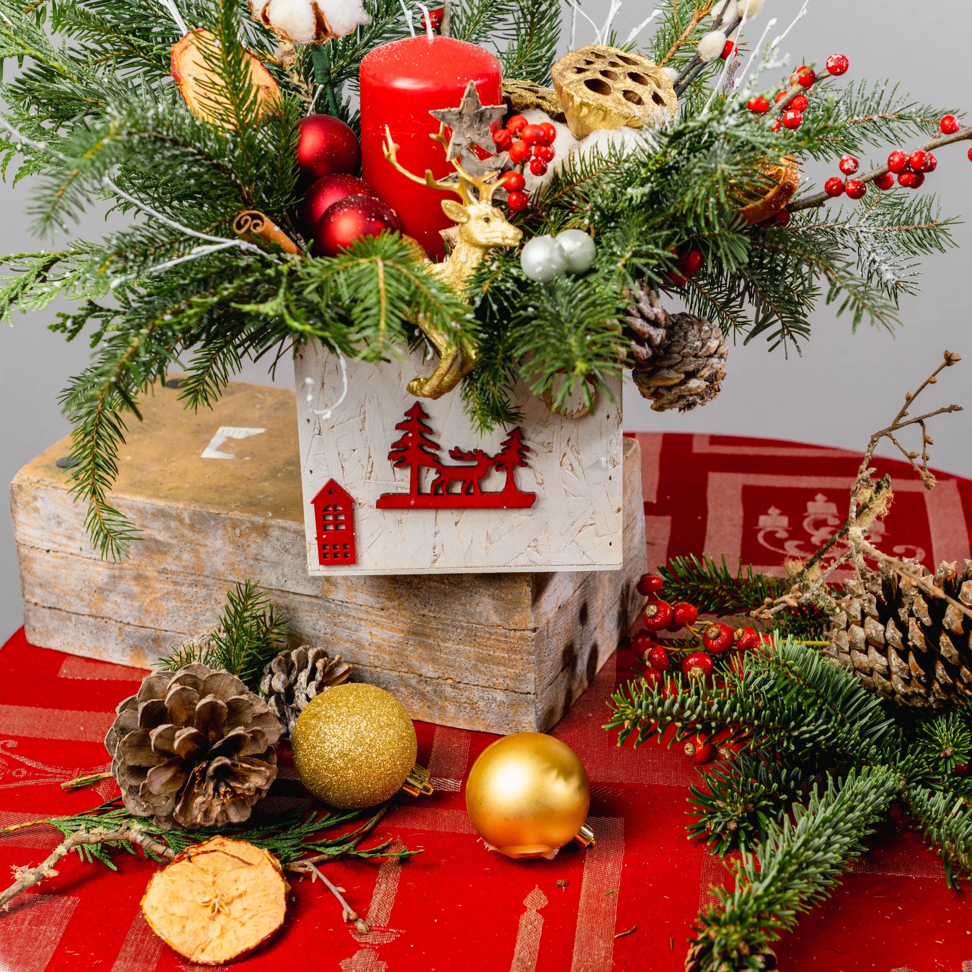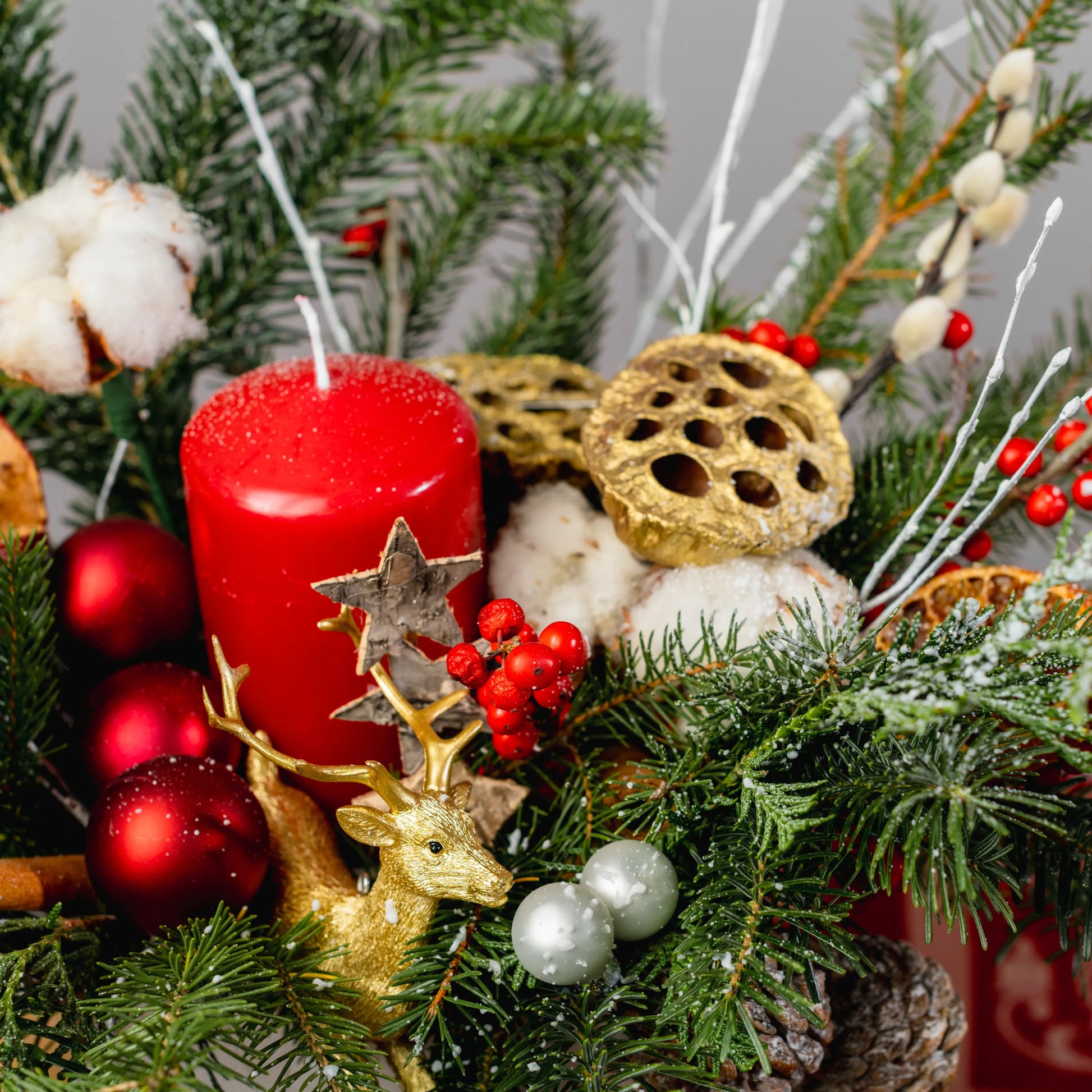 Luz do Norte é um arranjo natalino que evoca a serenidade e o encanto do inverno nórdico. Feito em uma caixa de madeira branca com uma imagem natalina vermelha, ele traz a magia da estação com raminhos de Nobilis e galhos pintados de branco, que lembram flocos de neve. As bolas em tons de vermelho e dourado, as bagas vibrantes, pinhas e delicadas flores de algodão criam uma harmonia natural e festiva. No centro, uma rena dourada em meio a uma vela vermelha acesa dá um toque de sofisticação e aconchego, perfeito para iluminar o seu Natal com um brilho especial.