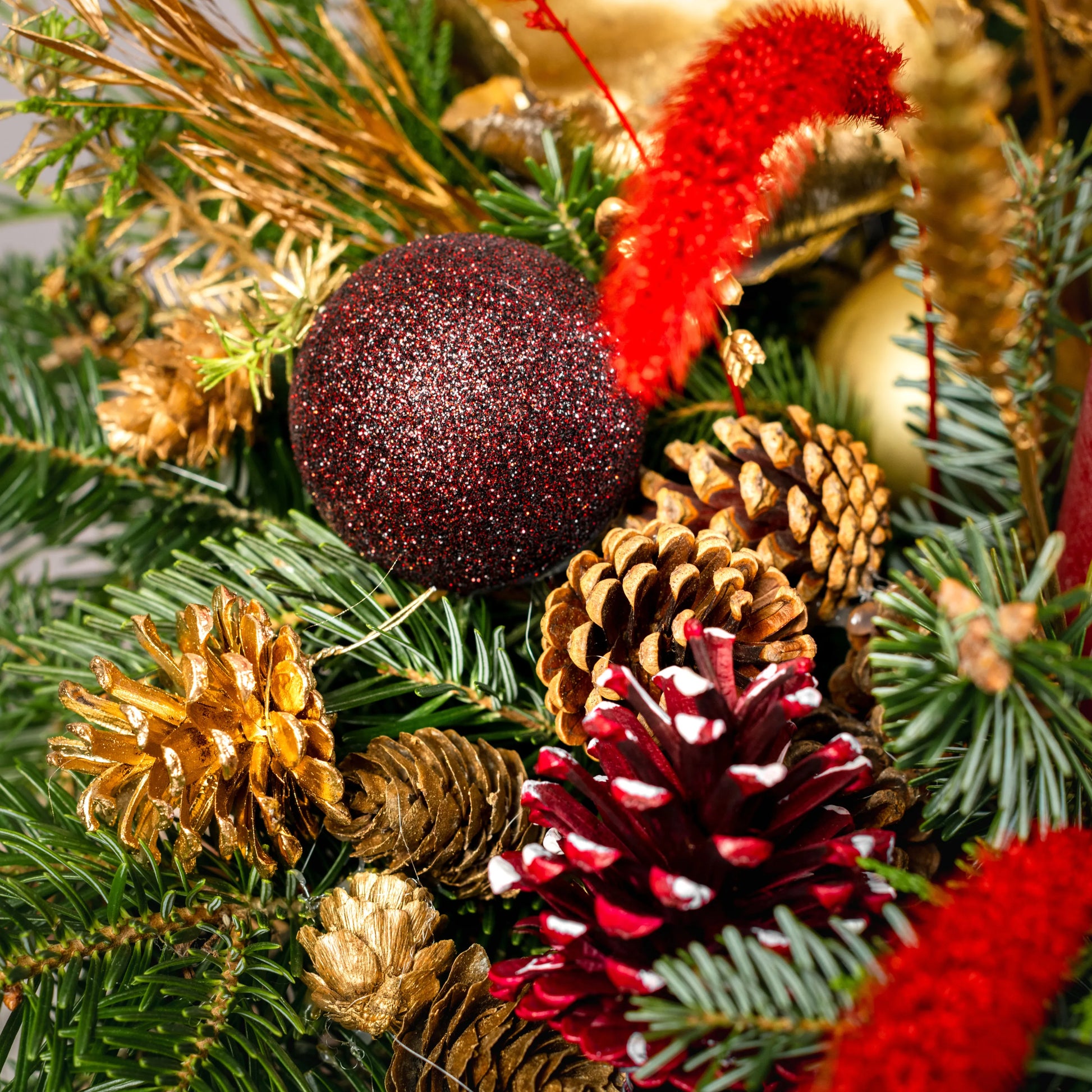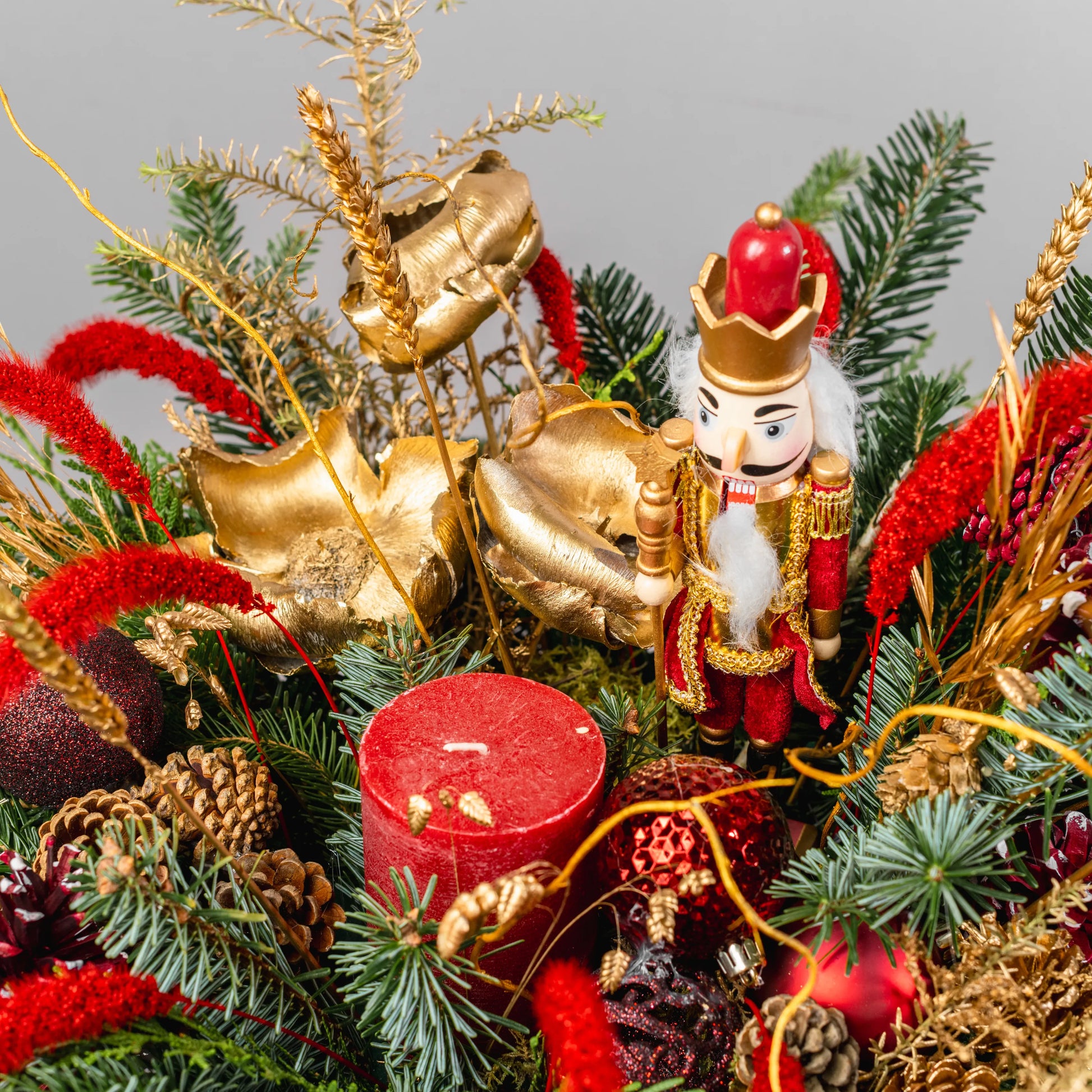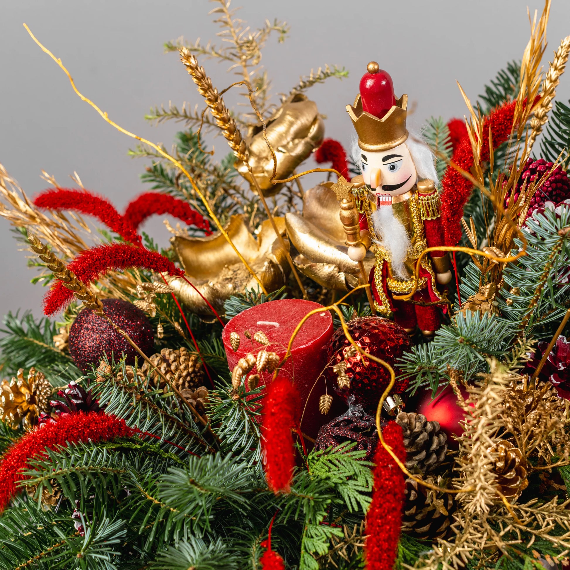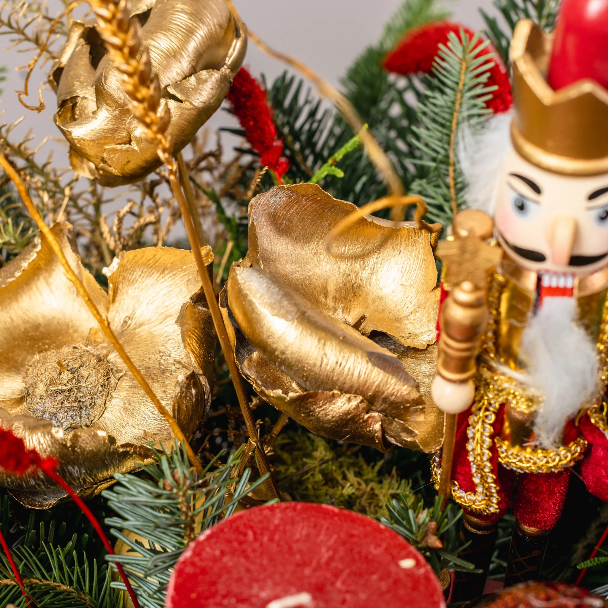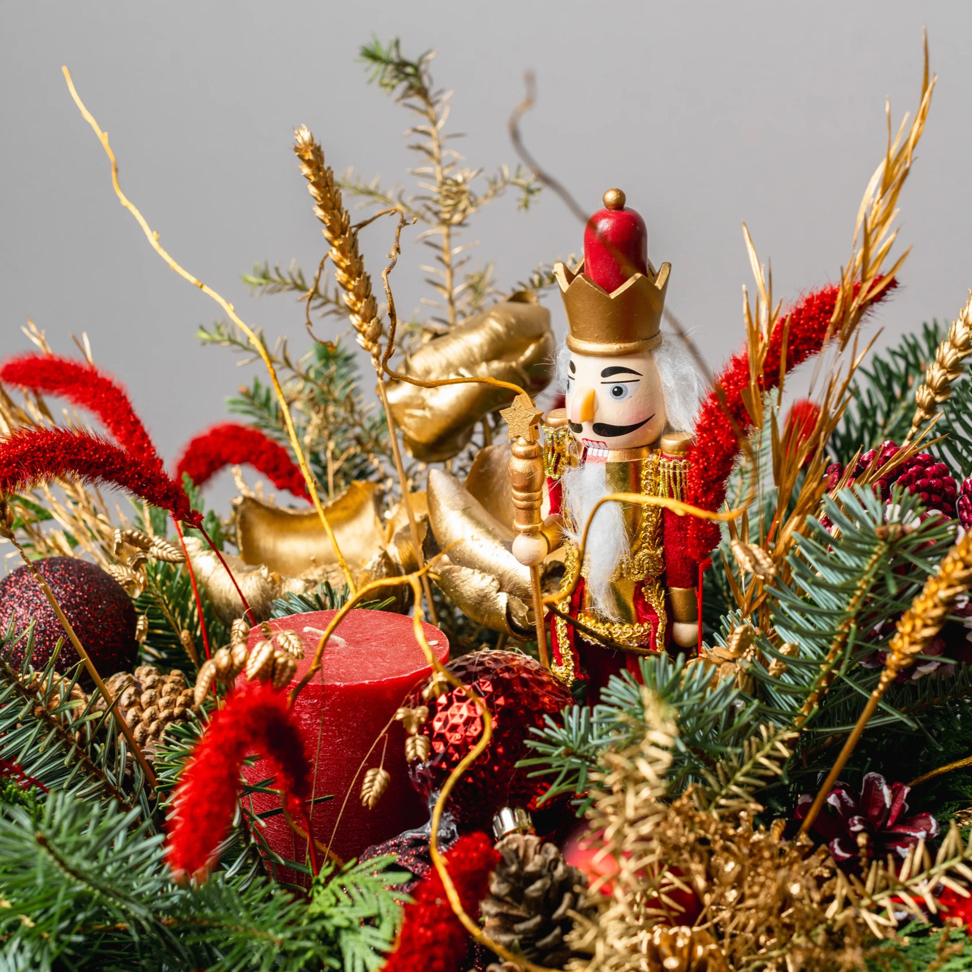 Neste arranjo natalino, "Magia do Quebra-Nozes", cada elemento evoca o encanto de um dos contos mais amados do Natal. Na taça dourada, os ramos de Nobilis trazem o verde vibrante da floresta encantada, enquanto pinhas pintadas em bordô e dourado acrescentam um toque de realeza. As bolas natalinas e espiguetas brilham em tons de bordô e dourado, conferindo uma sofisticação festiva à peça. Ao centro, velas bordô iluminam o ambiente, destacando a presença majestosa de um quebra-nozes, símbolo de proteção e coragem. Este arranjo é ideal para criar um ambiente aconchegante e repleto de tradição, perfeito para o espírito natalino.