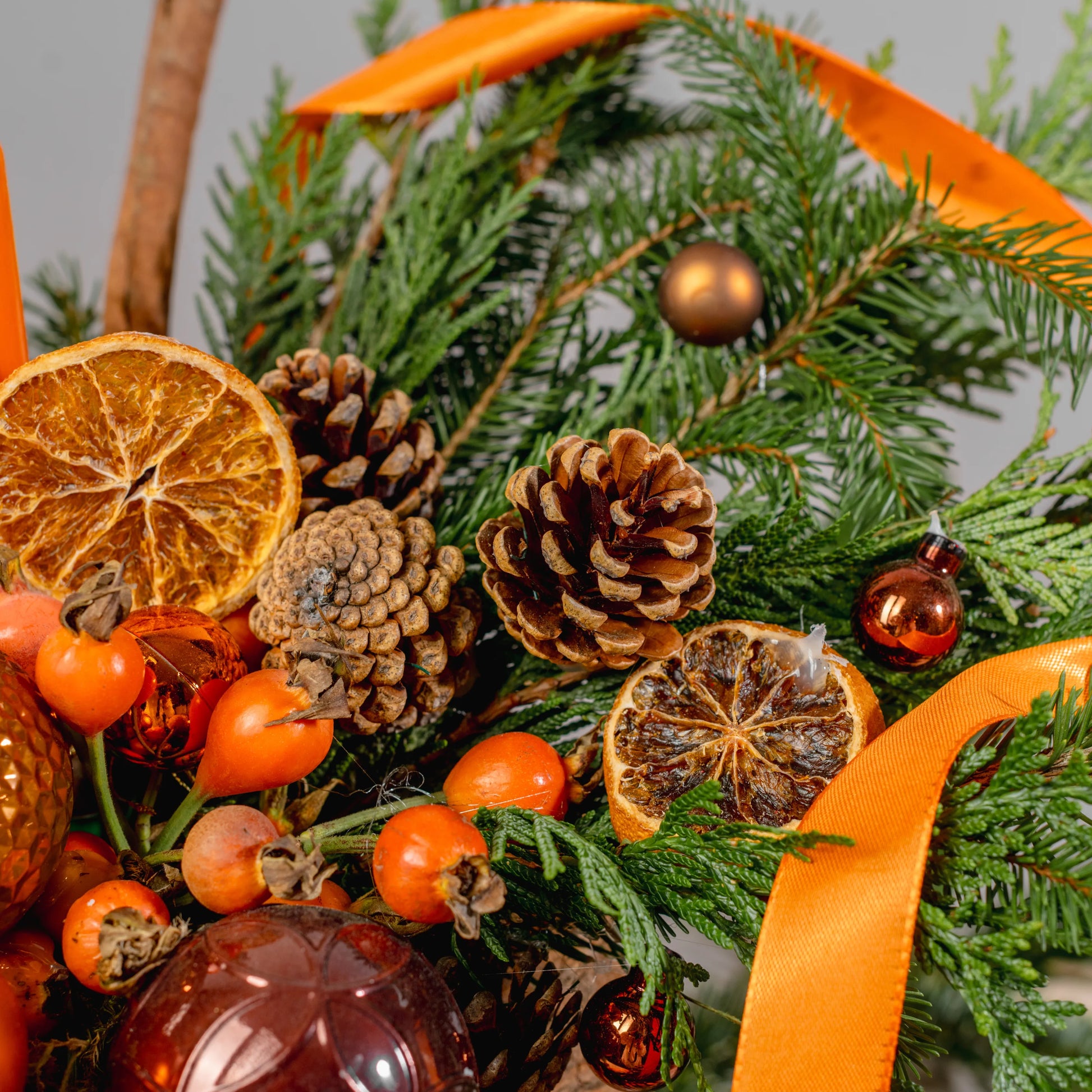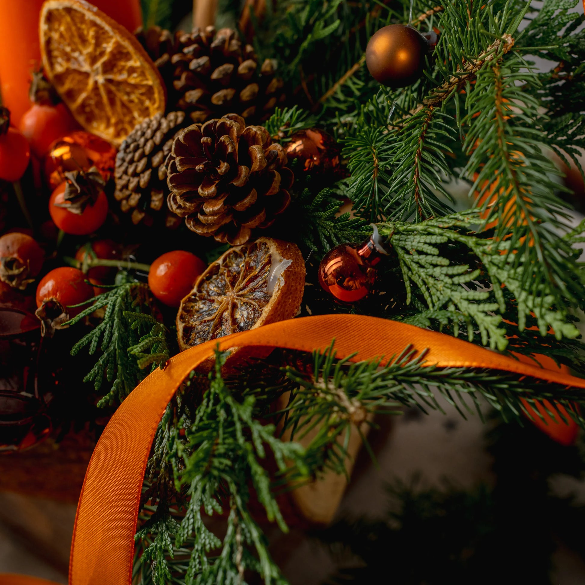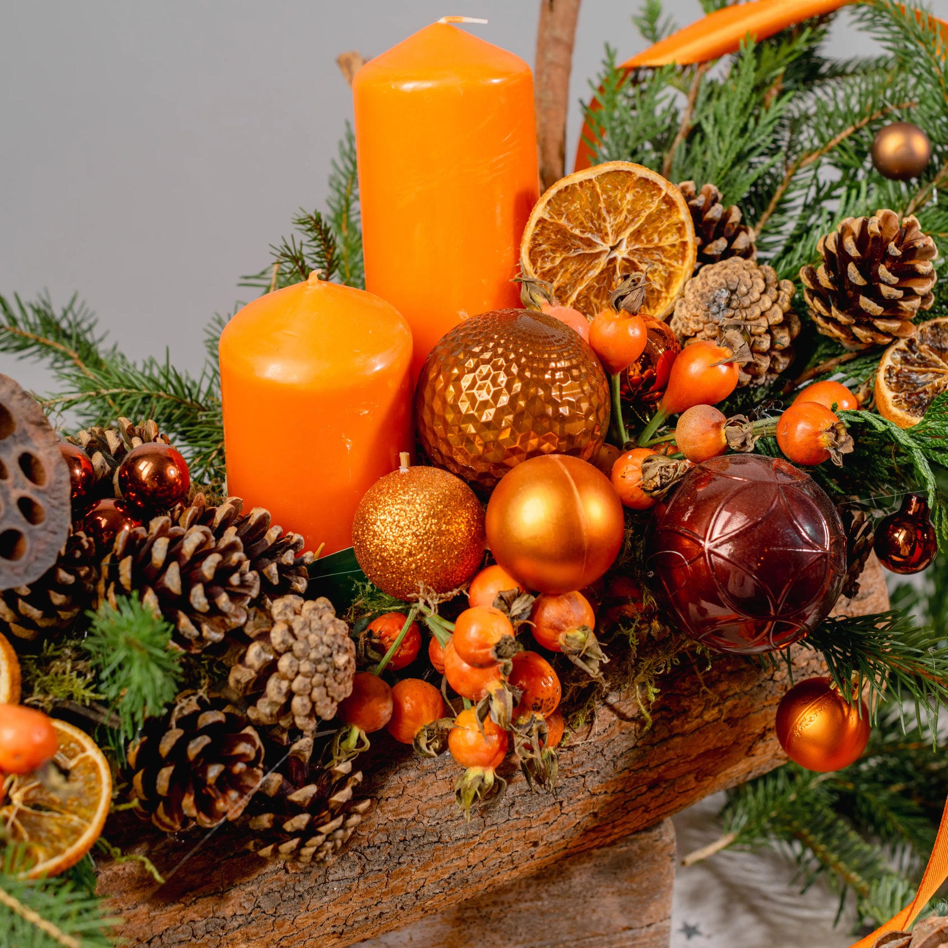 "Natal em Tons de Laranja" é um arranjo que ilumina o ambiente com calor e elegância. Feito num vaso rústico de tronco de árvore natural, o arranjo combina ramos de Nobilis e cipreste com bolas e bagas nos tons vibrantes de laranja e castanho. Musgo natural, pinhas, paus de canela e rodelas de laranja secas completam a composição, criando uma harmonia de aromas e texturas. Ao centro, velas alaranjadas e uma fita de cetim laranja trazem um brilho acolhedor. É a peça perfeita para quem quer um Natal com um toque de cor e aconchego.