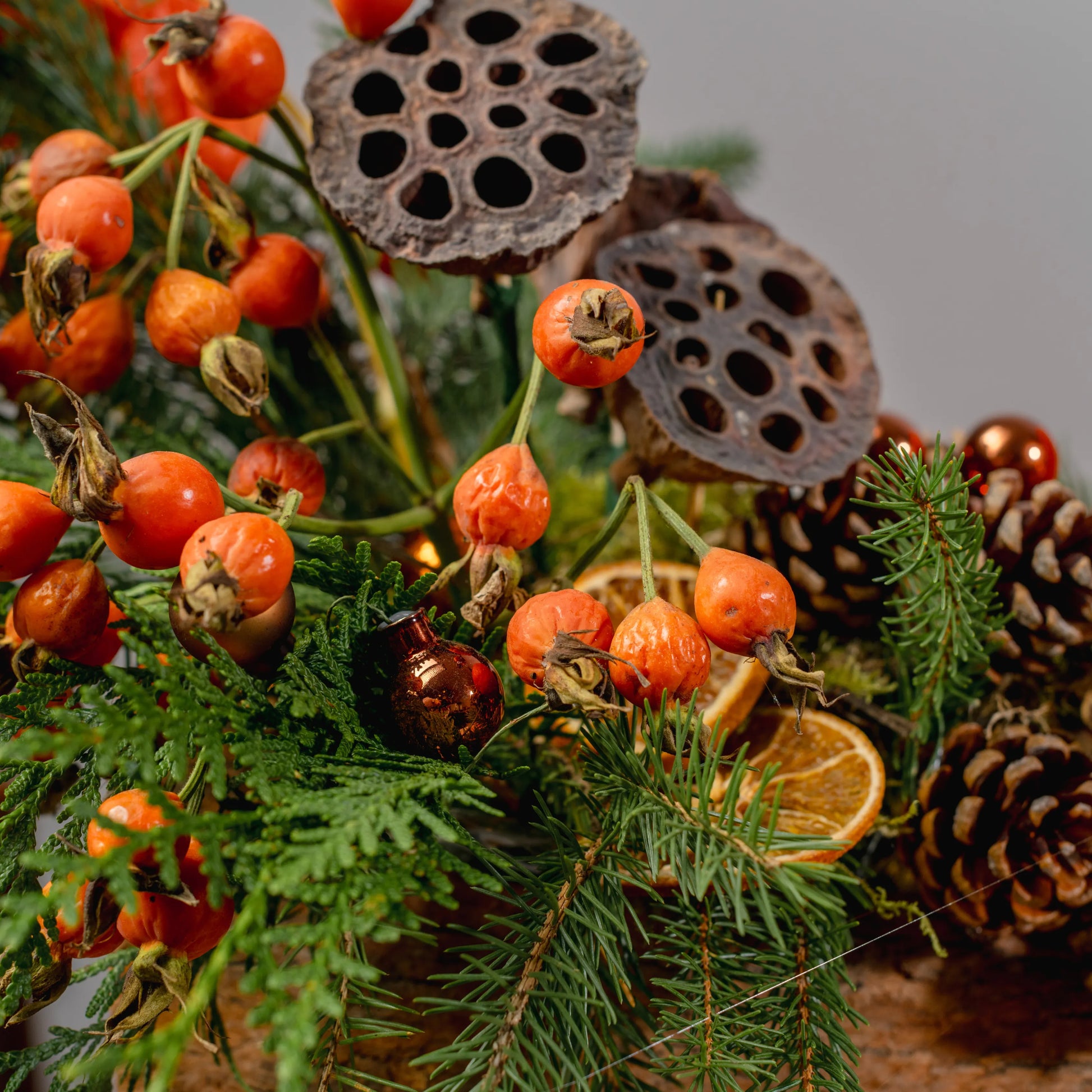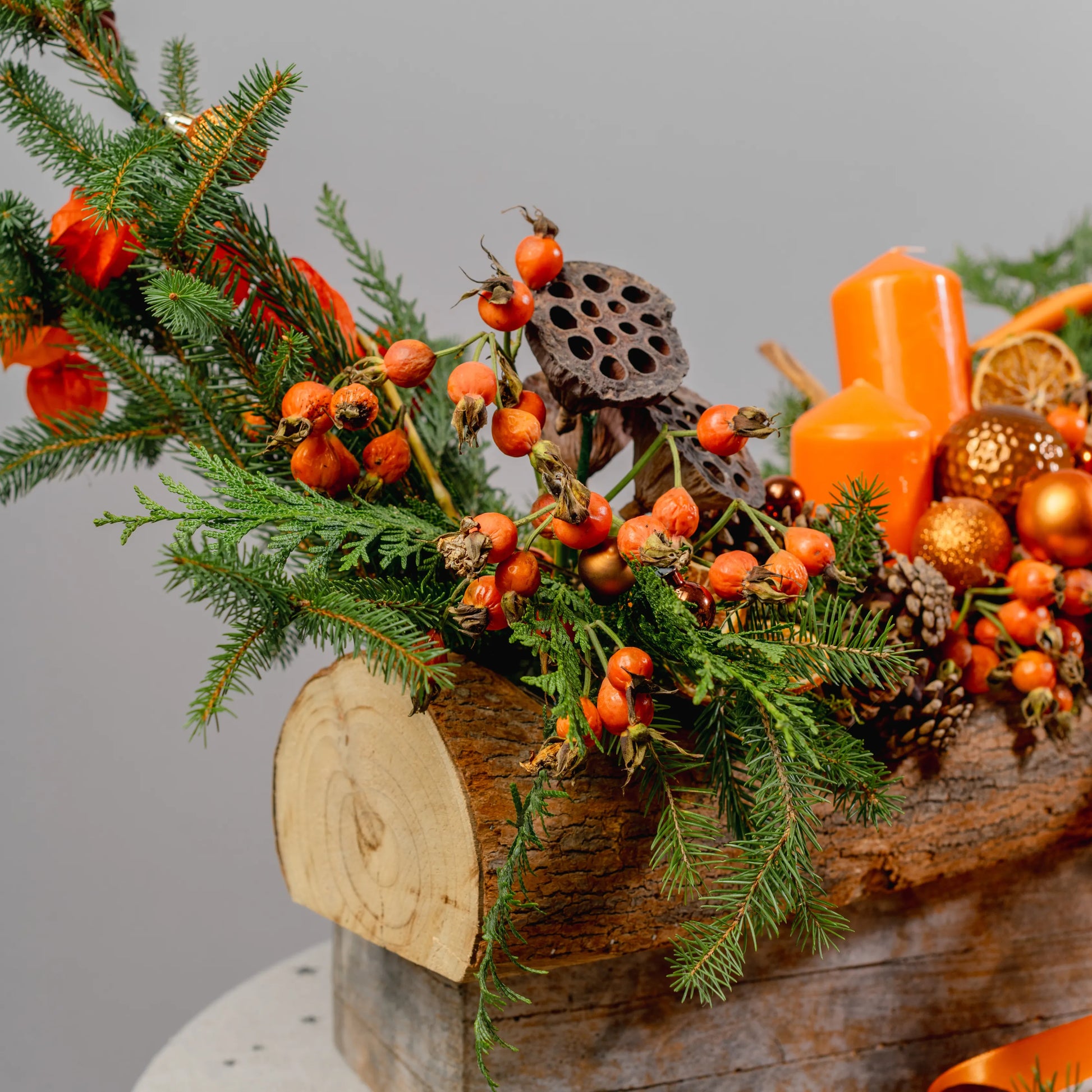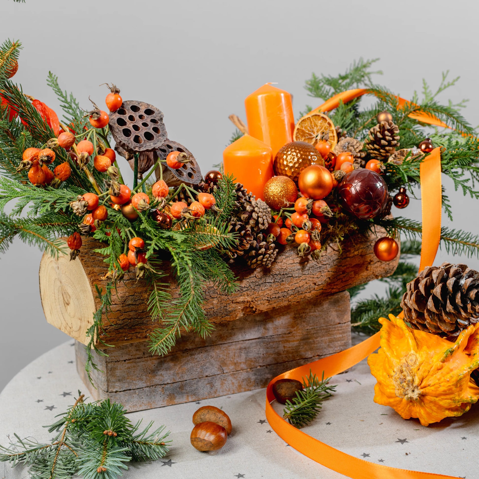 "Natal em Tons de Laranja" é um arranjo que ilumina o ambiente com calor e elegância. Feito num vaso rústico de tronco de árvore natural, o arranjo combina ramos de Nobilis e cipreste com bolas e bagas nos tons vibrantes de laranja e castanho. Musgo natural, pinhas, paus de canela e rodelas de laranja secas completam a composição, criando uma harmonia de aromas e texturas. Ao centro, velas alaranjadas e uma fita de cetim laranja trazem um brilho acolhedor. É a peça perfeita para quem quer um Natal com um toque de cor e aconchego.