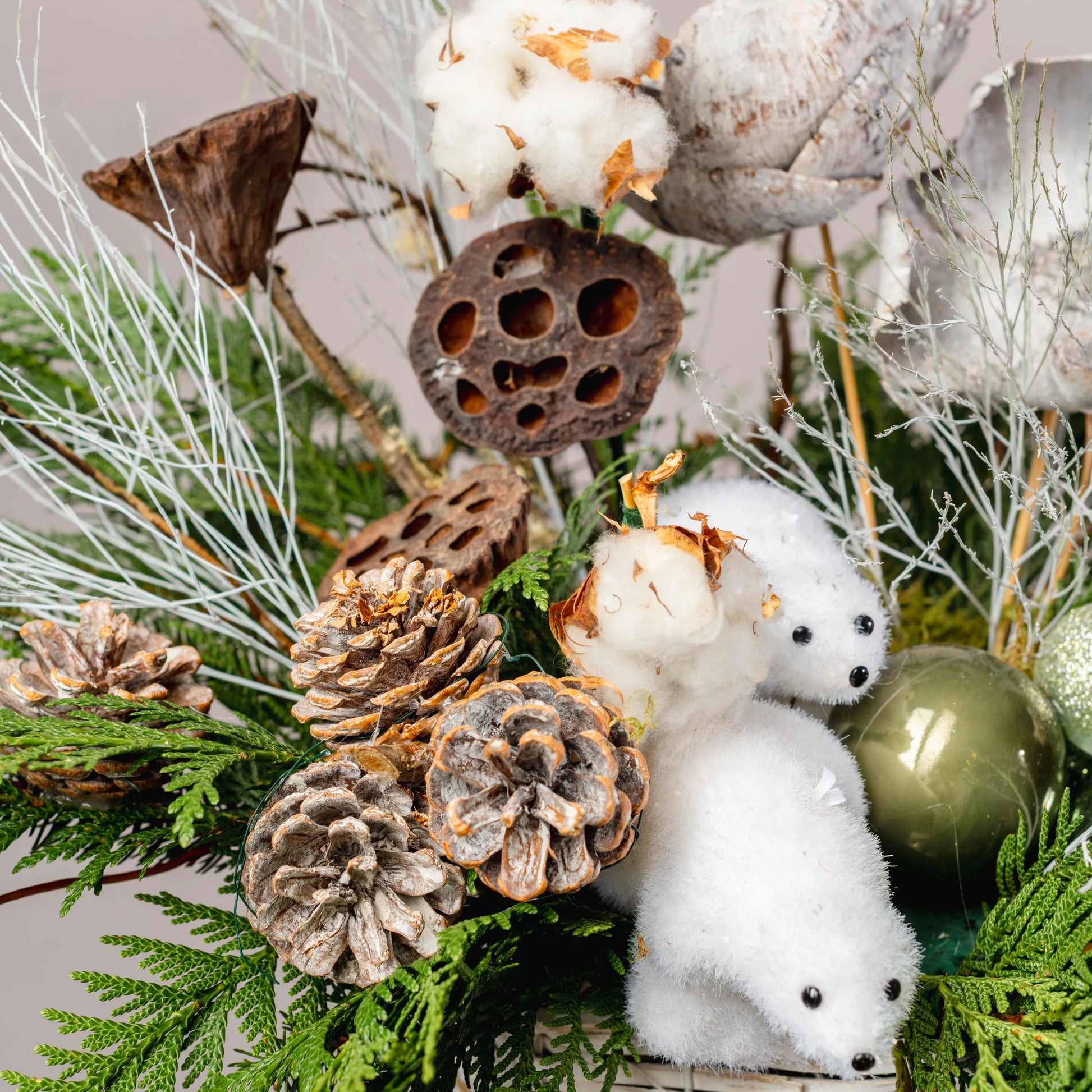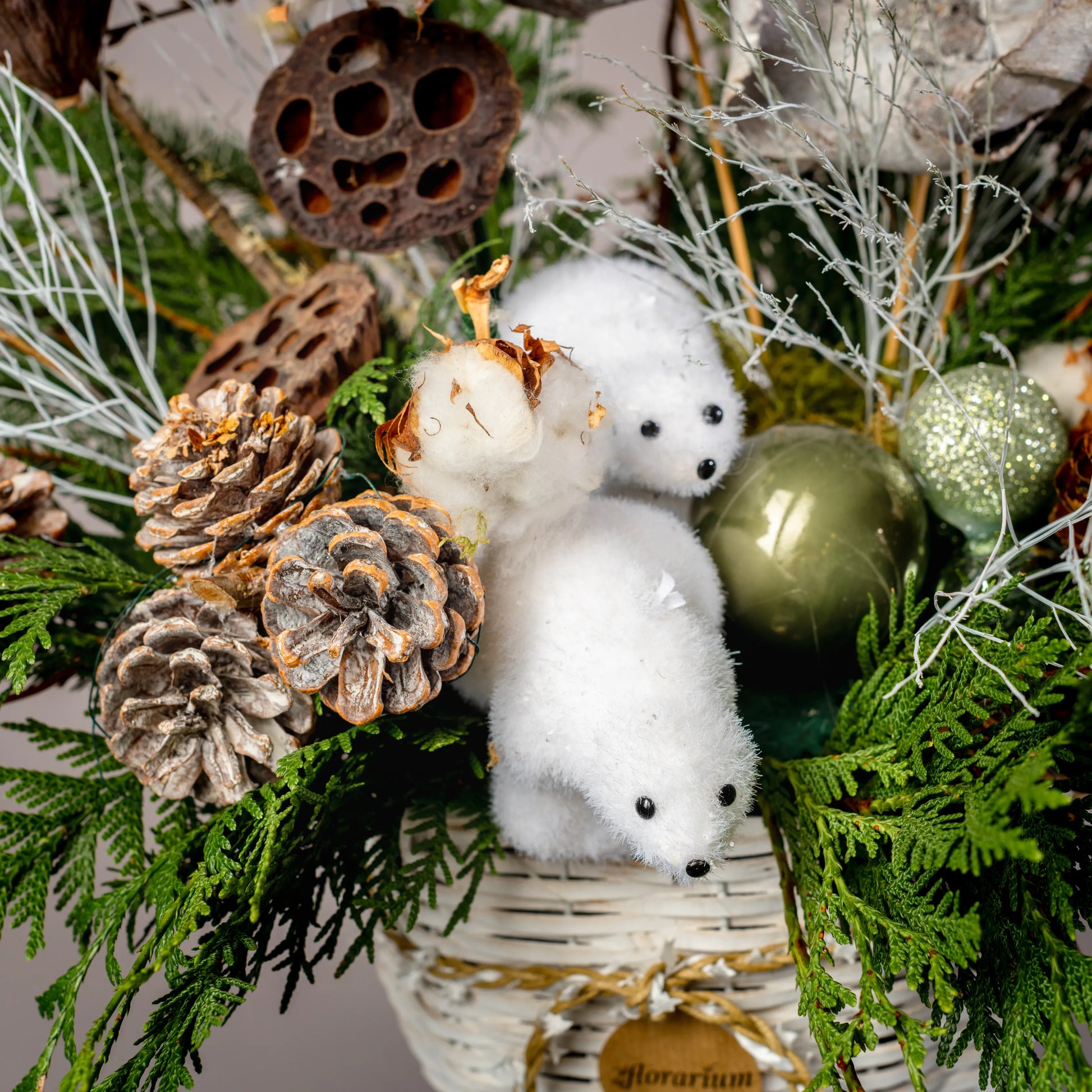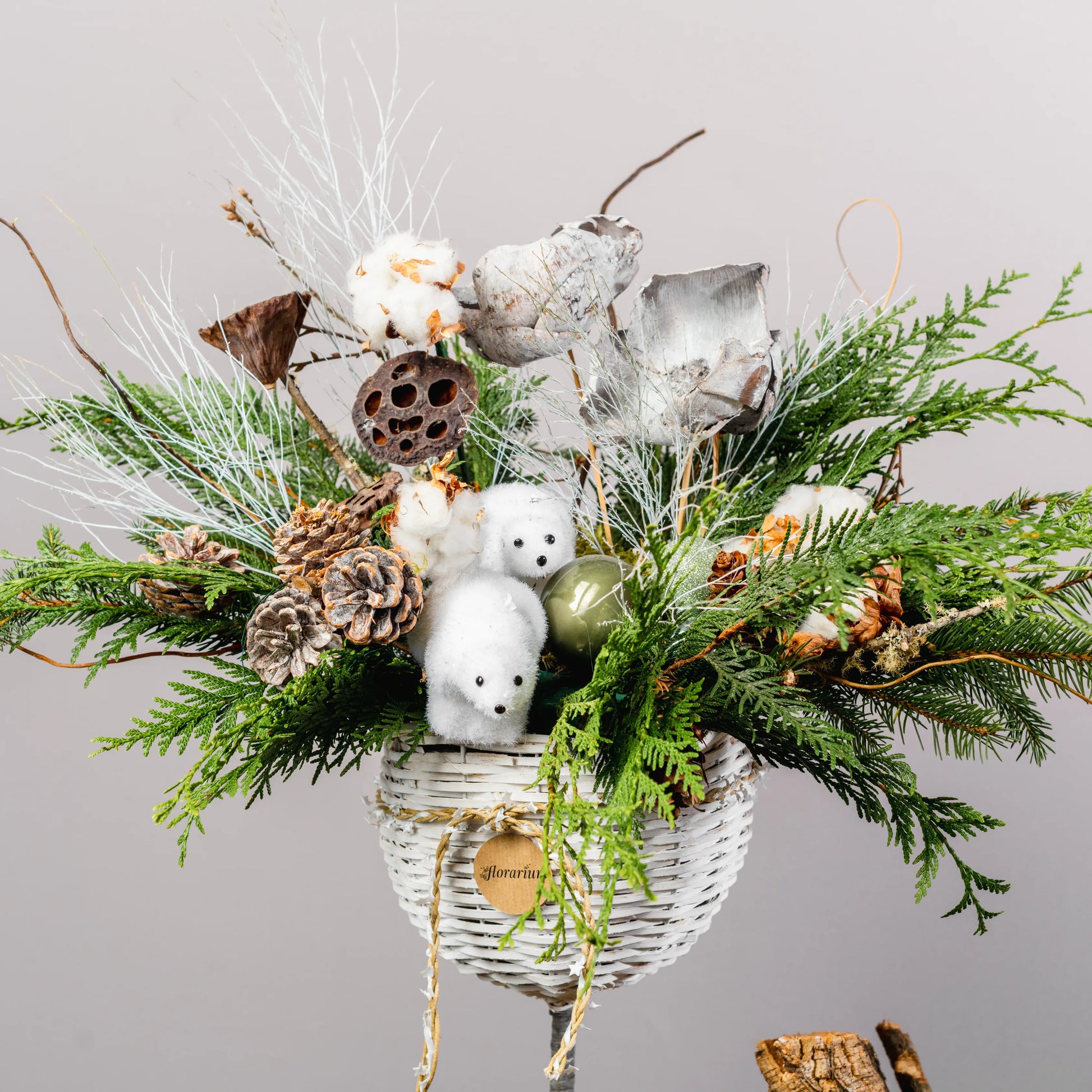 Refúgio Ártico é uma composição natalina que evoca o encanto das paisagens geladas do Norte. Em um elegante vaso de videira pintado de branco e moldado como um copo, ramos de Nobilis e cipreste se misturam com pinhas naturais e branqueadas, criando um cenário de inverno autêntico. As flores feitas de pinhas brancas acrescentam um toque delicado e harmonioso. No centro, dois adoráveis ursos polares repousam, trazendo um charme especial ao arranjo, que é perfeito para aqueles que desejam celebrar o Natal com um toque de natureza ártica e aconchego festivo.