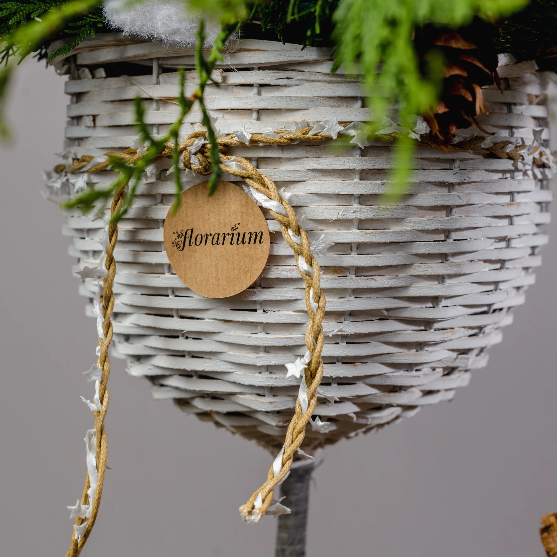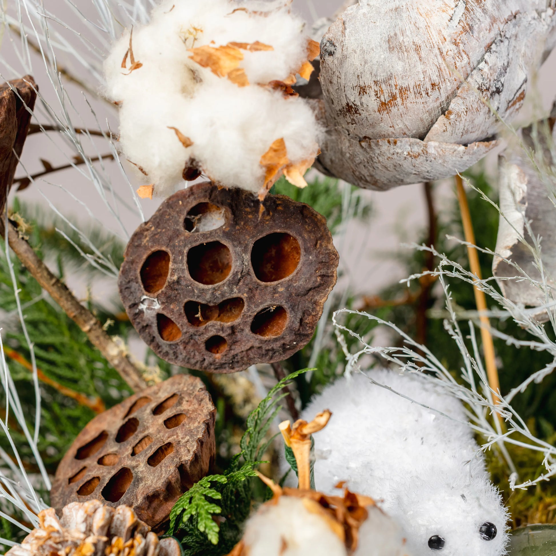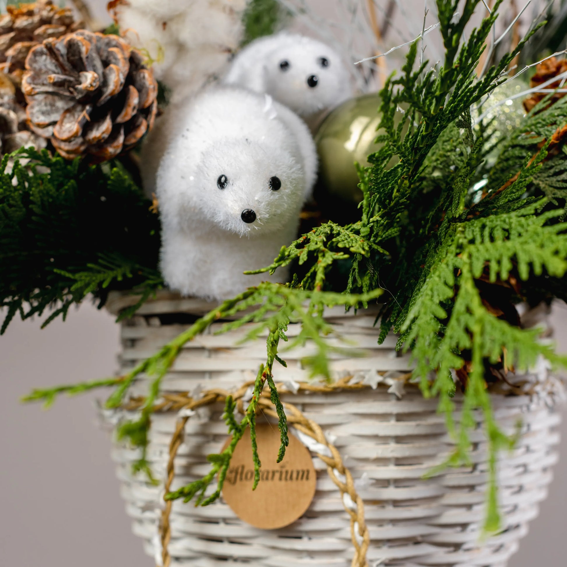 Refúgio Ártico é uma composição natalina que evoca o encanto das paisagens geladas do Norte. Em um elegante vaso de videira pintado de branco e moldado como um copo, ramos de Nobilis e cipreste se misturam com pinhas naturais e branqueadas, criando um cenário de inverno autêntico. As flores feitas de pinhas brancas acrescentam um toque delicado e harmonioso. No centro, dois adoráveis ursos polares repousam, trazendo um charme especial ao arranjo, que é perfeito para aqueles que desejam celebrar o Natal com um toque de natureza ártica e aconchego festivo.