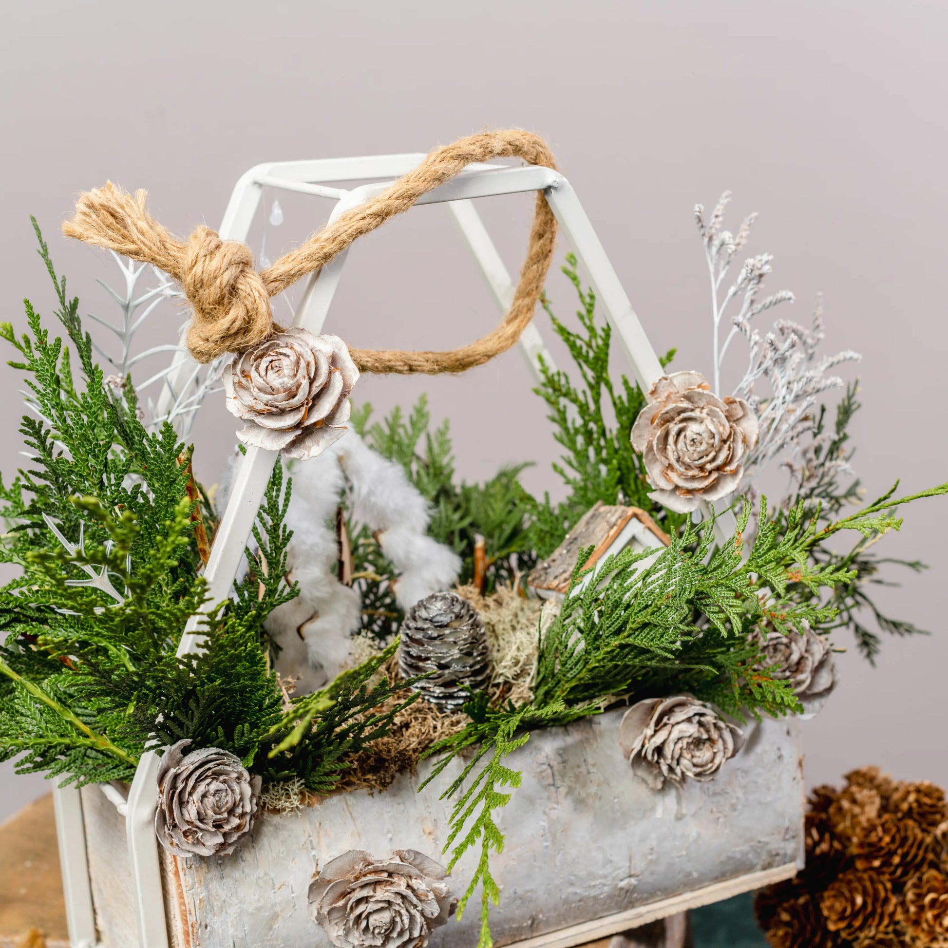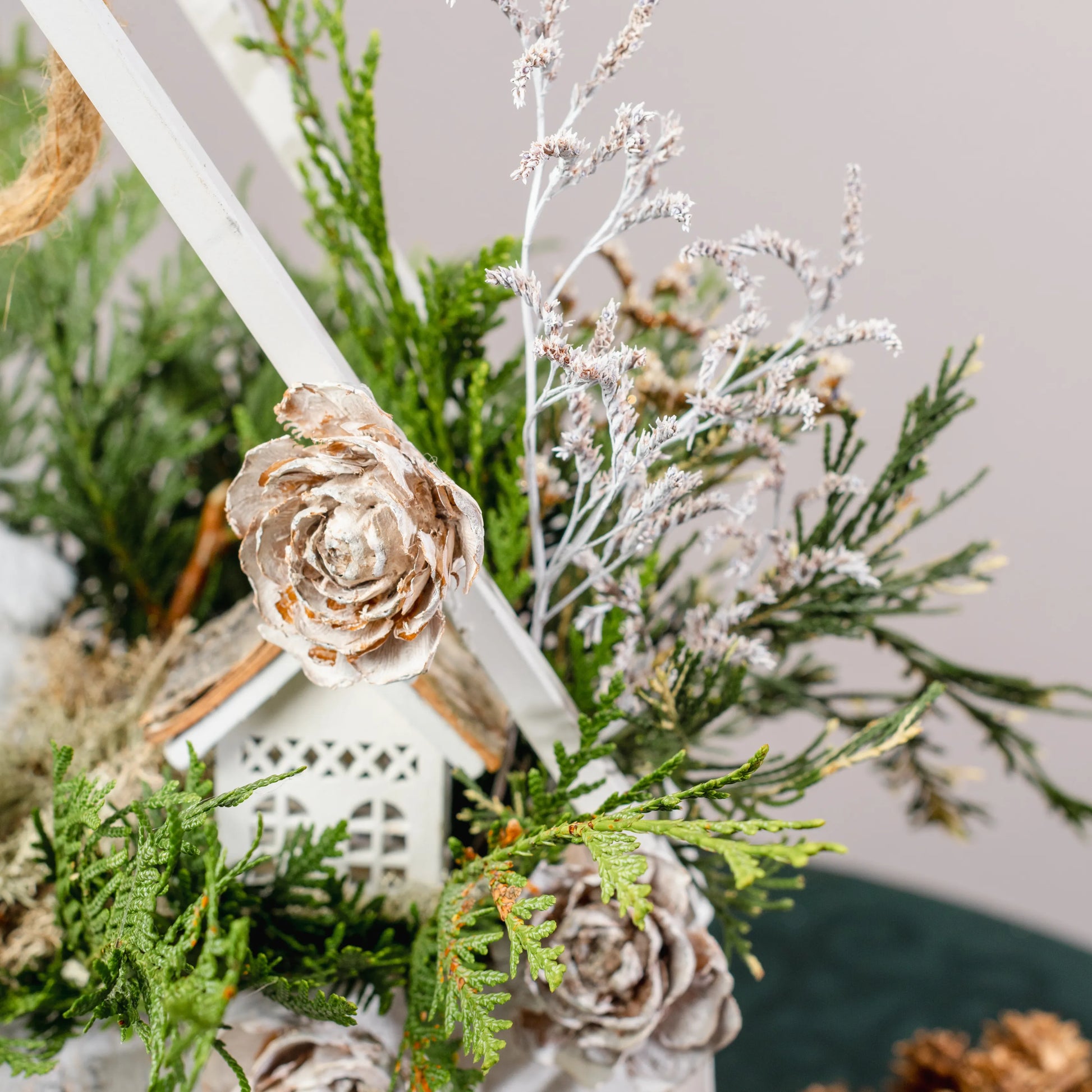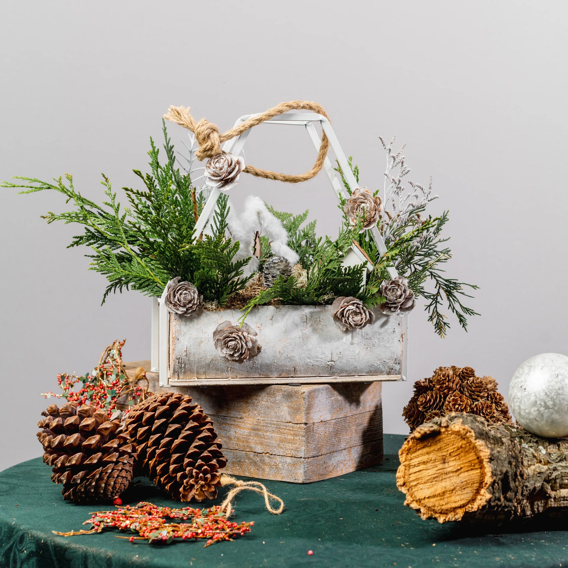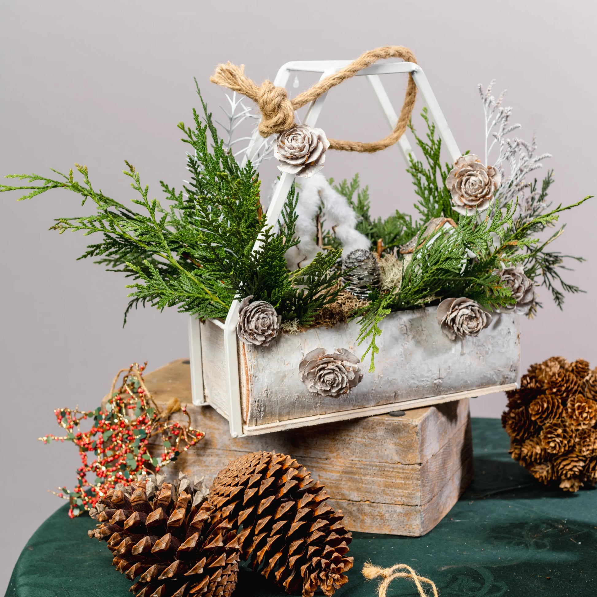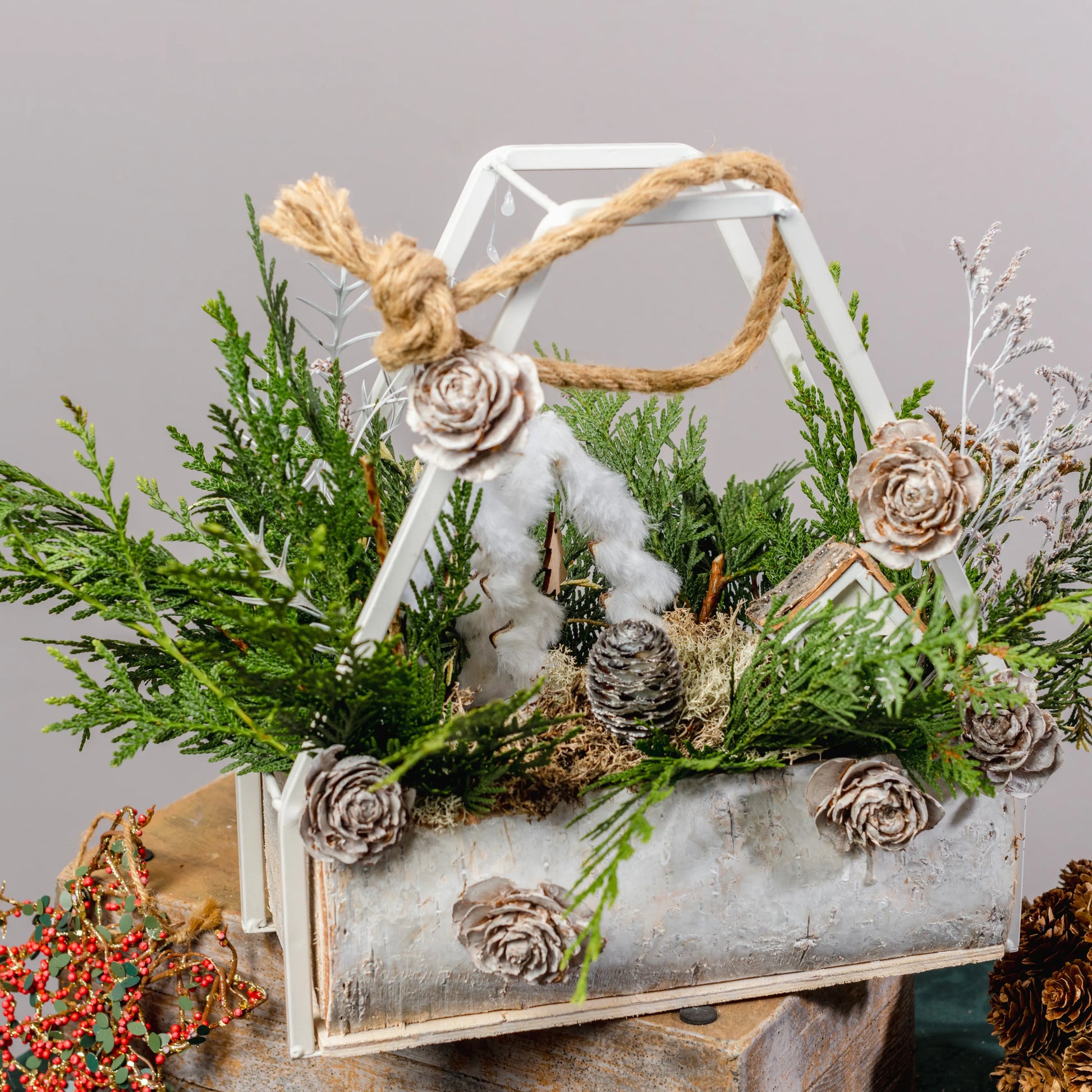 Vila Nevada é um refúgio encantador em meio à tranquilidade da natureza. Este arranjo, em uma caixa de ferro branco com inserções de casca de bétula que lembram um cesto rústico, traz uma atmosfera de inverno sereno e acolhedor. Com ramos de cipreste e pinhas branqueadas em forma de delicadas flores, ele cria um cenário que evoca florestas cobertas de neve. No centro, pequenos pinheiros de Natal brancos e casas cobertas de neve, feitas de materiais naturais, completam a paisagem, trazendo o aconchego de uma vila invernal. Vila Nevada é ideal para criar um ambiente de paz e beleza natural durante as festas natalinas.