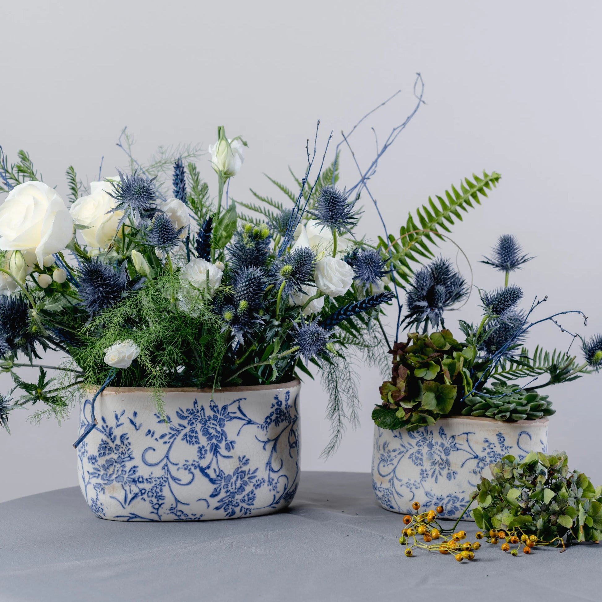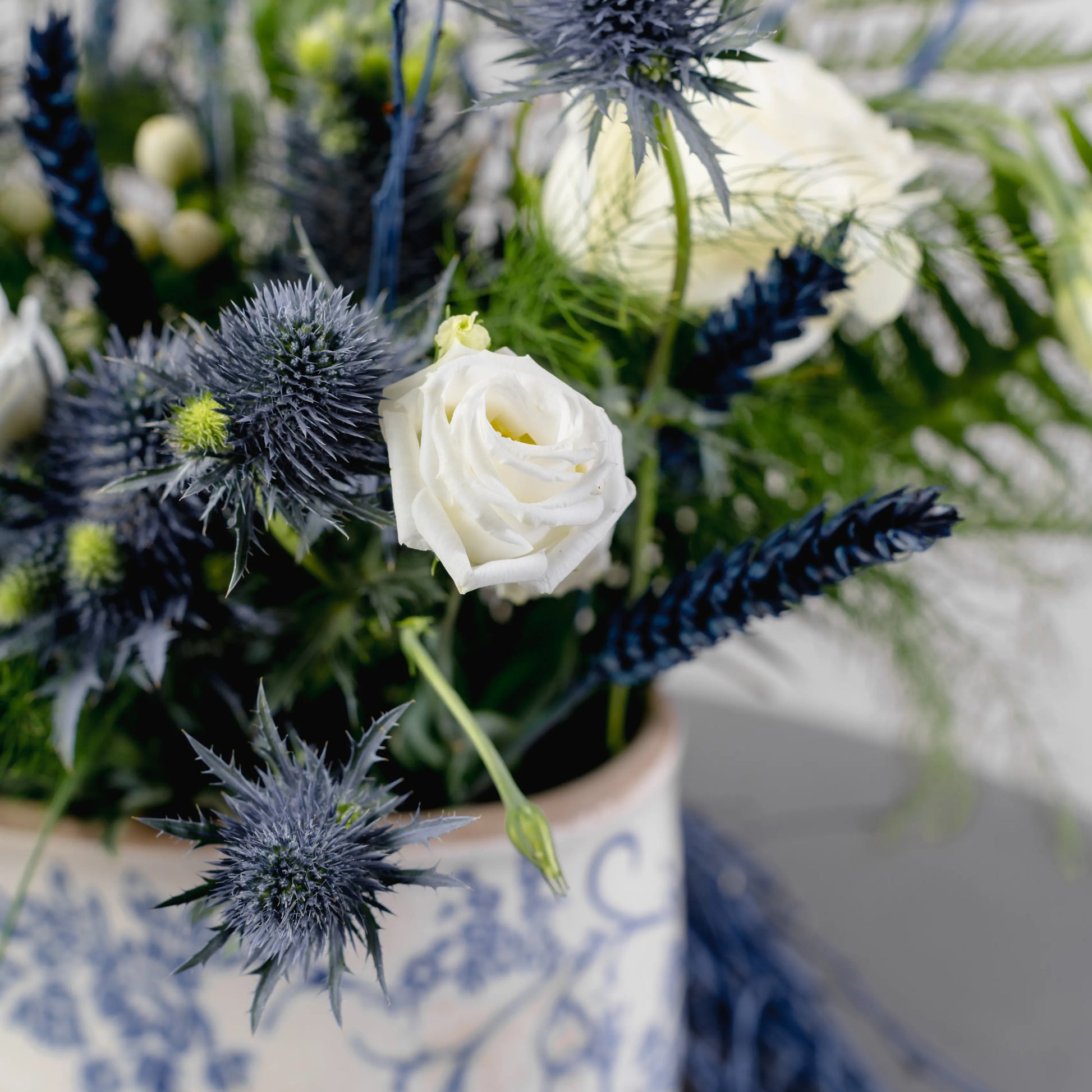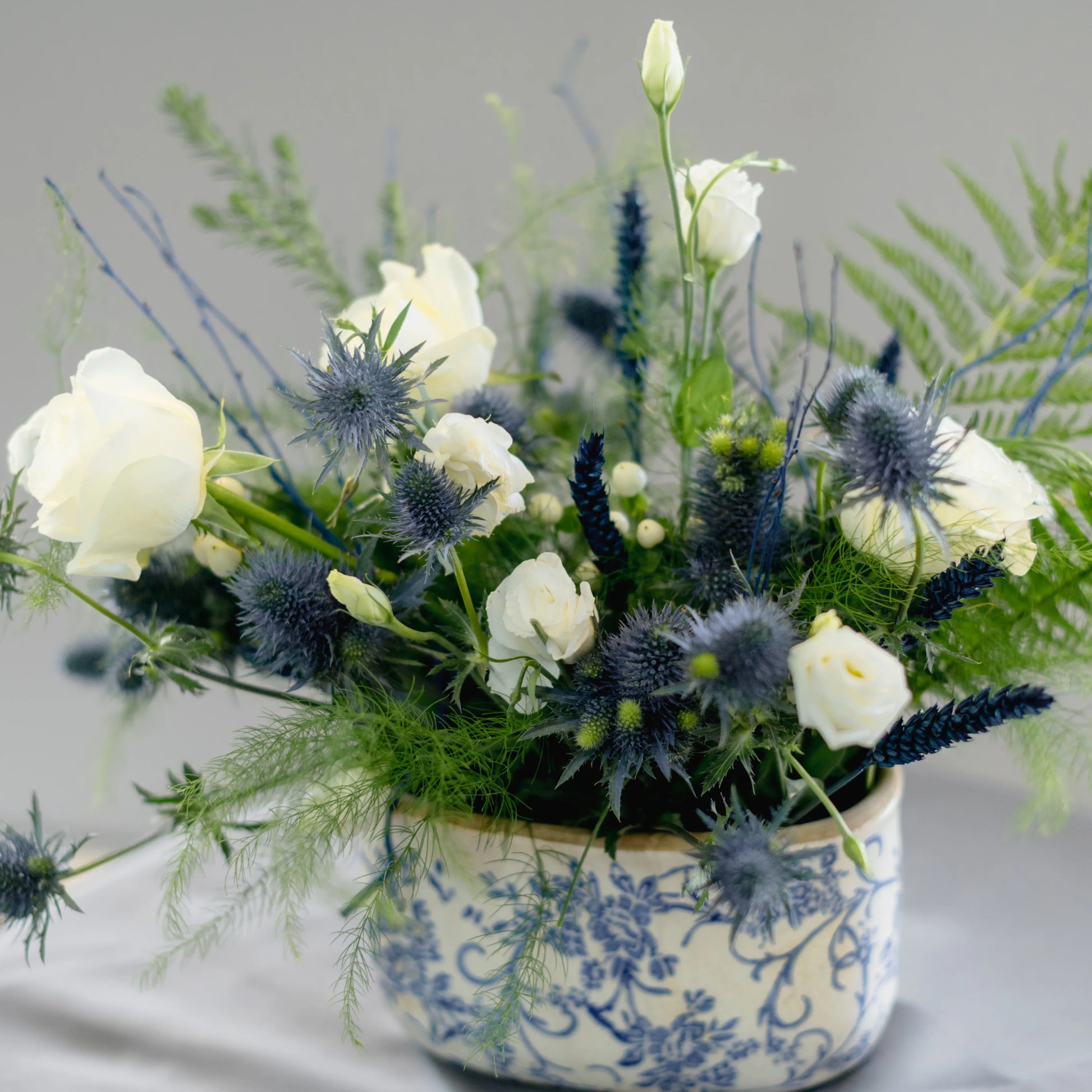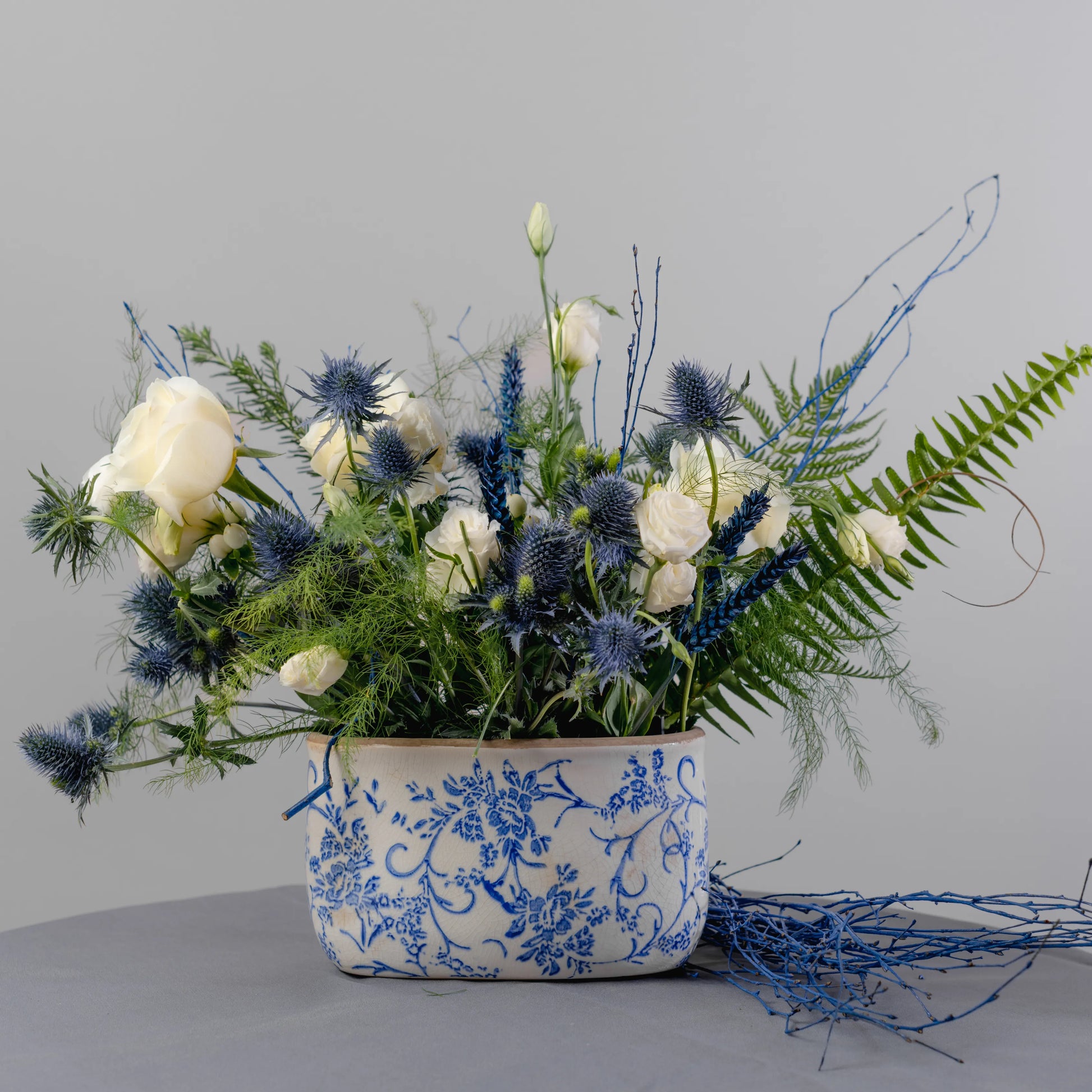 Num vaso vintage de cor branco sujo, adornado com flores azuis e com um aspecto envelhecido, este arranjo captura a serenidade e o charme do inverno. Rosas e lisianthus brancos brilham como flocos de neve frescos, enquanto o erigyum, com seu tom azul, evoca a beleza dos dias frios. Ramos de bétula pintados em azul e espiguetas de um azul-escuro adicionam profundidade e contraste, criando uma sensação de frio delicado. Folhas verdes de diferentes formas complementam a composição, dando um toque natural e fresco. "Brisa do Inverno" é um arranjo que celebra a beleza do inverno de forma delicada e nostálgica, com um toque de elegância vintage.
