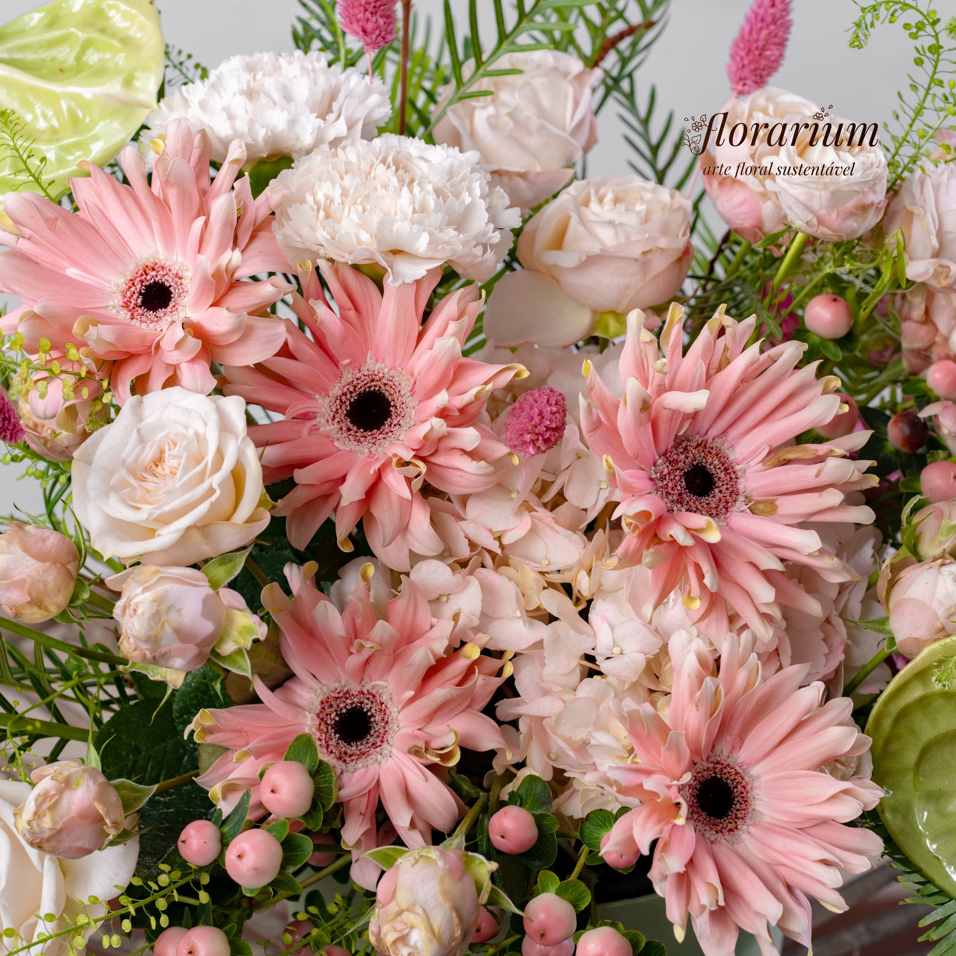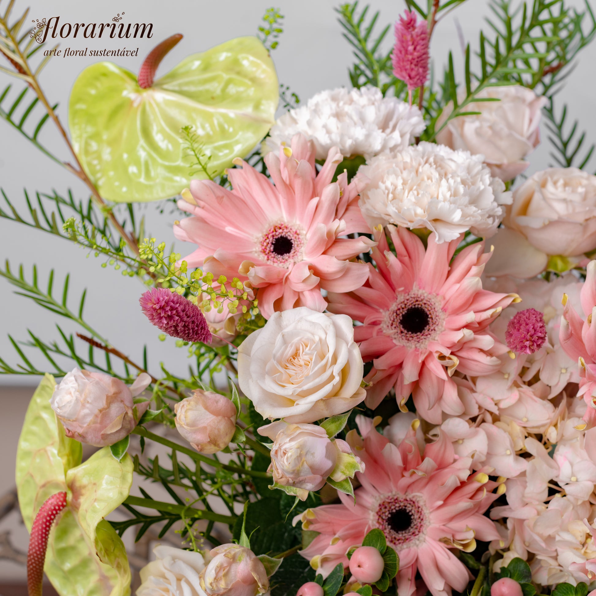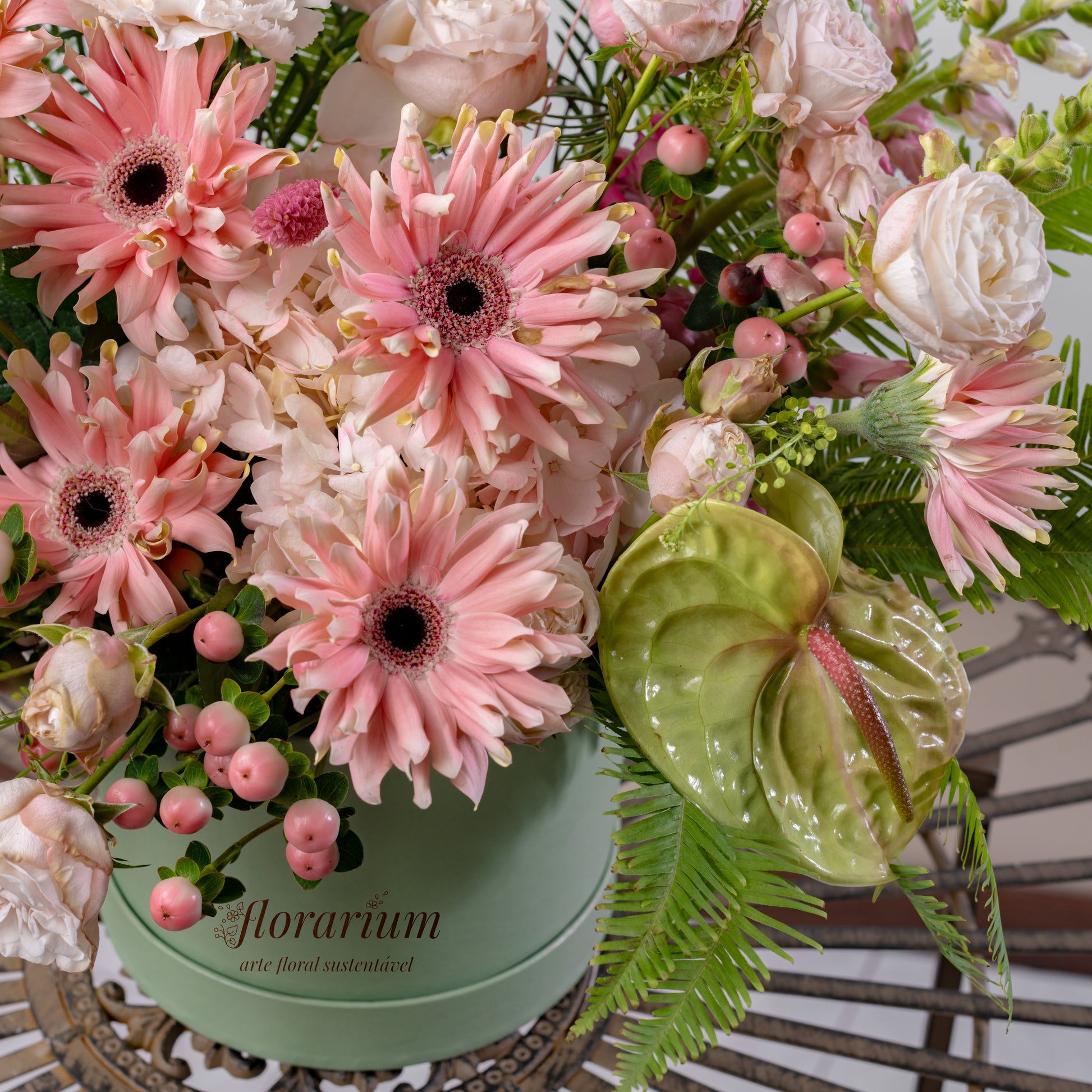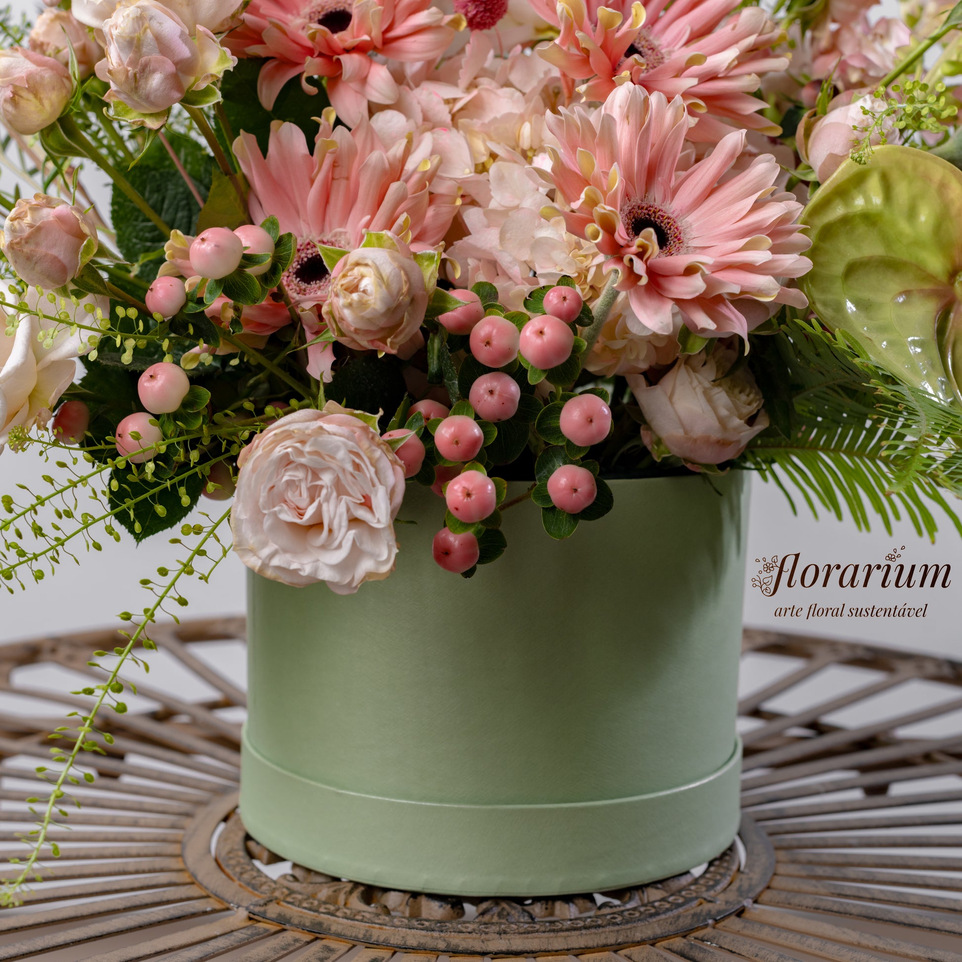 Não há melhor forma de expressar ternura e carinho do que com flores suaves e delicadas. "Caixa de Ternura" é um arranjo floral que transmite afeto, admiração e doçura. As gérberas e hortênsias rosa irradiam leveza e alegria, enquanto as rosas ramificadas e os raminhos rosa acrescentam um toque romântico. O encanto dos antúrios verdes com o centro rosa dá a este arranjo uma elegância especial, tornando-o a escolha perfeita para celebrar sentimentos puros e genuínos.