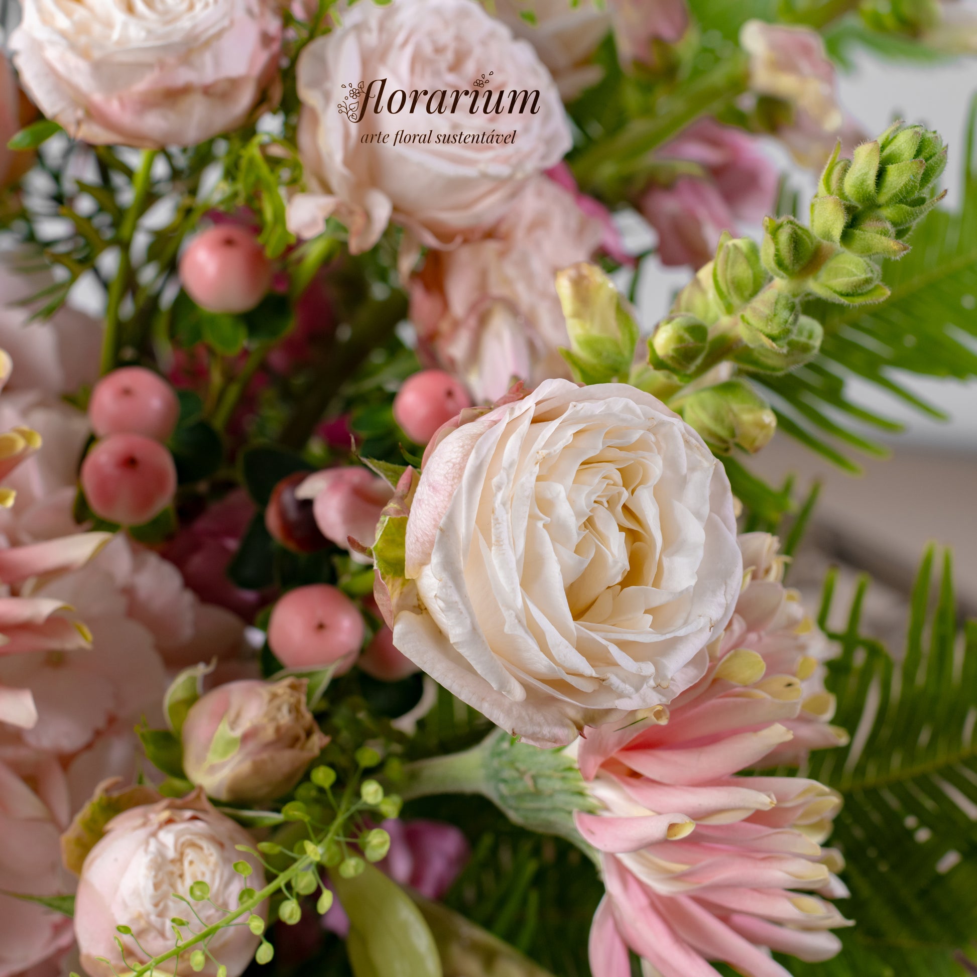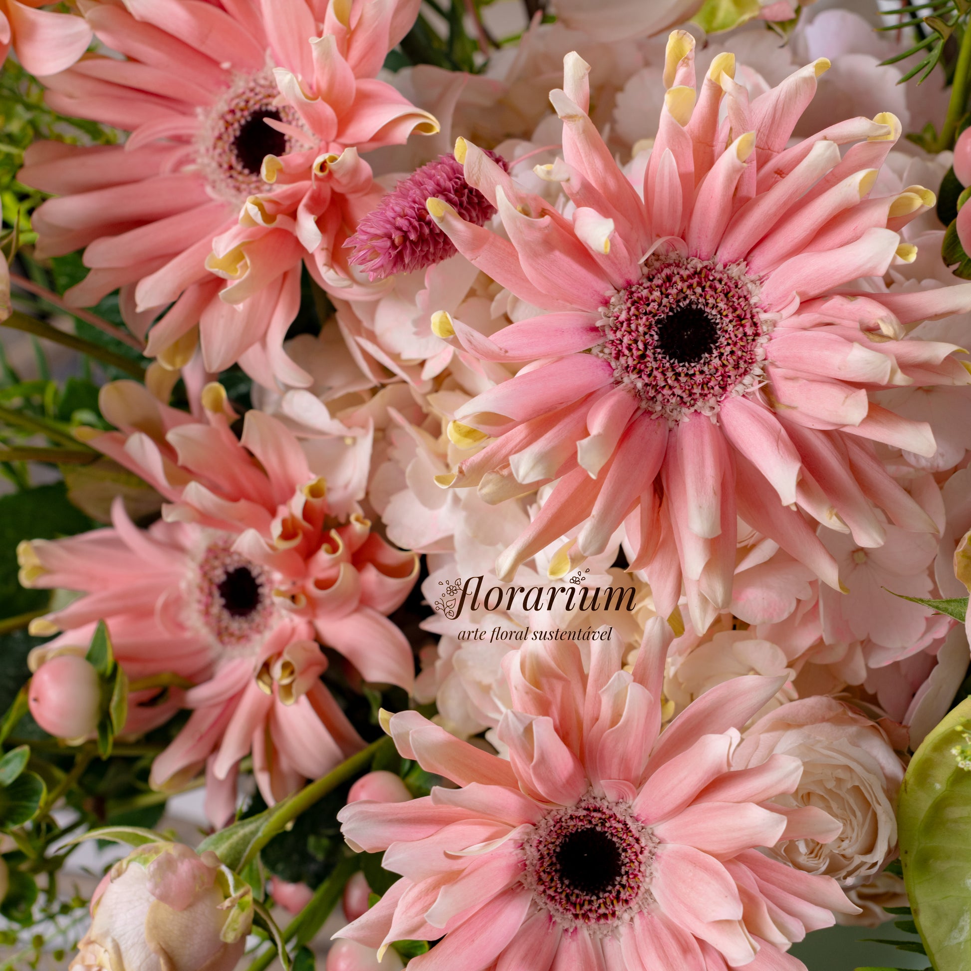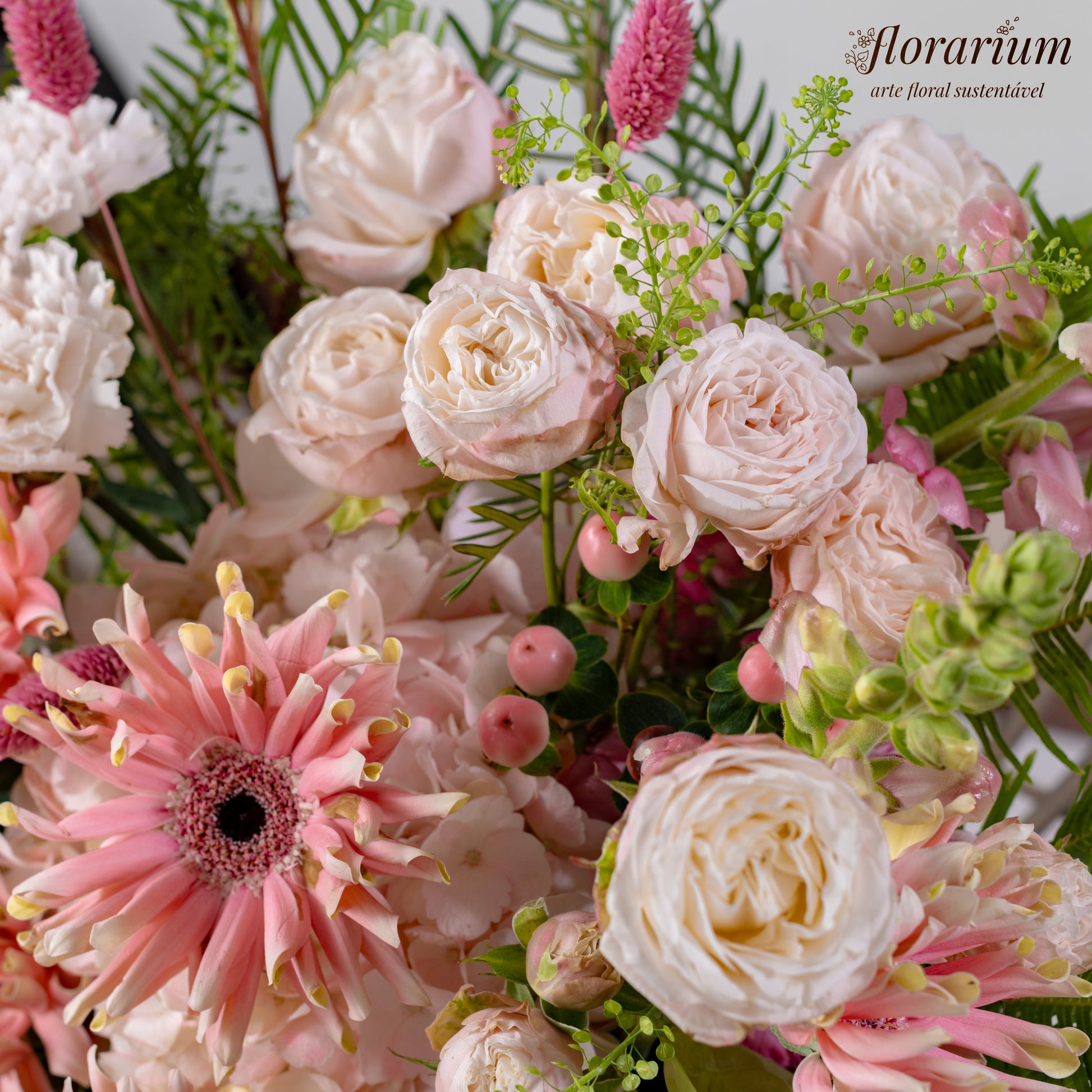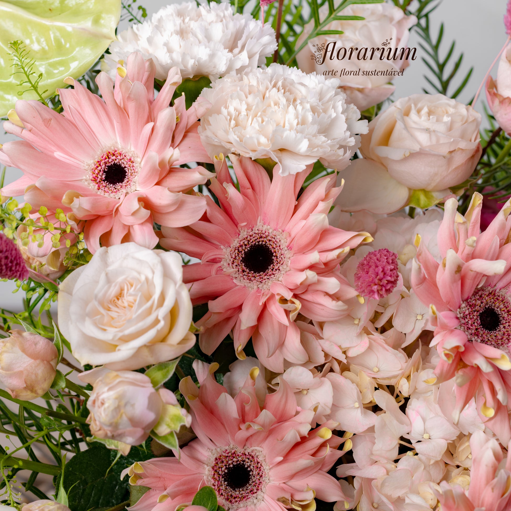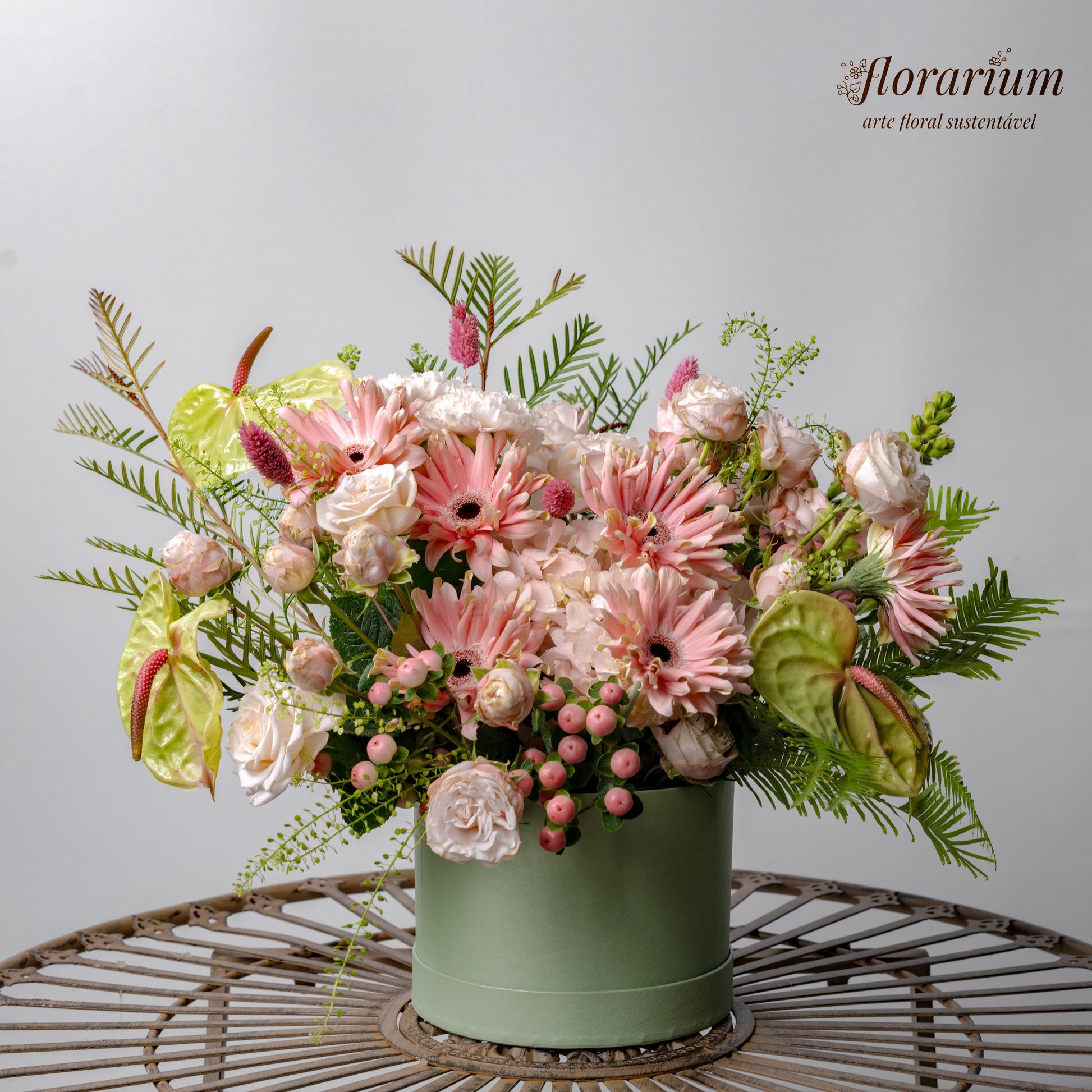 Não há melhor forma de expressar ternura e carinho do que com flores suaves e delicadas. "Caixa de Ternura" é um arranjo floral que transmite afeto, admiração e doçura. As gérberas e hortênsias rosa irradiam leveza e alegria, enquanto as rosas ramificadas e os raminhos rosa acrescentam um toque romântico. O encanto dos antúrios verdes com o centro rosa dá a este arranjo uma elegância especial, tornando-o a escolha perfeita para celebrar sentimentos puros e genuínos.