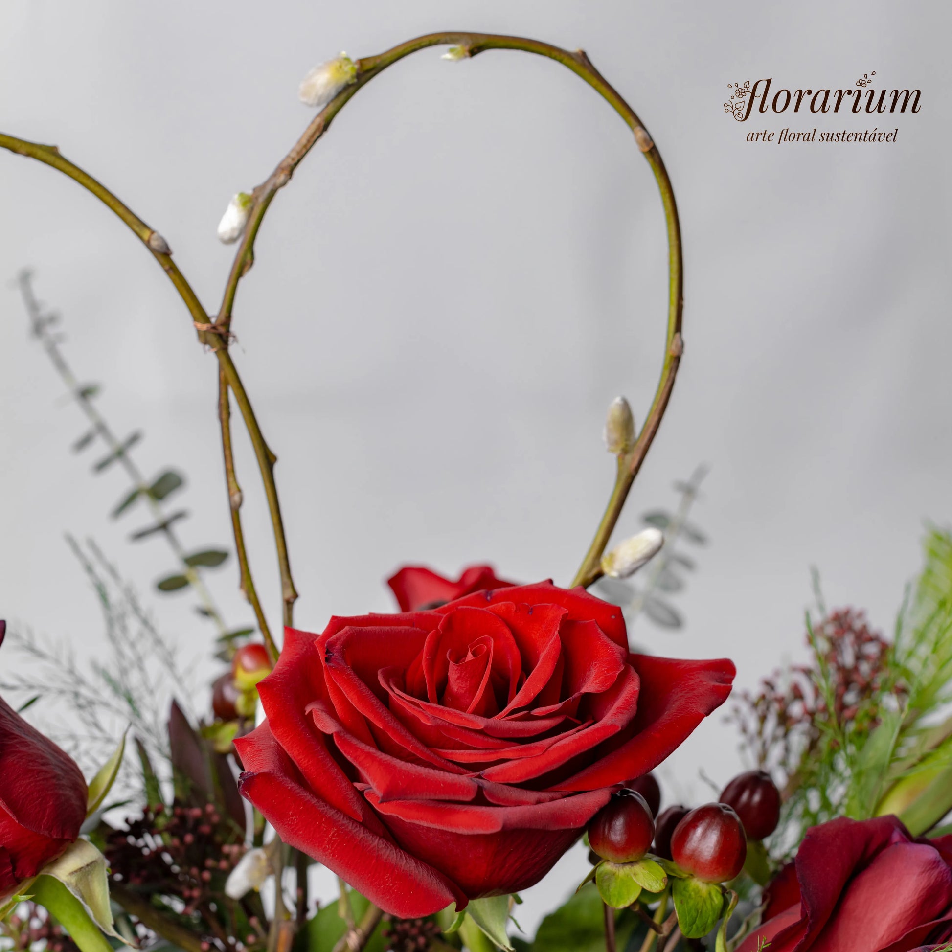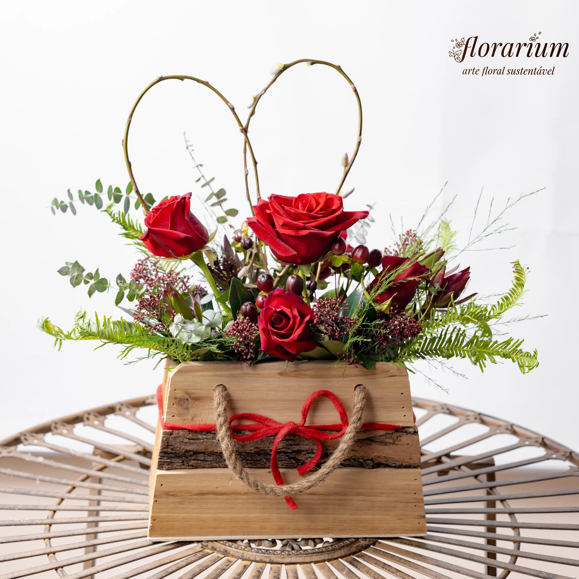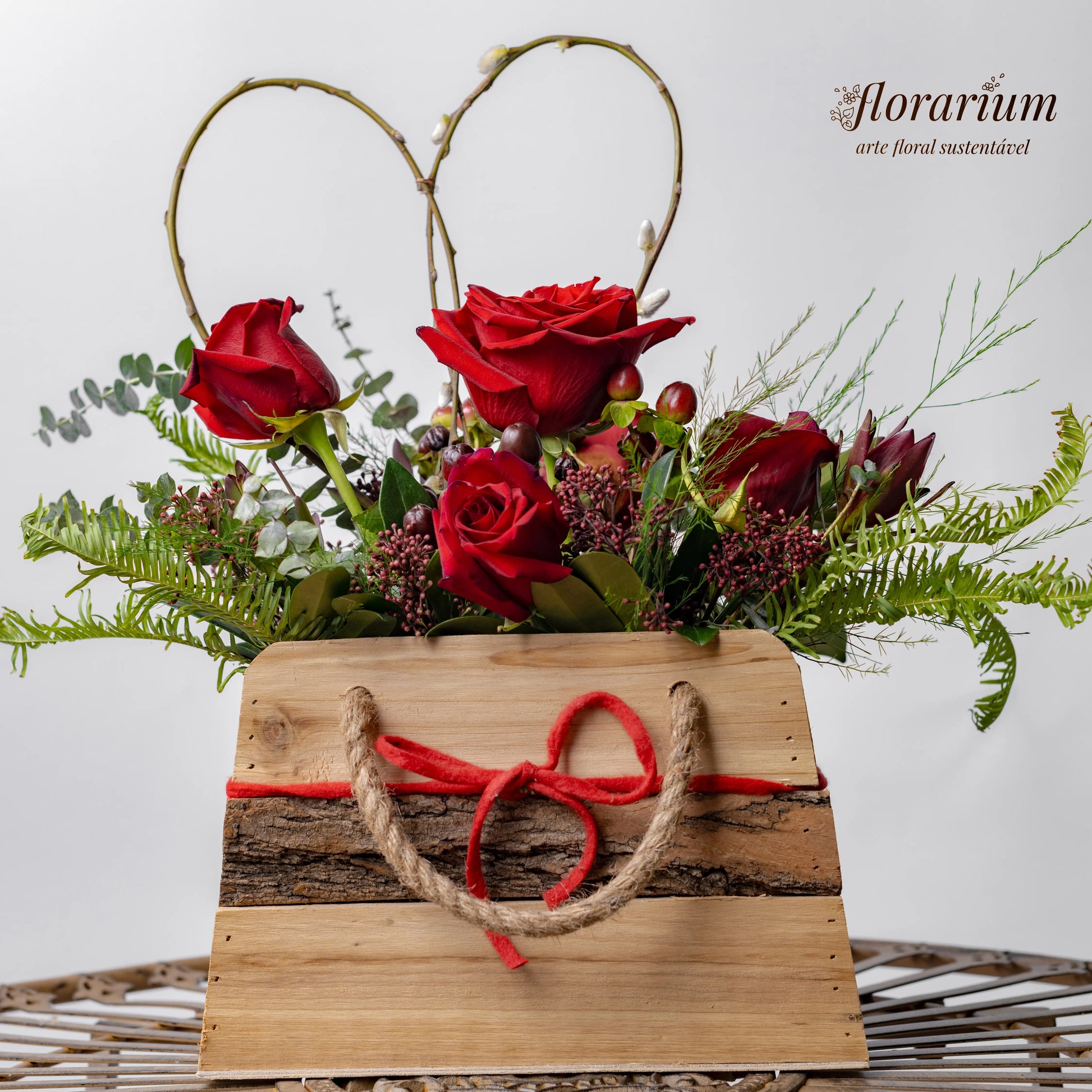 Como uma carteira que guarda memórias preciosas, este arranjo floral é um símbolo do amor que se leva para toda a vida. As rosas vermelhas expressam paixão, as bagas vermelhas trazem um toque vibrante de romantismo, e o eucalipto acrescenta frescura e leveza. Uma declaração de amor elegante e cheia de significado.