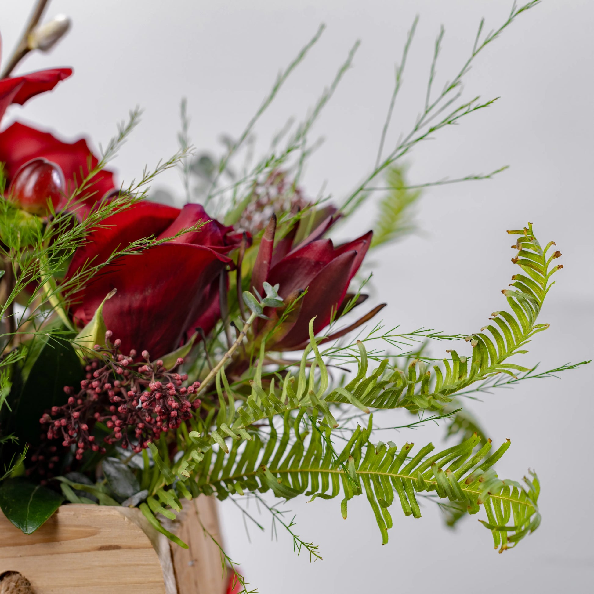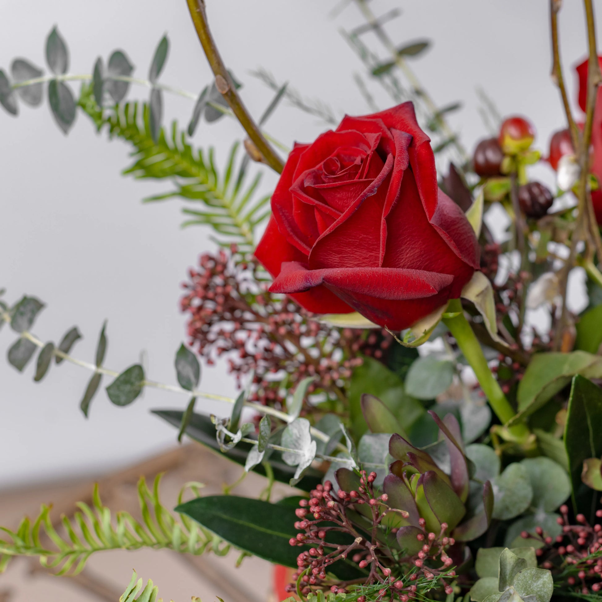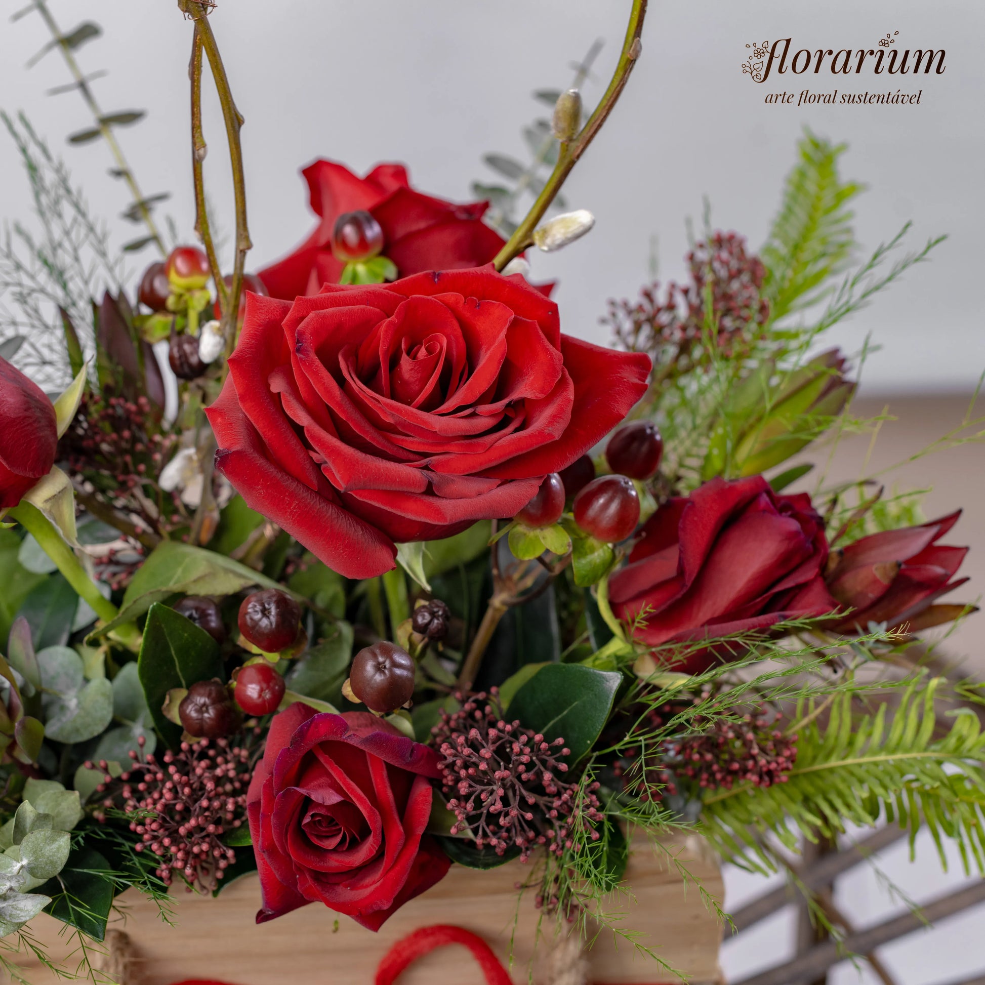 Como uma carteira que guarda memórias preciosas, este arranjo floral é um símbolo do amor que se leva para toda a vida. As rosas vermelhas expressam paixão, as bagas vermelhas trazem um toque vibrante de romantismo, e o eucalipto acrescenta frescura e leveza. Uma declaração de amor elegante e cheia de significado.