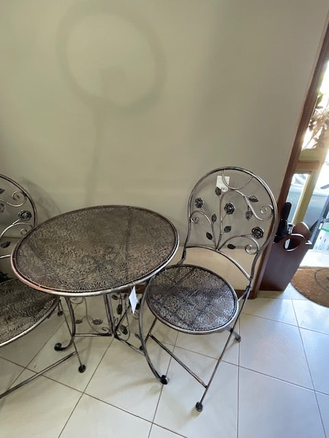 Dê um toque romântico e encantador ao seu espaço exterior com este elegante conjunto de jardim em ferro forjado. Composto por uma mesa redonda e duas cadeiras, cada peça é trabalhada com delicados detalhes florais em relevo, num acabamento vintage que evoca a beleza dos jardins franceses.