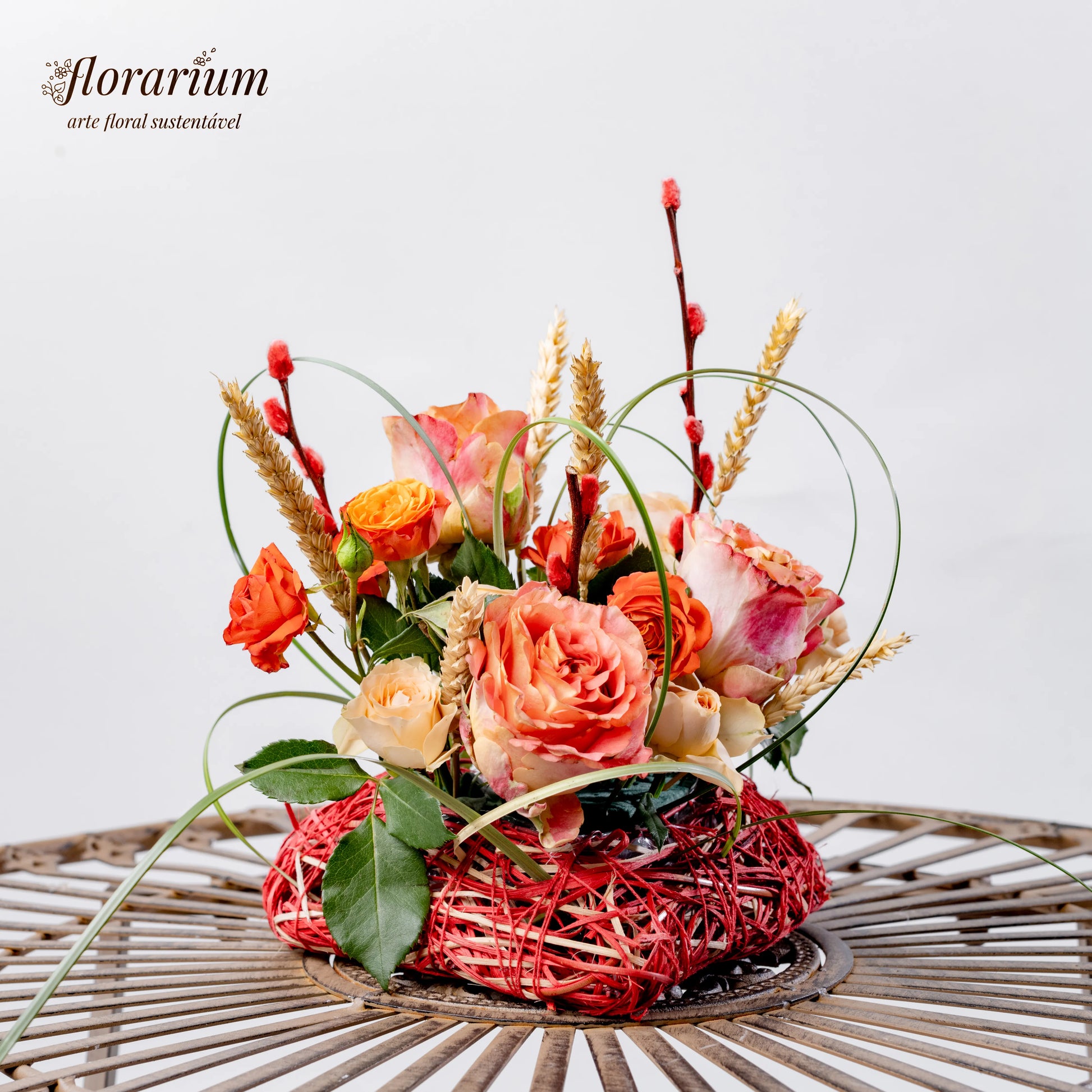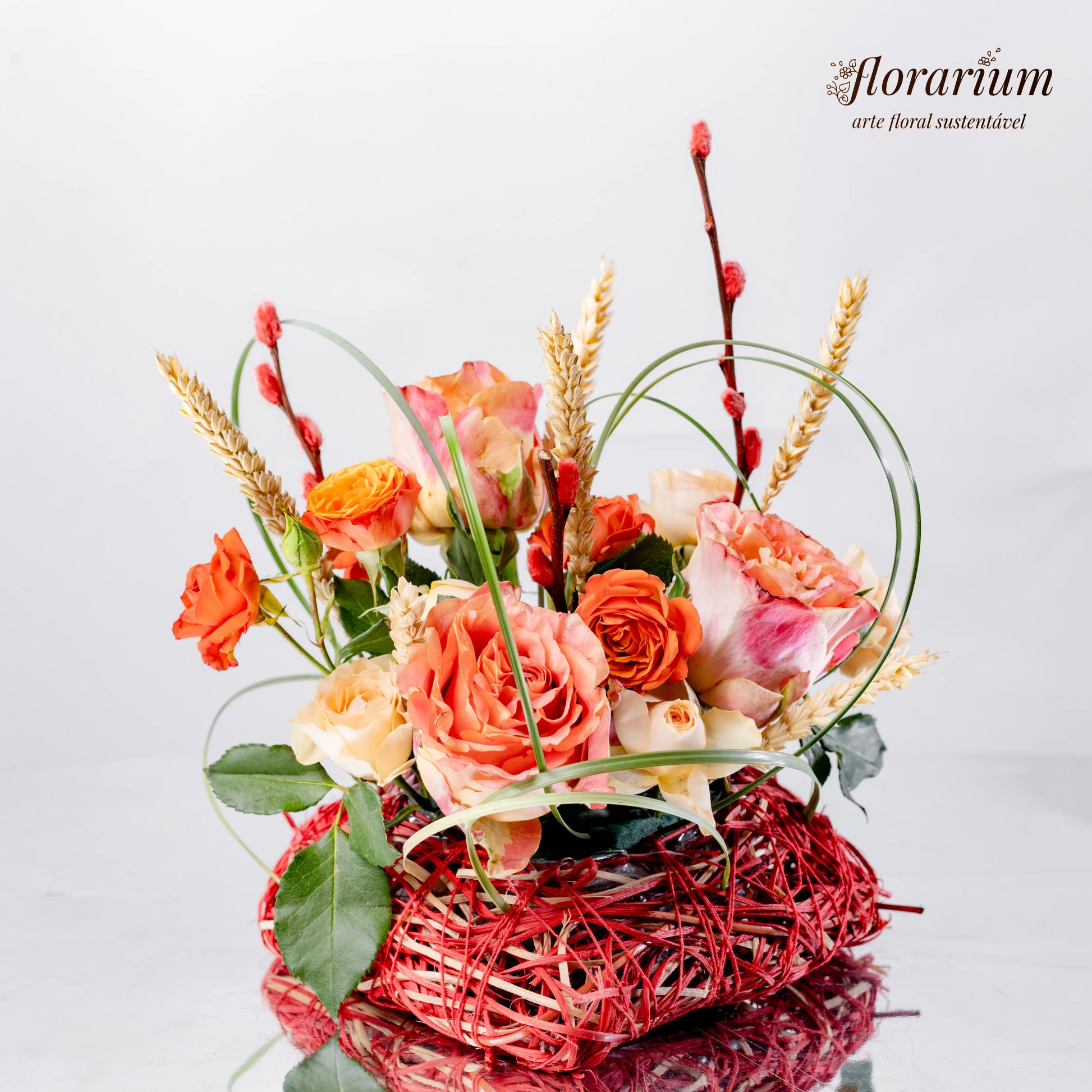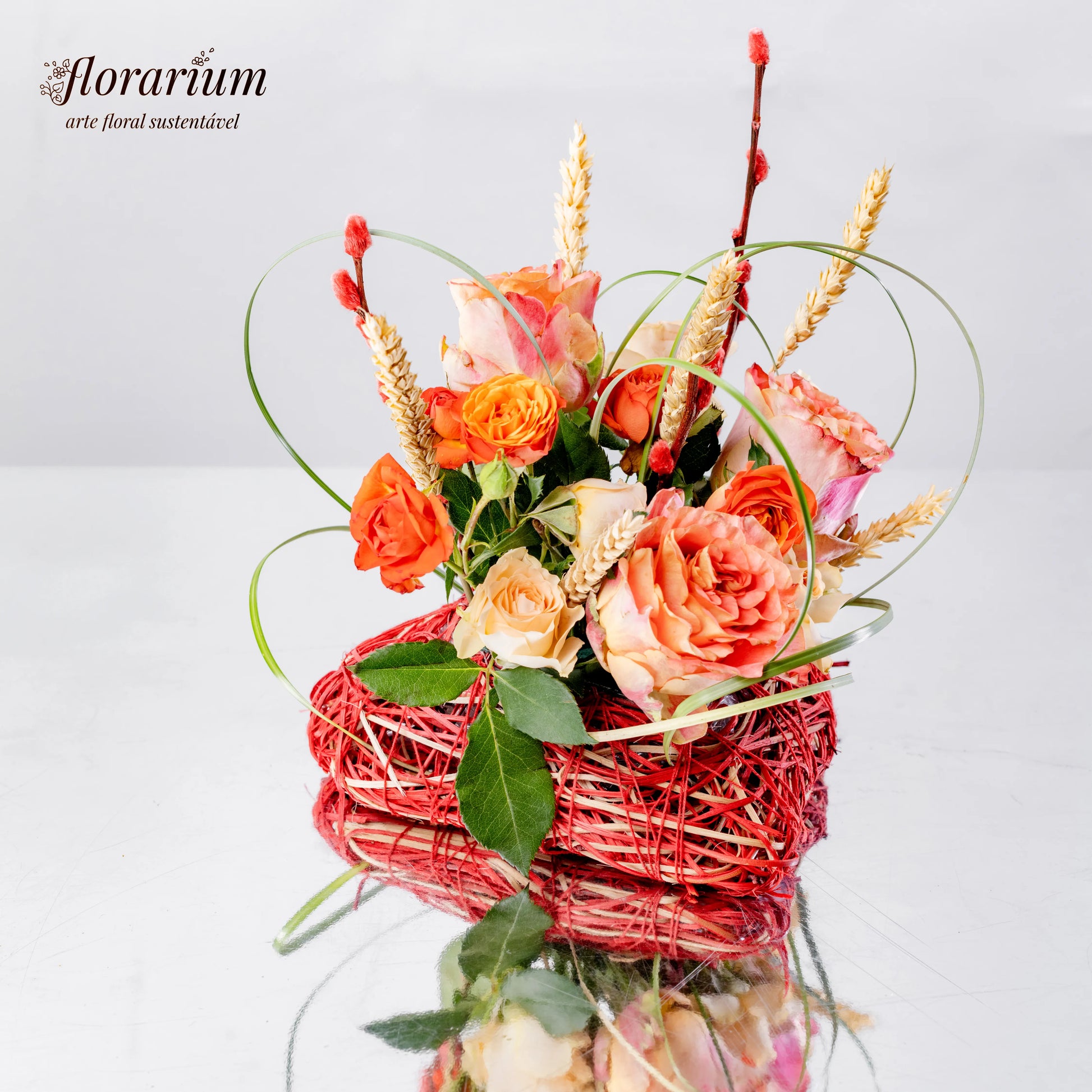 O amor verdadeiro é como a natureza—suave, autêntico e eterno. "Coração Enlaçado" é um arranjo que simboliza a harmonia entre delicadeza e força, com as rosas salmão e bege a refletirem ternura e sofisticação, enquanto as espiguetas secas e os raminhos com botões vermelhos adicionam um toque de rusticidade e paixão. O detalhe especial? Um coração verde feito de uma planta flexível, entrelaçado como os sentimentos que nos unem.